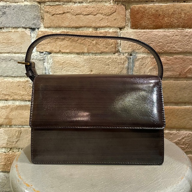 艶と色味のバランスが良いクロコダイルレザーを使用した2ウェイバッグ。 ボディが小さくミニマムなデザインなので上品かつゴージャスな印象を与えてくれます。 カラー:赤茶系 実寸 横幅:24.7㎝ 縦幅20㎝ マチ6.3㎝ ハンドルの高さ:9.5㎝ ベルトの長さ:106.3〜118.7㎝(調節可能です) ※多少の誤差はご容赦ください。 素材:レザー 生産国:イタリア 状態: USED品(中古品) バッグ後ろ右側に数ヶ所凹みがあります。 ショルダーベルト両端にレザーの剥がれが数ヶ所あります。 ショルダーベルトの長さを調節する部分に全体的なレザーの痛みと剥がれがあります。 全体的に使用感はある程度ありますがまだまだ使用できる状態。 ※弊社の取扱商品は基本的には中古品の為、写真に写しきれない細かな汚れや擦れ、アタリ等は全て記載しきれない場合がございます。 ※オンラインショップ掲載商品は店頭での販売も行っております。 先にご注文頂いた方を優先して販売致しますので、予めご了承下さい。 ※基本的に返品対応等は致しておりません。ご理解頂きご購入頂きます様お願い申し上げます。 ※送料別途500円頂いております。