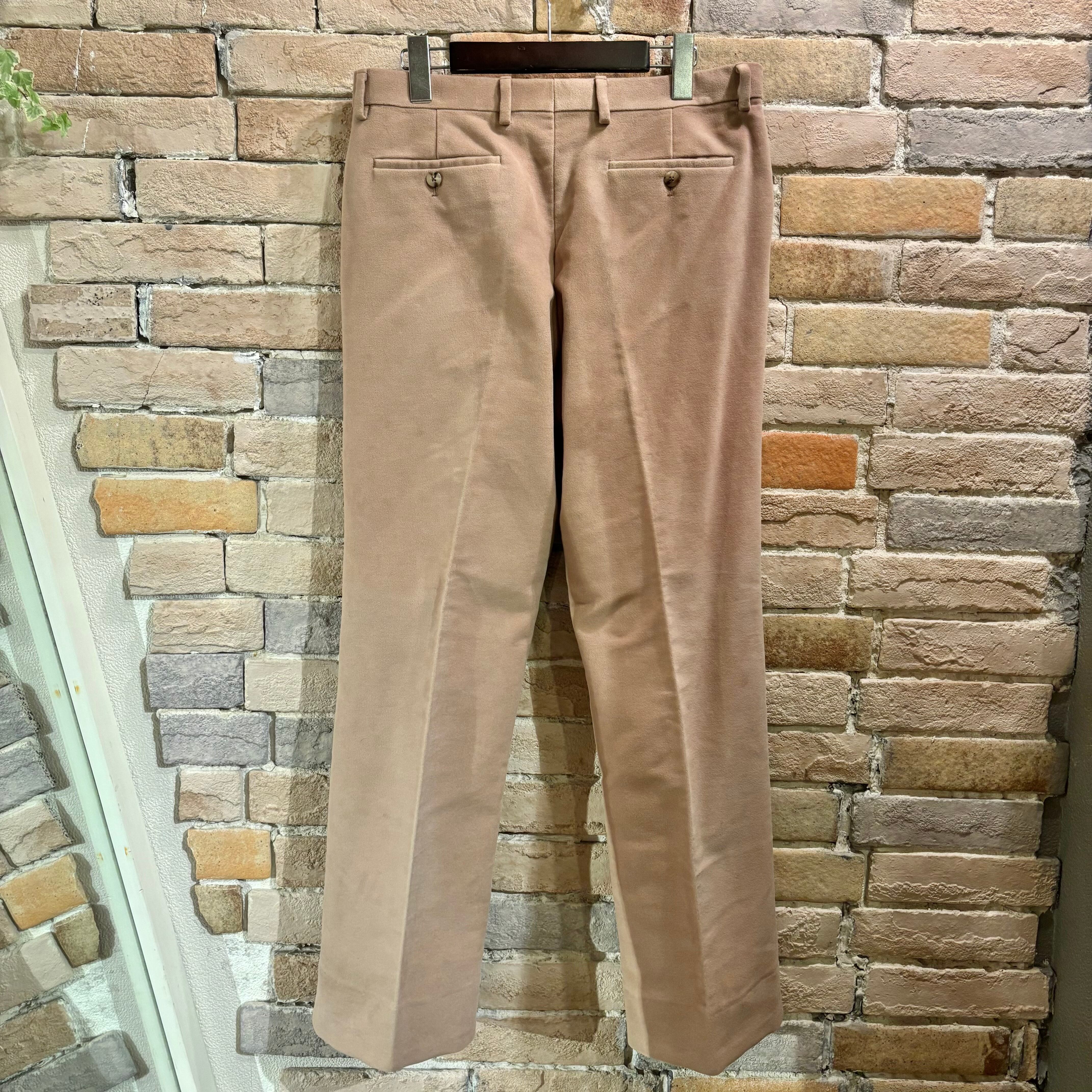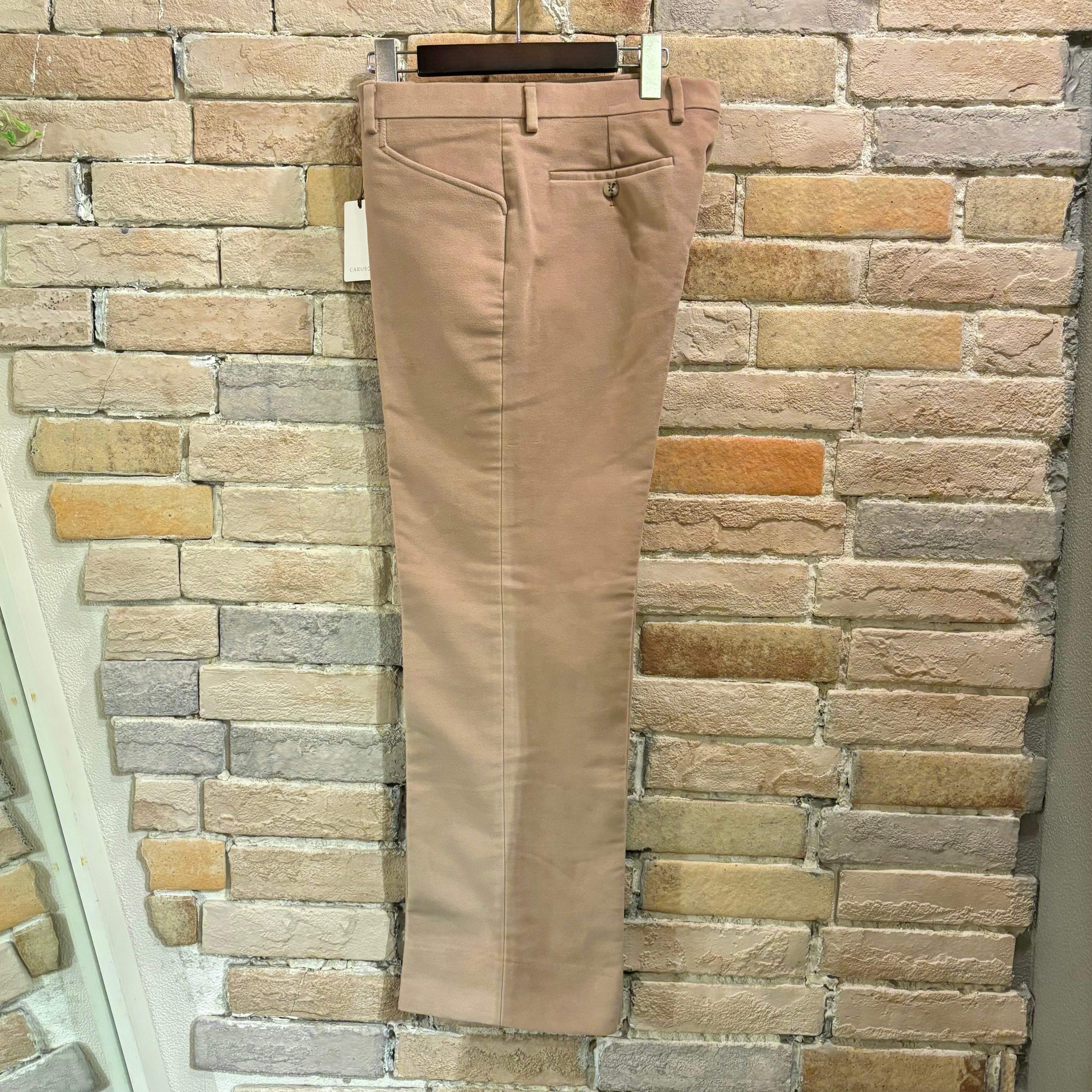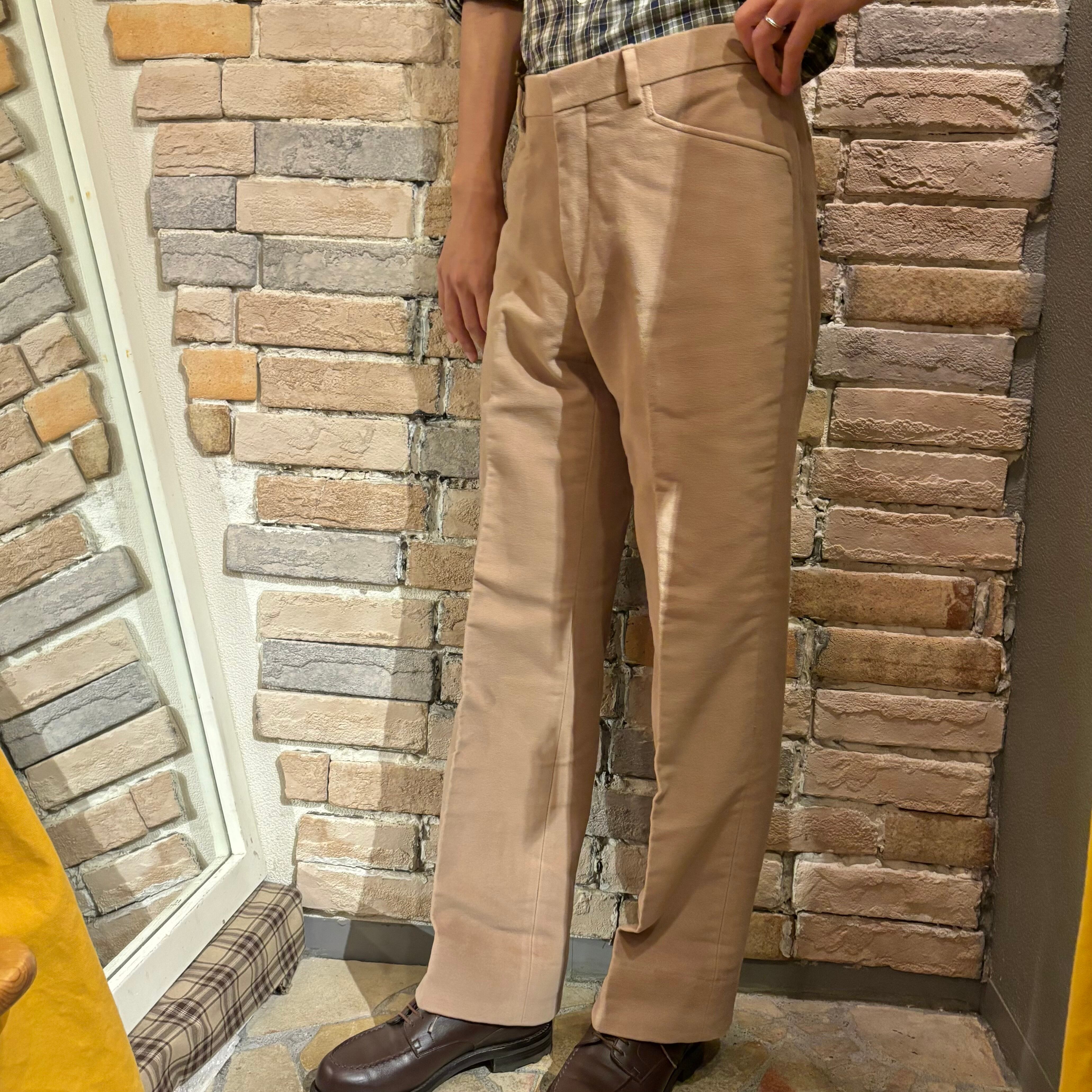 柔らかなベージュ色に起毛感のあるモールスキン、Lポケット仕様が特徴的なノープリーツトラウザー。