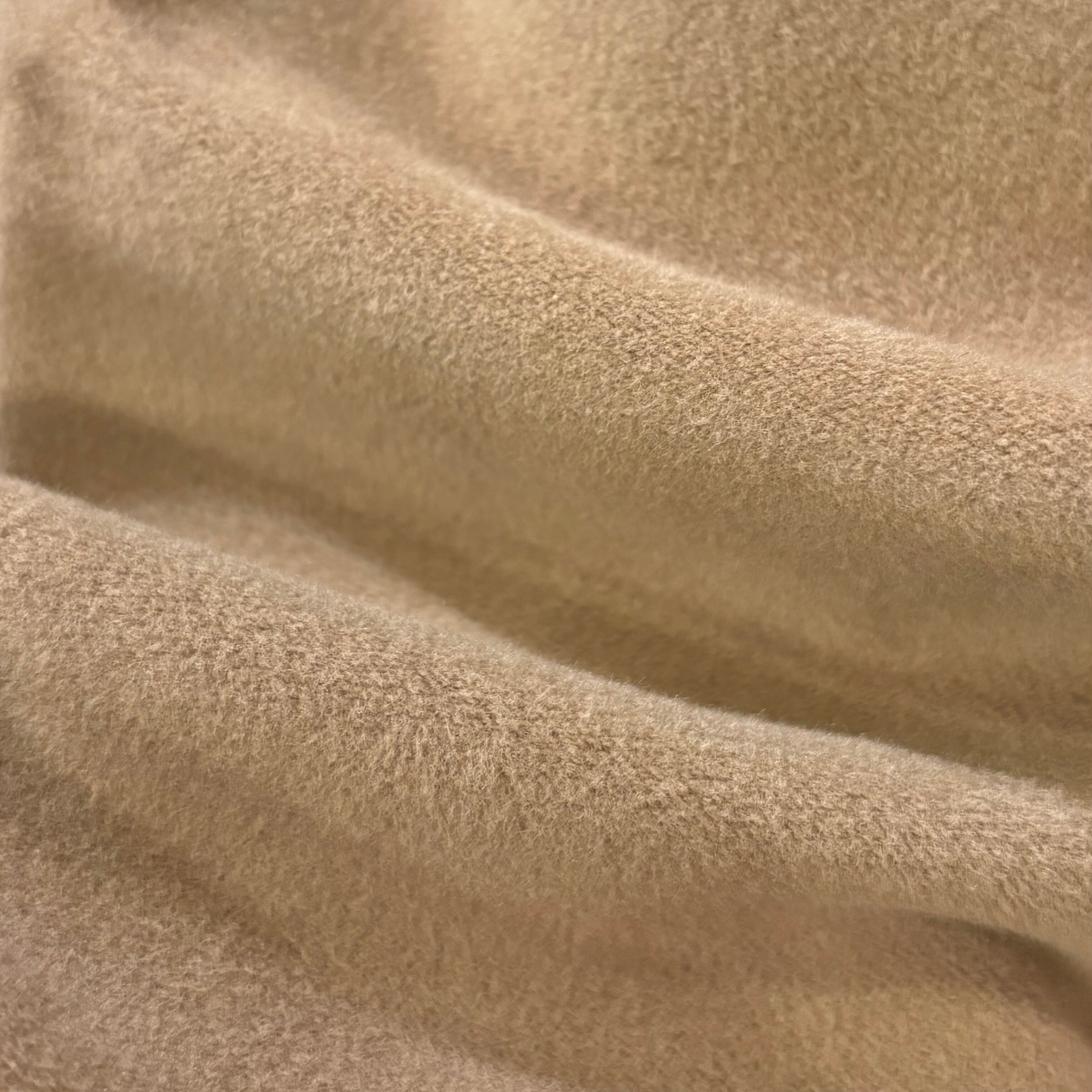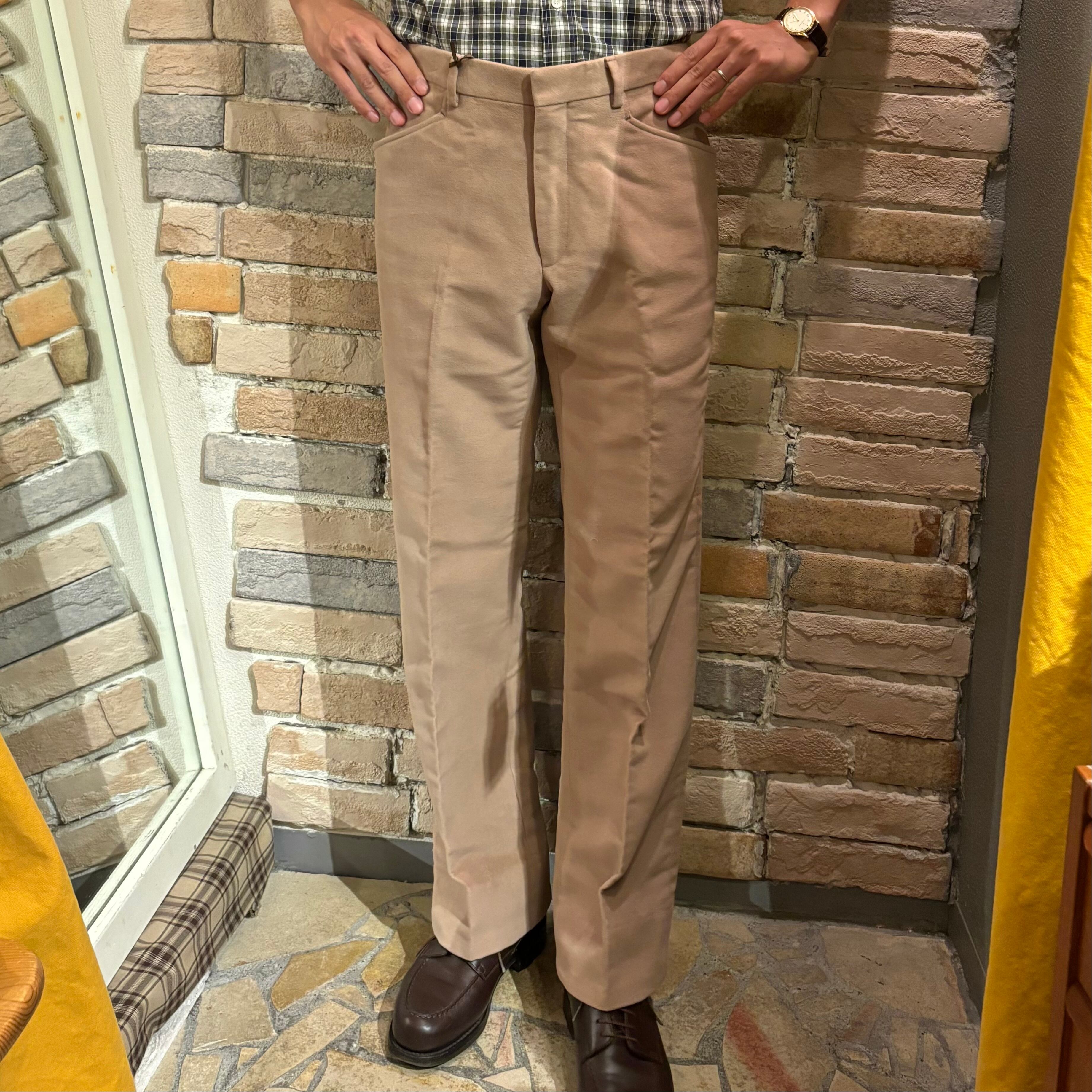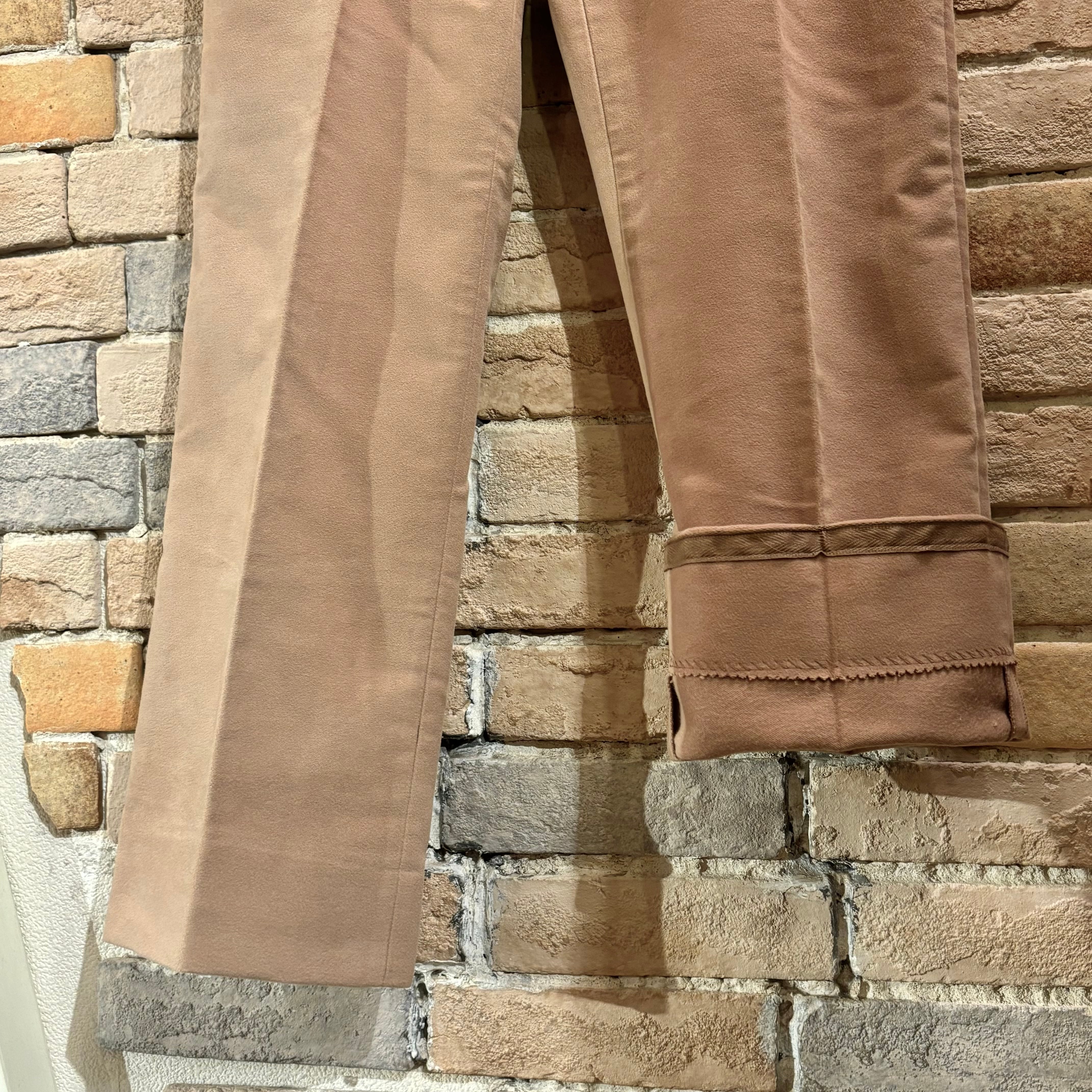 柔らかなベージュ色に起毛感のあるモールスキン、Lポケット仕様が特徴的なノープリーツトラウザー。
