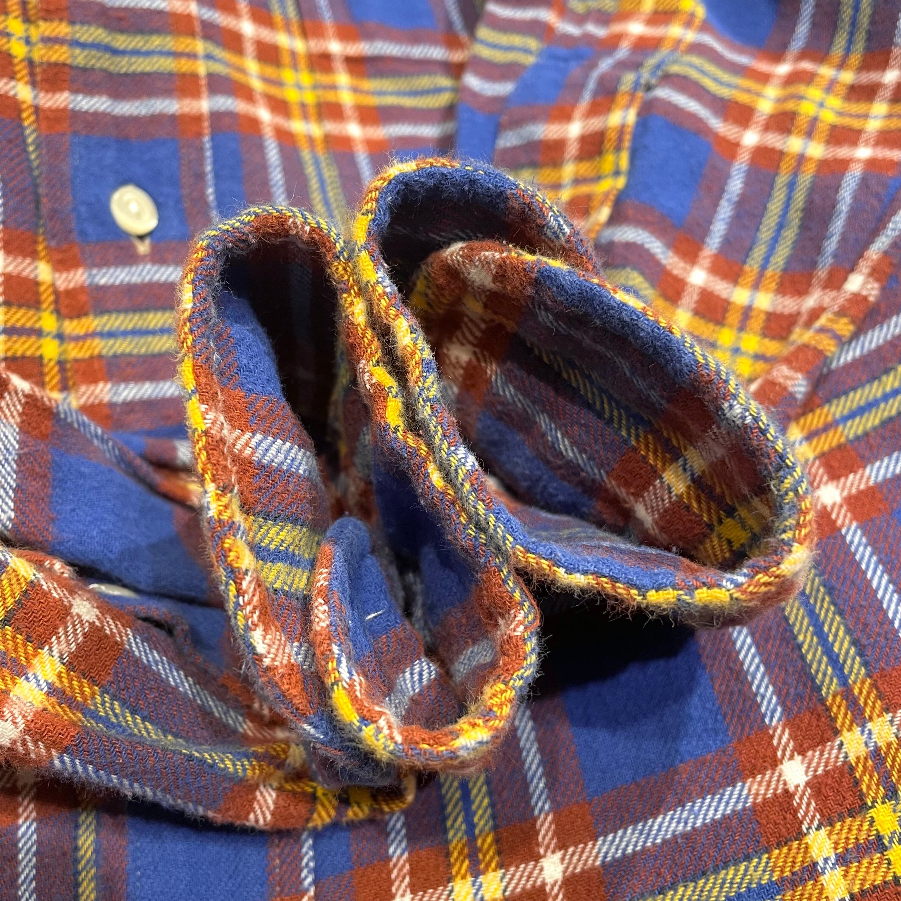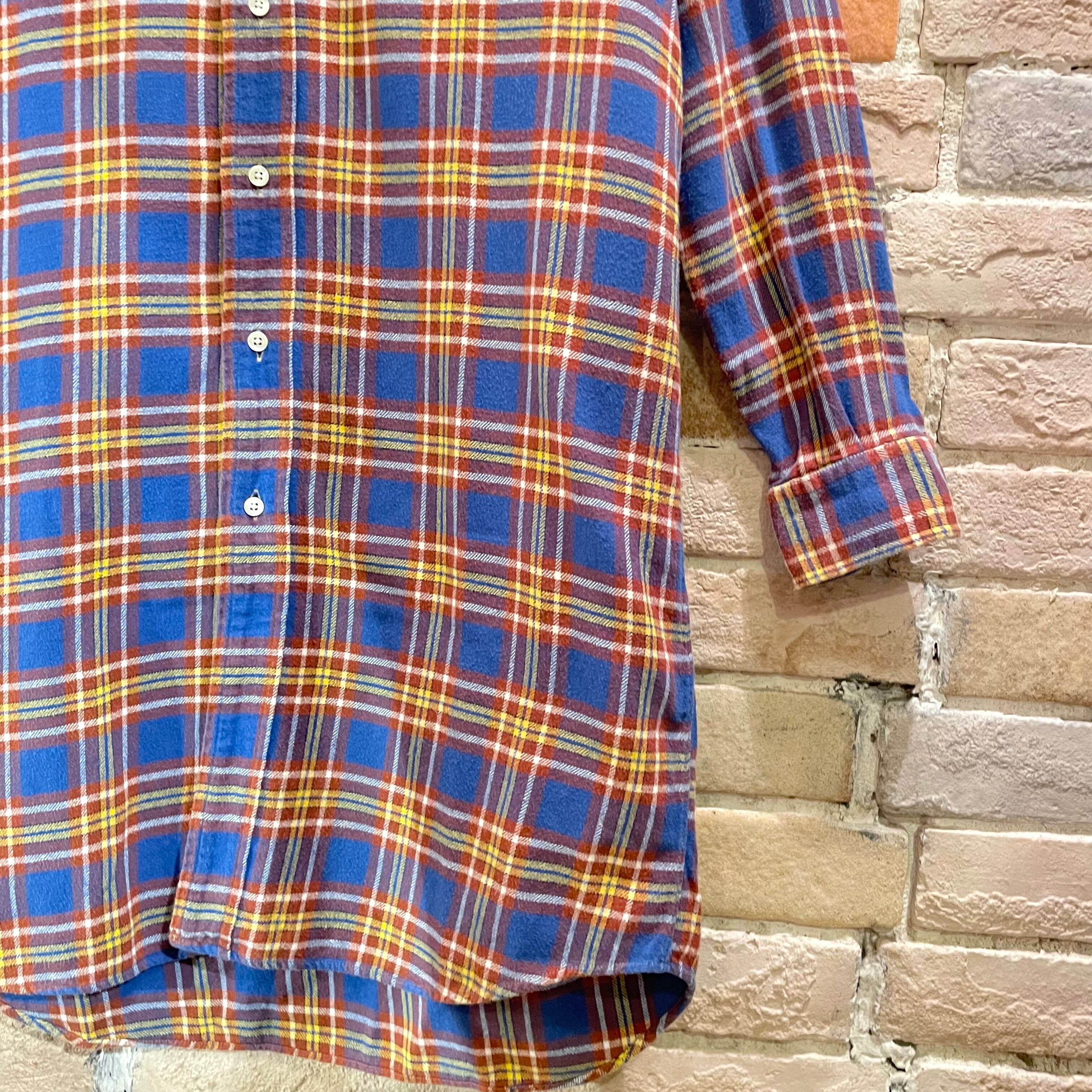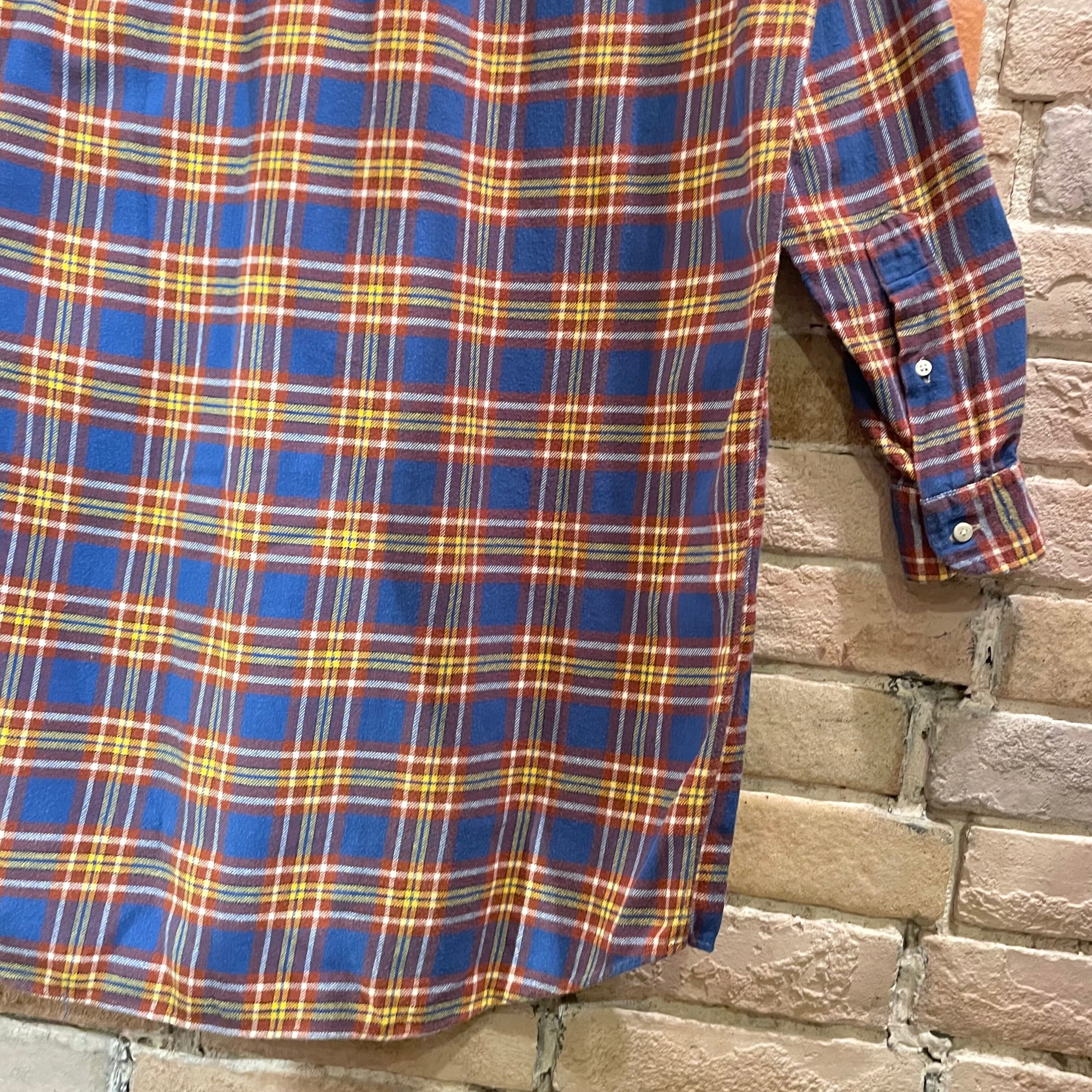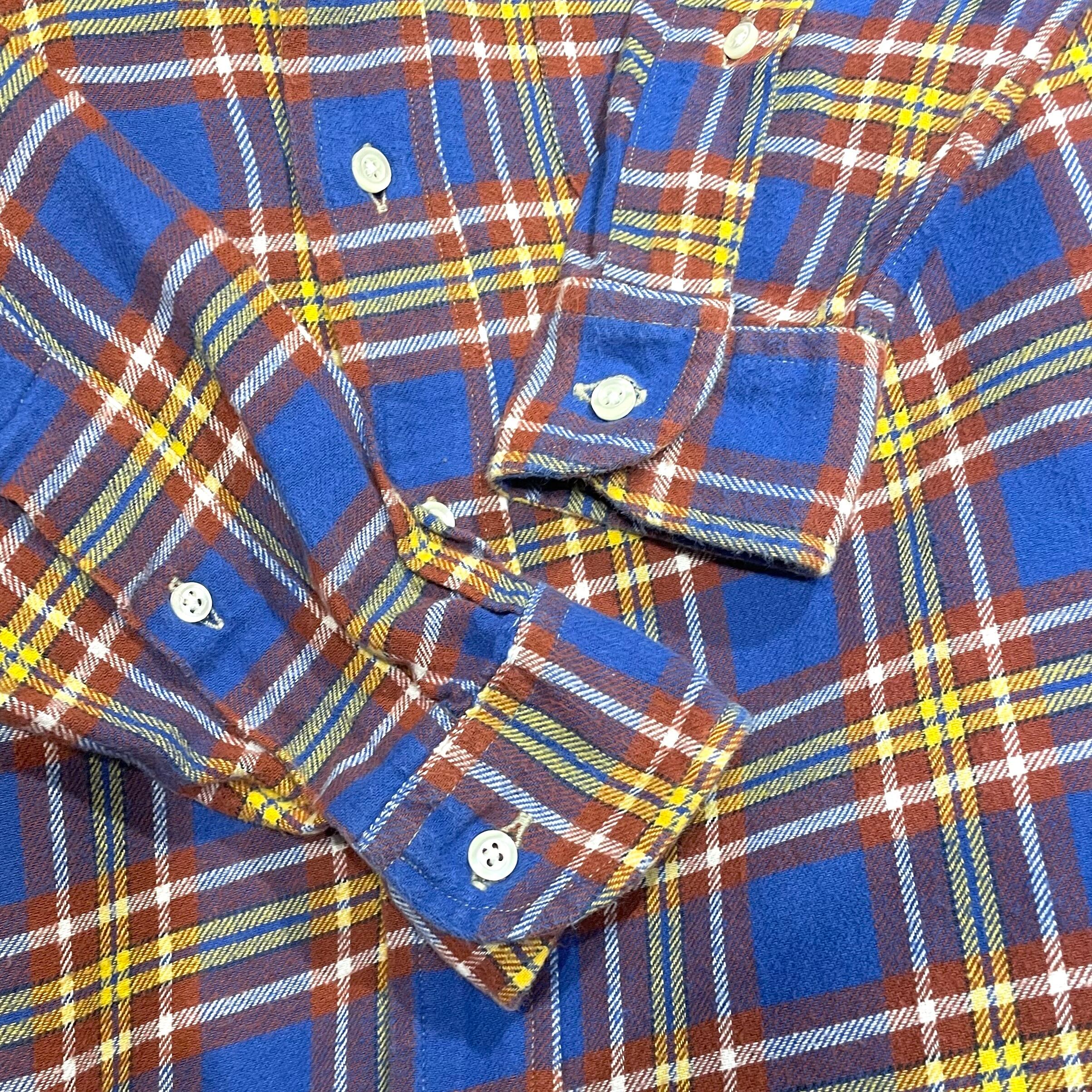 ブルー、ブラウン、イエローのチェック柄のフランネルロングシャツです。