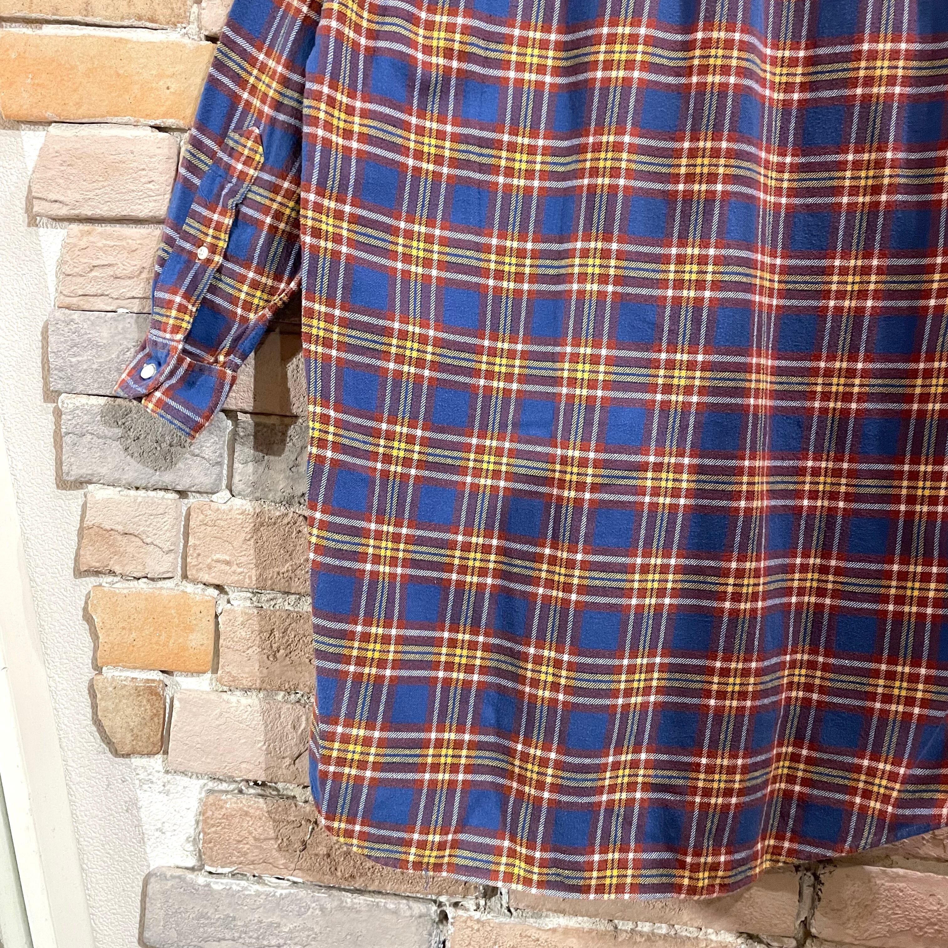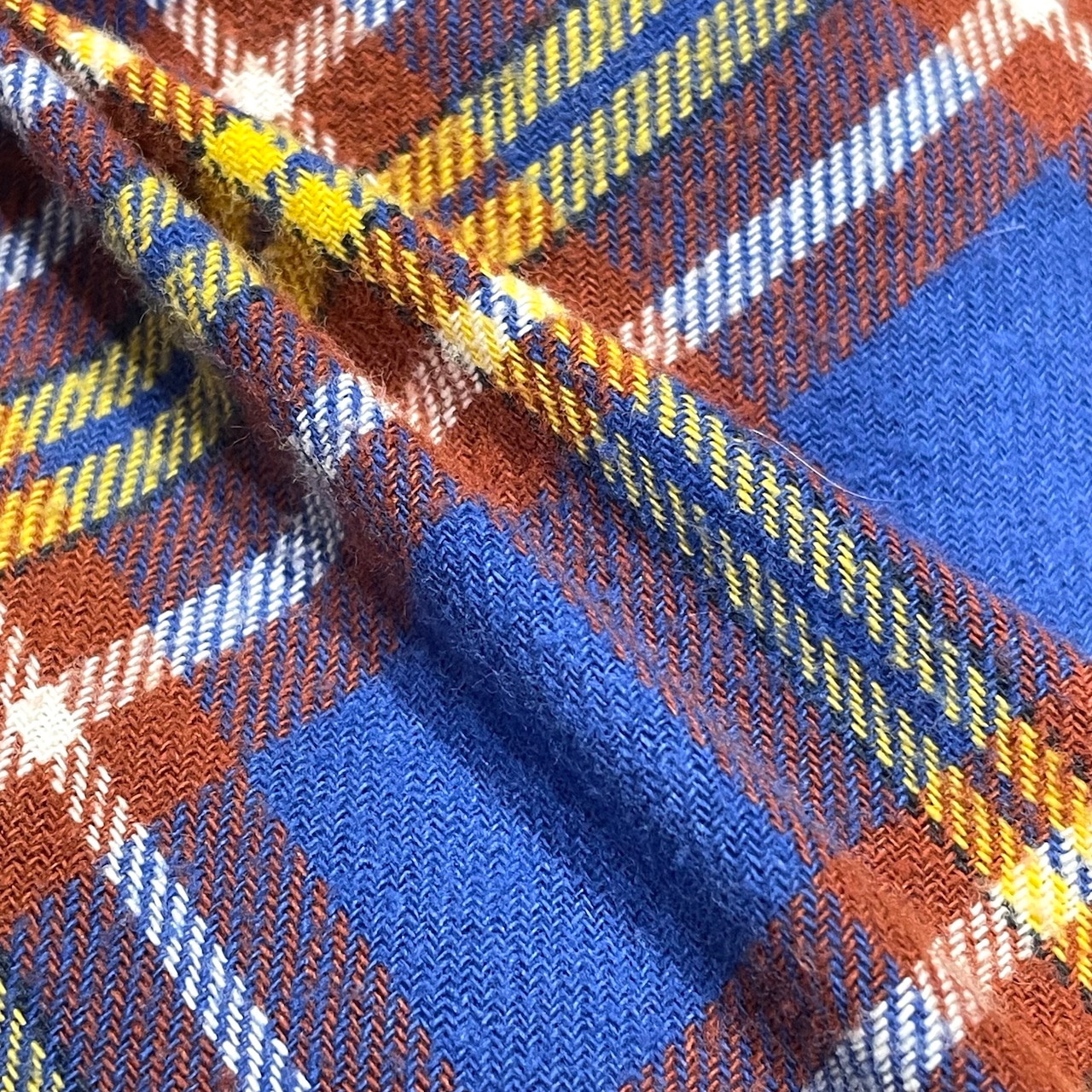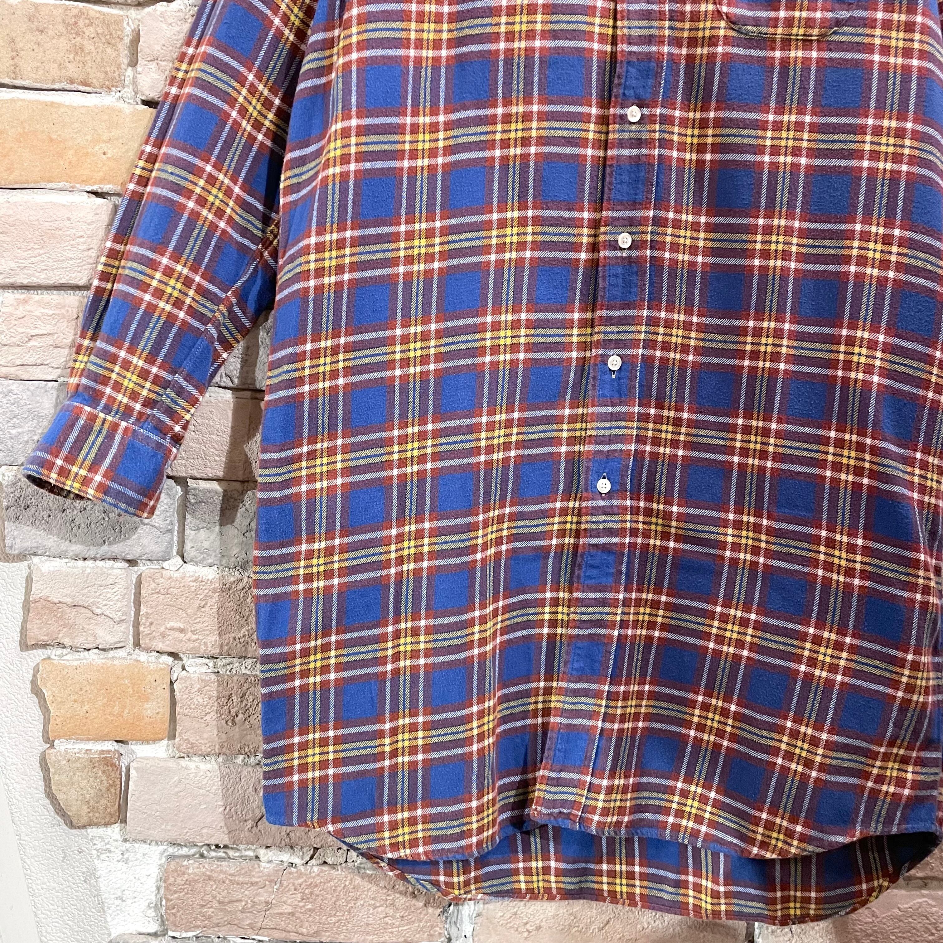 ブルー、ブラウン、イエローのチェック柄のフランネルロングシャツです。