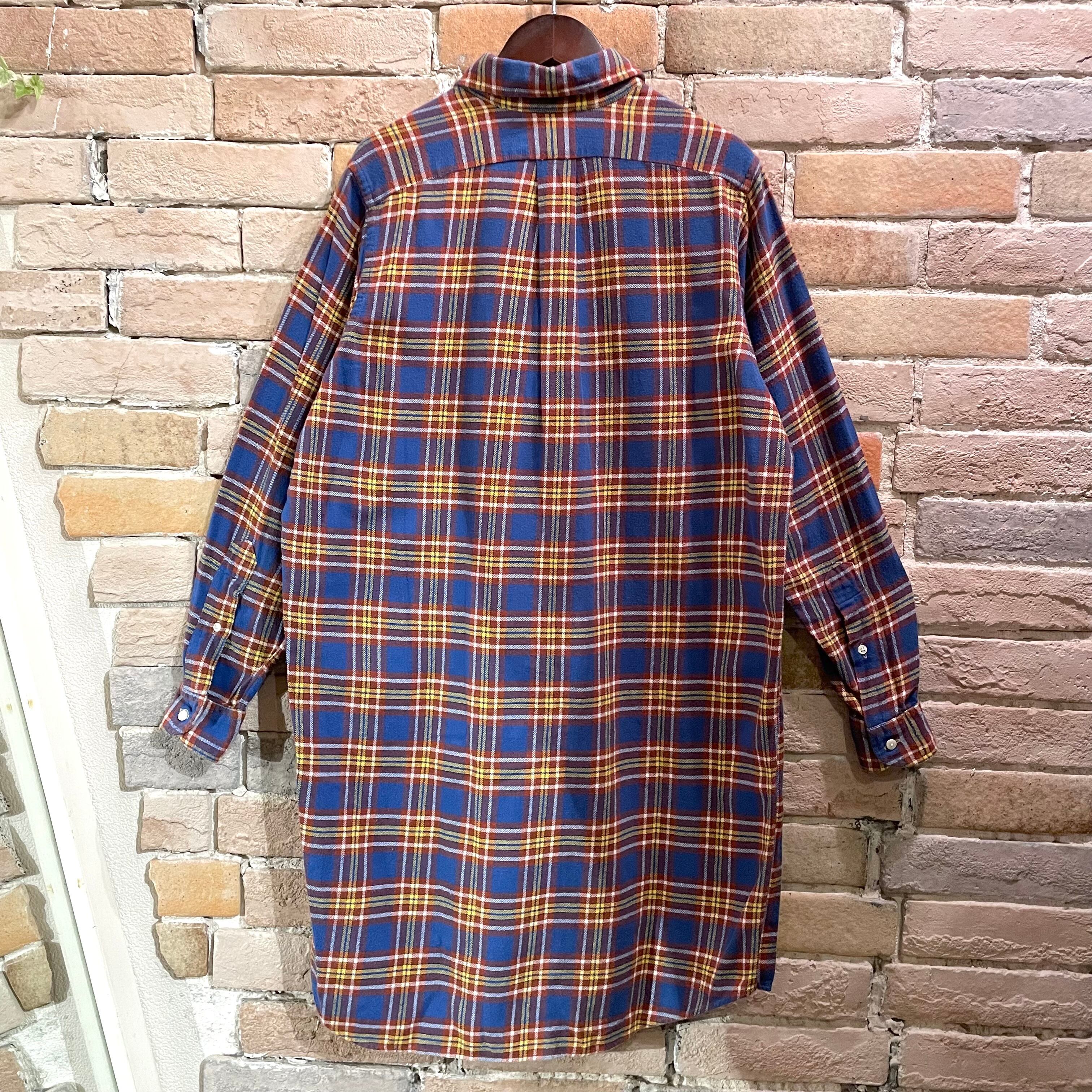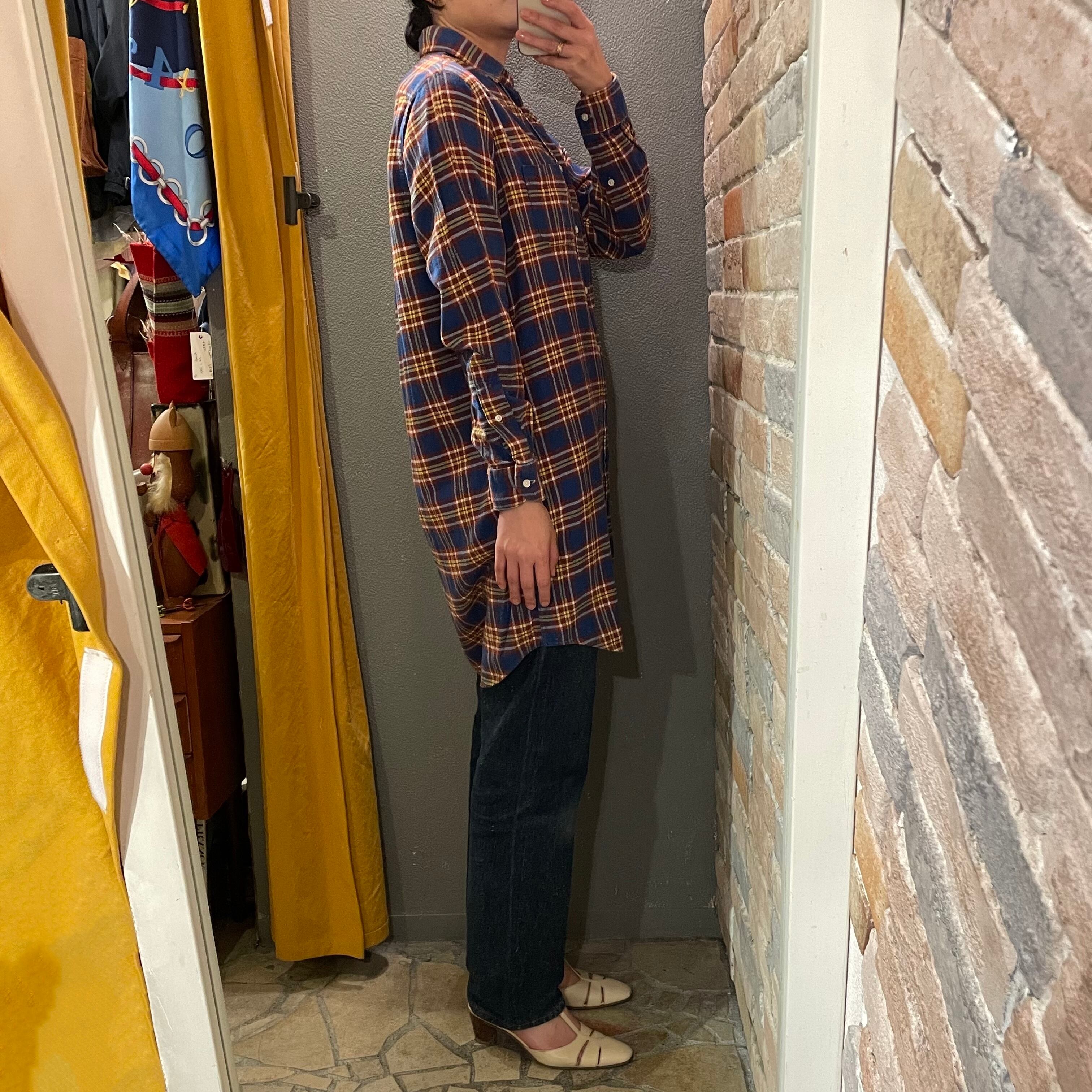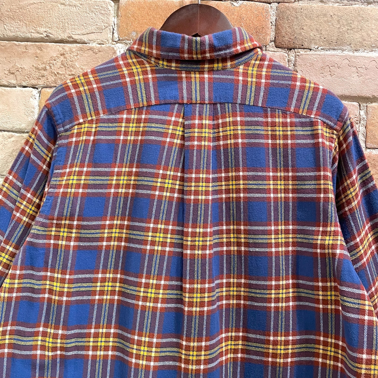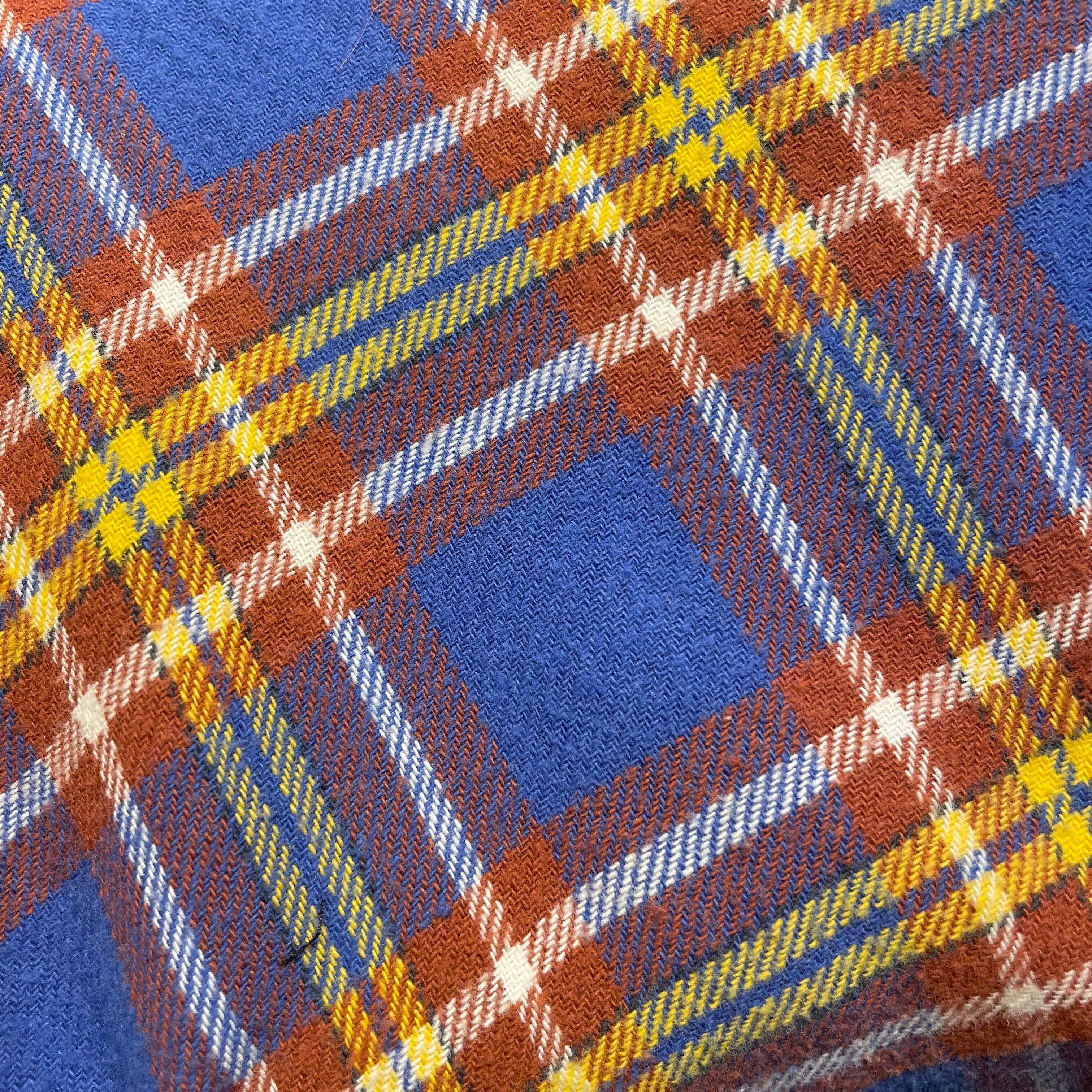 ブルー、ブラウン、イエローのチェック柄のフランネルロングシャツです。