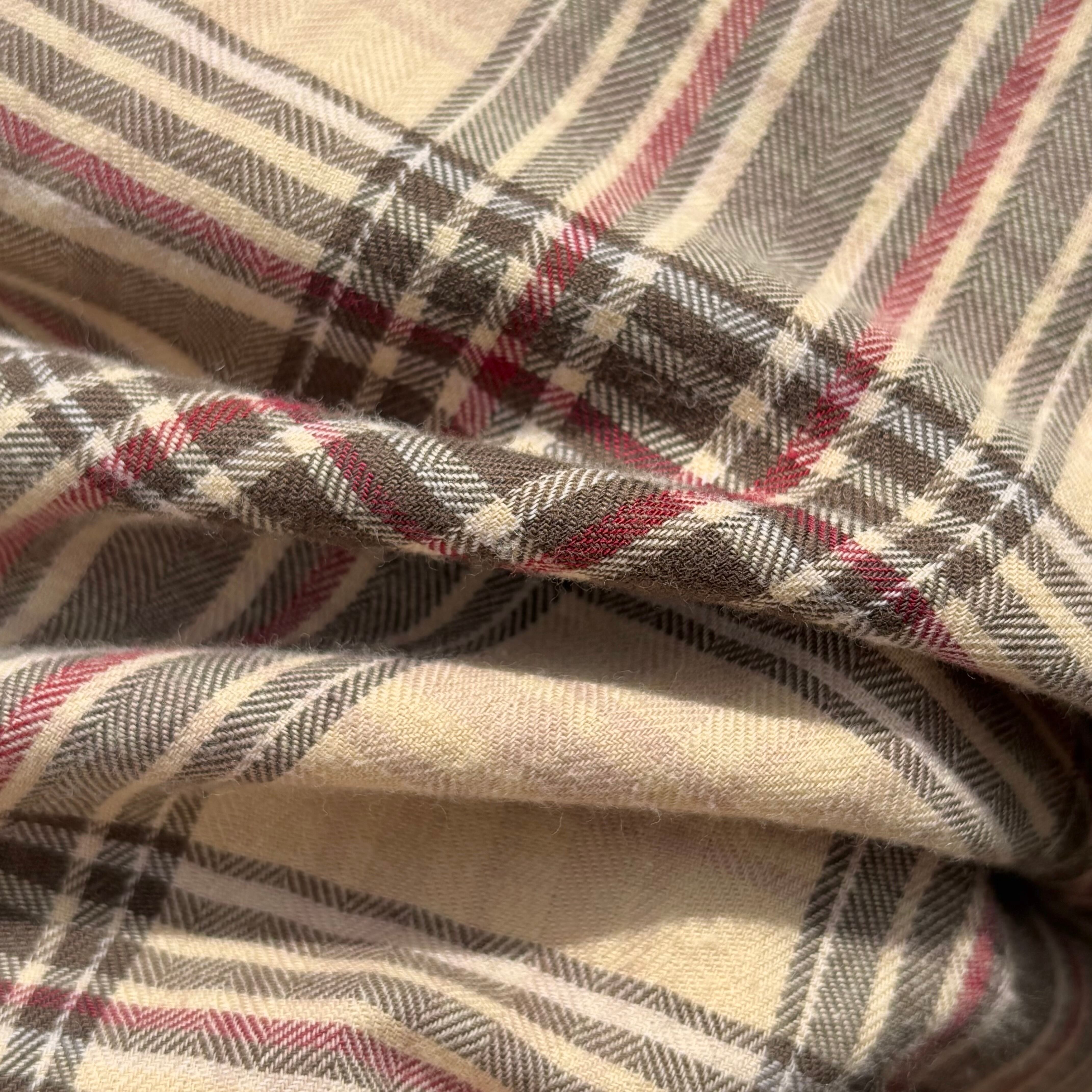 アクションプリーツ付き、秋冬の重ね着に使いやすい配色のチェック柄シャツ。