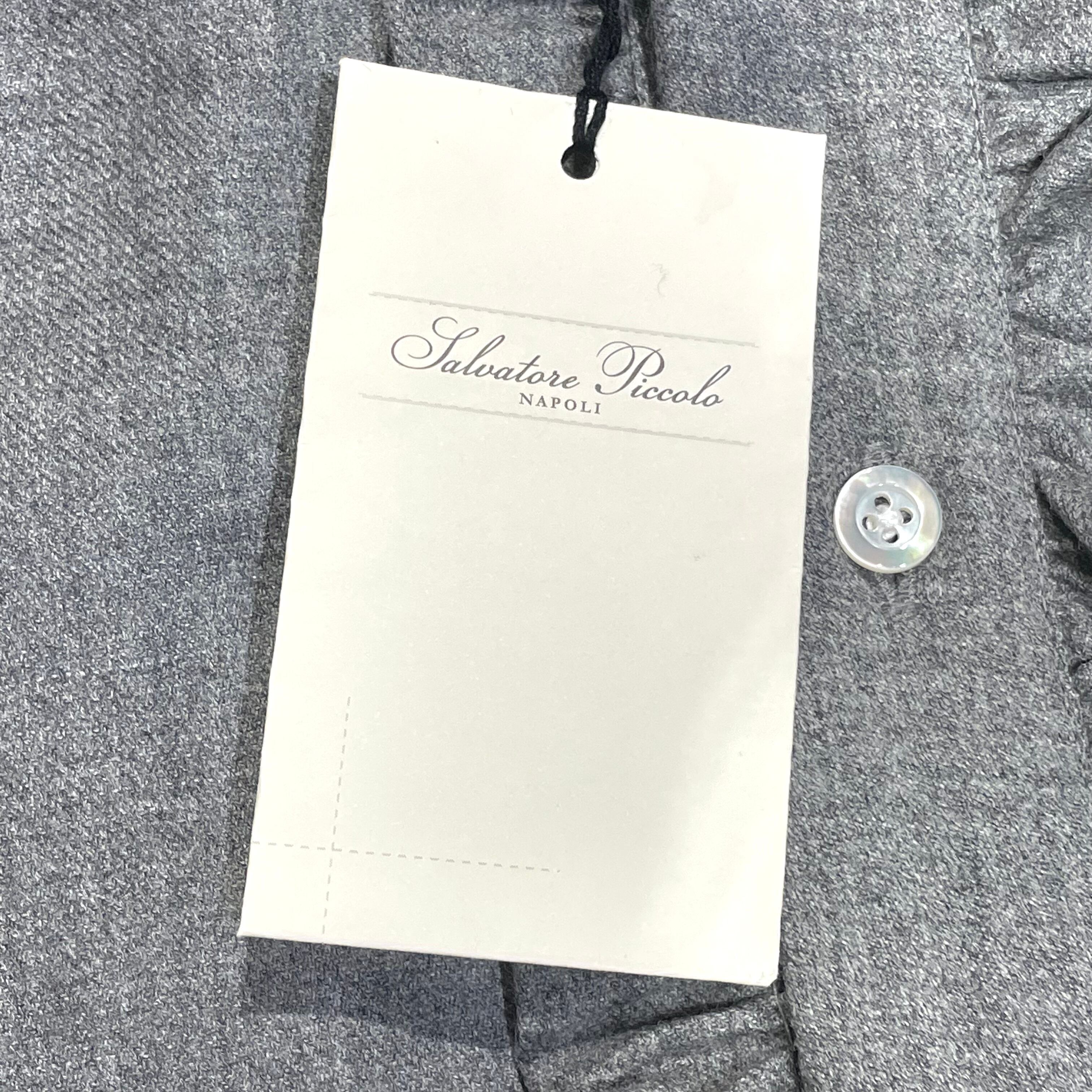 シャツメーカーらしい仕立ての良さと、光沢感のある上質なグレーの生地です。