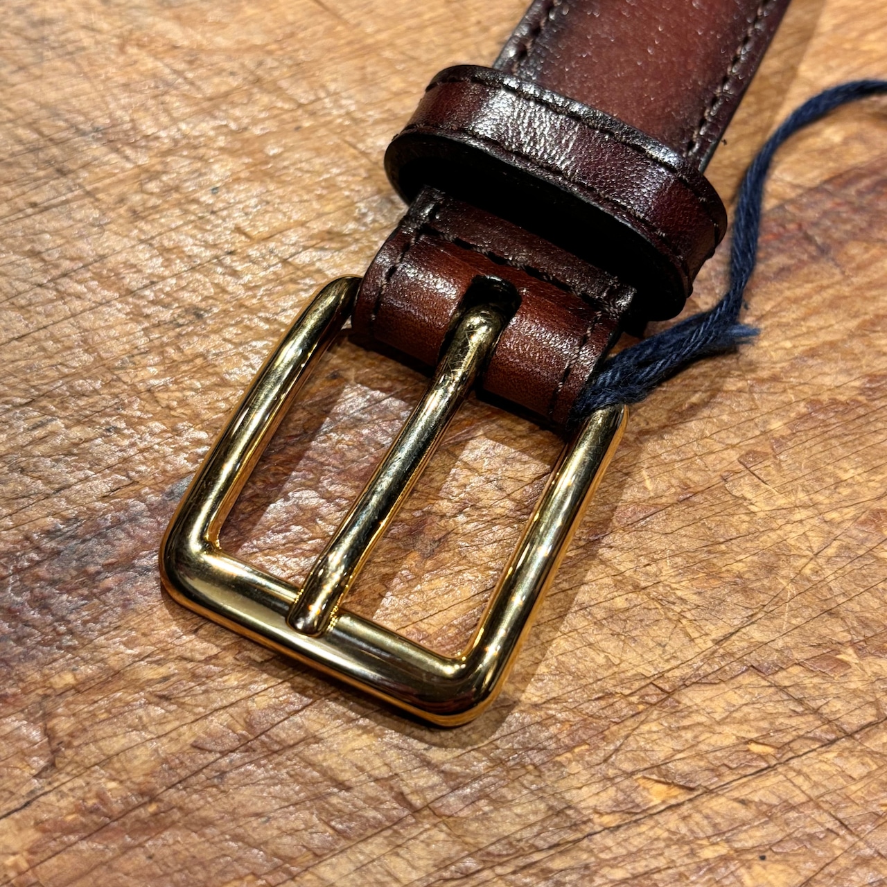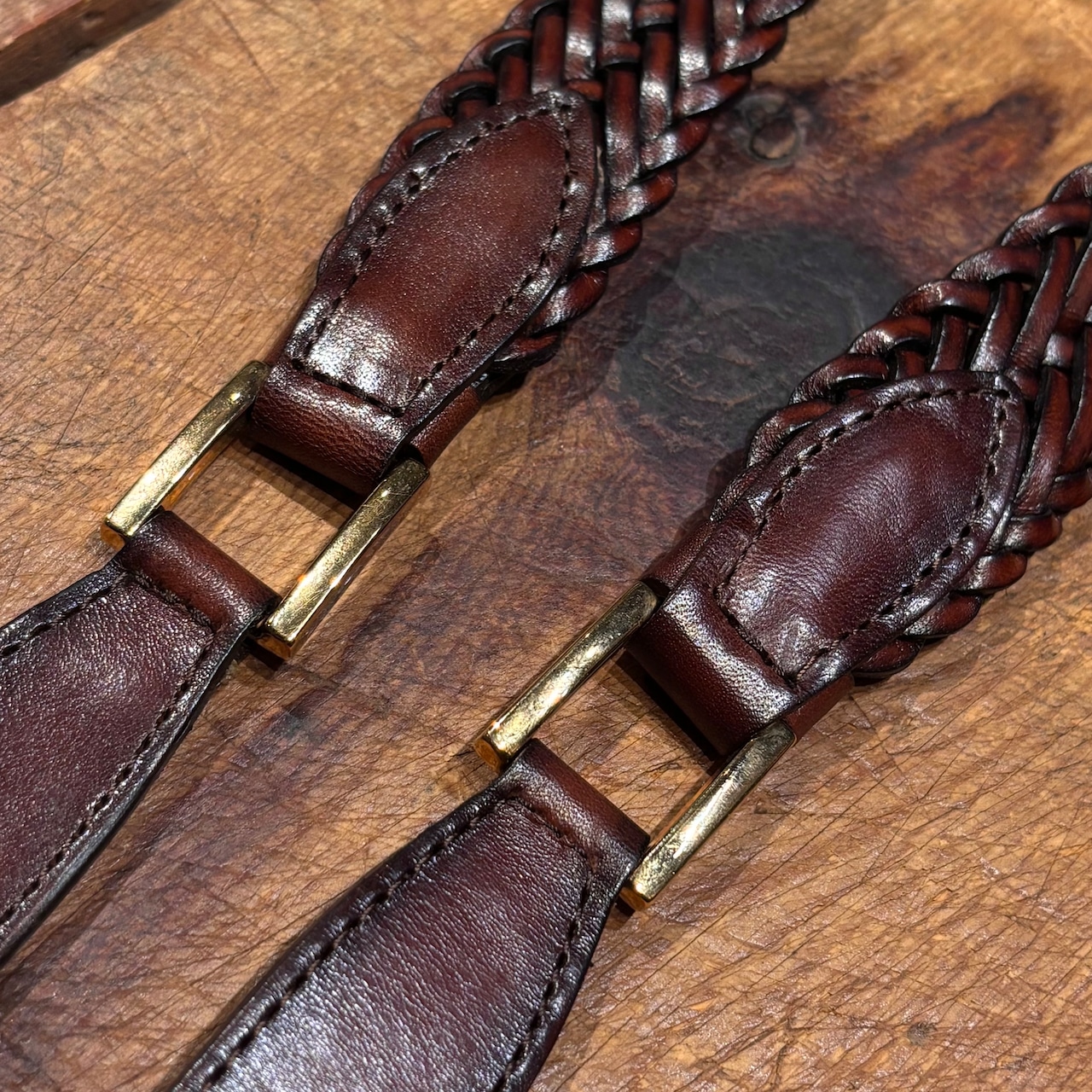 深みのあるブラウンのレザー×メッシュにバックルを含む3点の金具に存在感を感じる、コーディネートのポイントとなる1本。