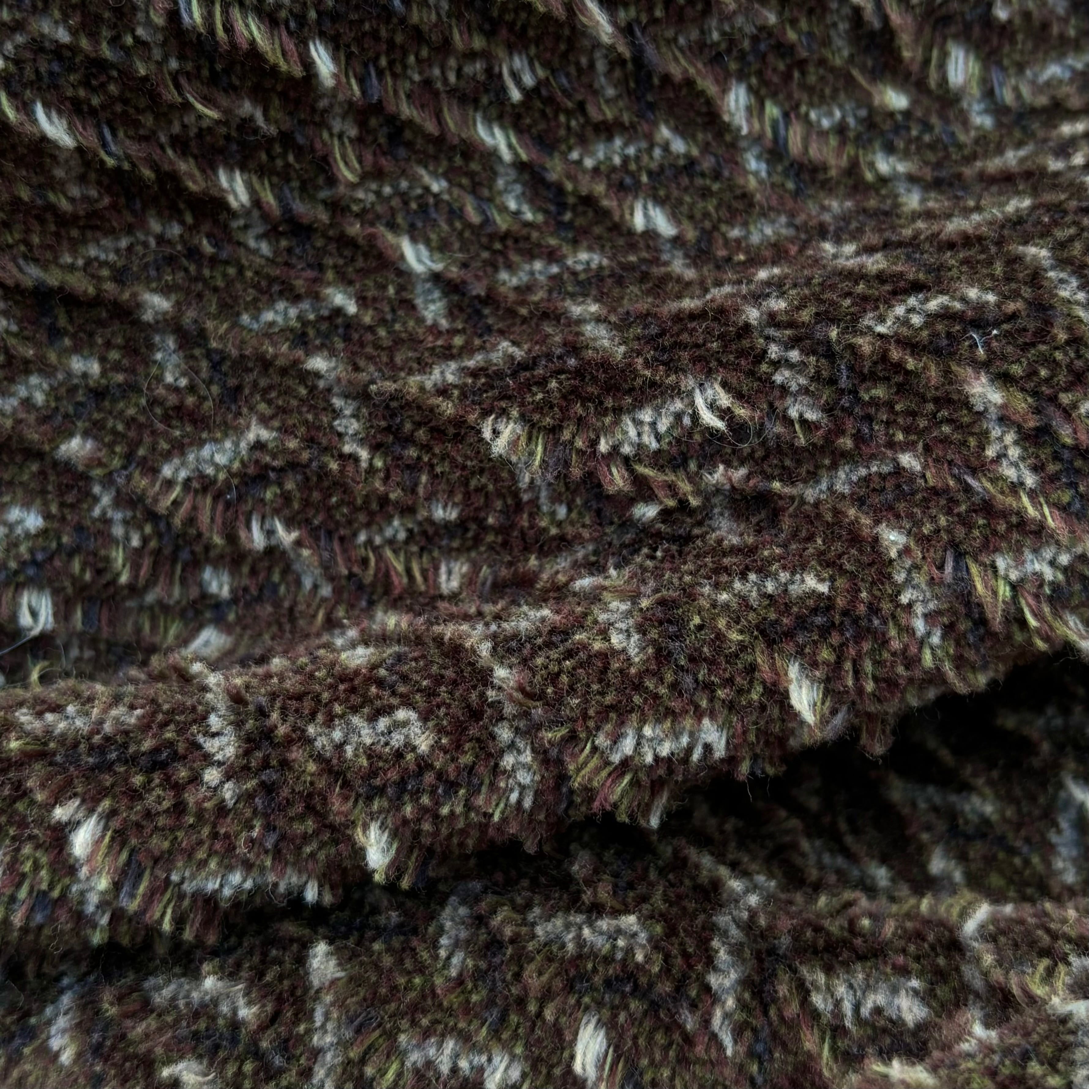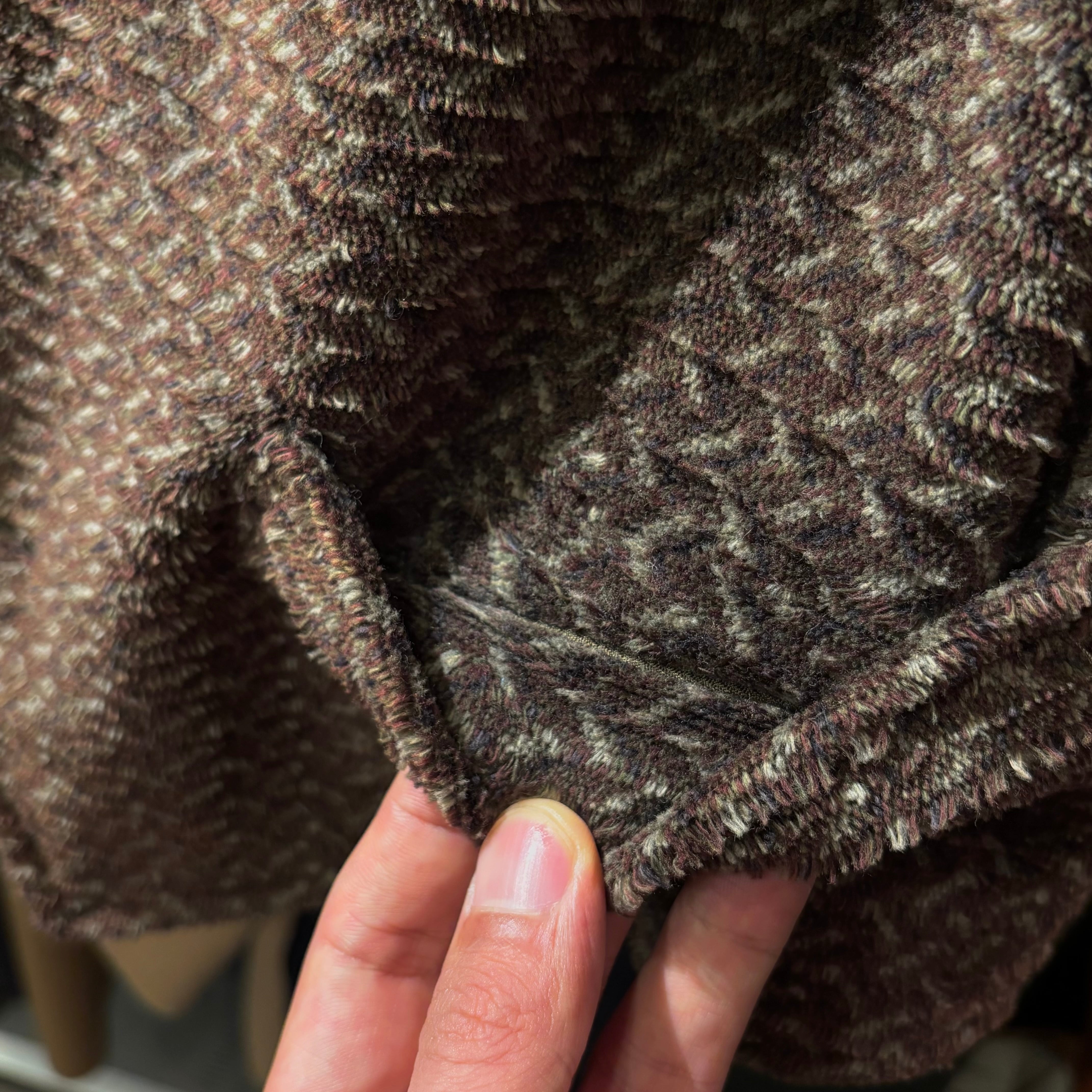 程良いゆとりに起毛感のある柔らかなパイル生地、細かく色が混ざり表情のある柄使いが秋冬のレイヤードを楽しめる1着。