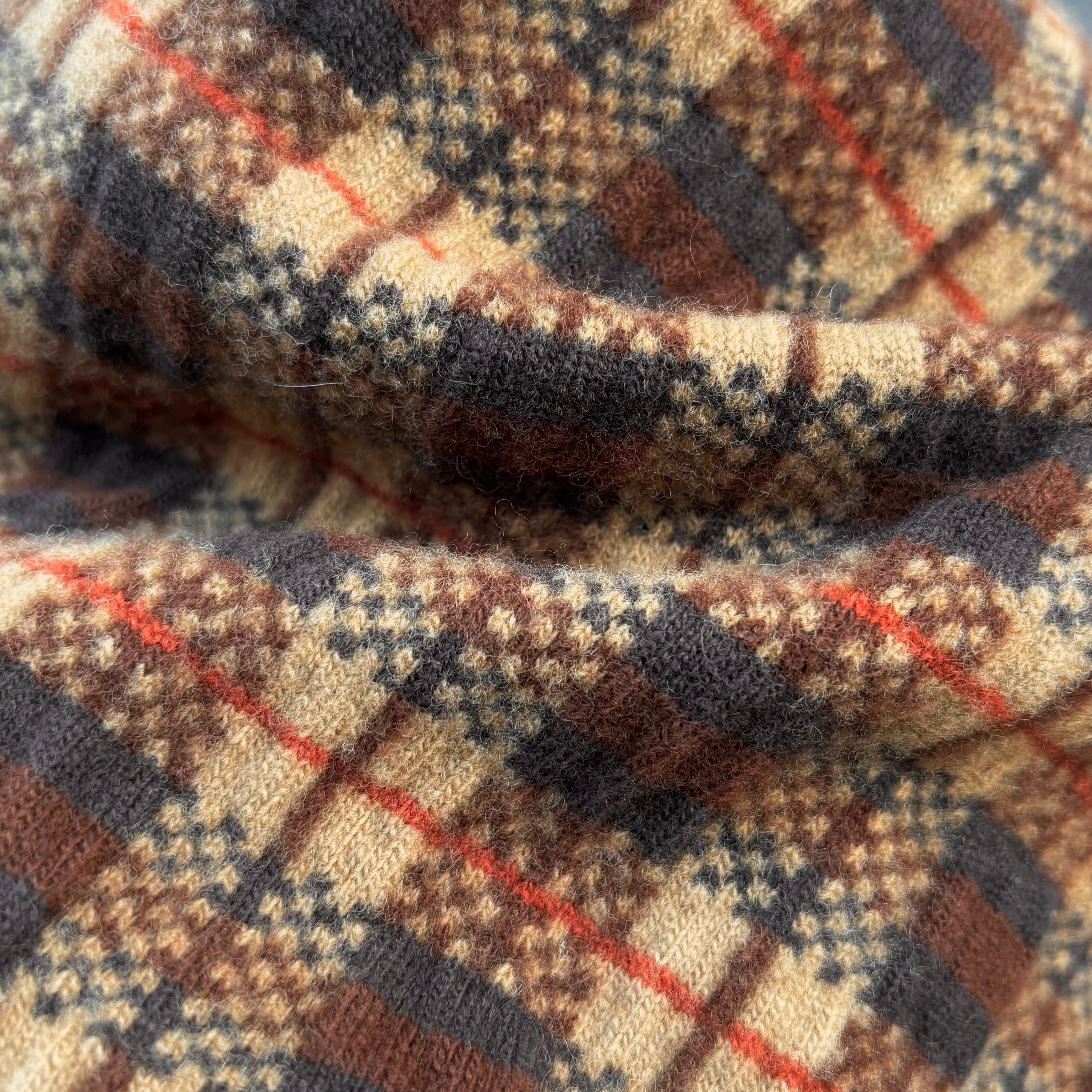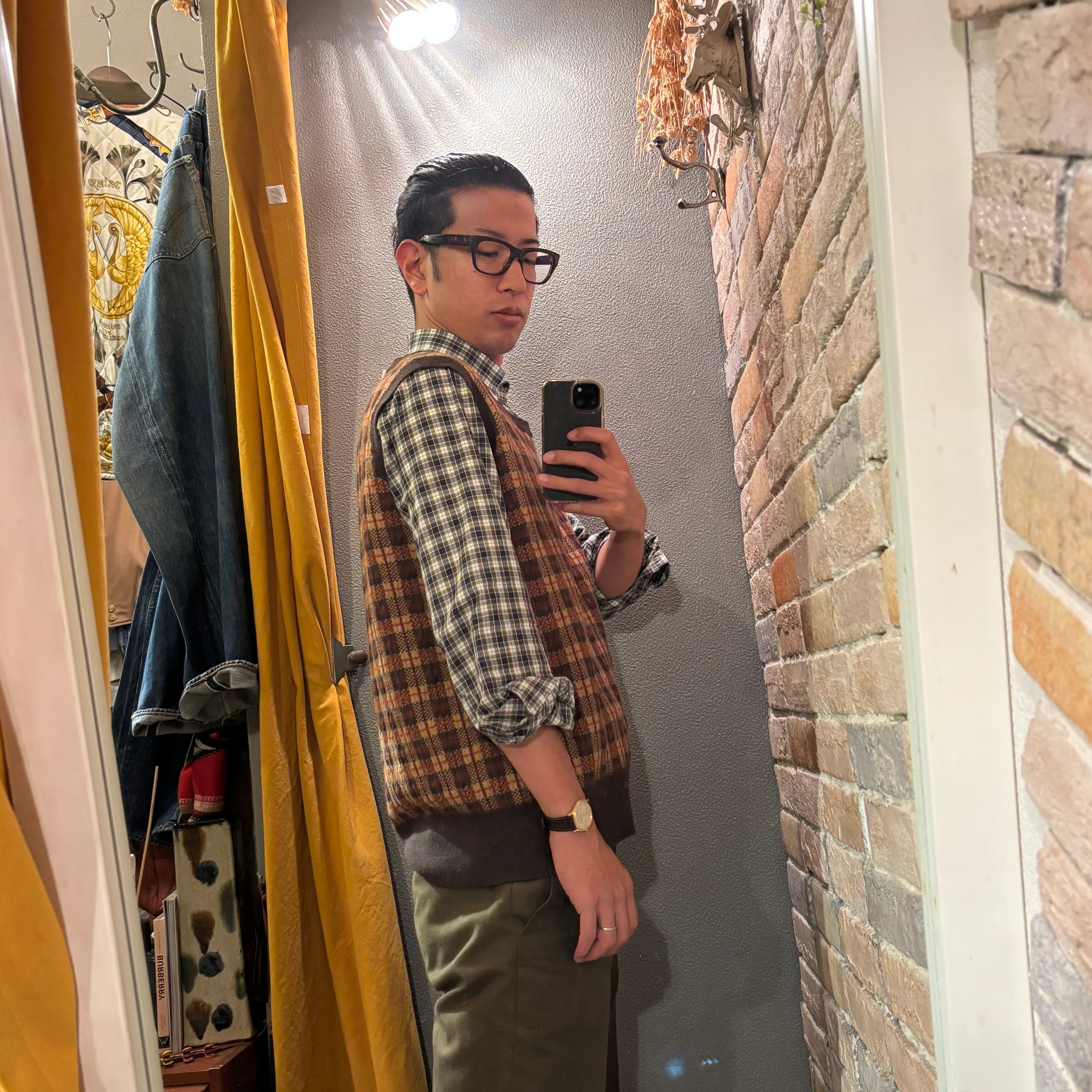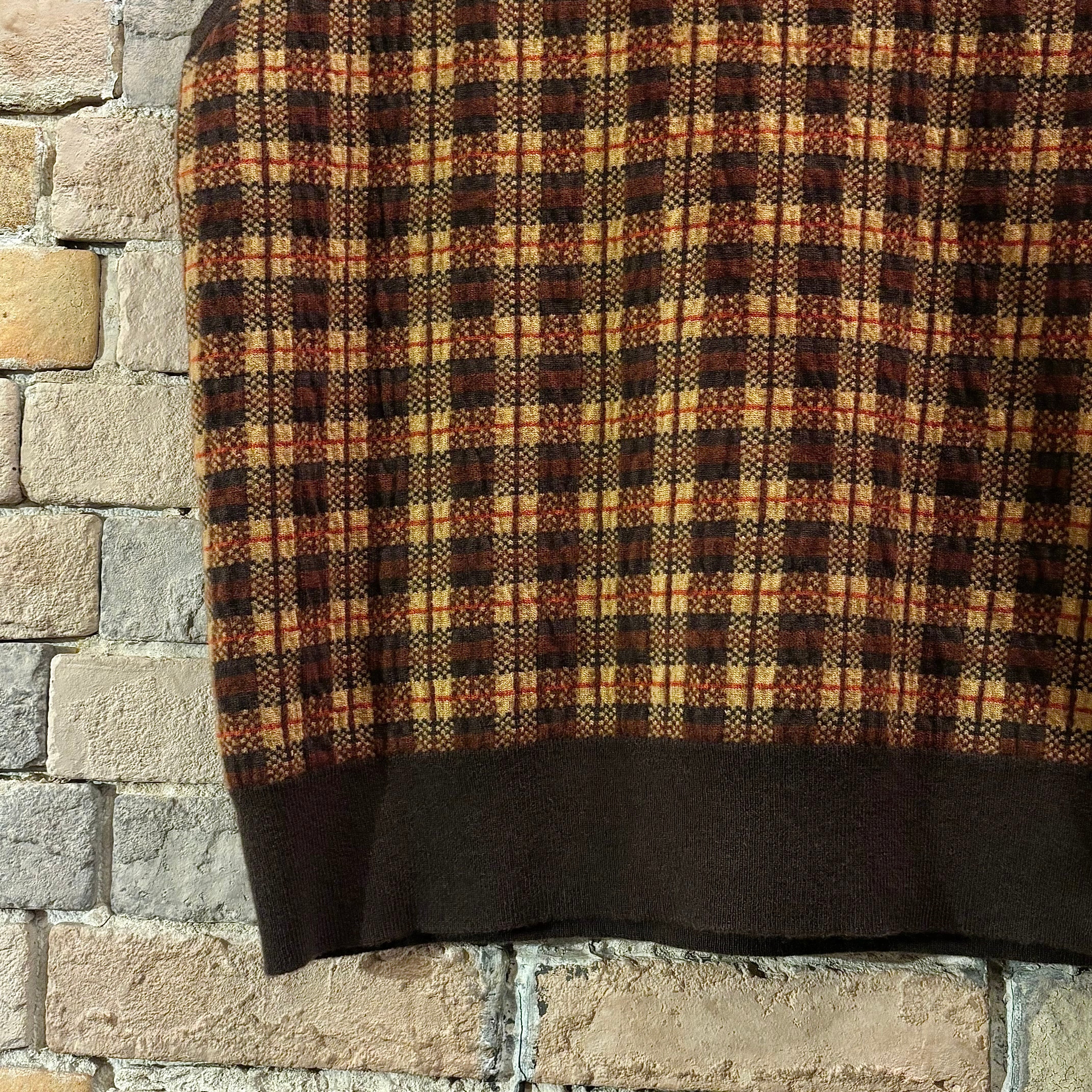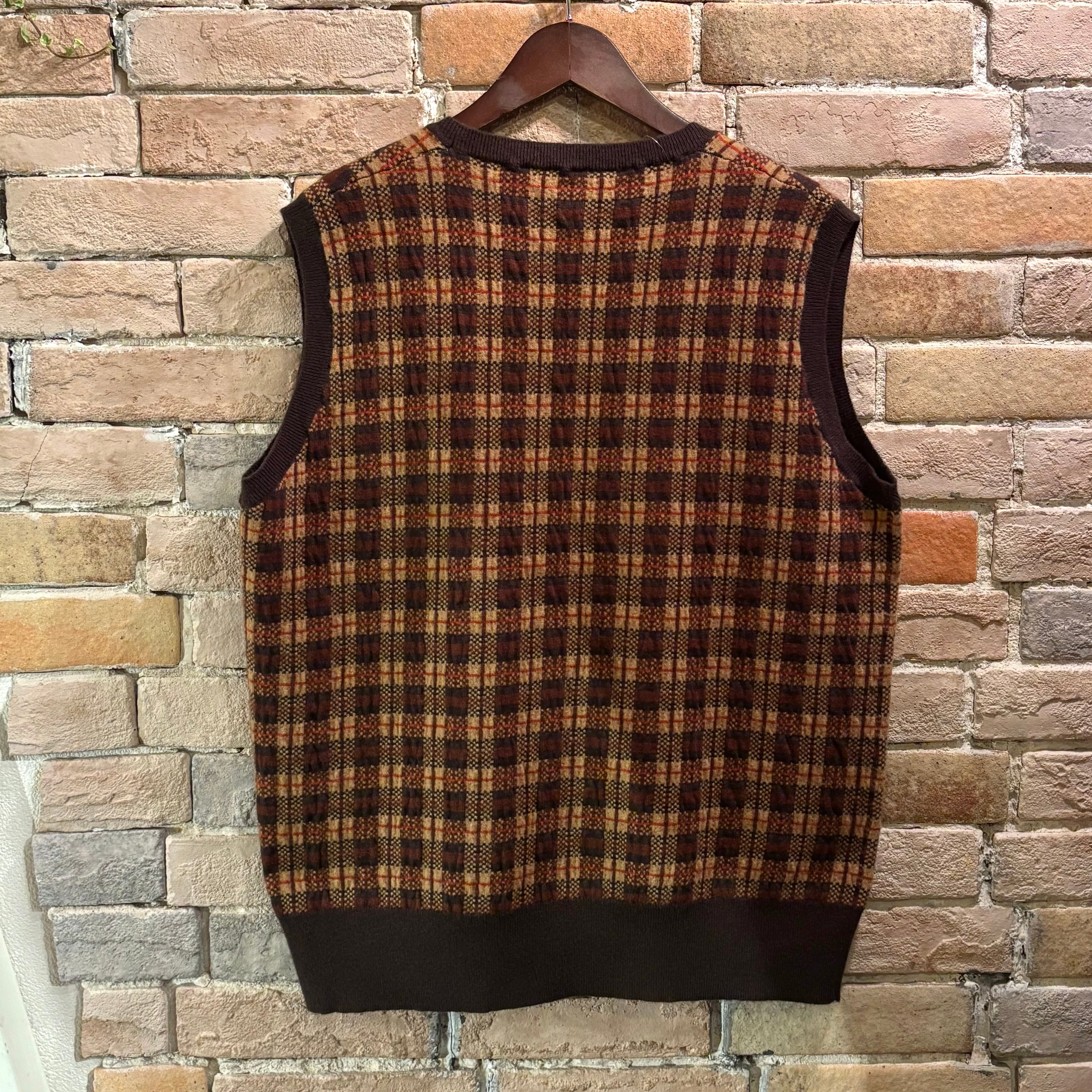 柔らかなブラウン系のチェック柄にクルーネック仕様のニットベスト。