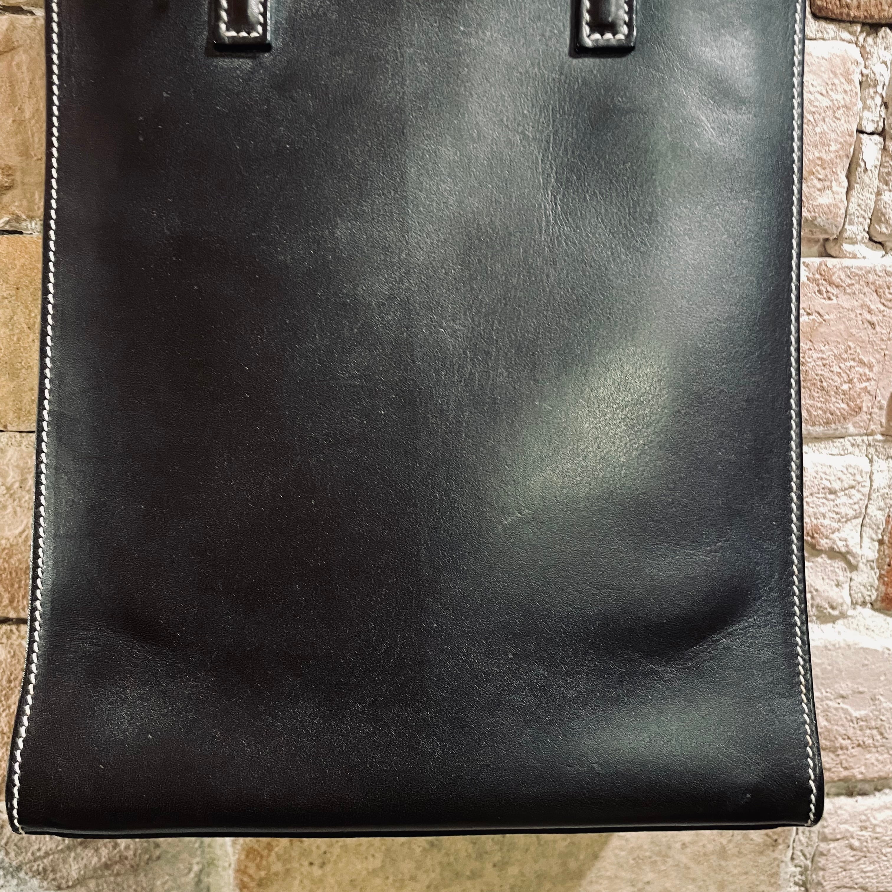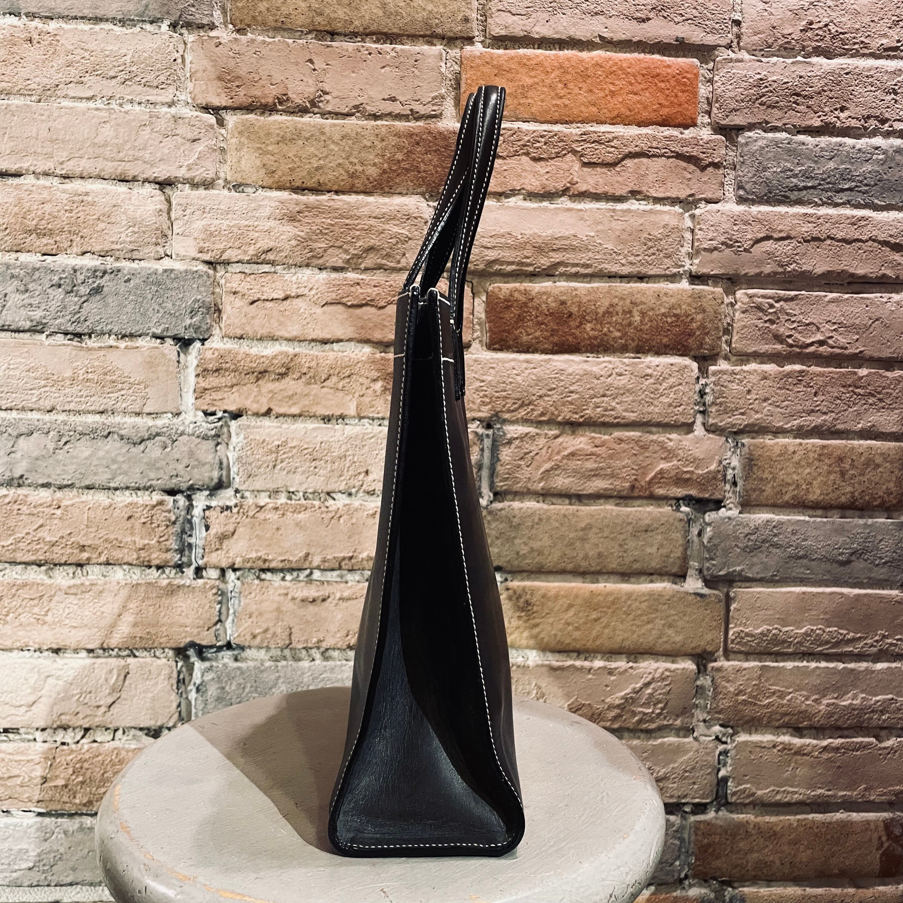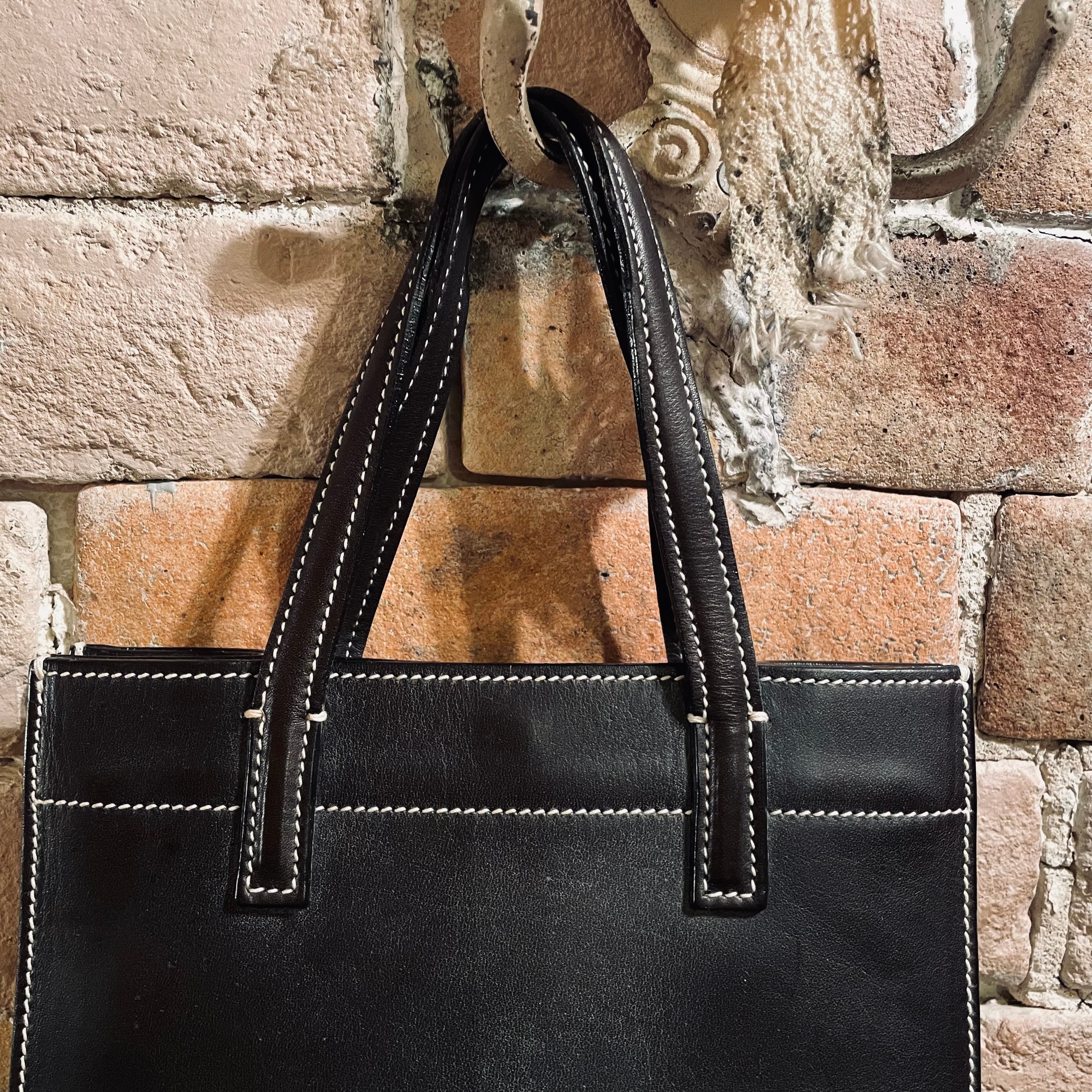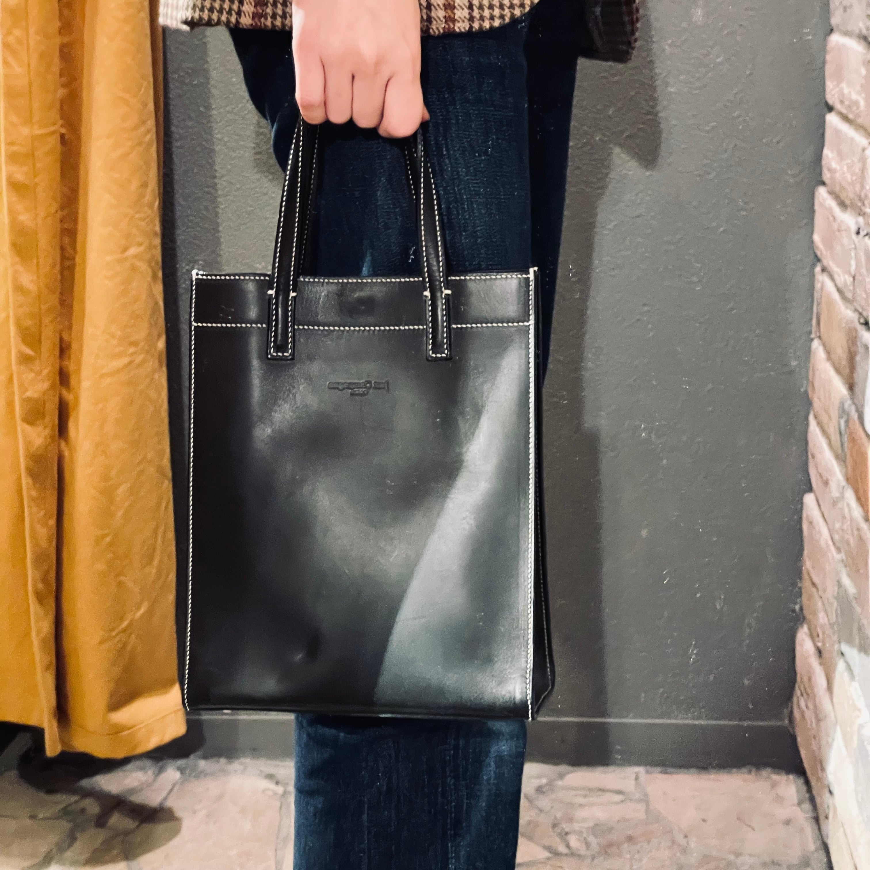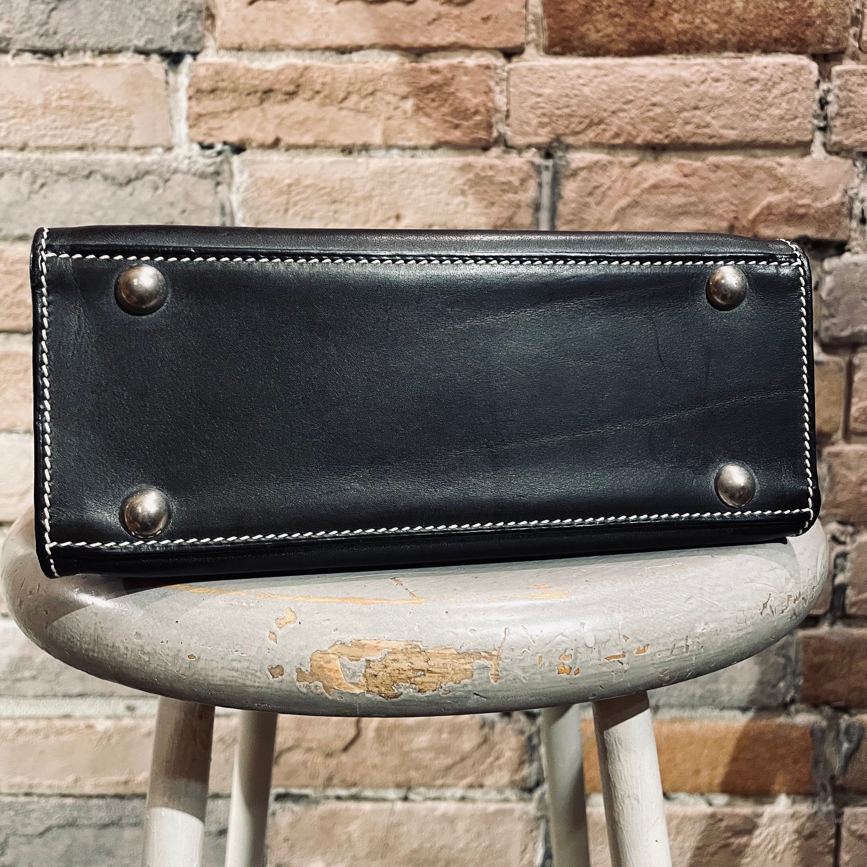 ブラックのレザーにホワイトステッチがアクセントのシンプルな縦長の小さめのデザイン。