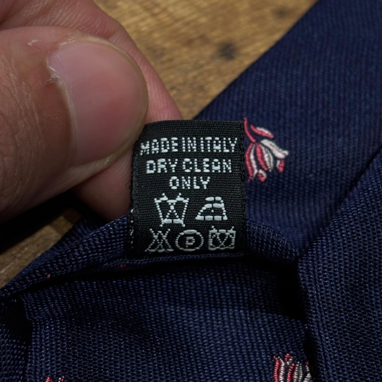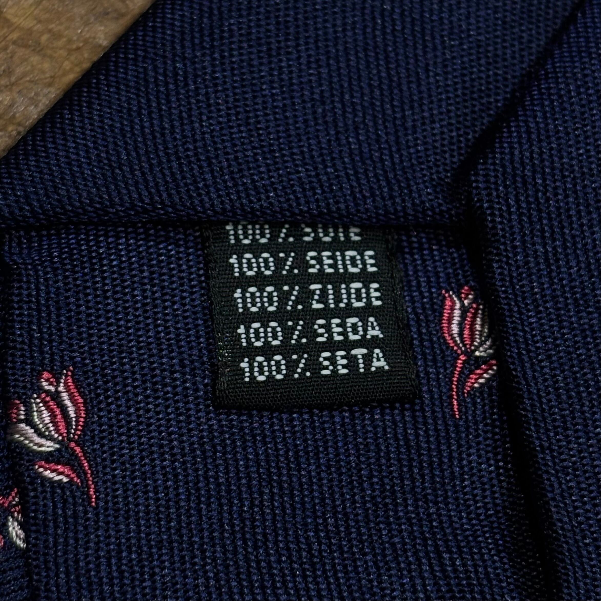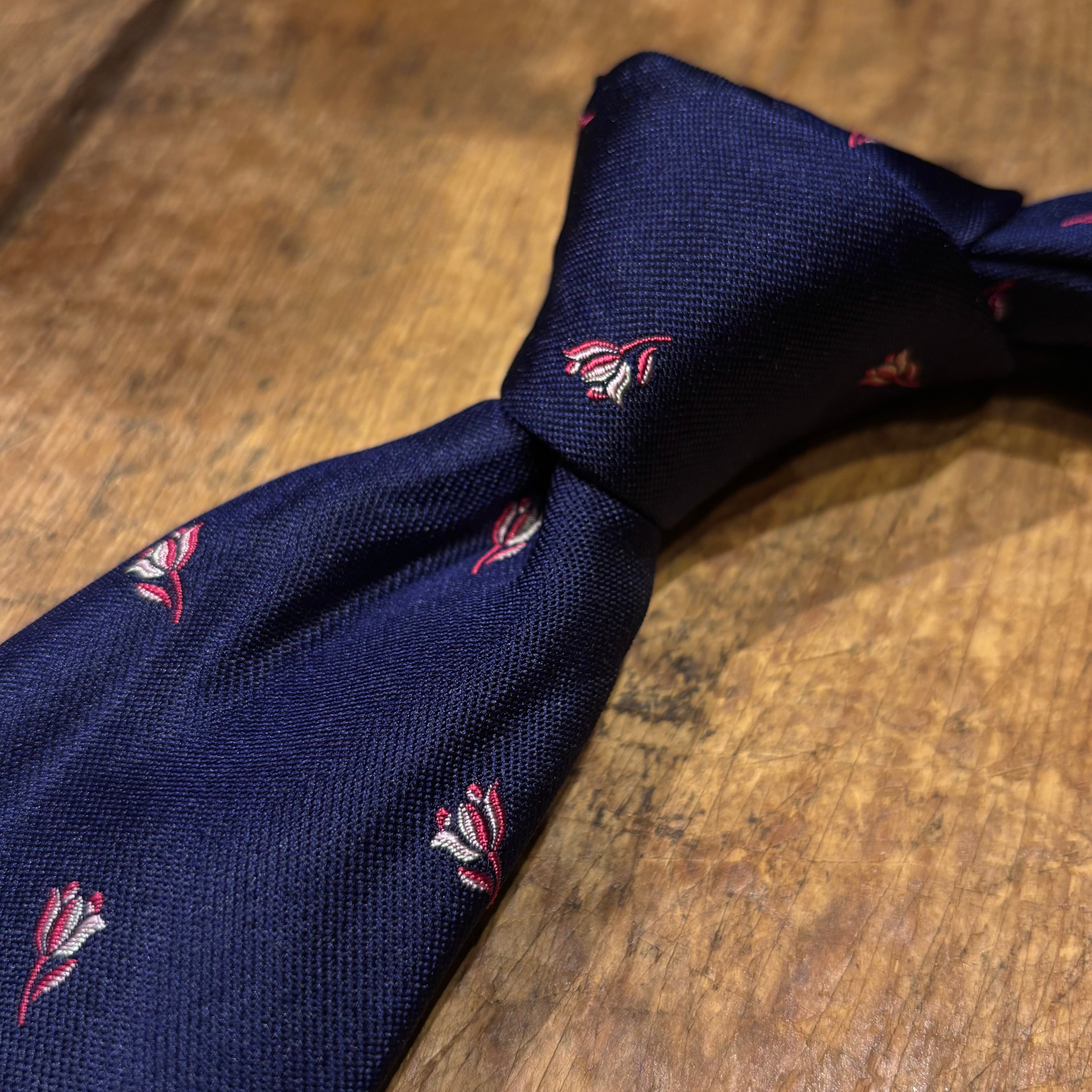 程良い艶感のネイビーに細かな花柄が上品な雰囲気のイタリア製シルクネクタイ。