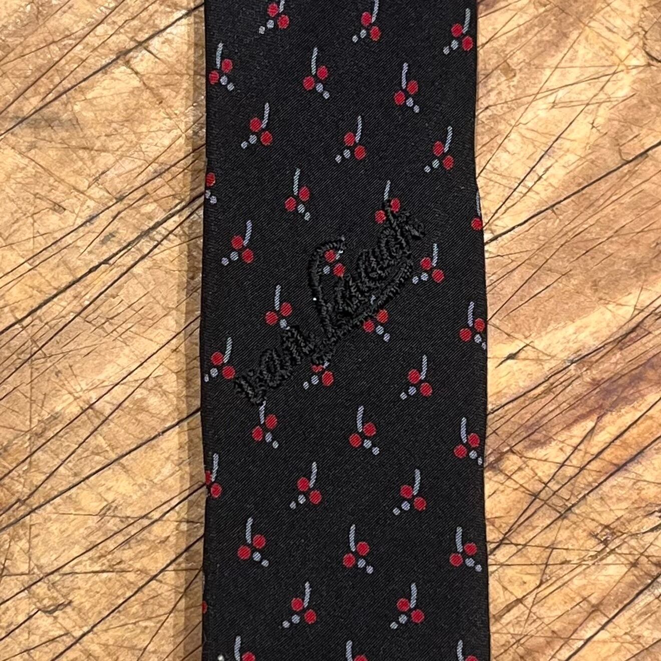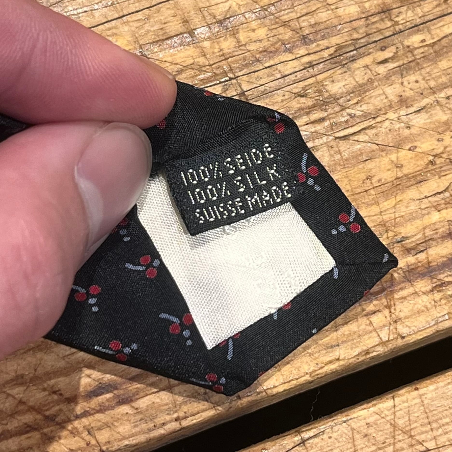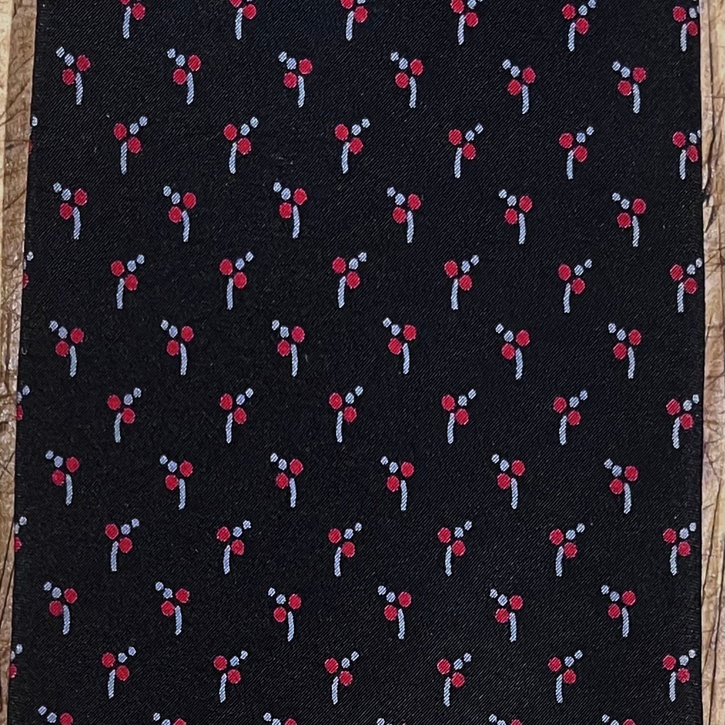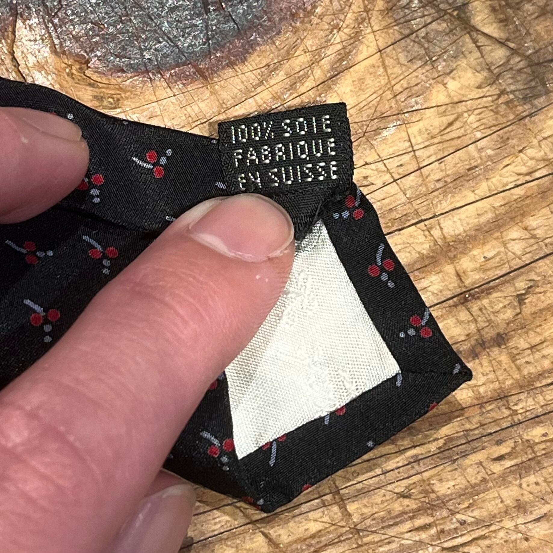 ブラックのベースに細かな柄使い、程良く艶感あるスイス製シルクタイ。
