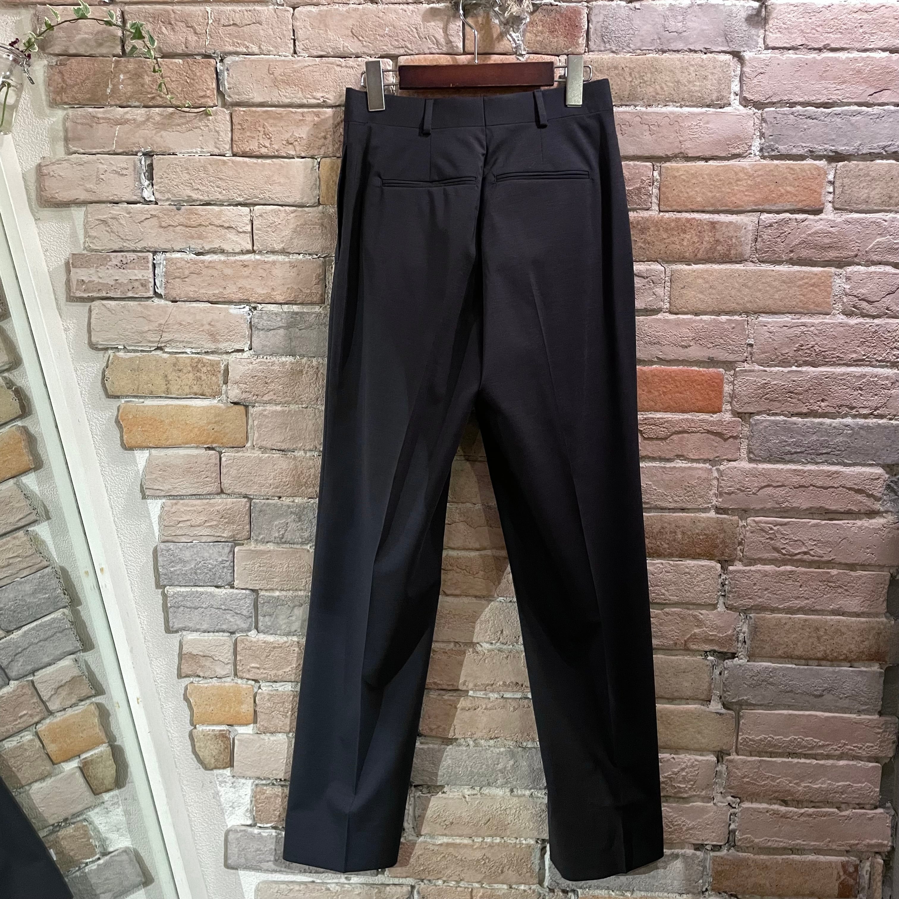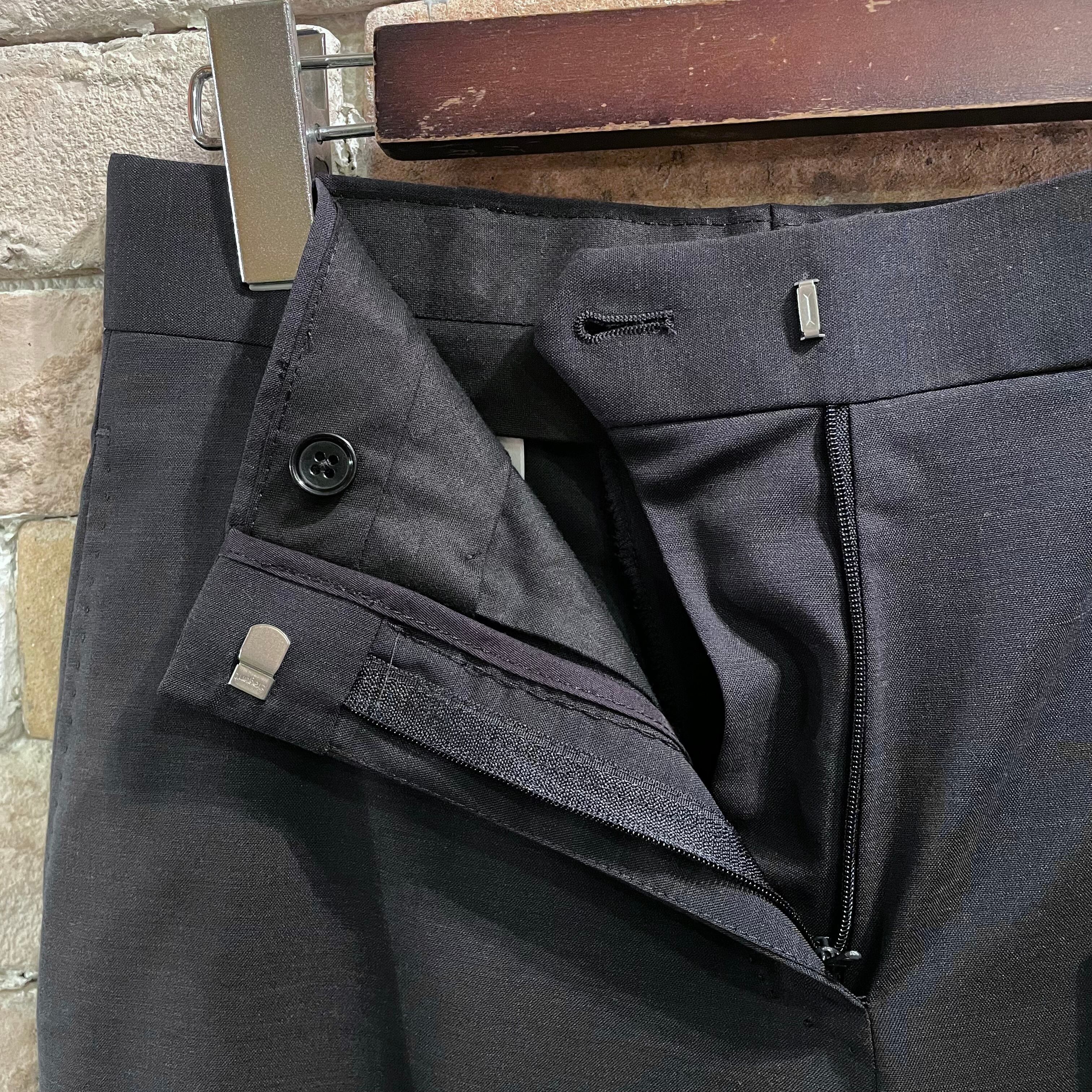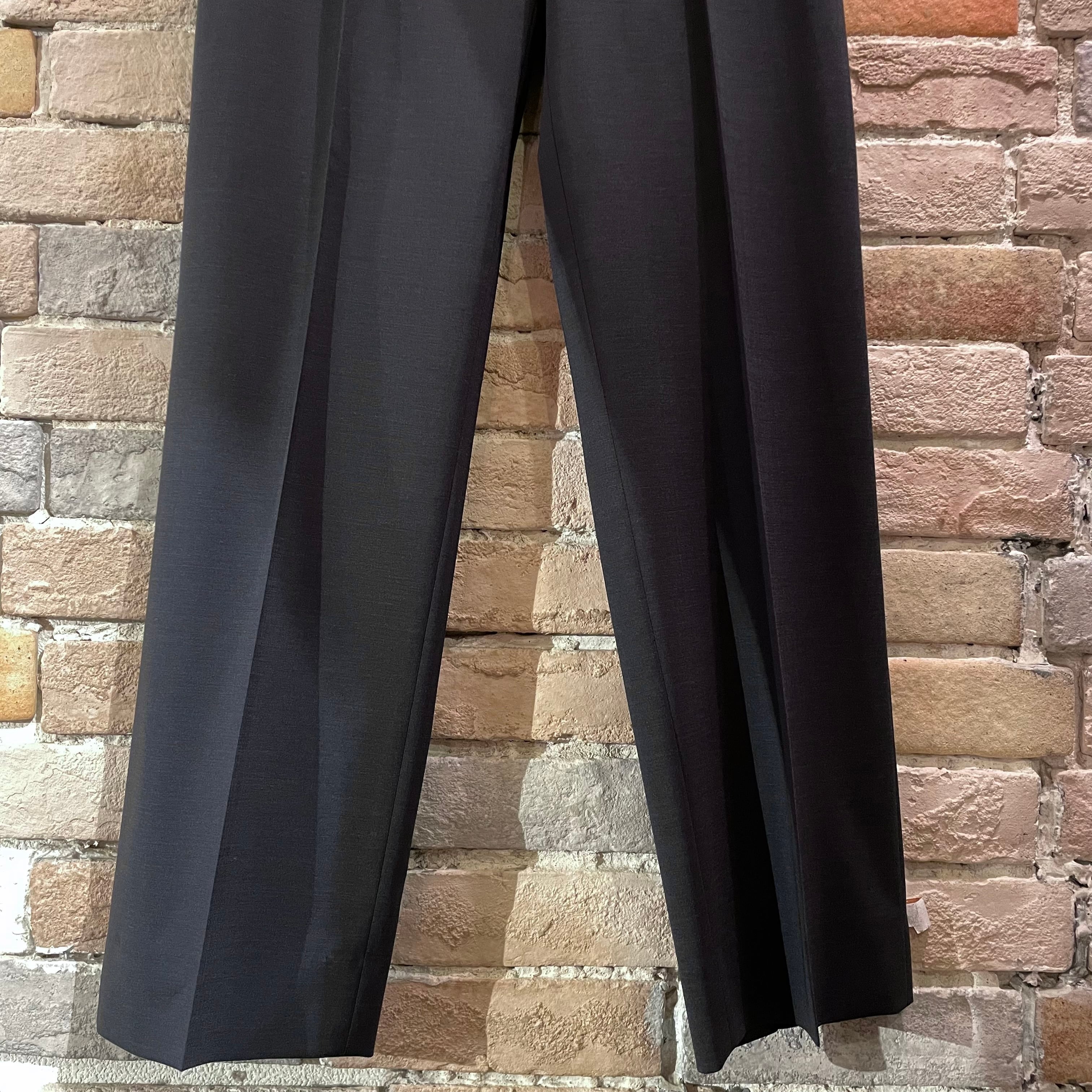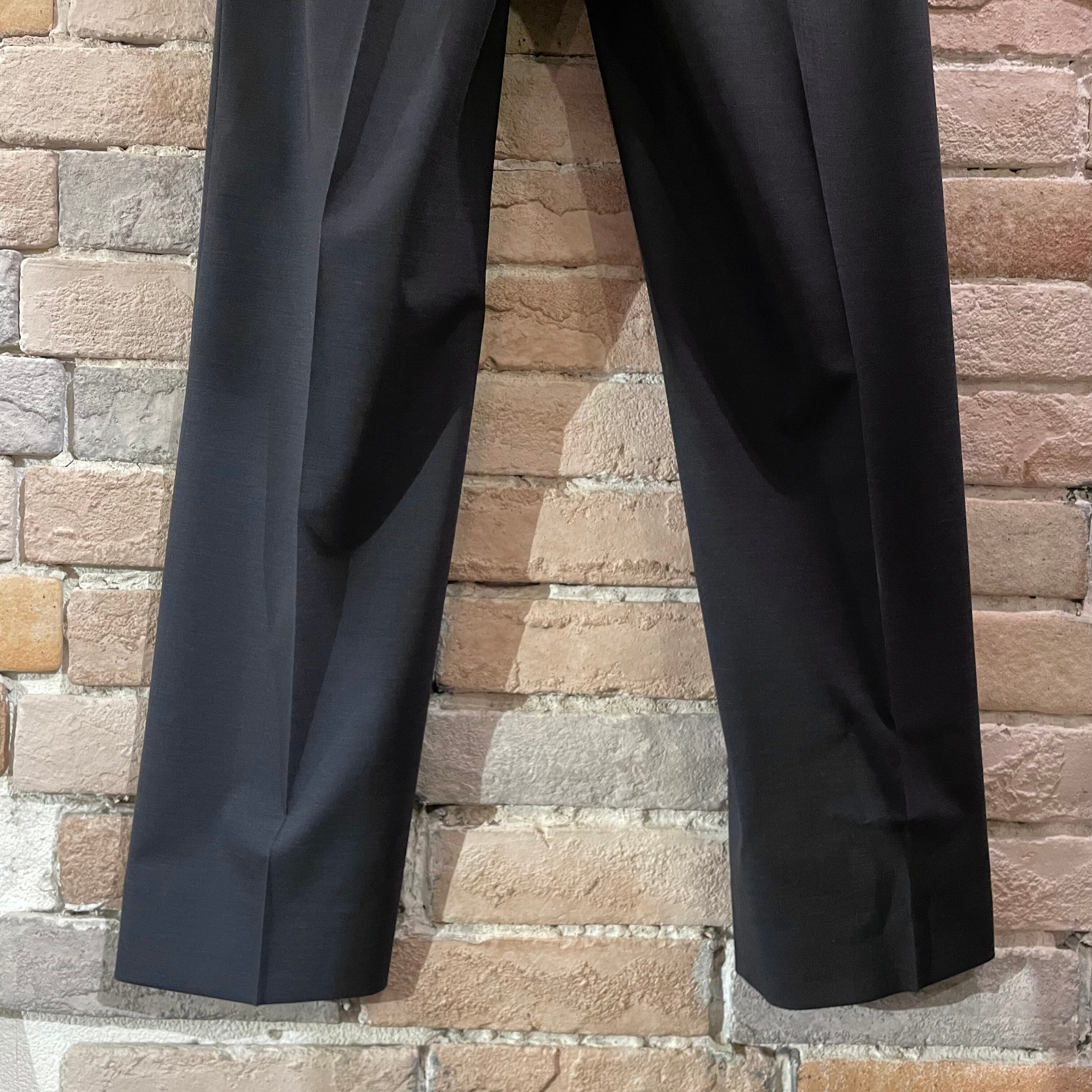 上質な生地感にワタリから裾までスッキリとしたシルエットのネイビーグレーノープリーツトラウザー。