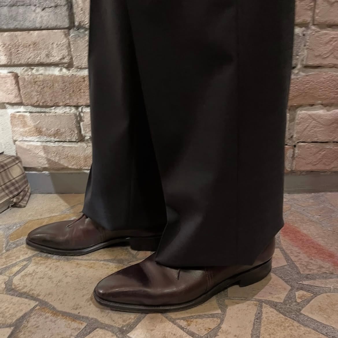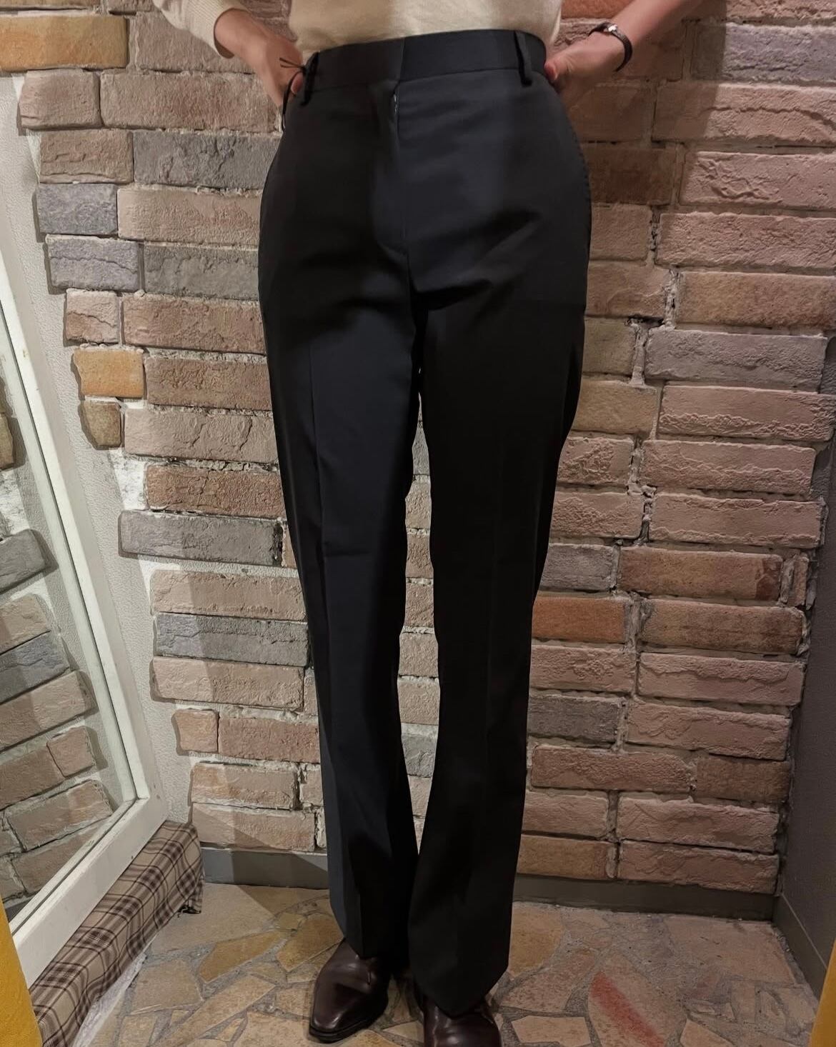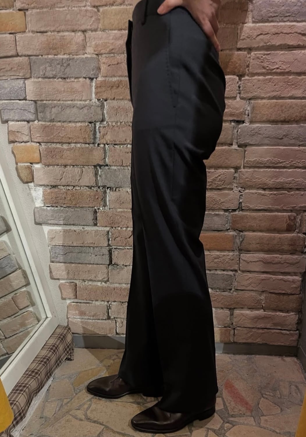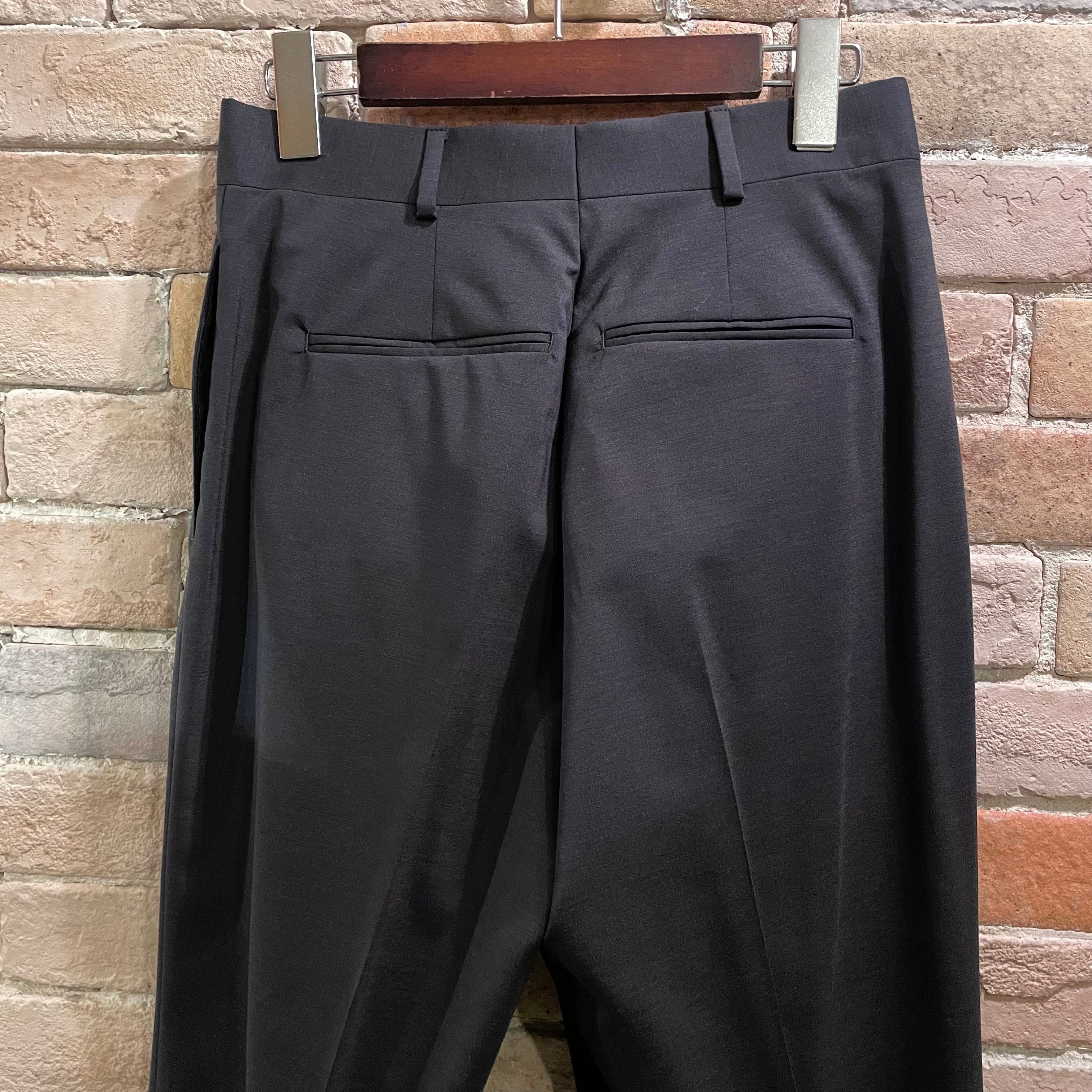 上質な生地感にワタリから裾までスッキリとしたシルエットのネイビーグレーノープリーツトラウザー。