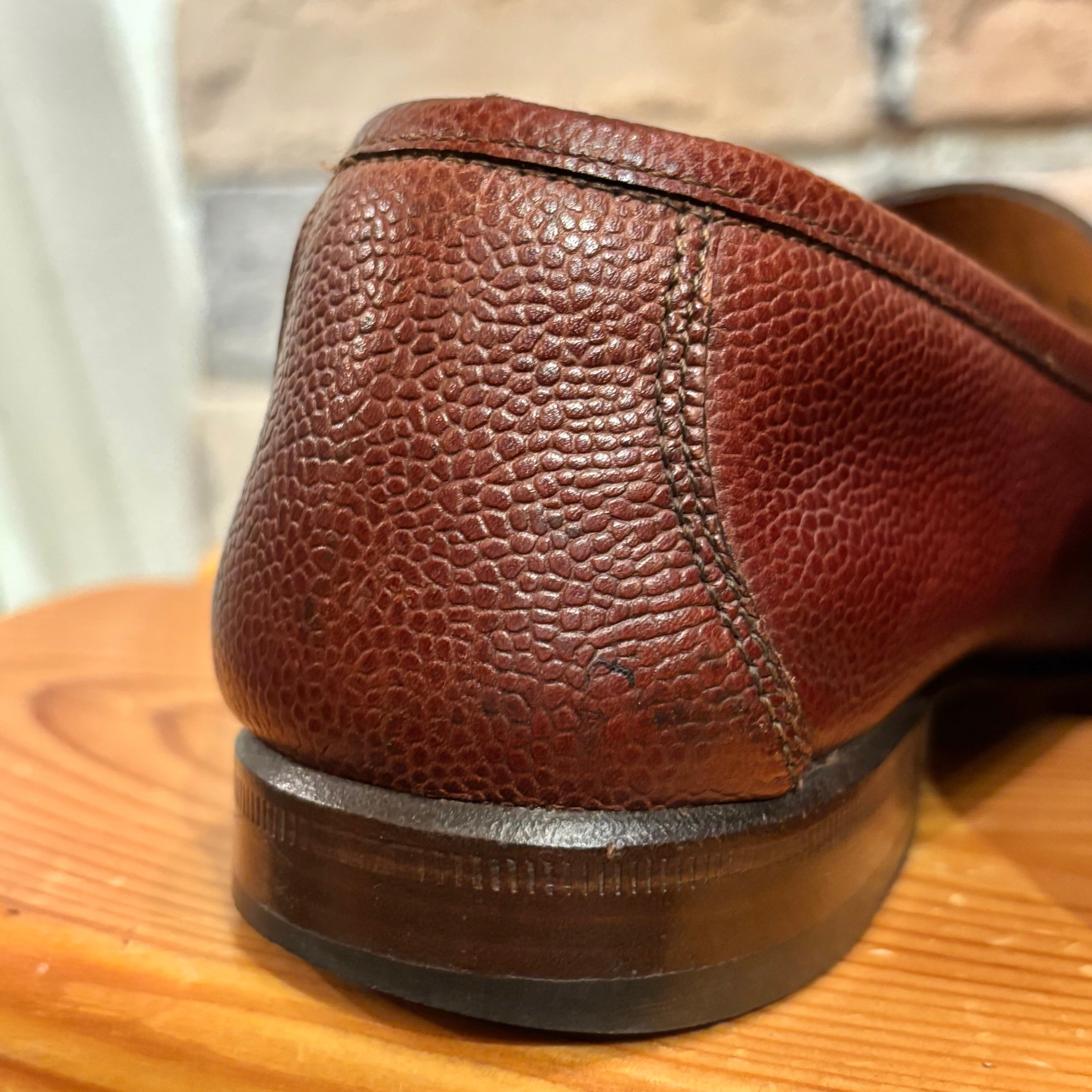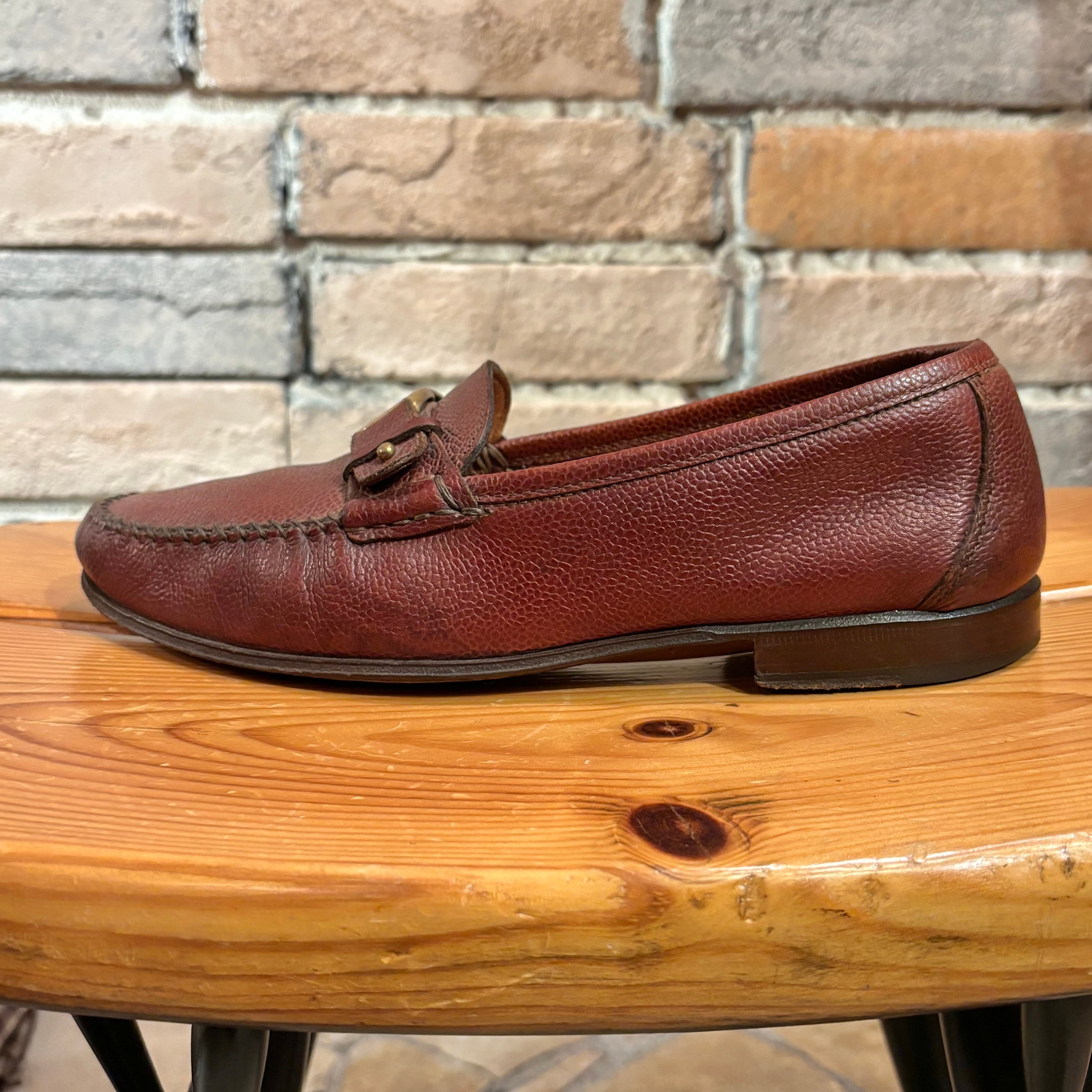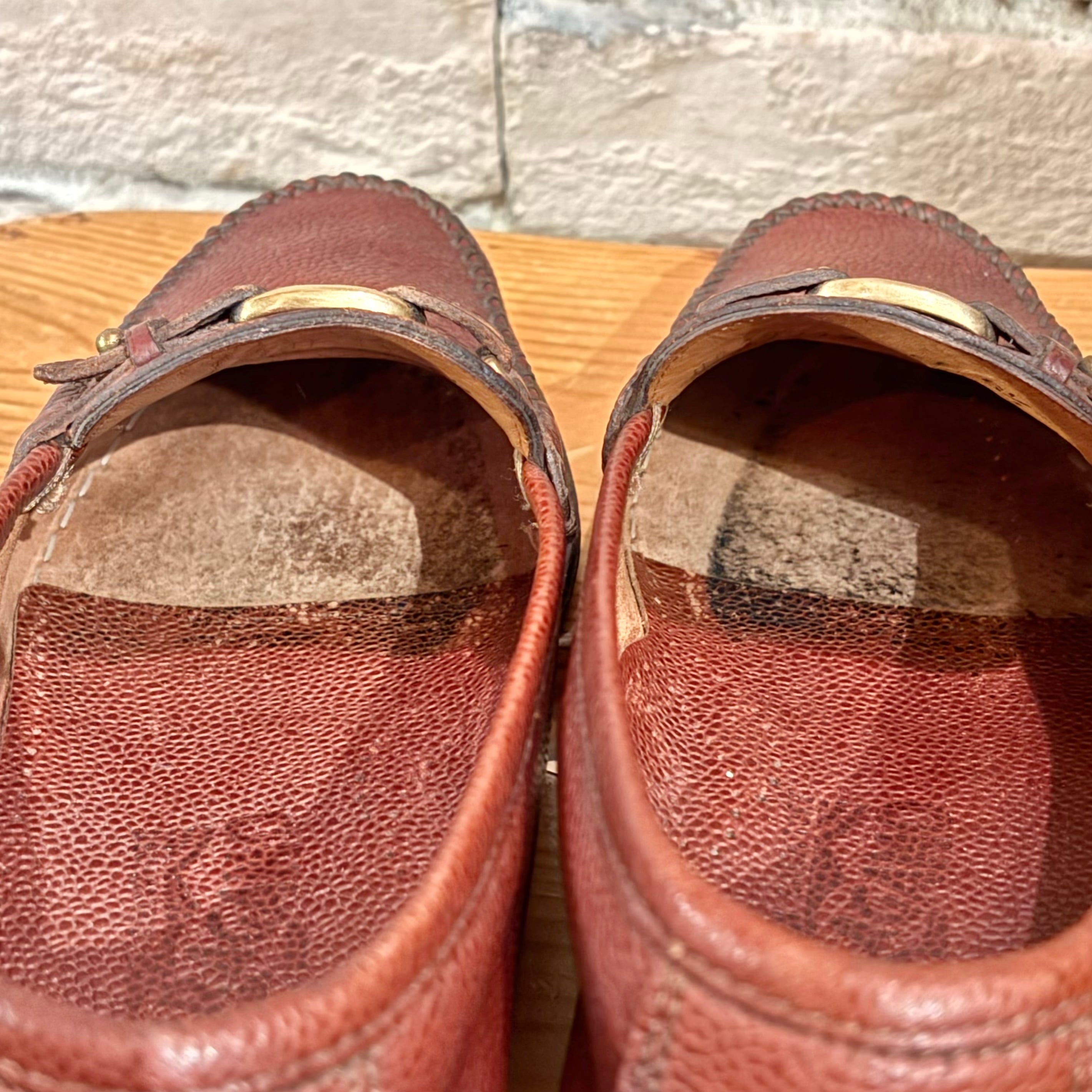 赤茶のシボ革にゴールドのバックルが軽快な雰囲気のイタリア製レザーローファー