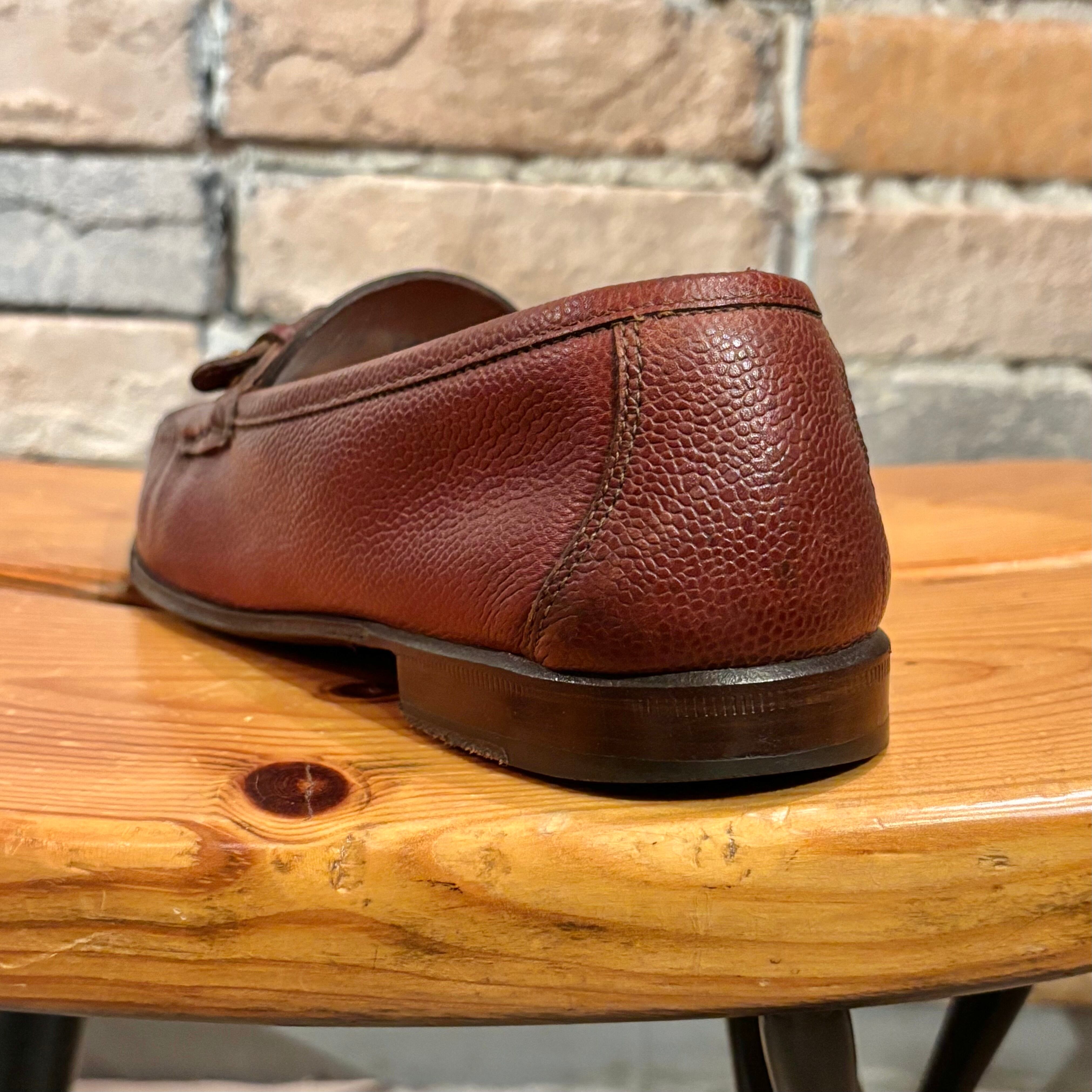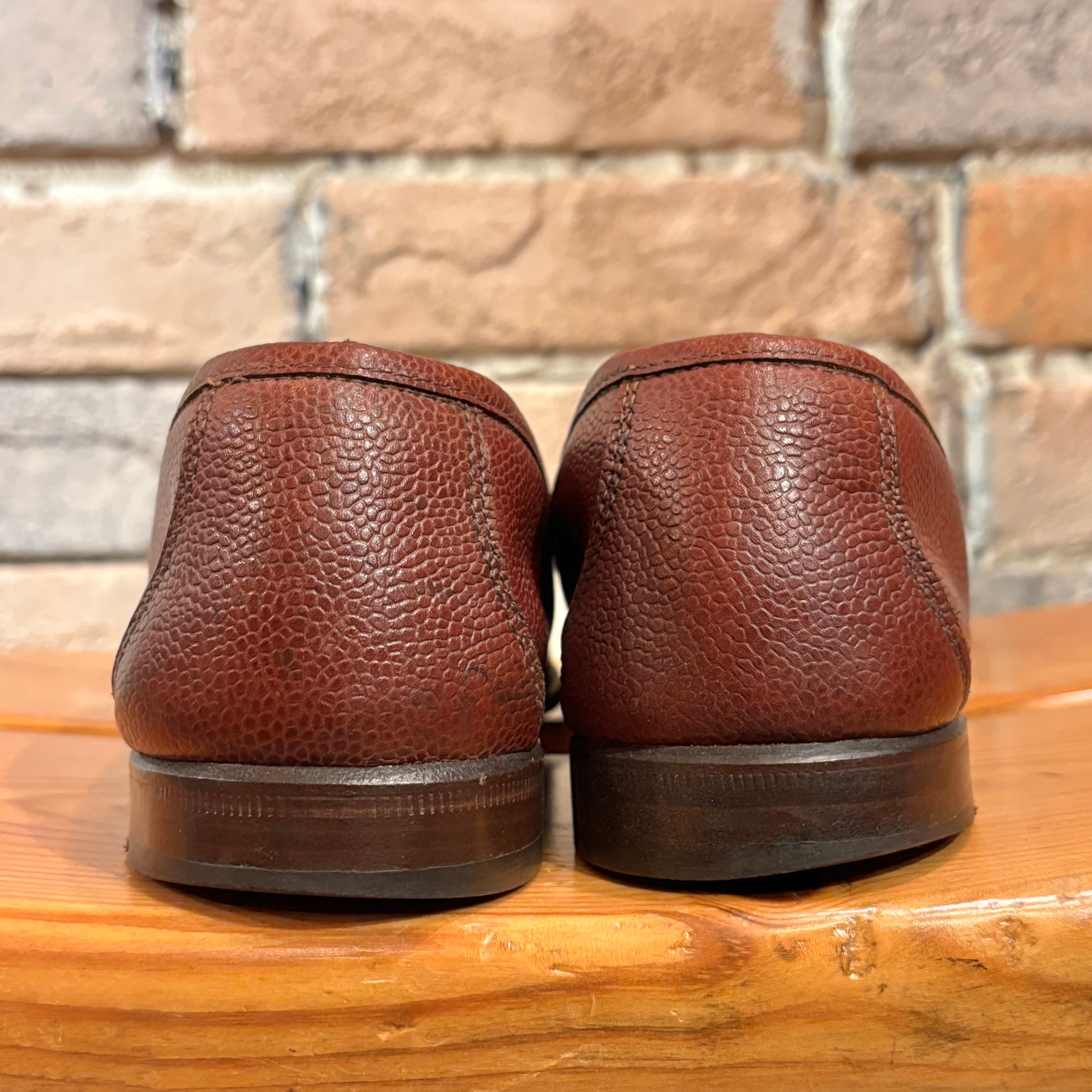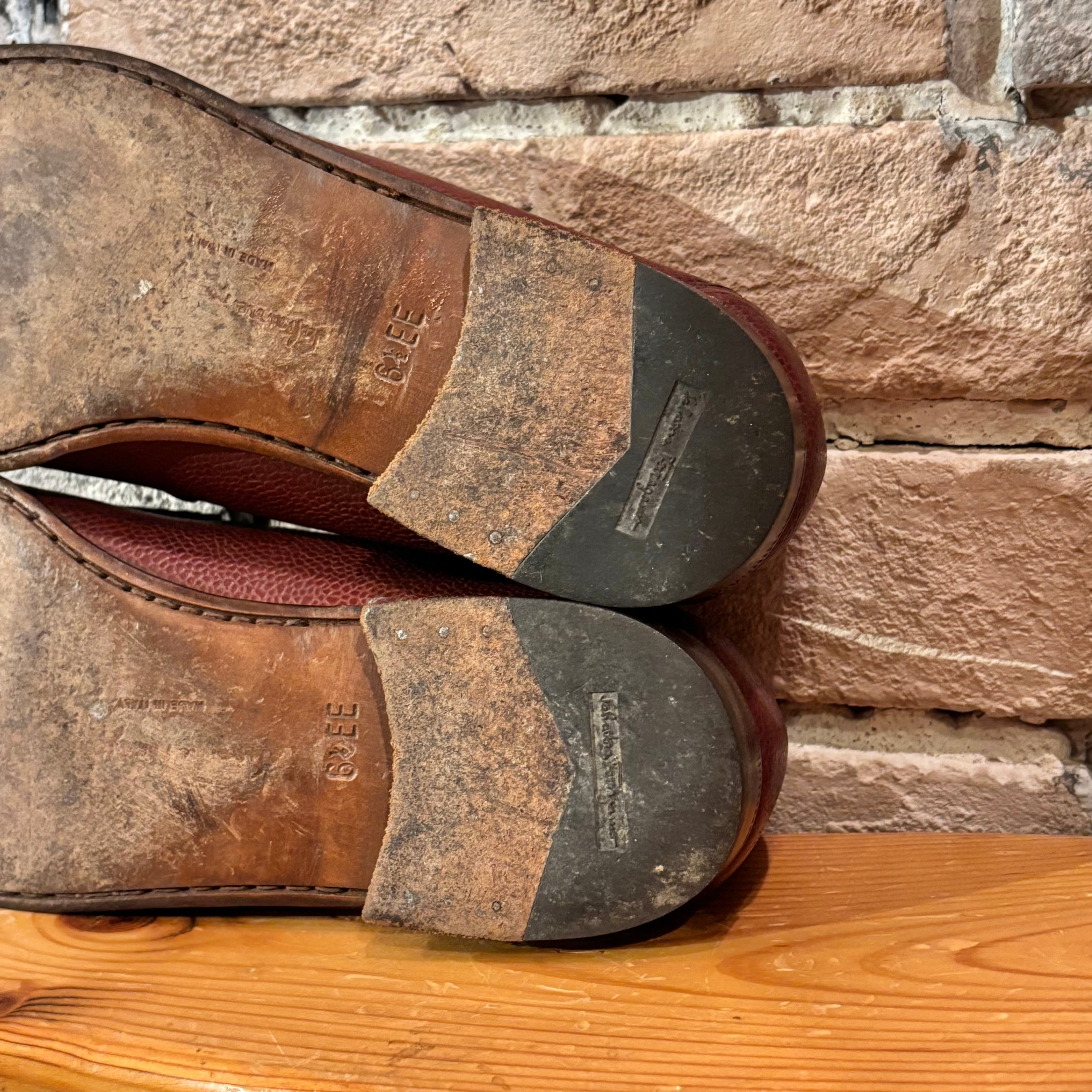 赤茶のシボ革にゴールドのバックルが軽快な雰囲気のイタリア製レザーローファー