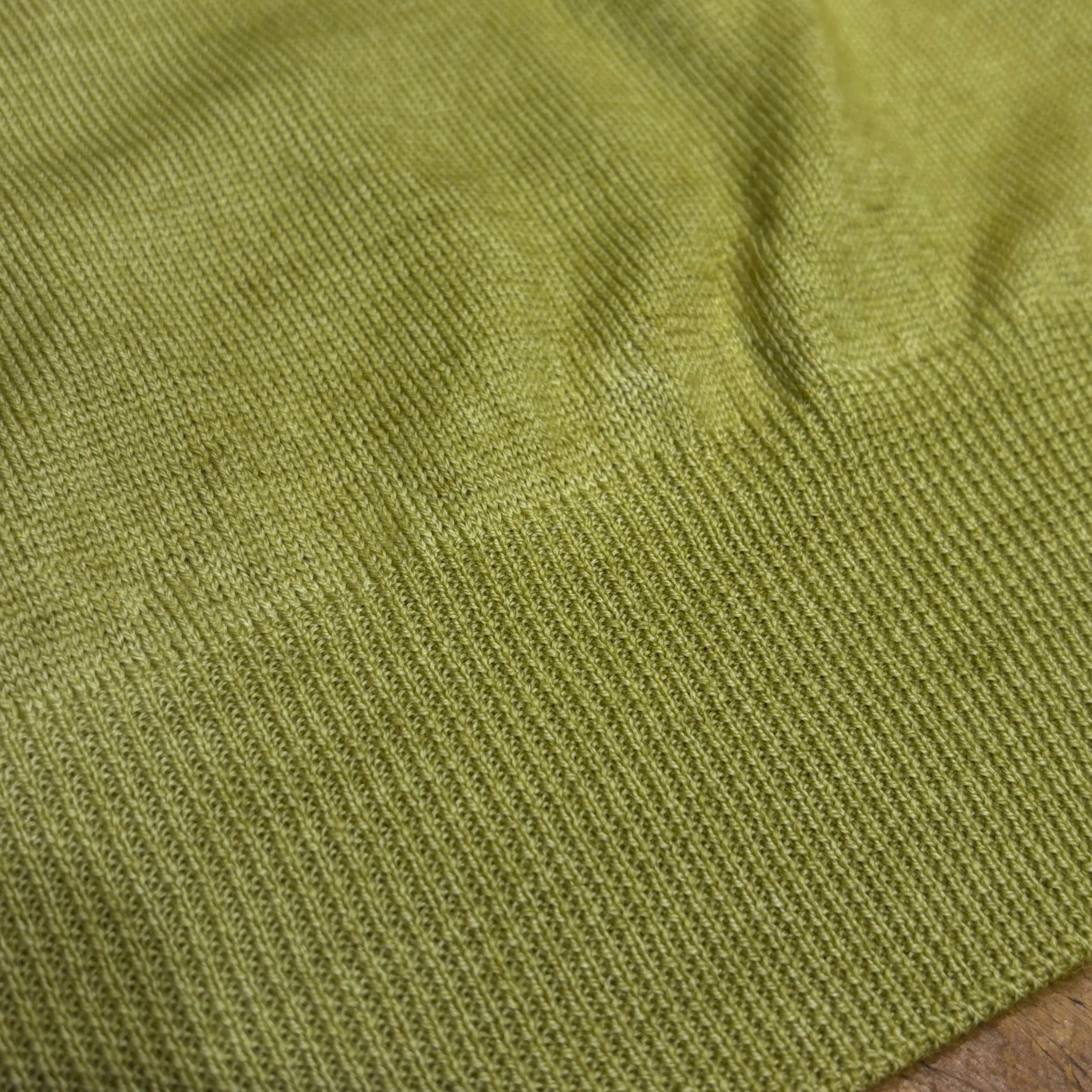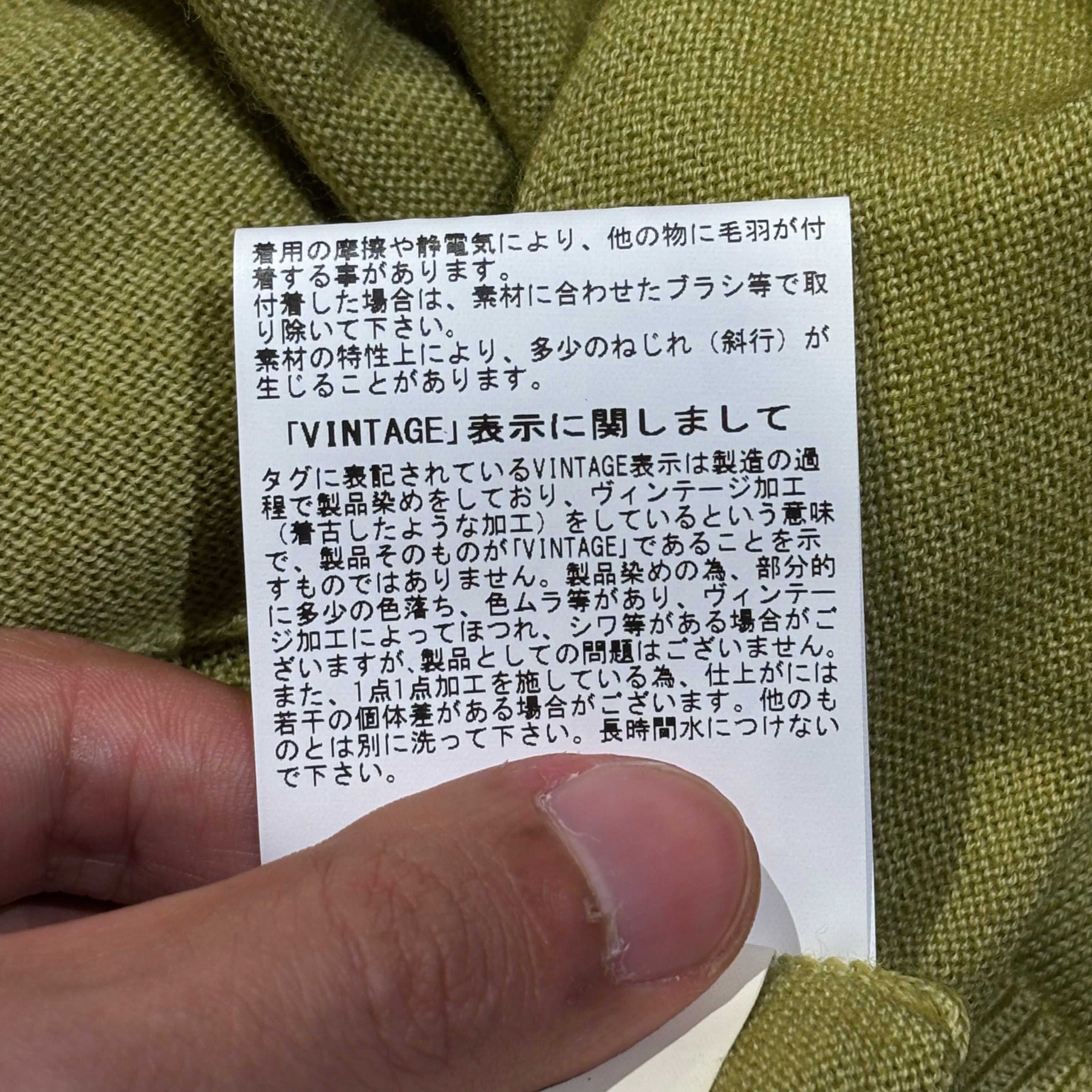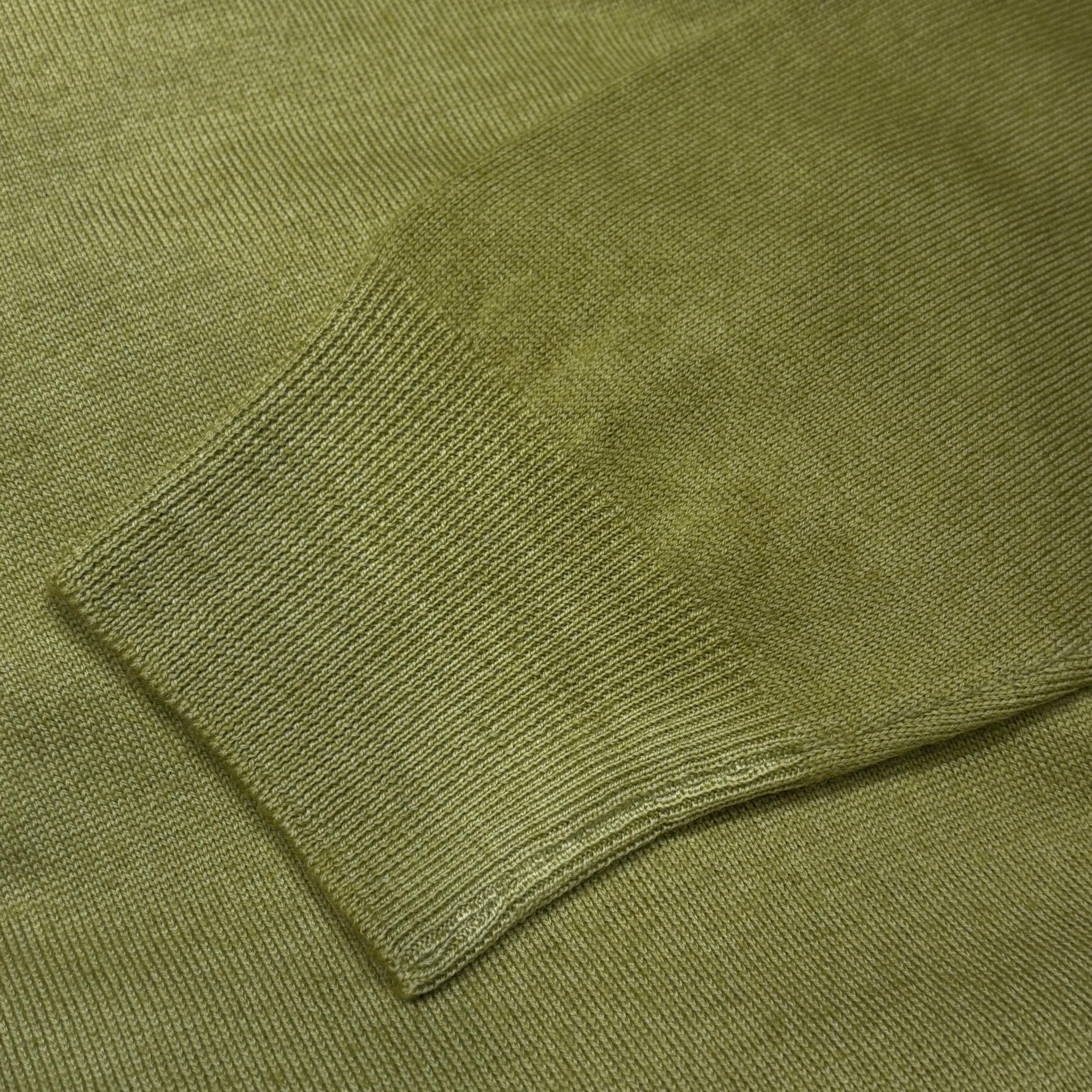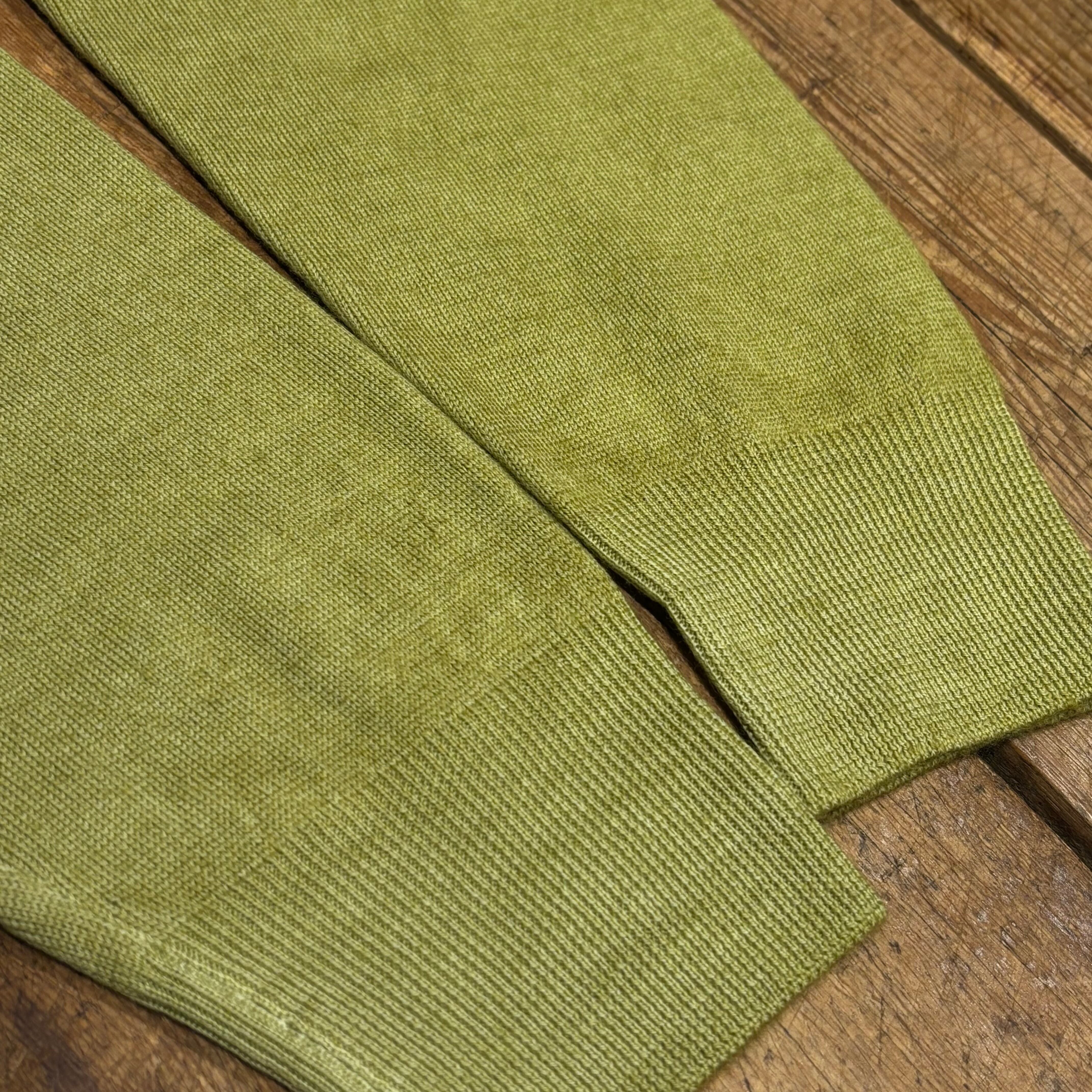 ライトグリーンの綺麗なカラーに製品染めによりリブ等にヴィンテージの様な色のムラ加工を施した1着。(ダメージ加工はございません)