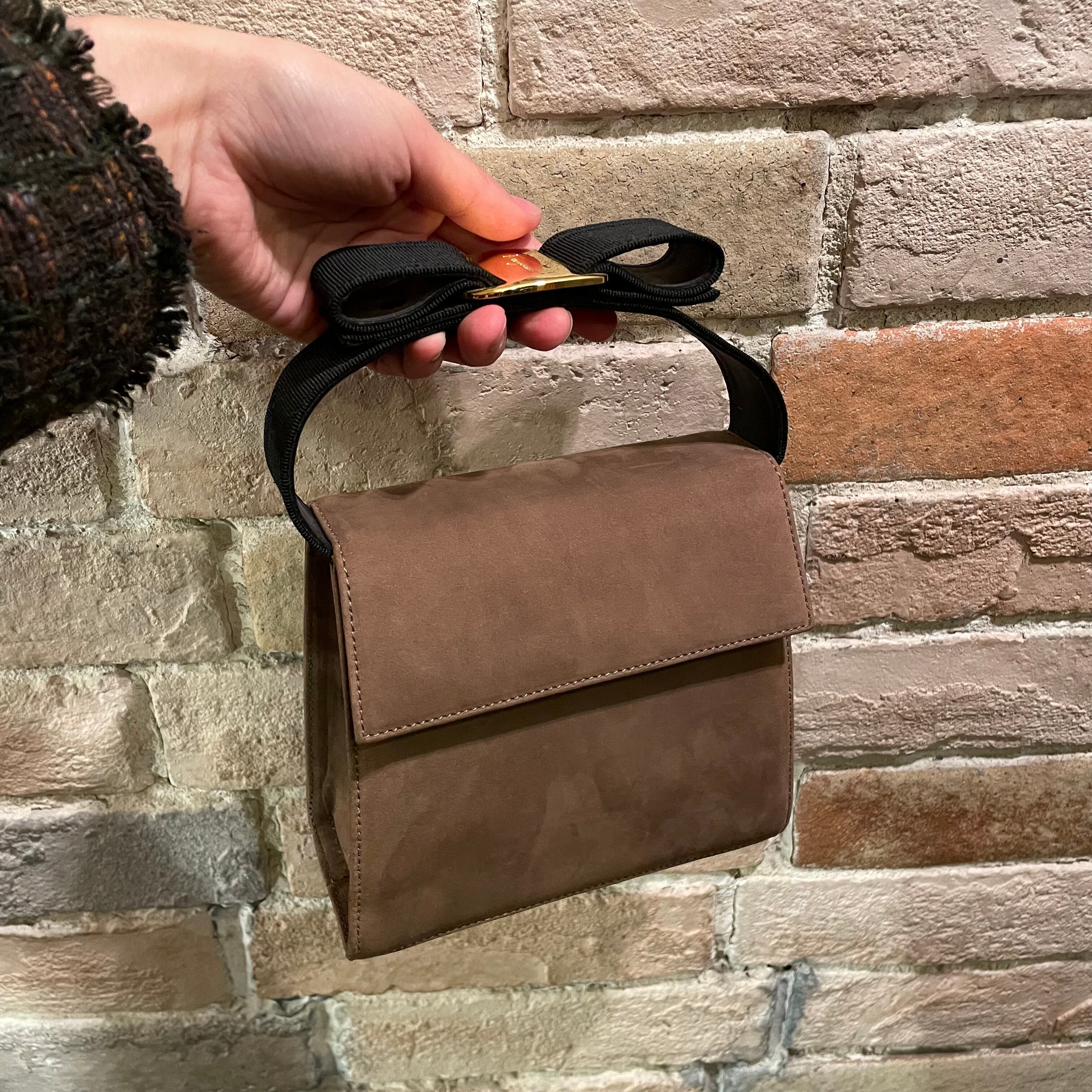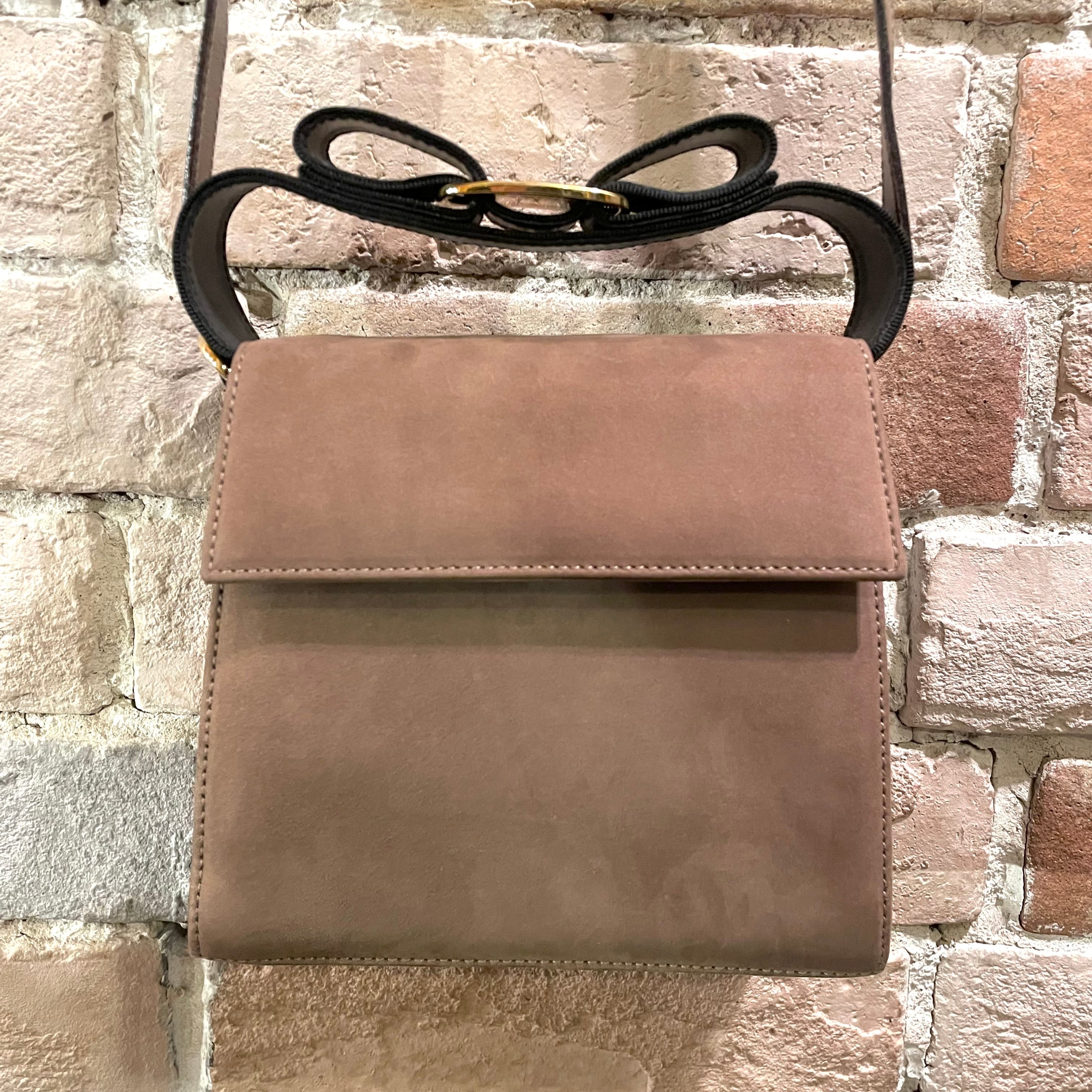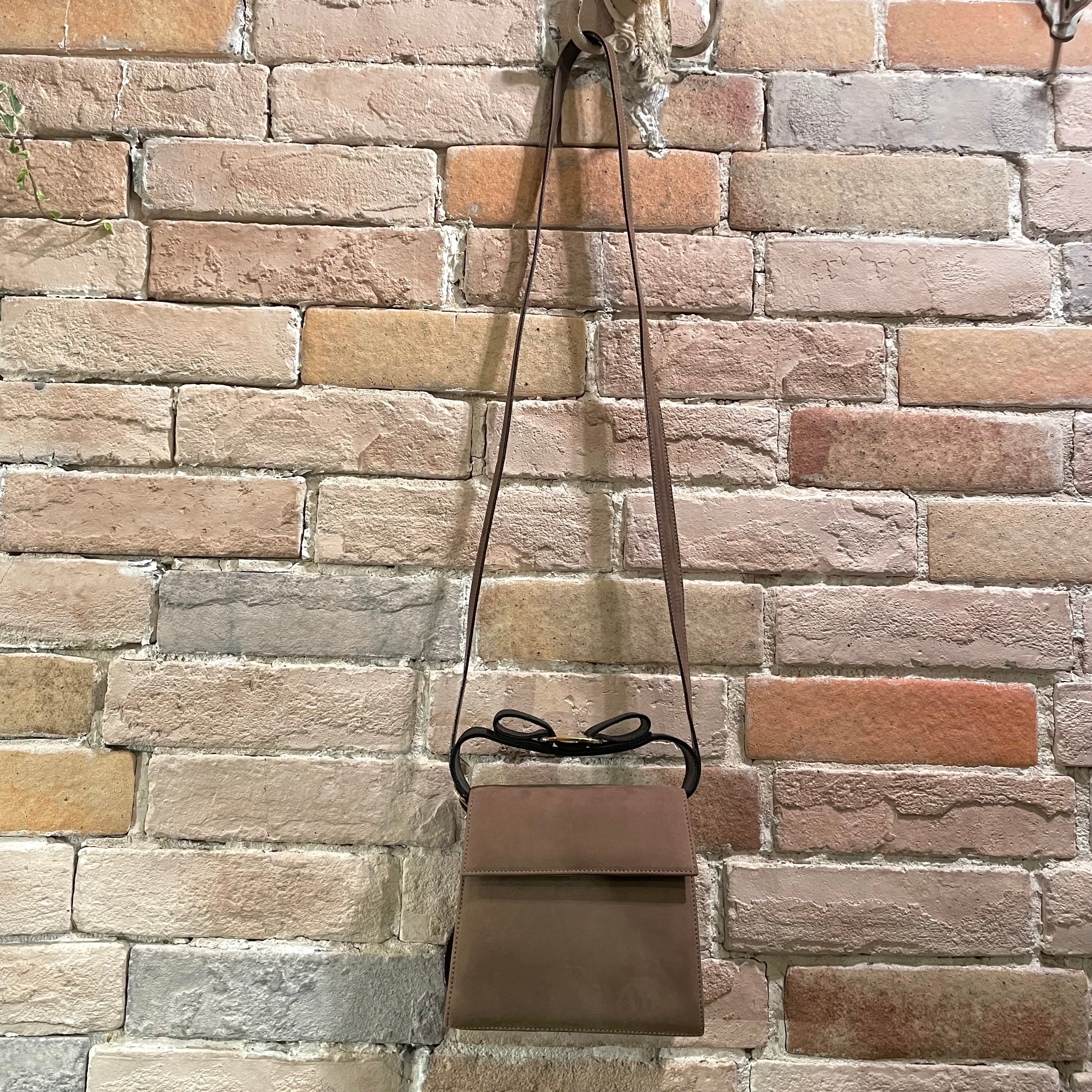 リボンがアクセントのグレージュヌバックレザーの2wayミニバッグ。