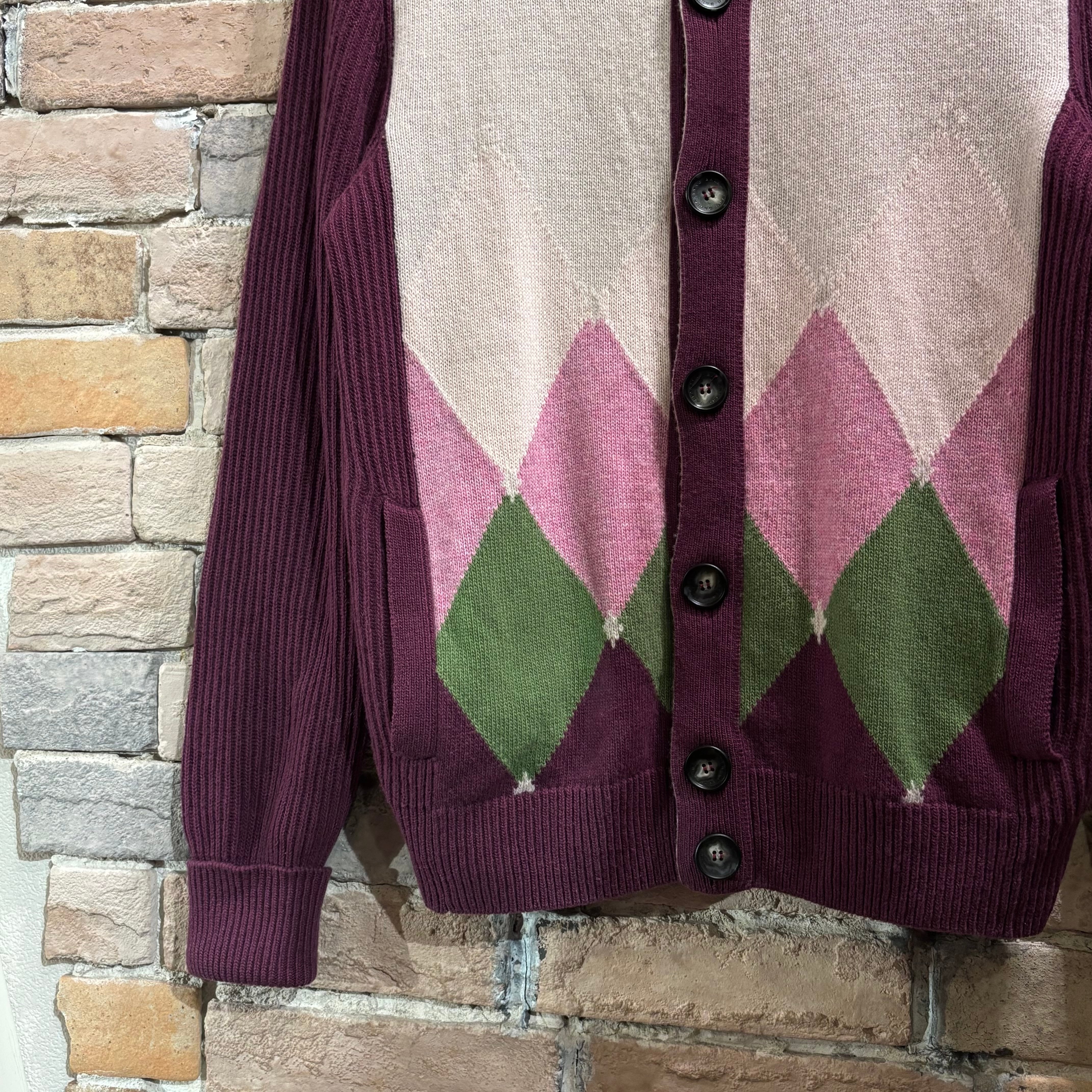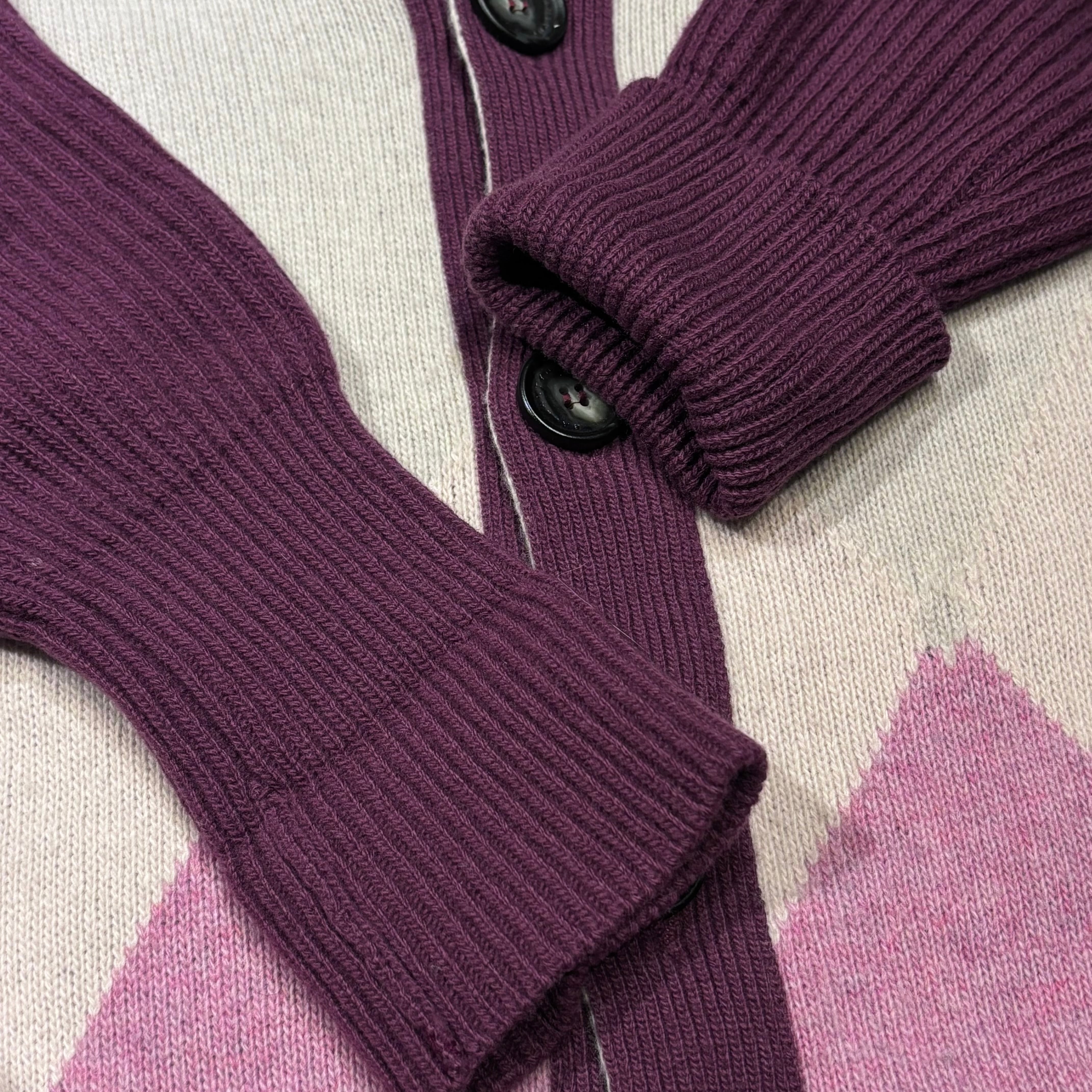 柔らかなウールに目を惹く色使いのハーリキンチェック柄のイタリア製インターシャカーディガン。