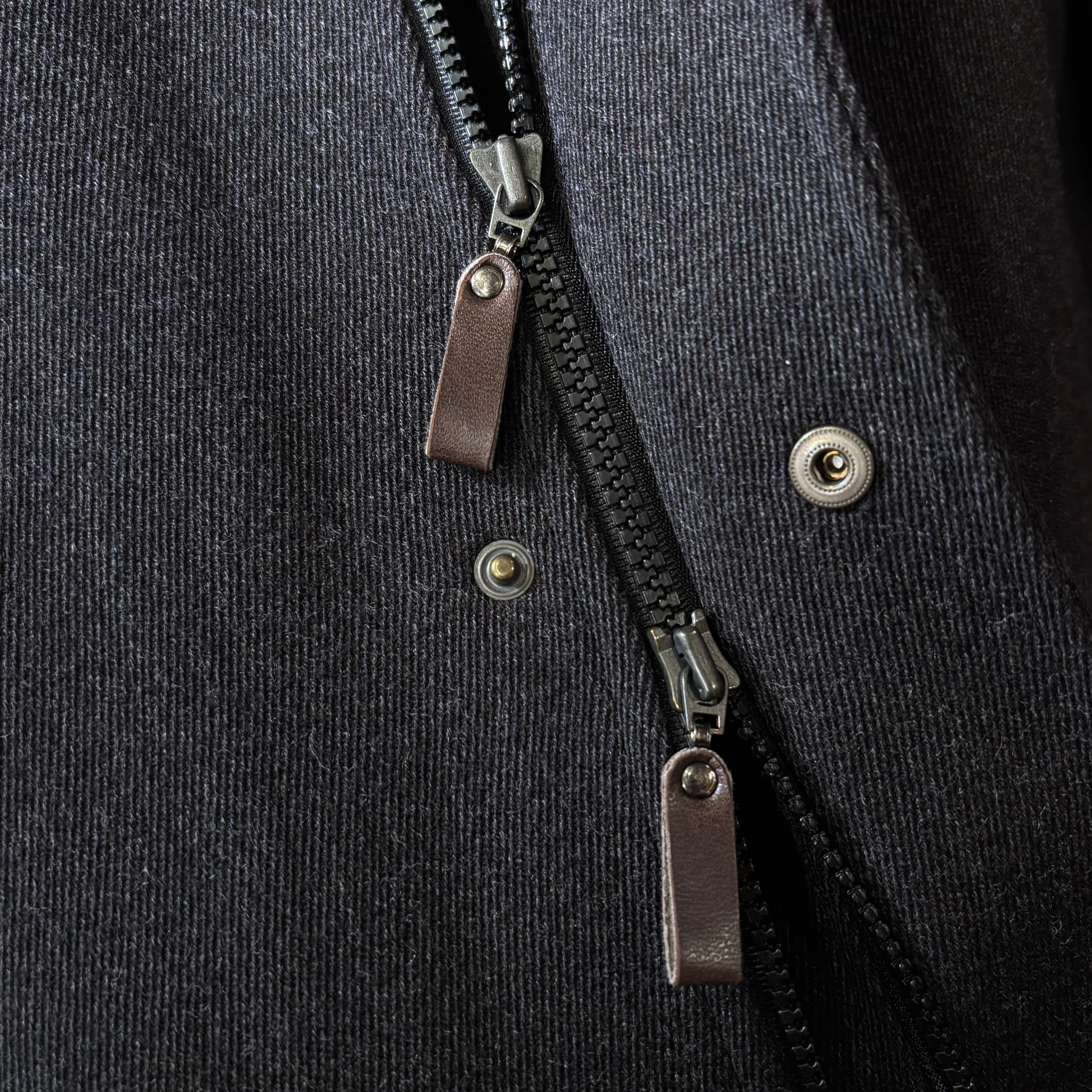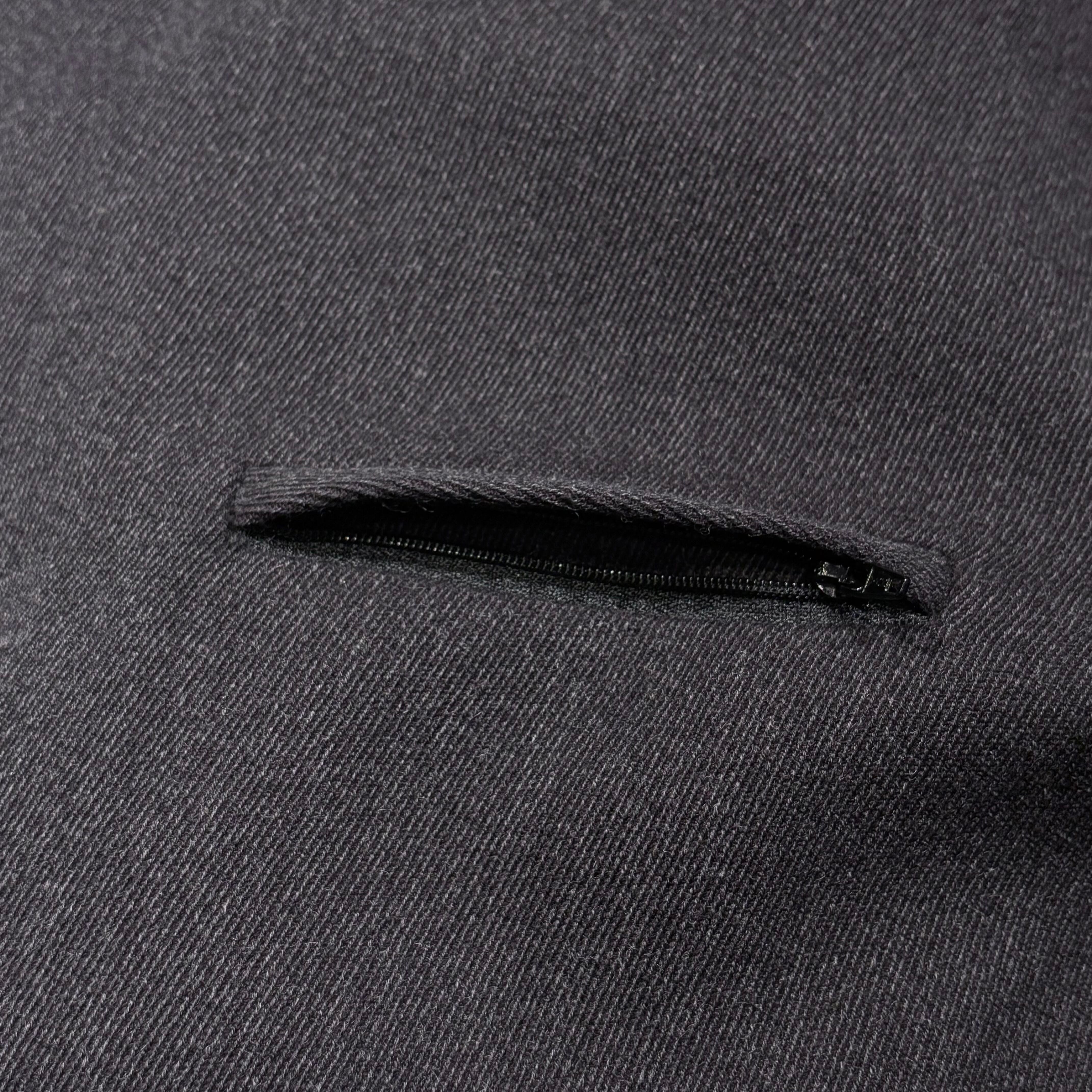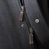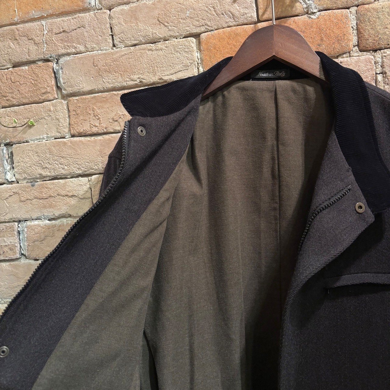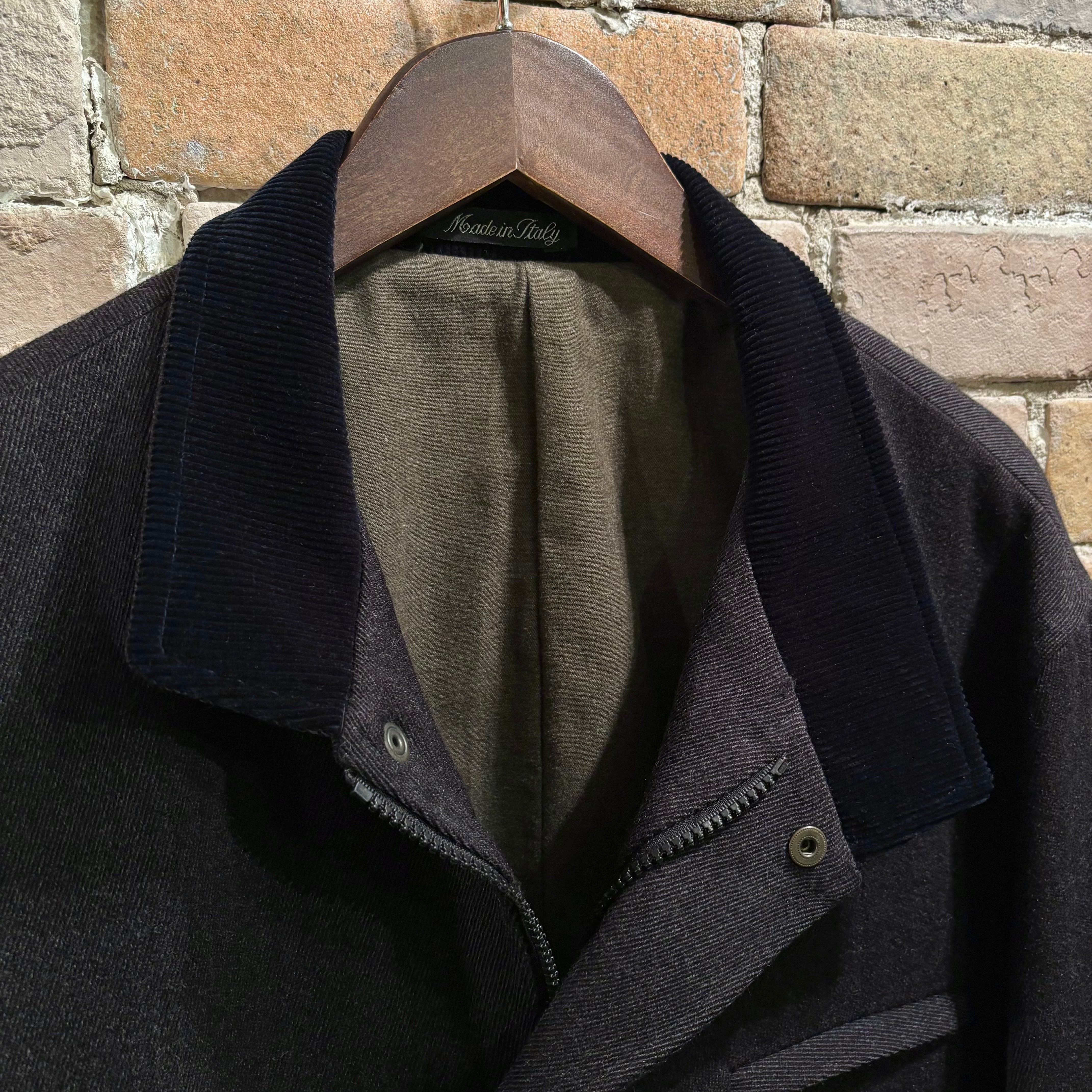 落ち着いたチャコールグレーに襟のネイビーコーデュロイ、ダブルジップ仕様が着方を楽しめる、イタリア製ウールナイロンコート。