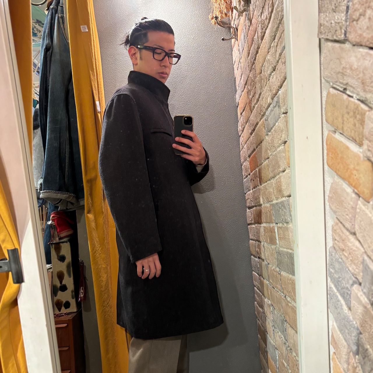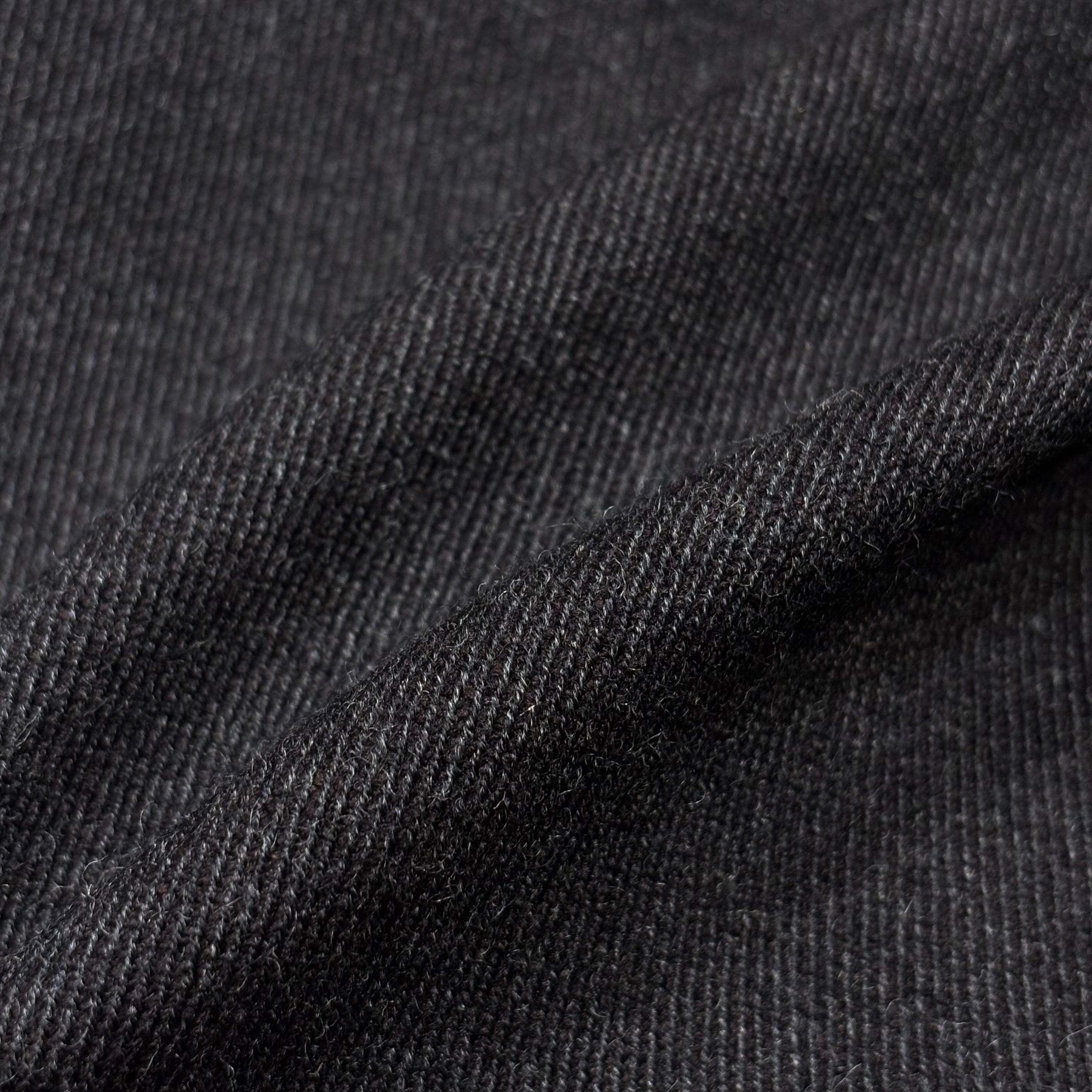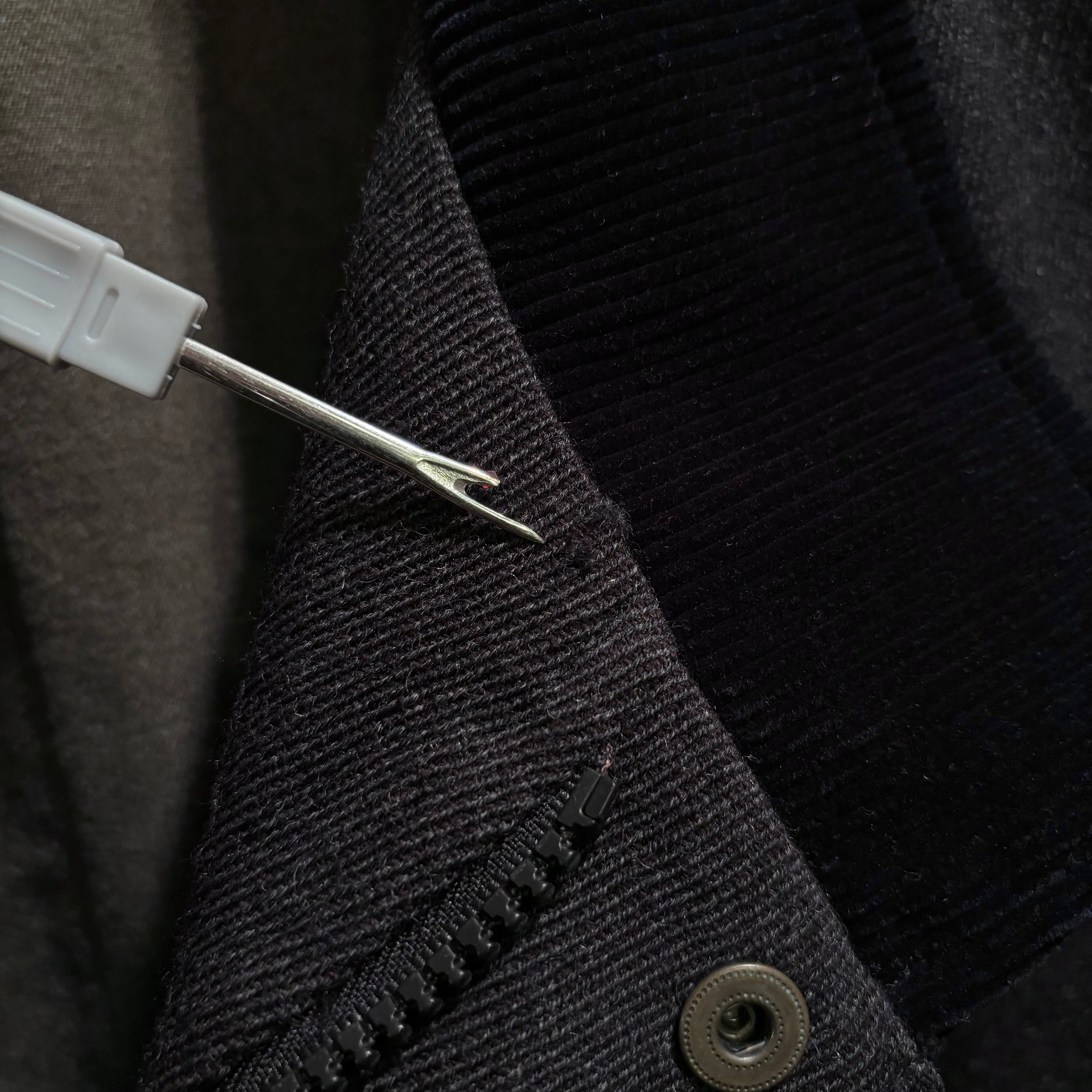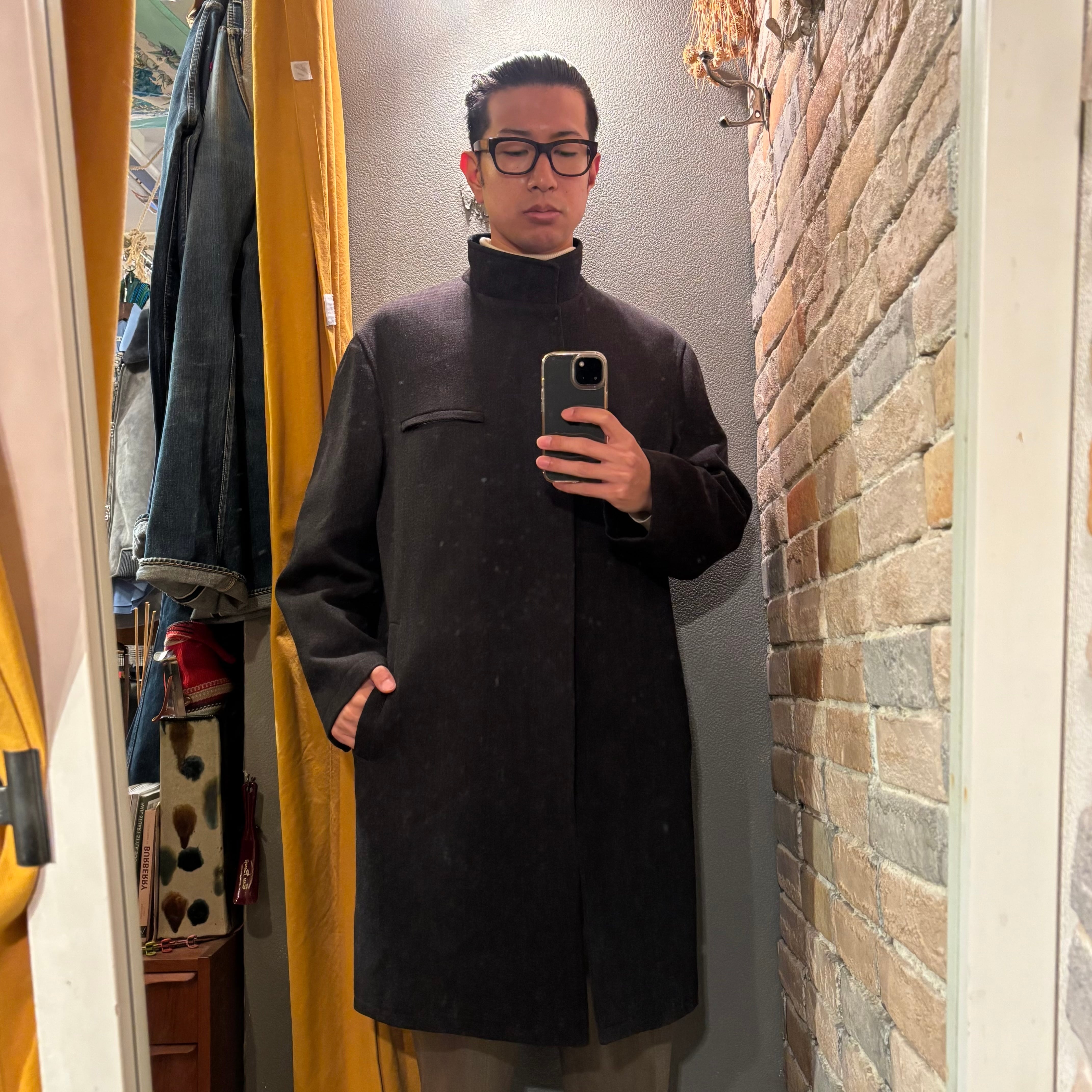 落ち着いたチャコールグレーに襟のネイビーコーデュロイ、ダブルジップ仕様が着方を楽しめる、イタリア製ウールナイロンコート。
