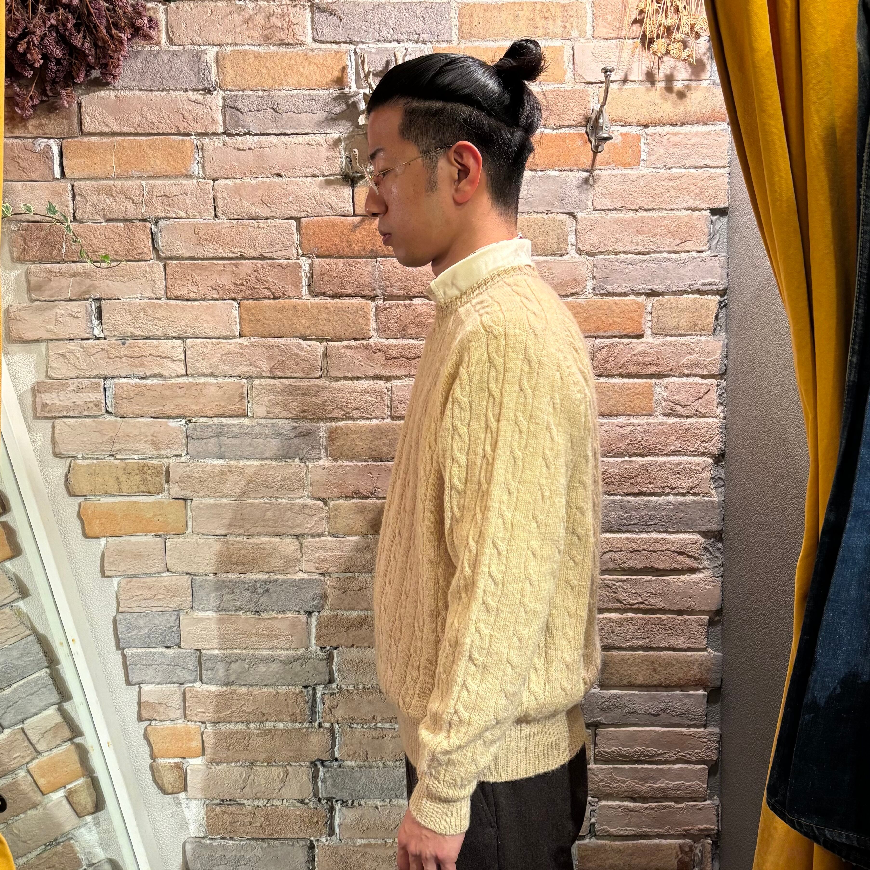 フワッとした柔らかなアルパカ×ウール生地に中間的な色合い、肩のラインが綺麗なサドルショルダースリーブのケーブルクルーネックニット。