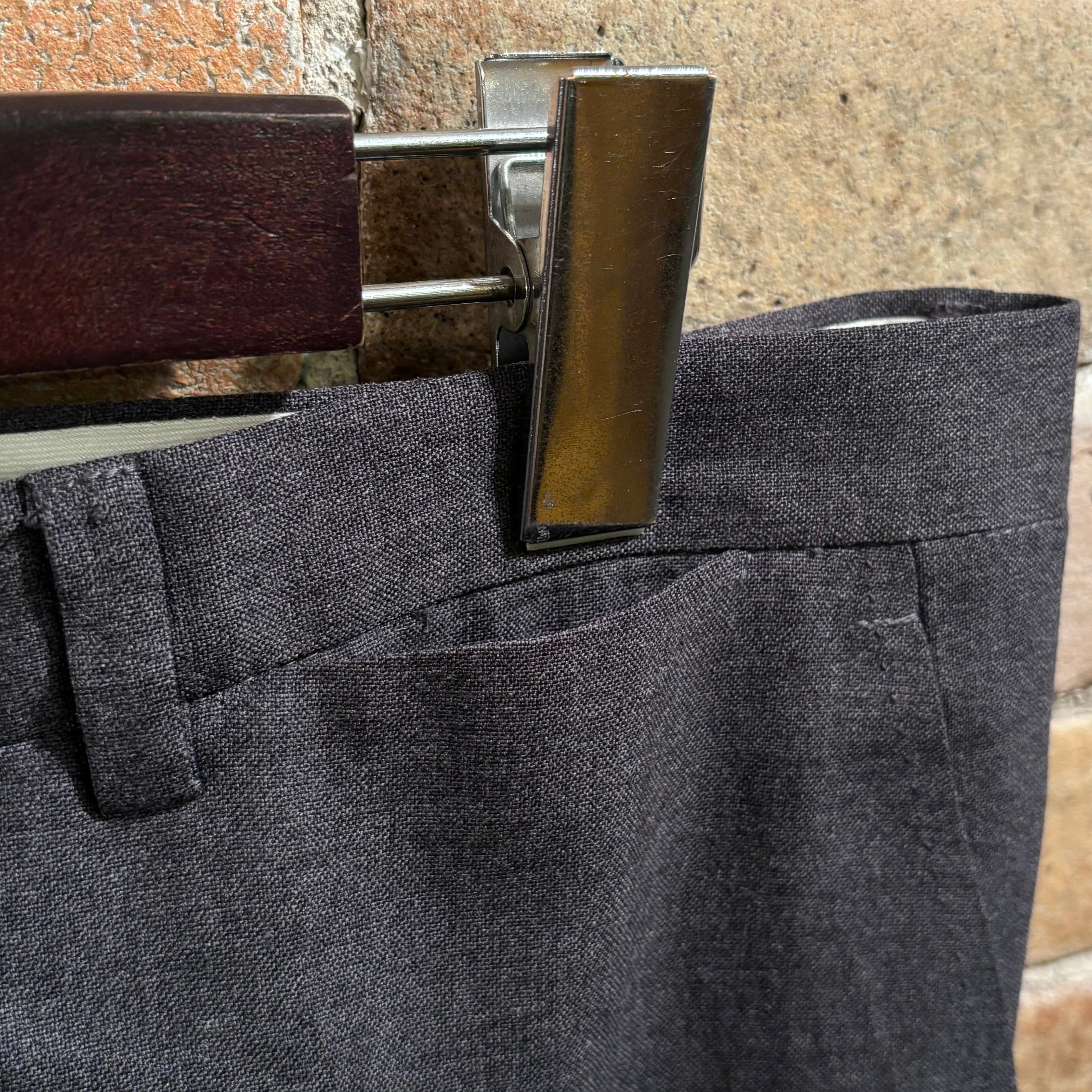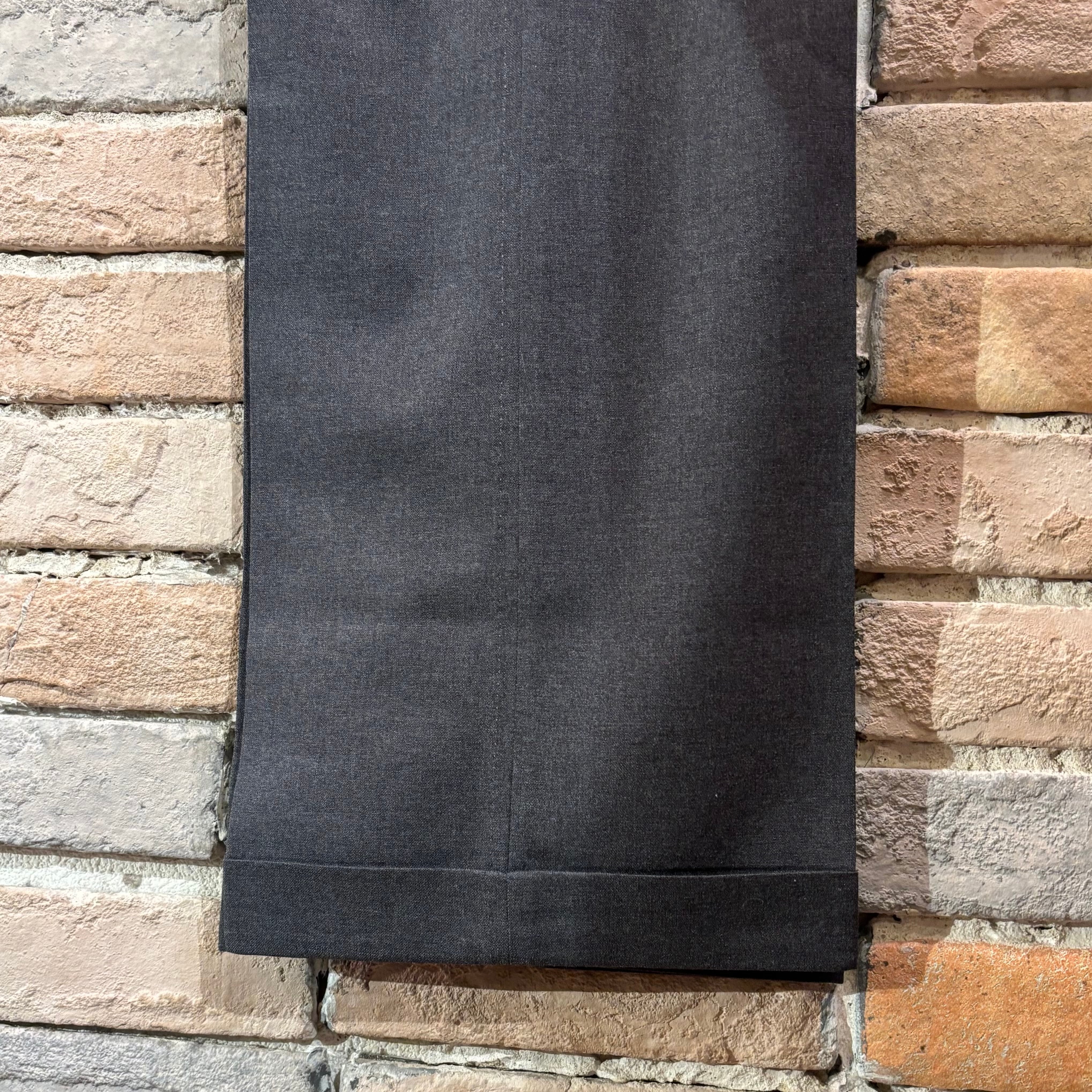 幅広いコーディネートに使用出来るのグレーのウール生地にワタリから裾に掛けてのクラシックなシルエットが特徴的なデッドストックのノープリーツトラウザーズ。