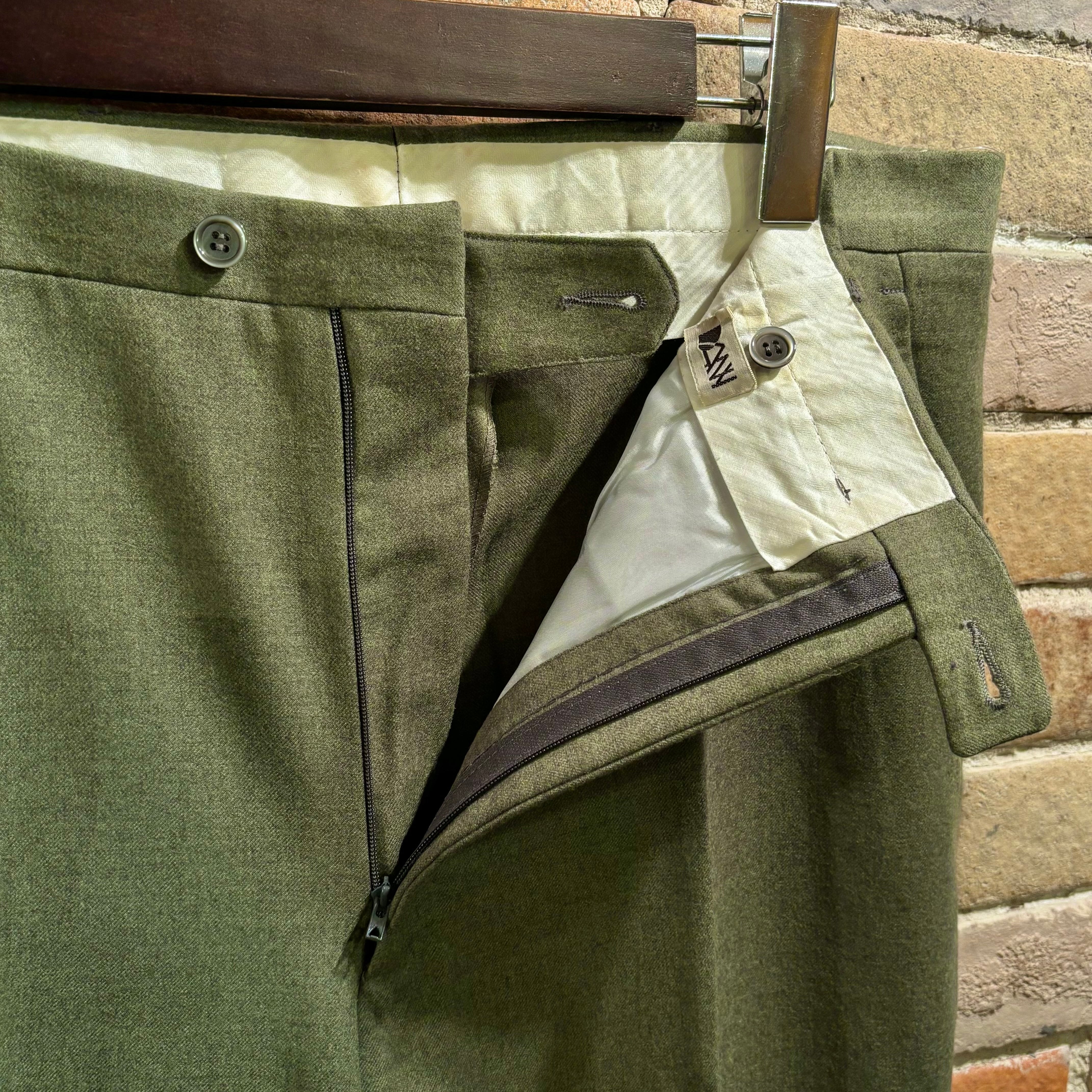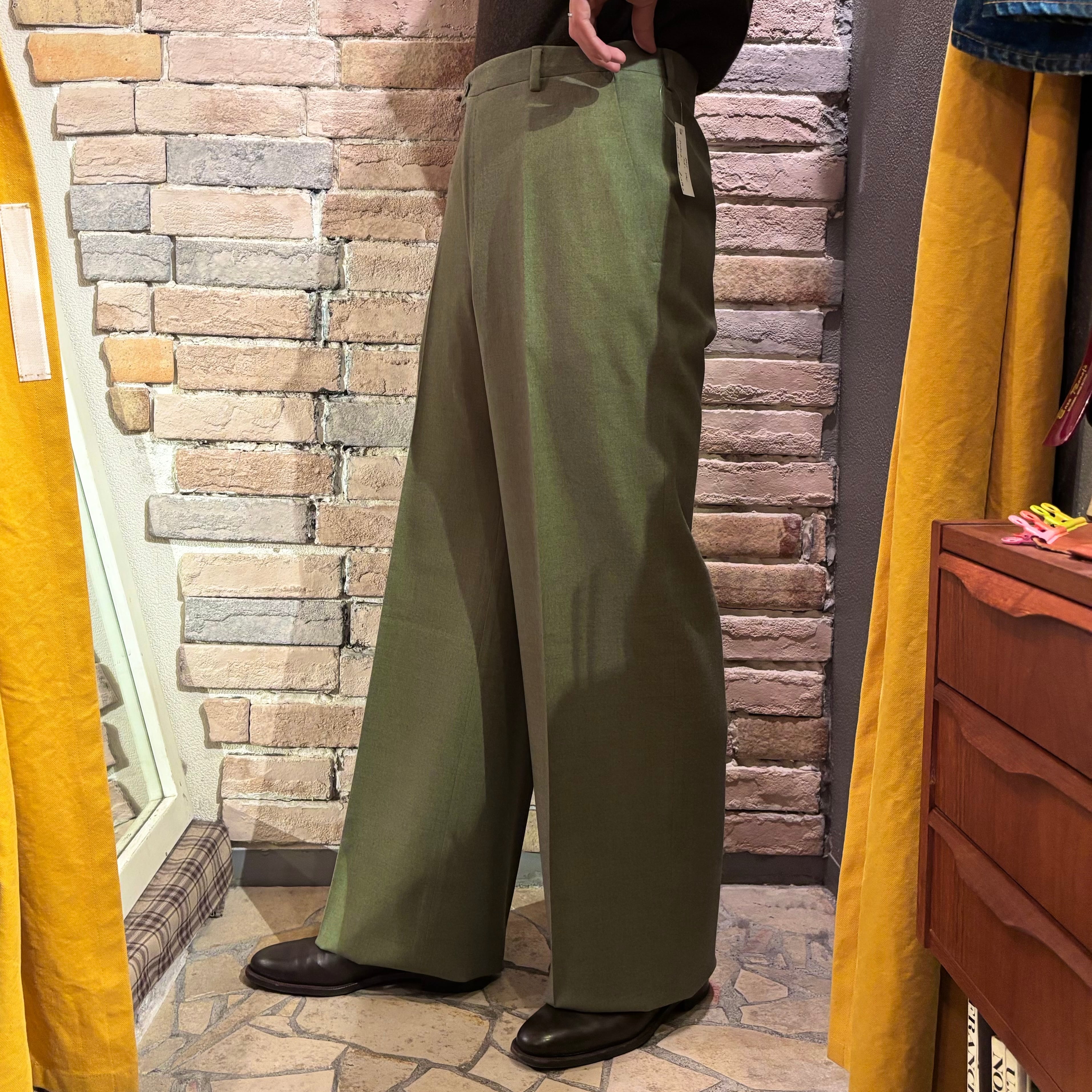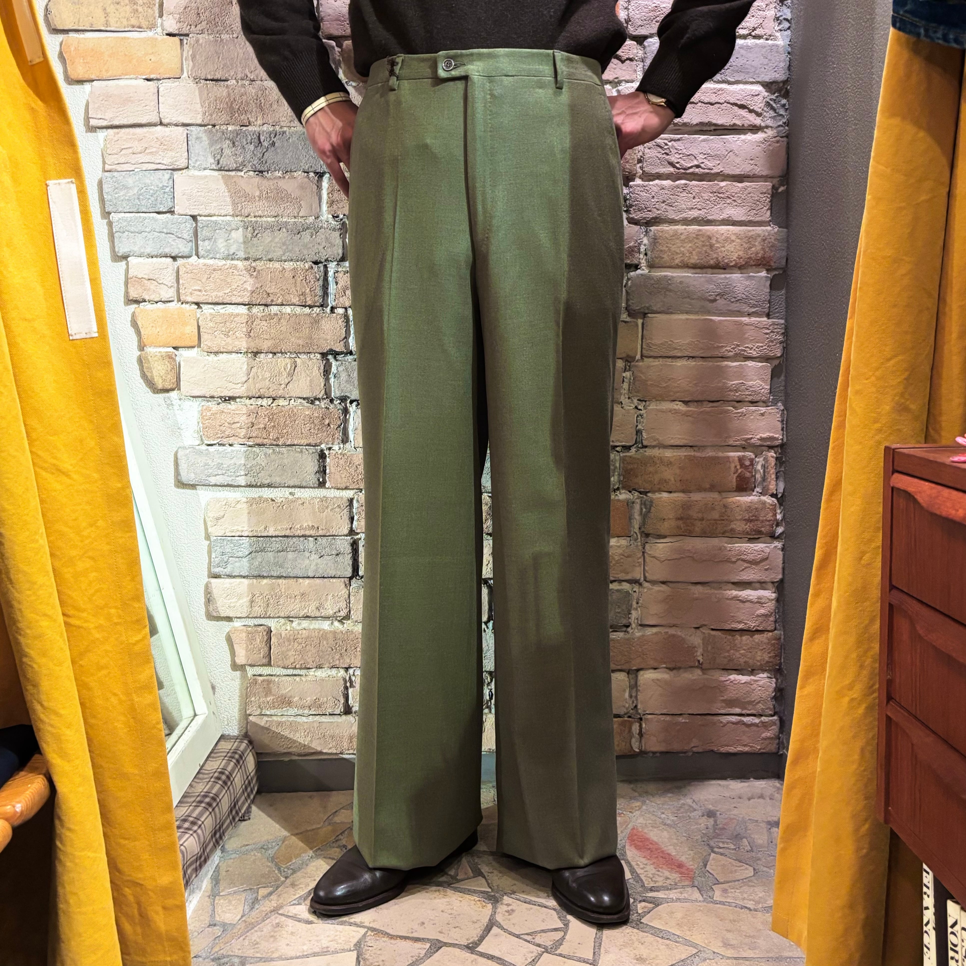 コーディネートのポイントになるヨモギ色の様な綺麗な色合いのウール生地にワタリから裾に掛けてのクラシックなシルエットが特徴的なデッドストックのノープリーツトラウザーズ。