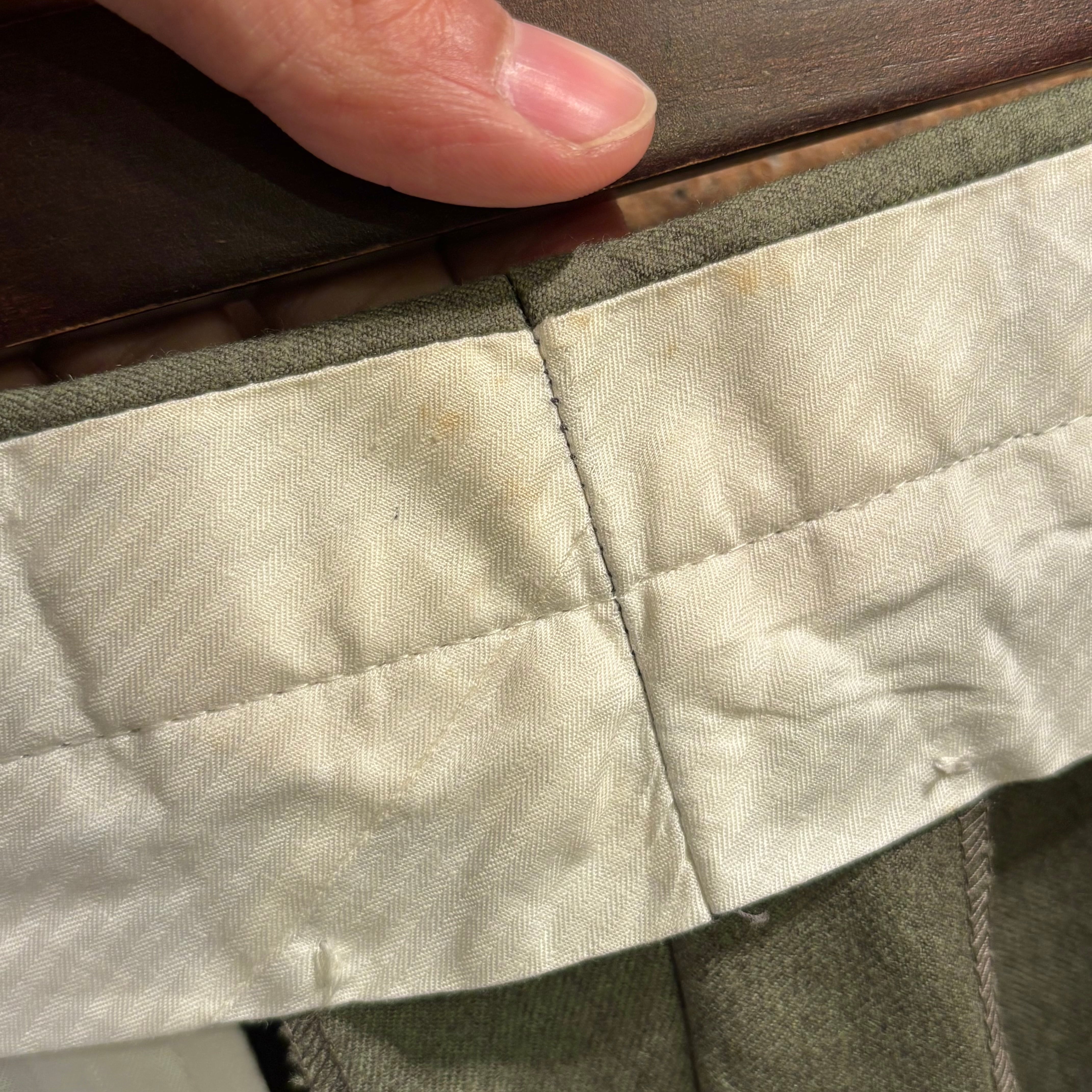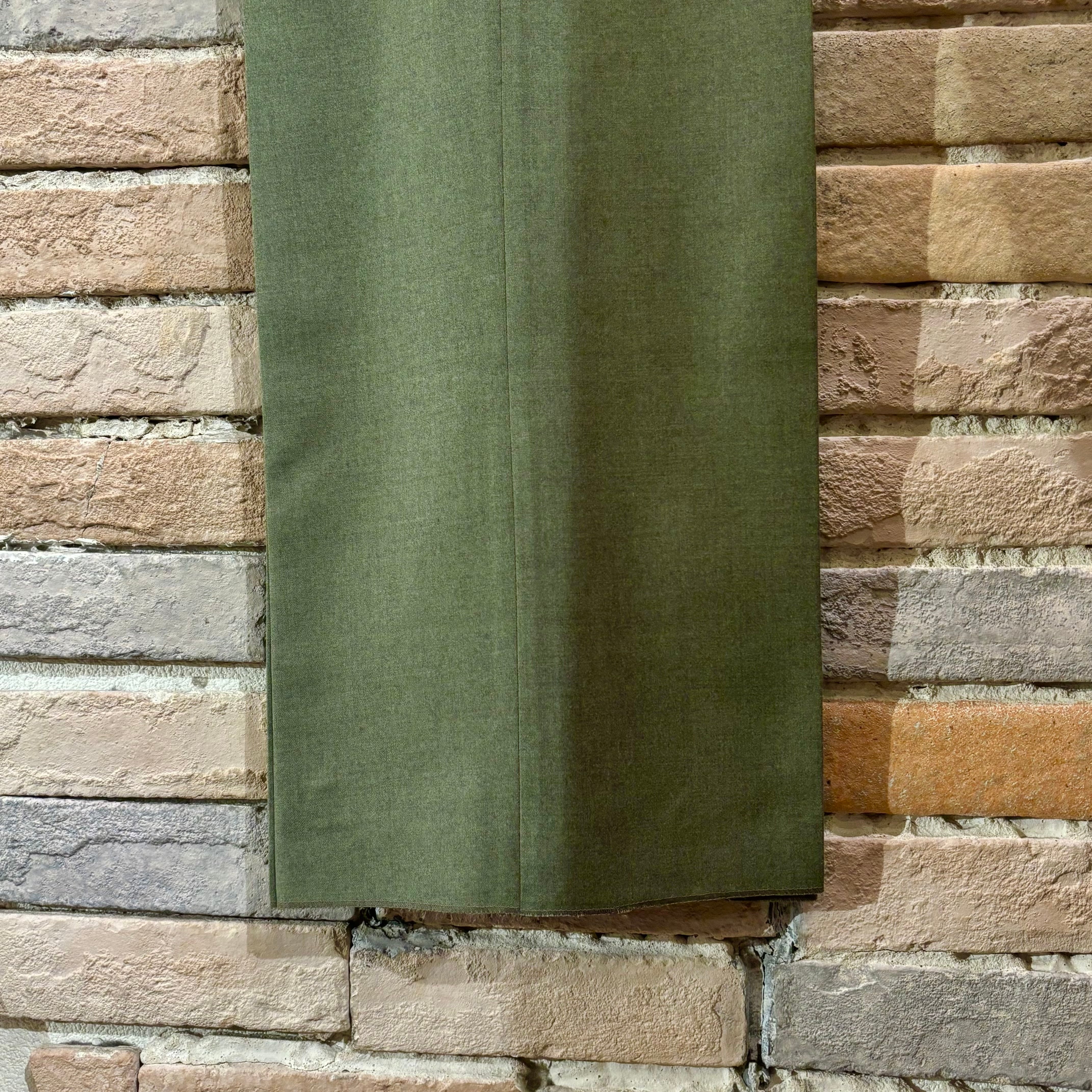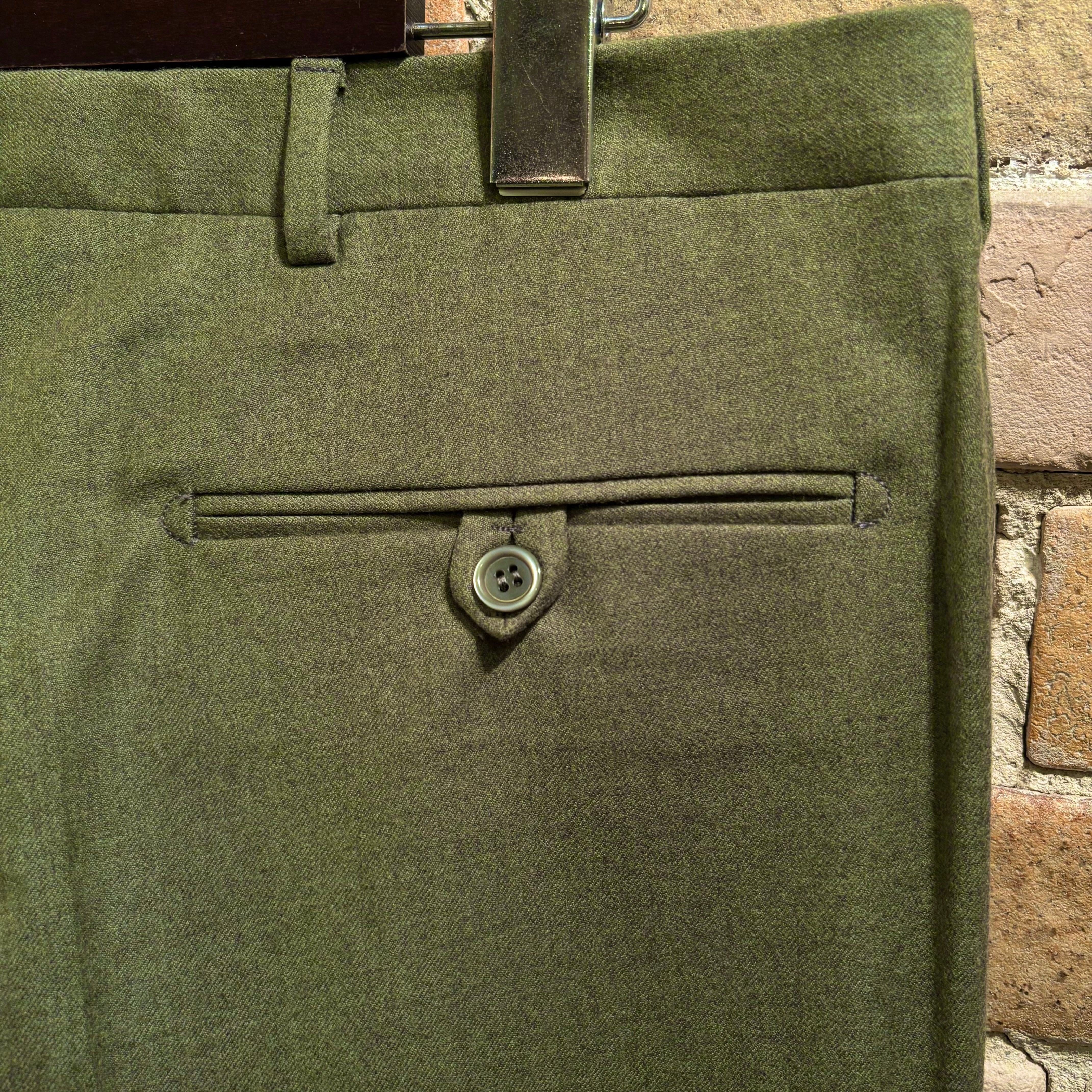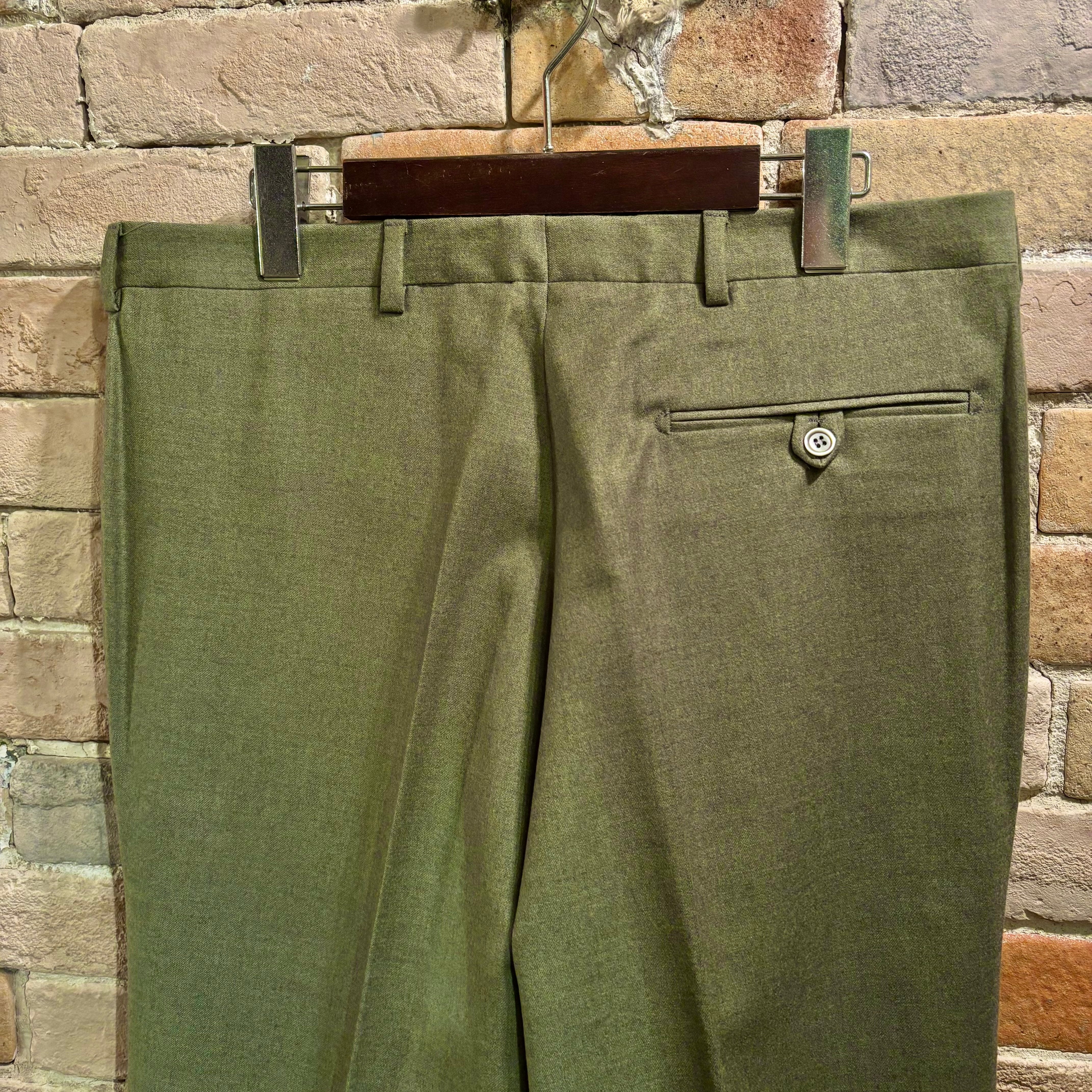 コーディネートのポイントになるヨモギ色の様な綺麗な色合いのウール生地にワタリから裾に掛けてのクラシックなシルエットが特徴的なデッドストックのノープリーツトラウザーズ。