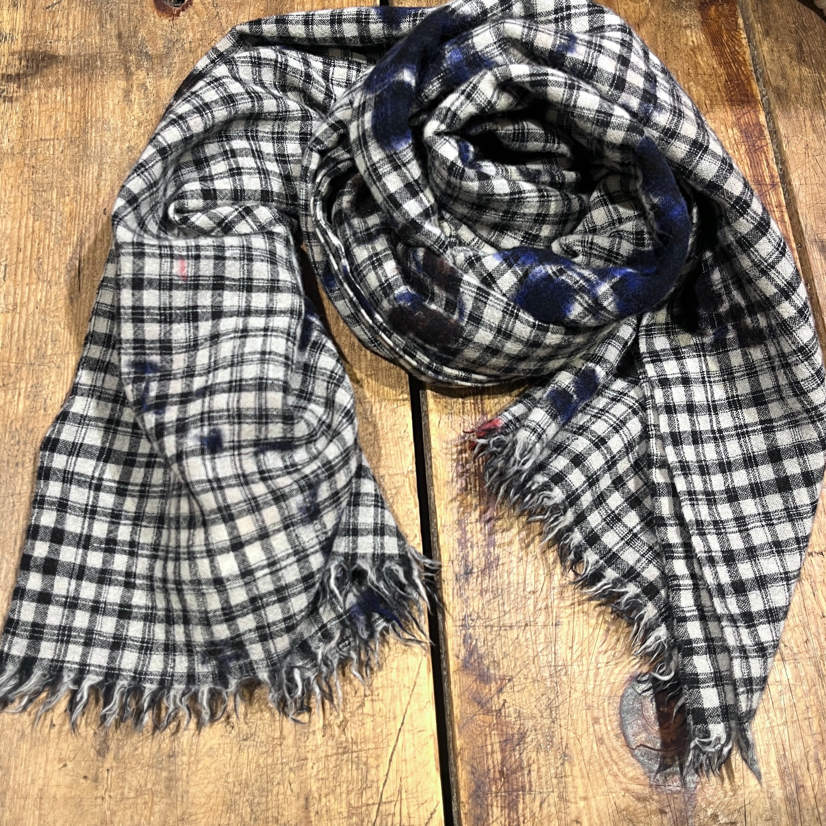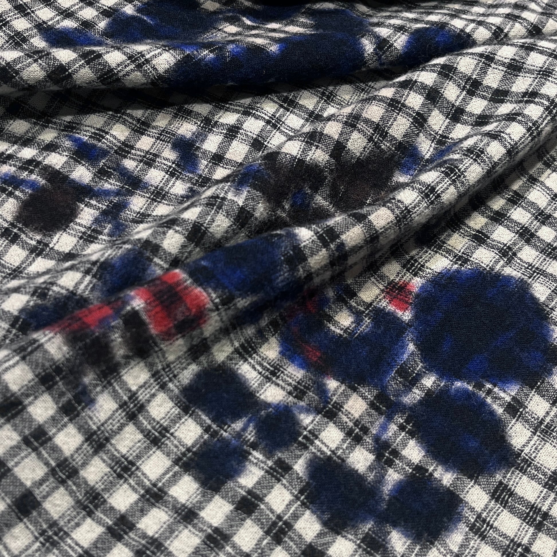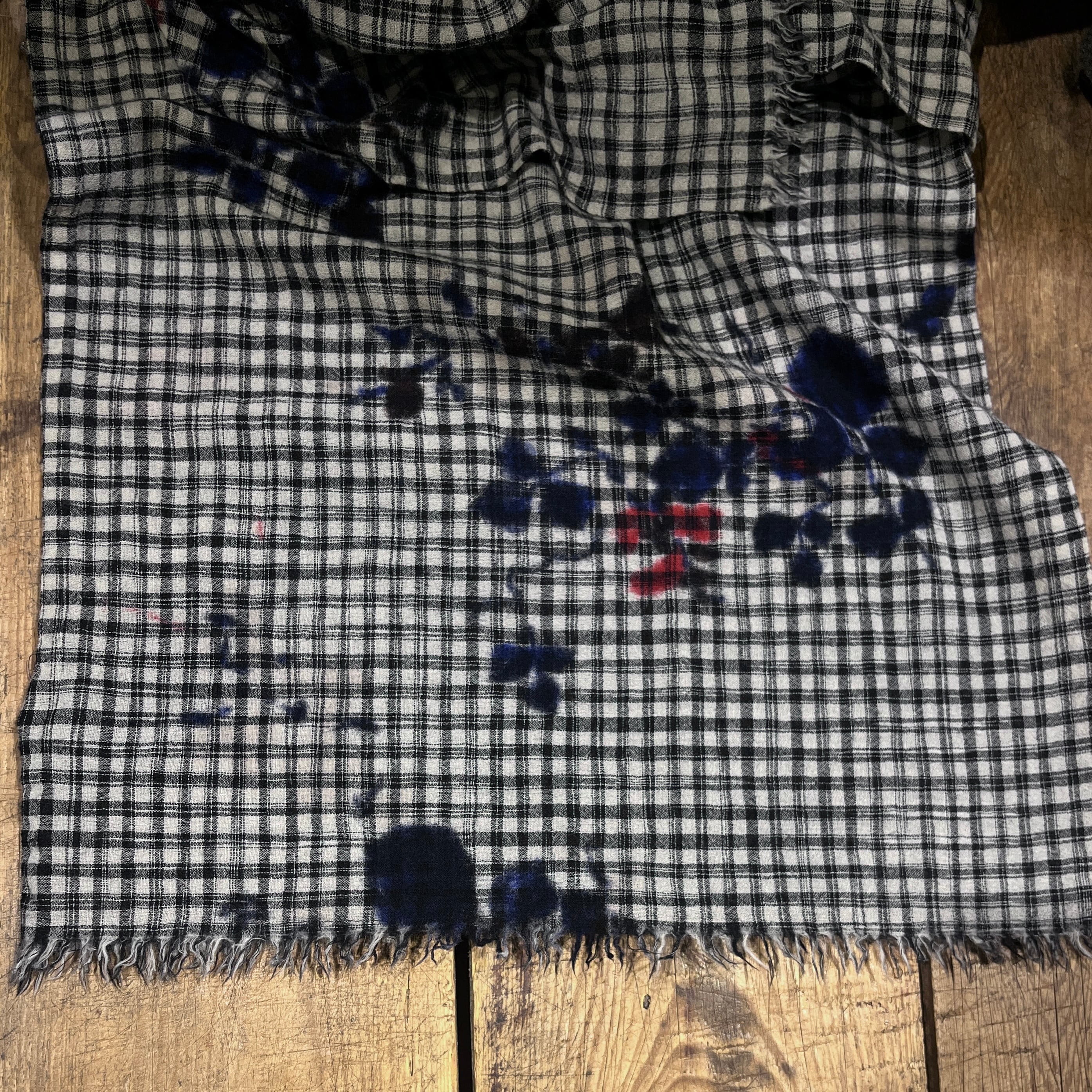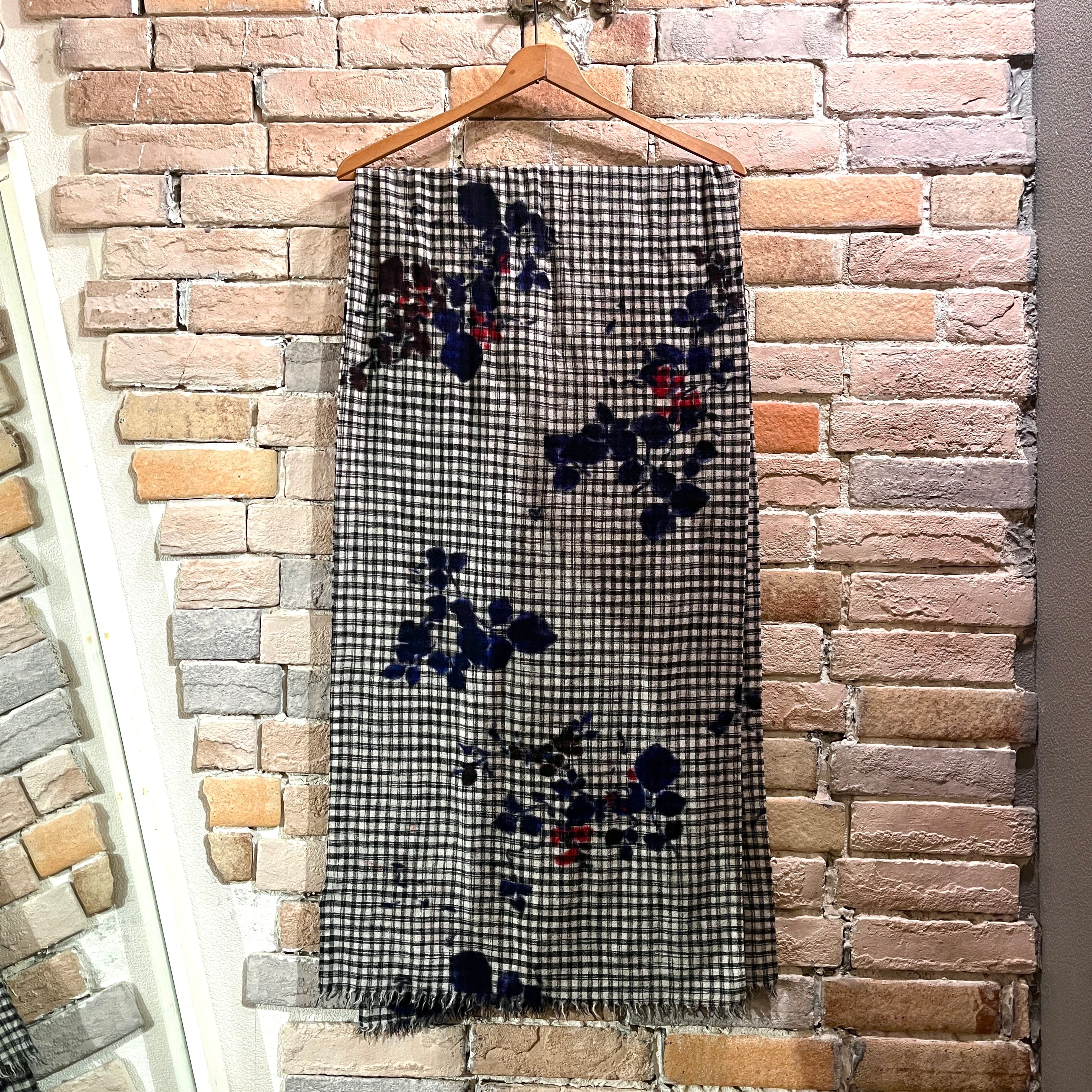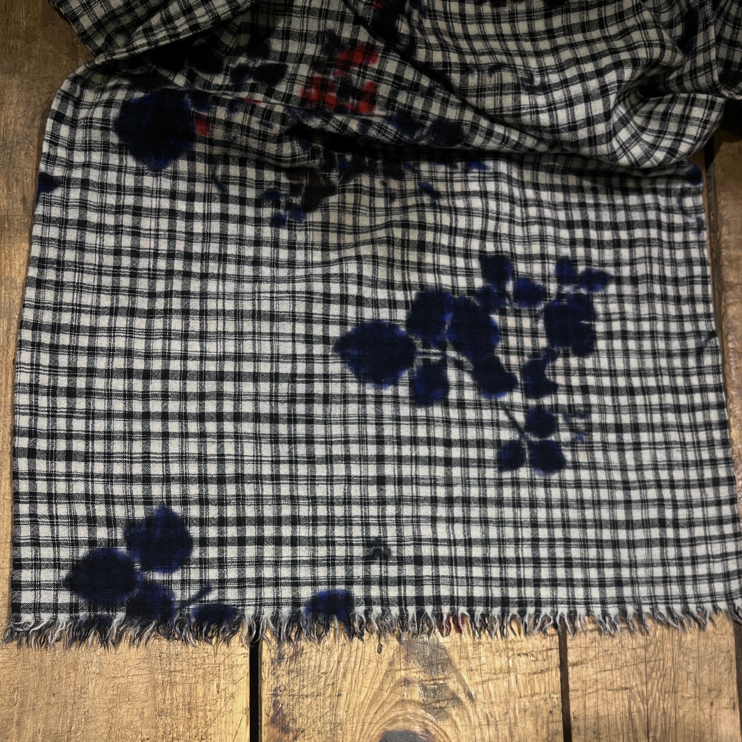モノトーンのチェックをベースにランダムに散りばめられた滲みが草花のモチーフになったデザイン。