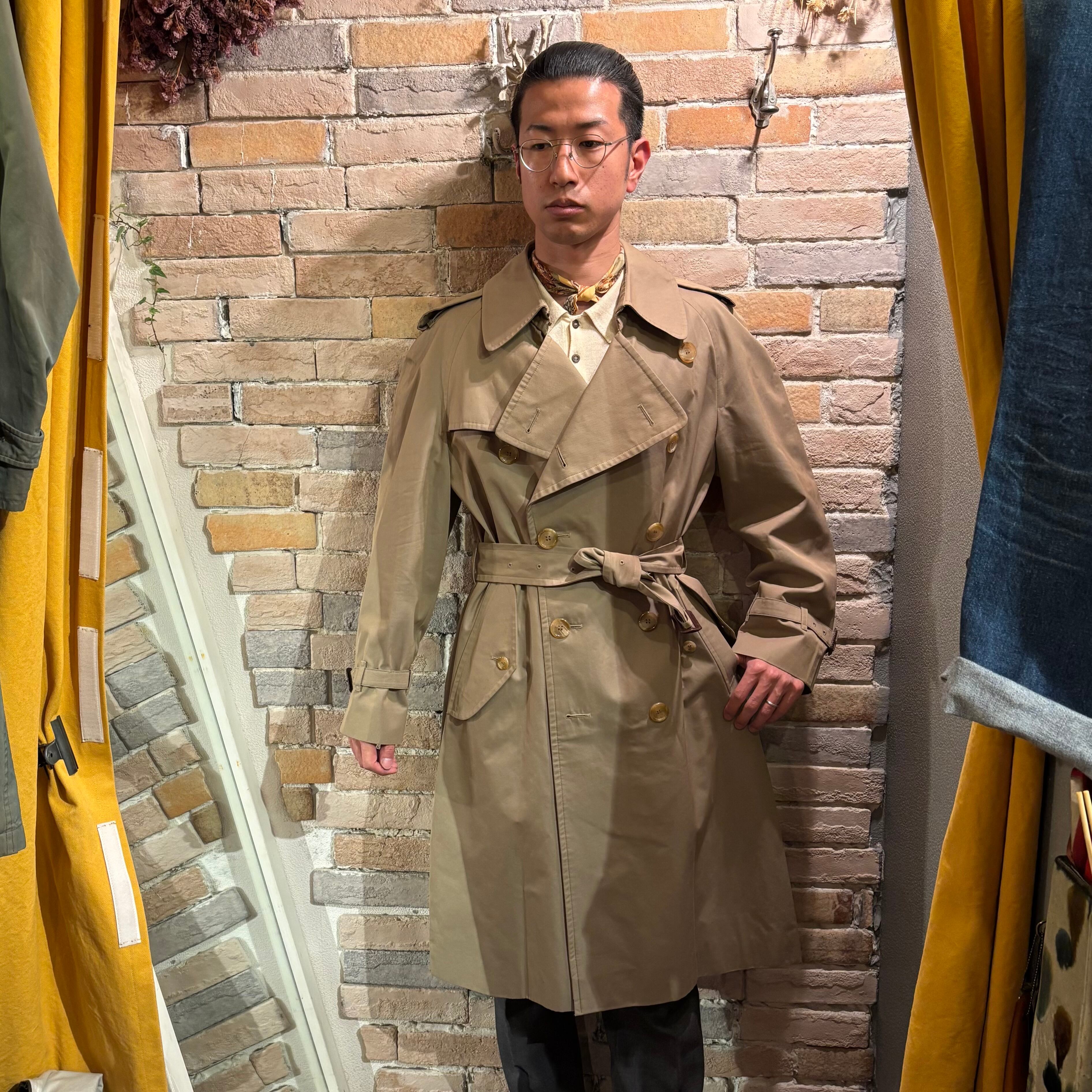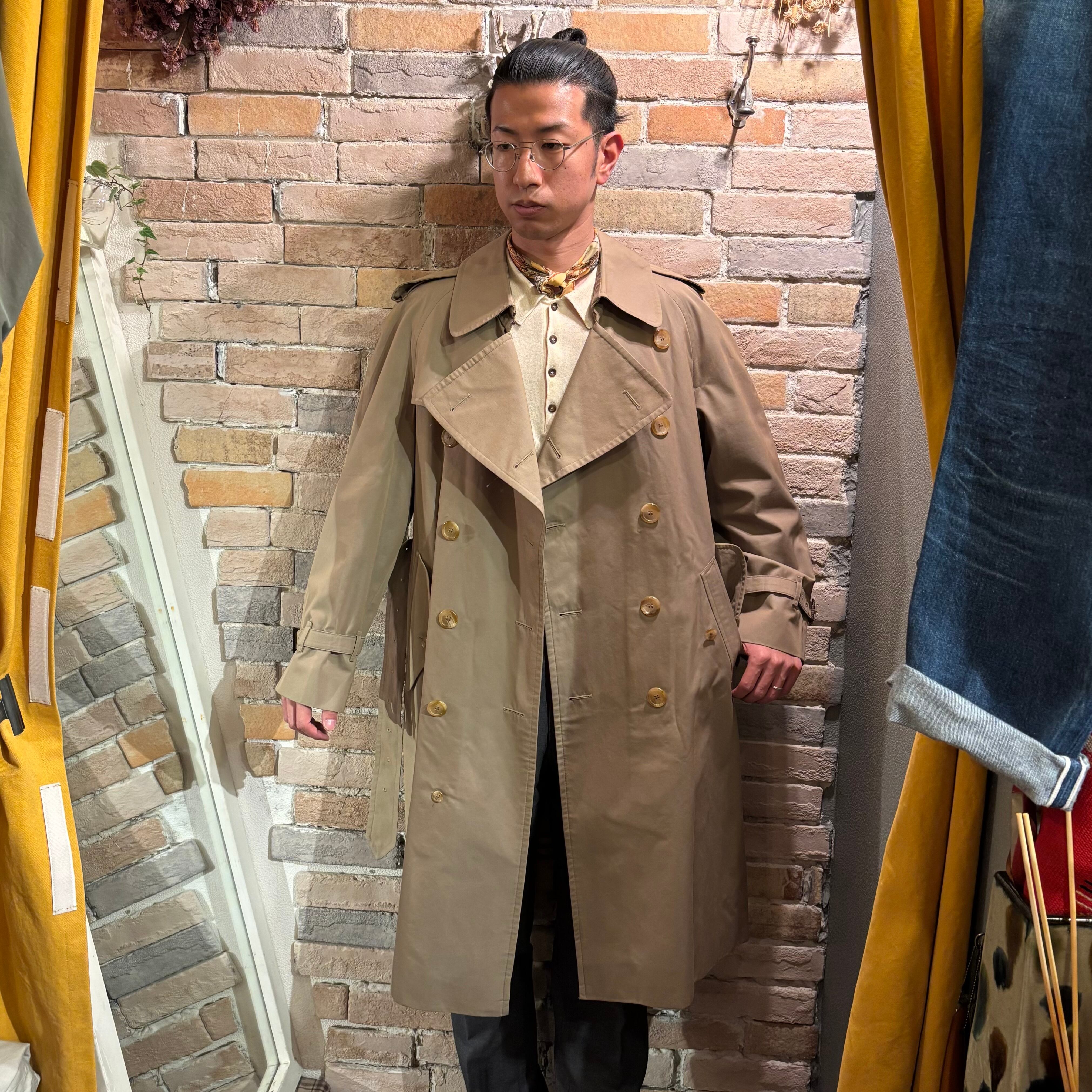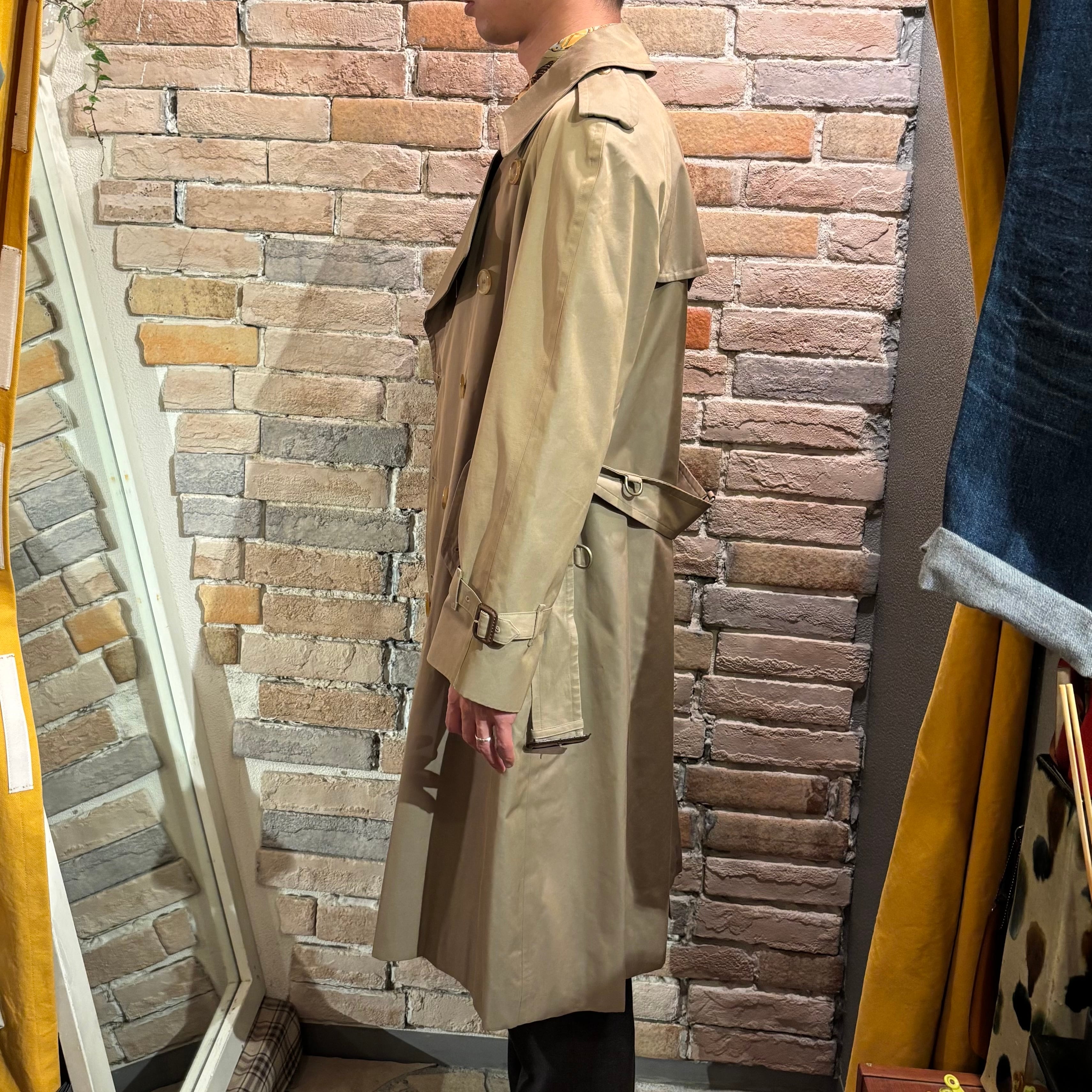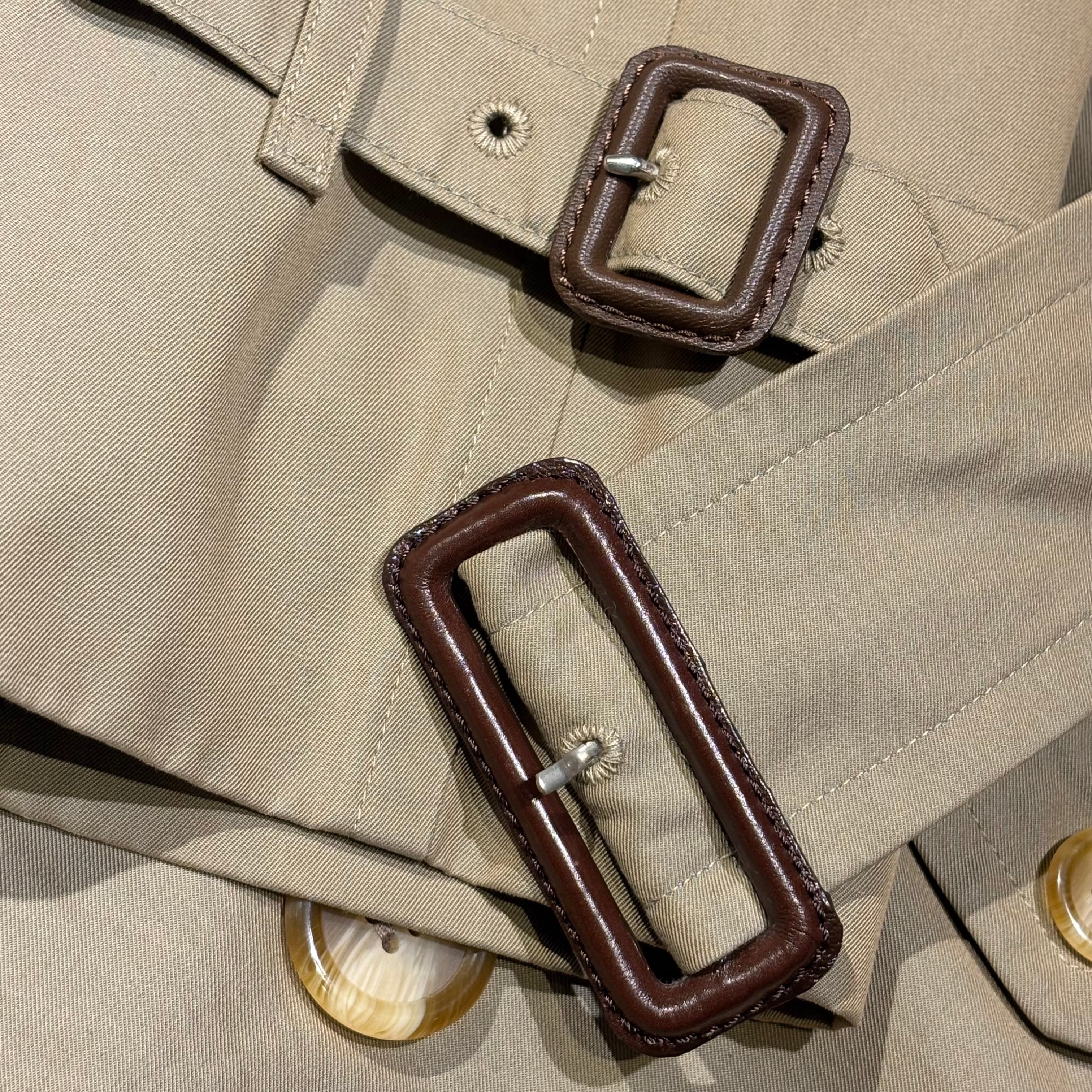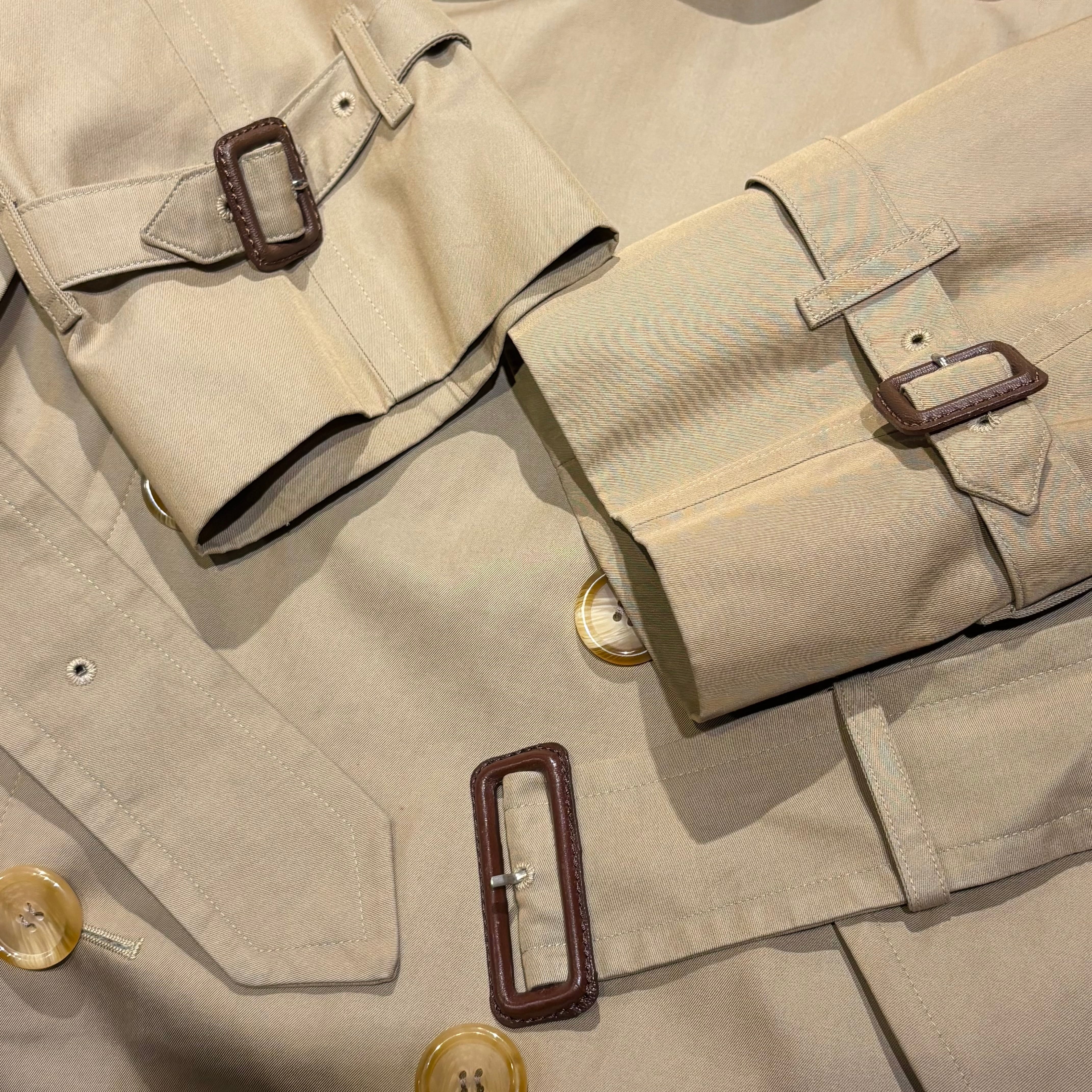 光沢感のあるコットン100%の玉虫色に程よいゆとりが幅広いコーディネートに使用出来るイングランド製トレンチコート。