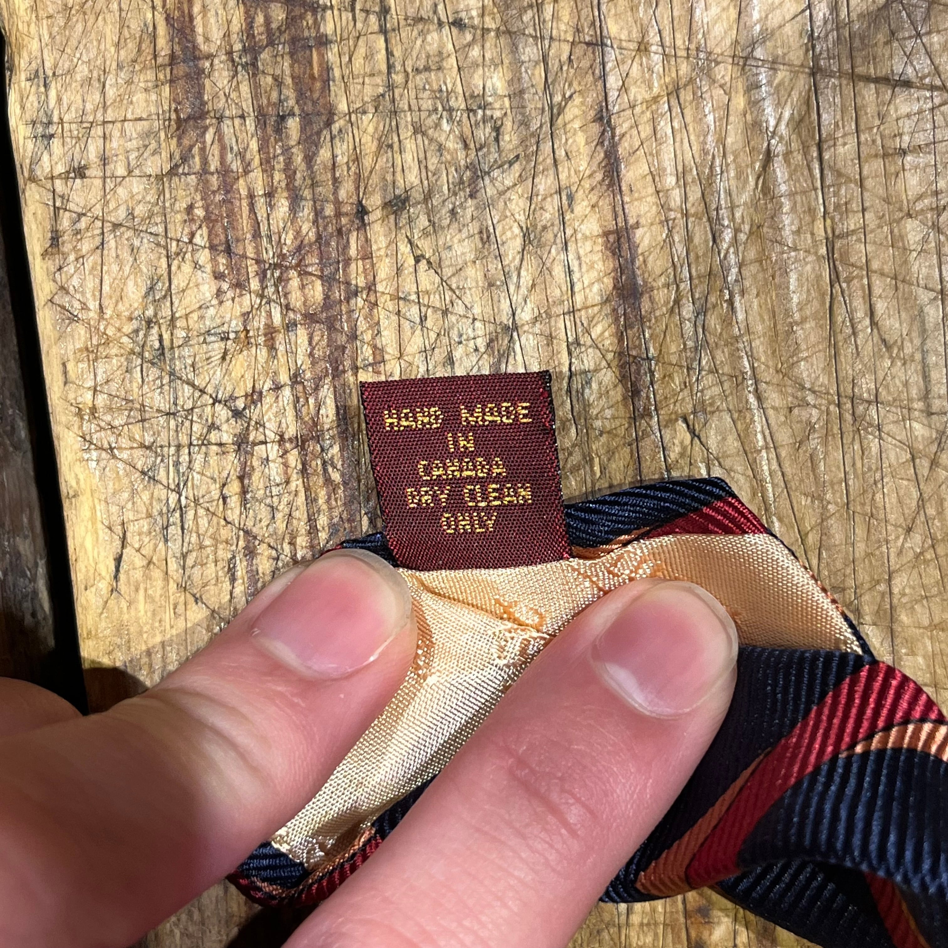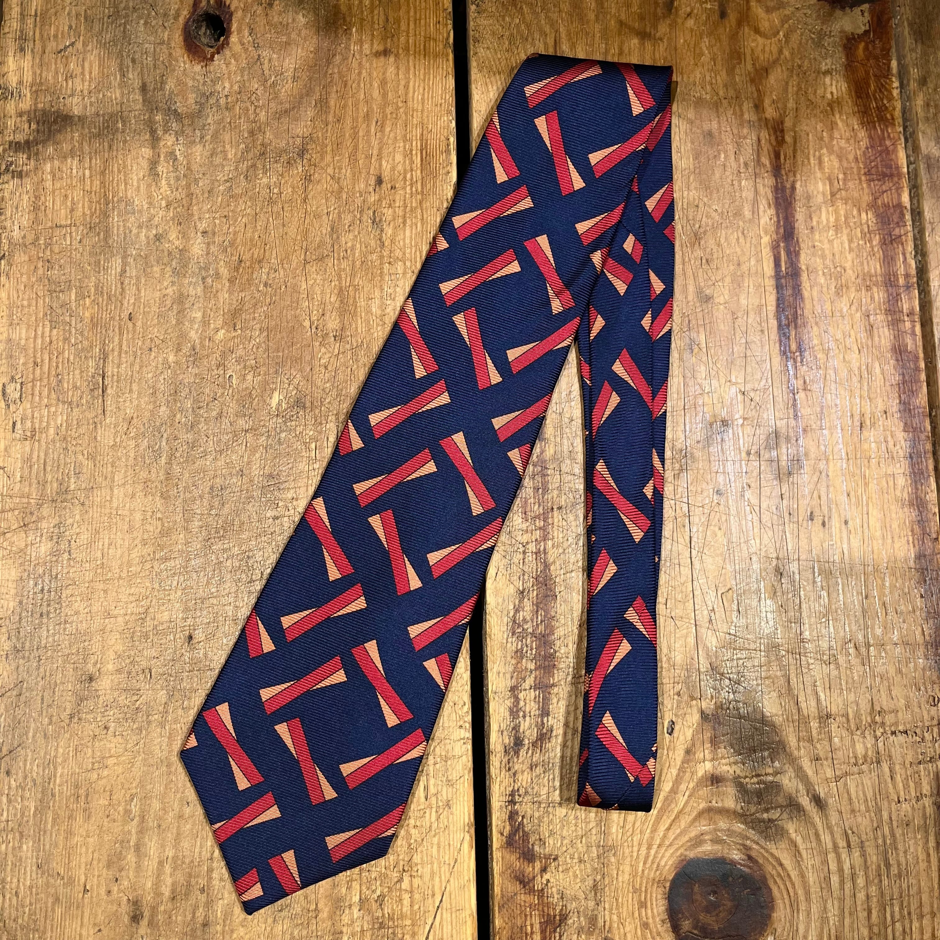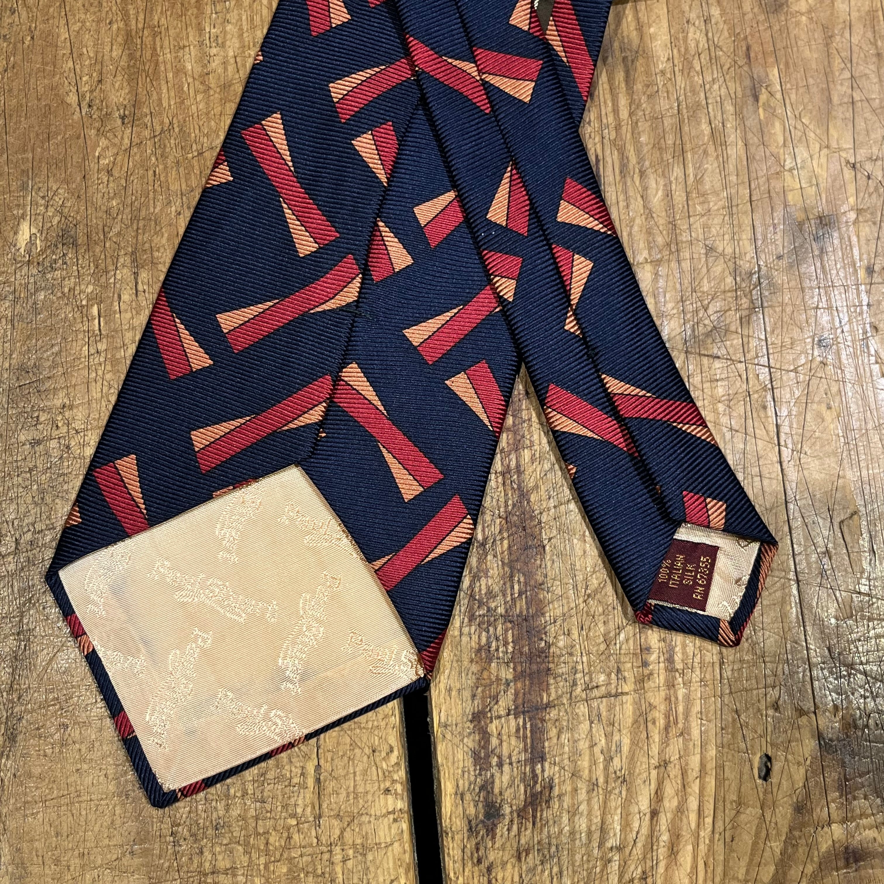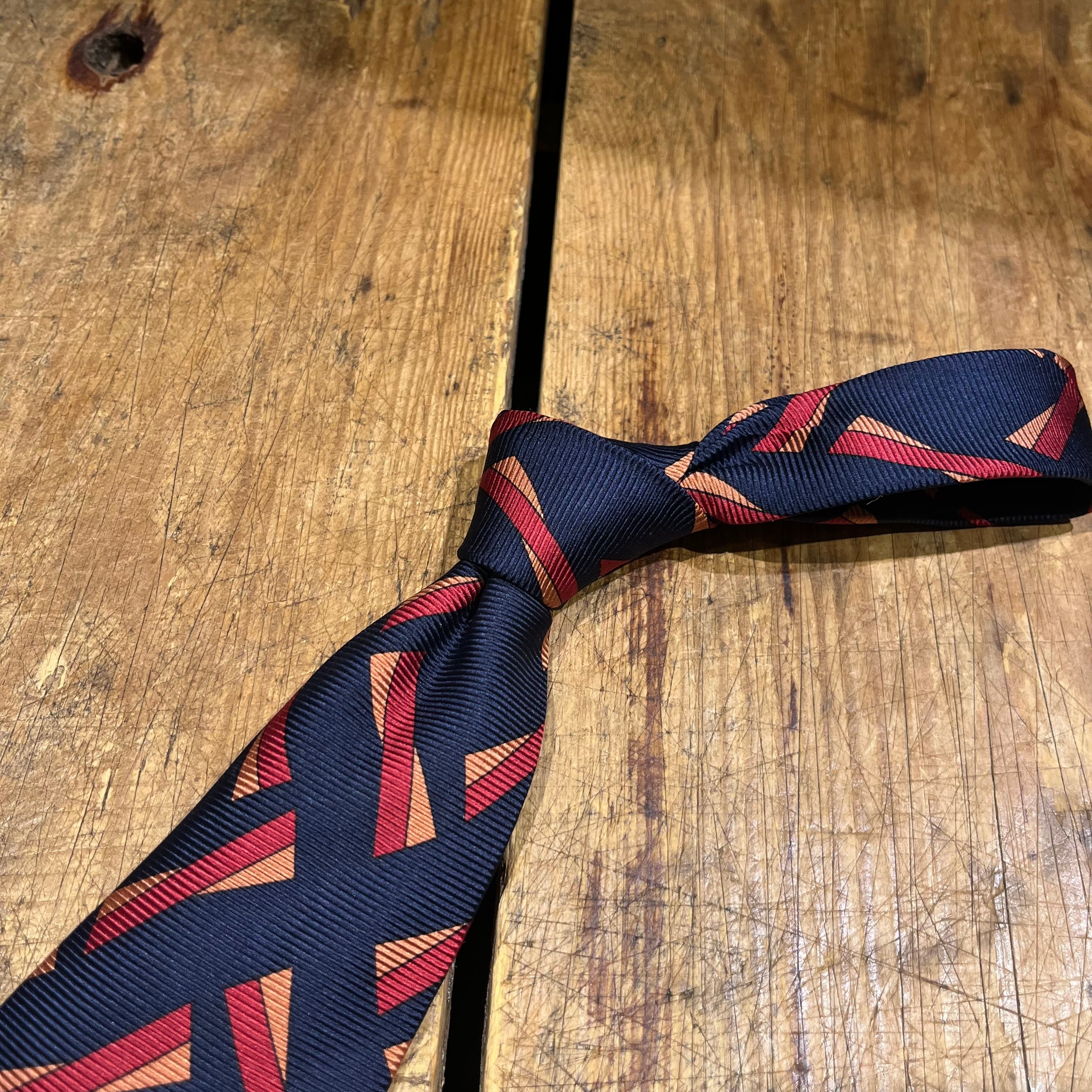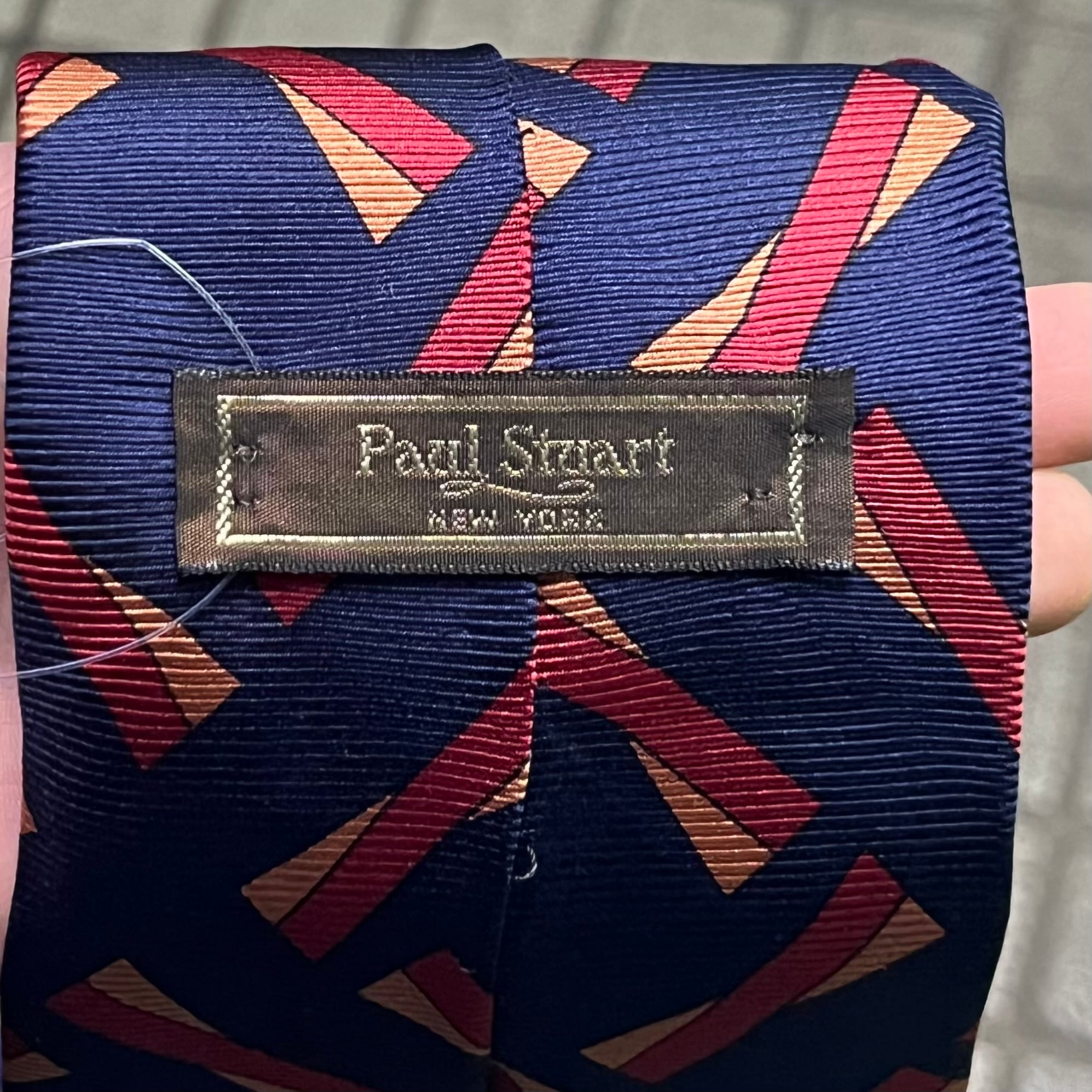 ネイビーベースにオレンジとレッドの柄、ポールスチュアートらしいシルク100%のネクタイです。