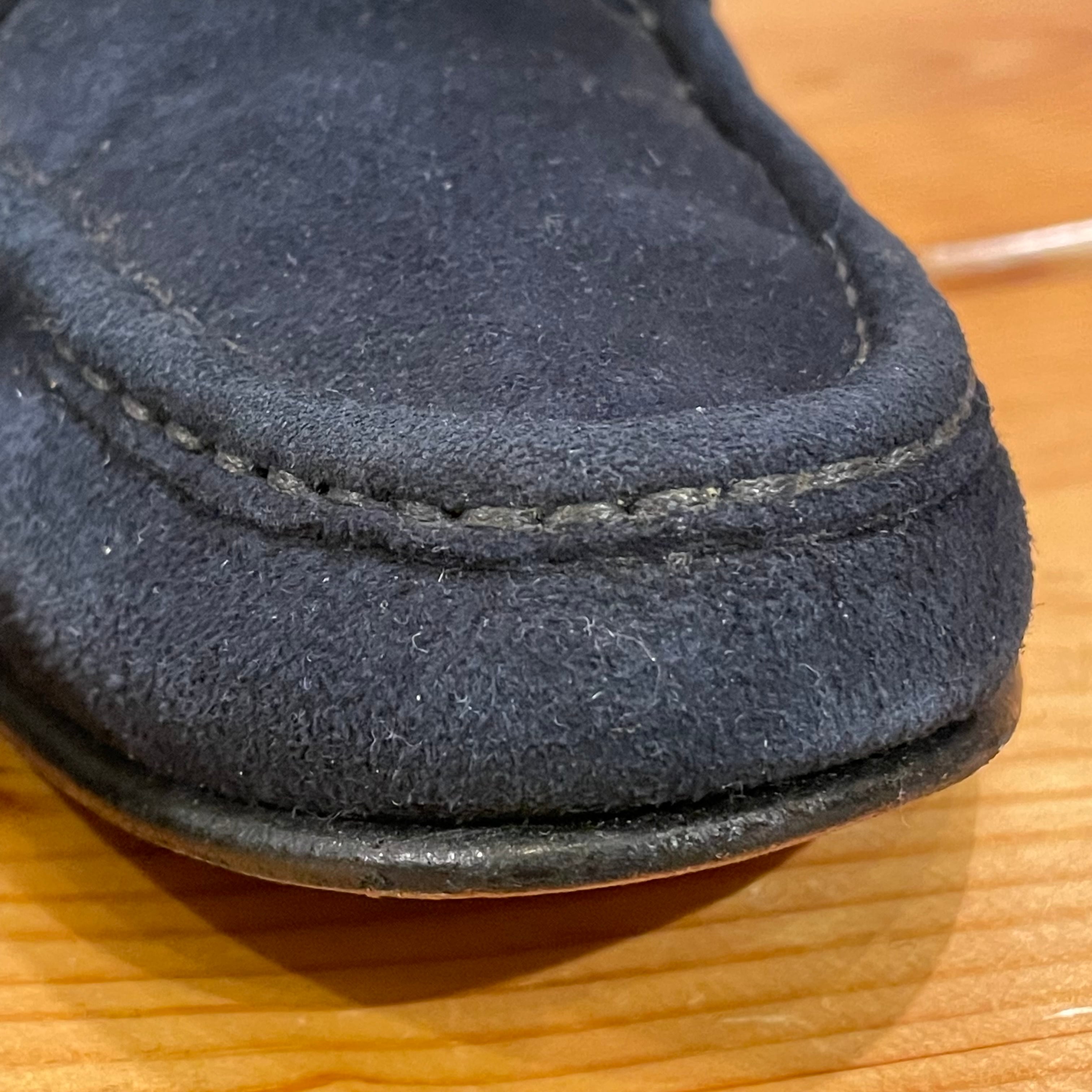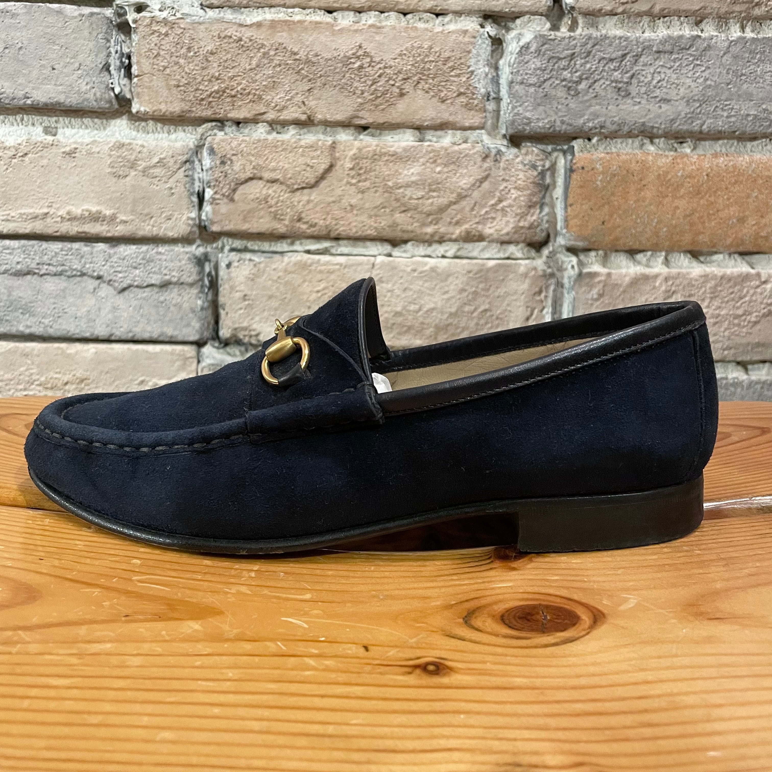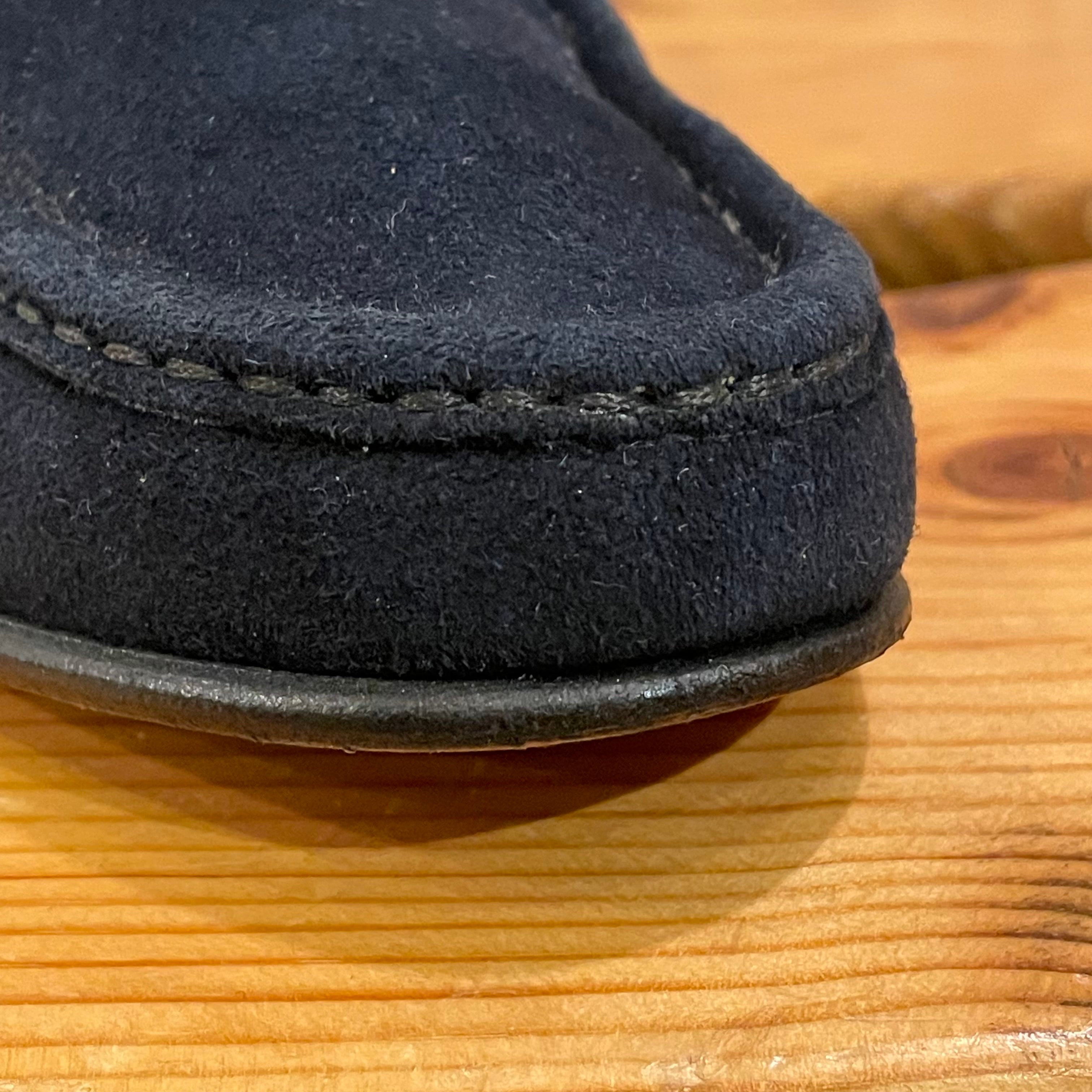 上品なネイビースエードにゴールドのビット、ソールはレザーソールでスッキリとしたシルエットです。