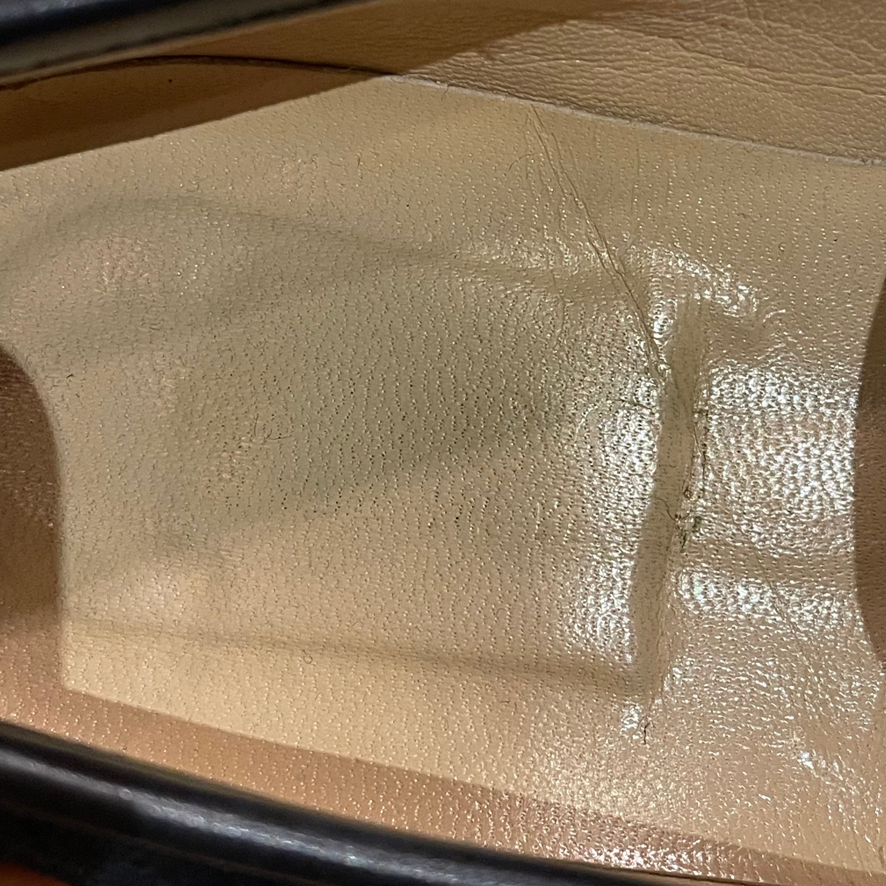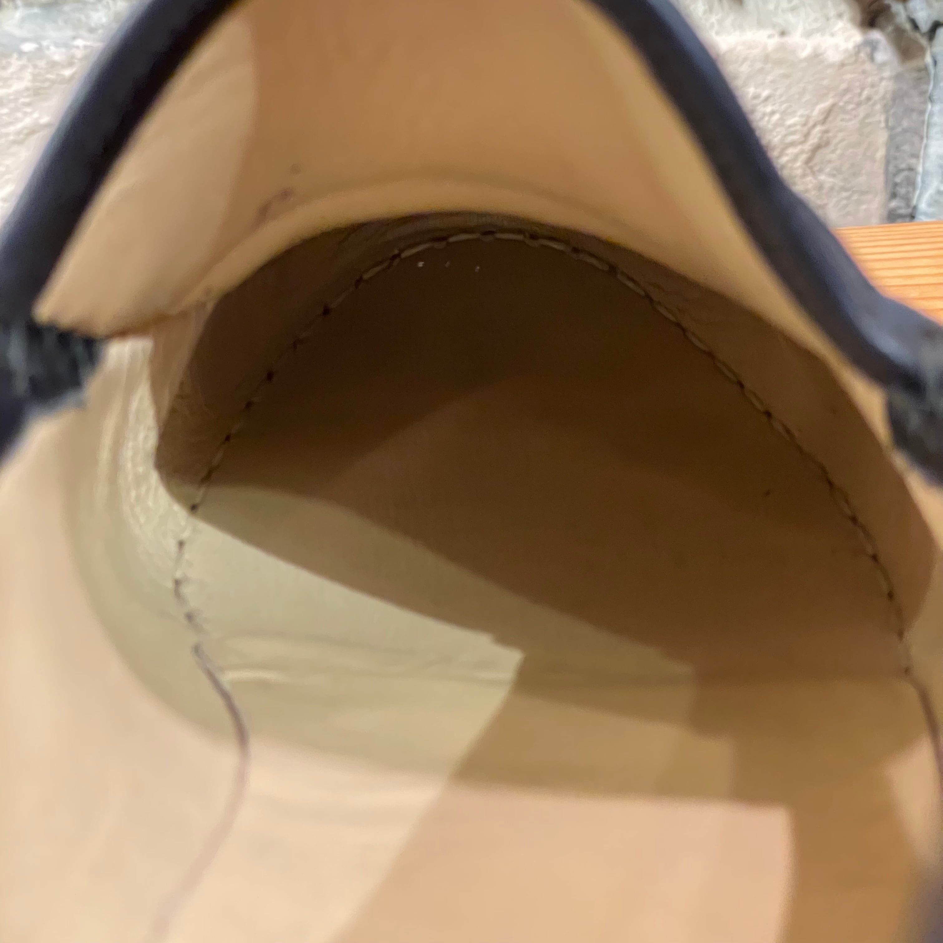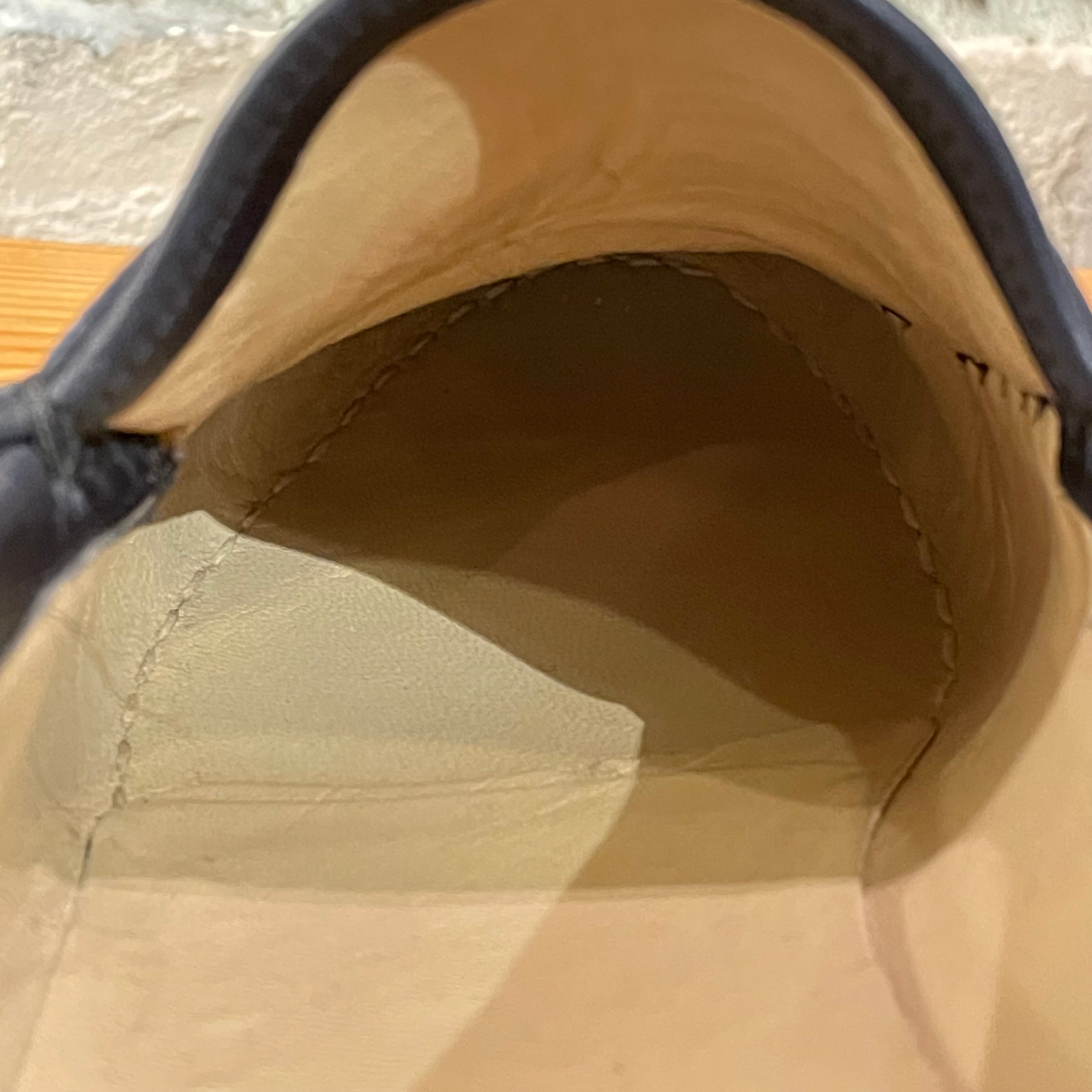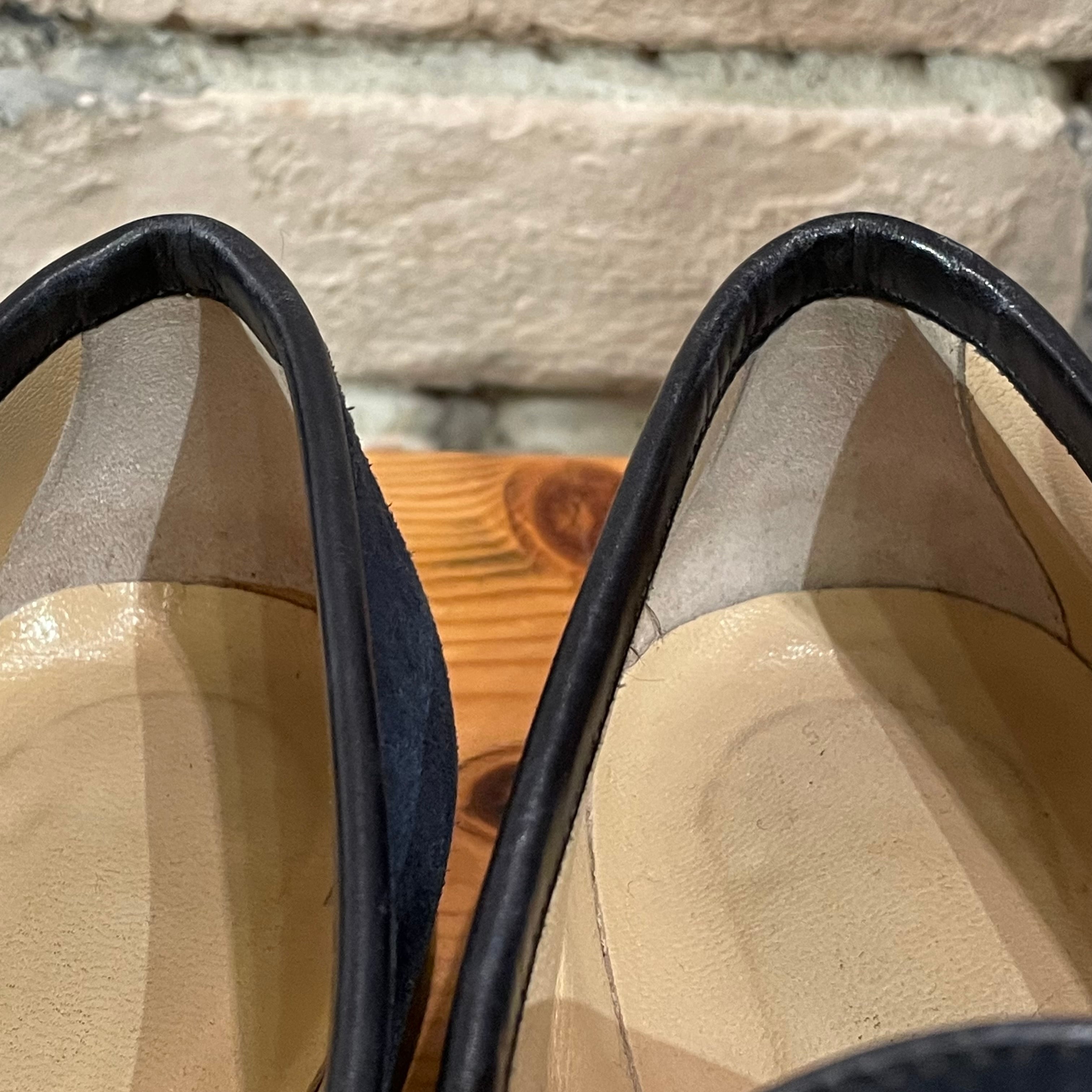 上品なネイビースエードにゴールドのビット、ソールはレザーソールでスッキリとしたシルエットです。