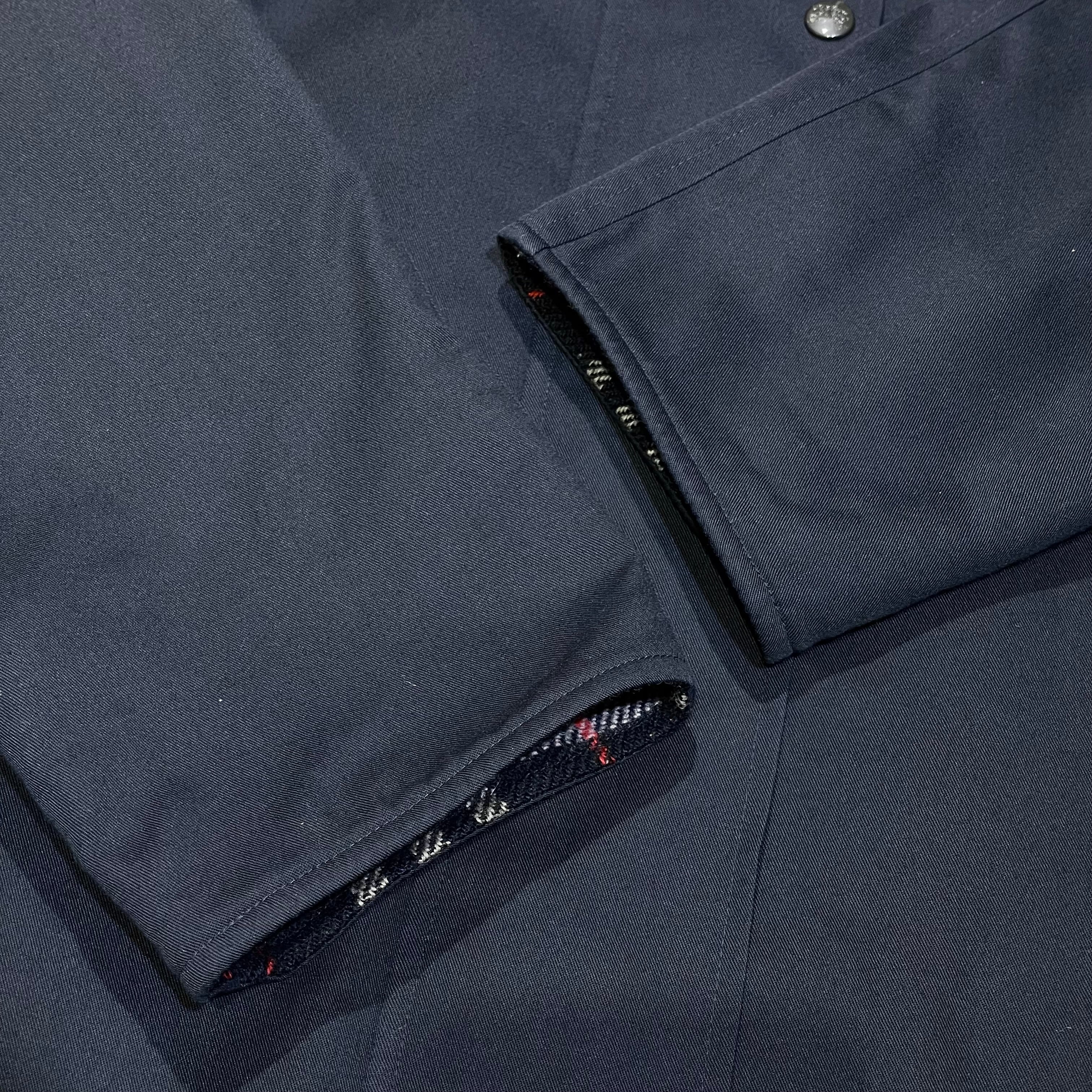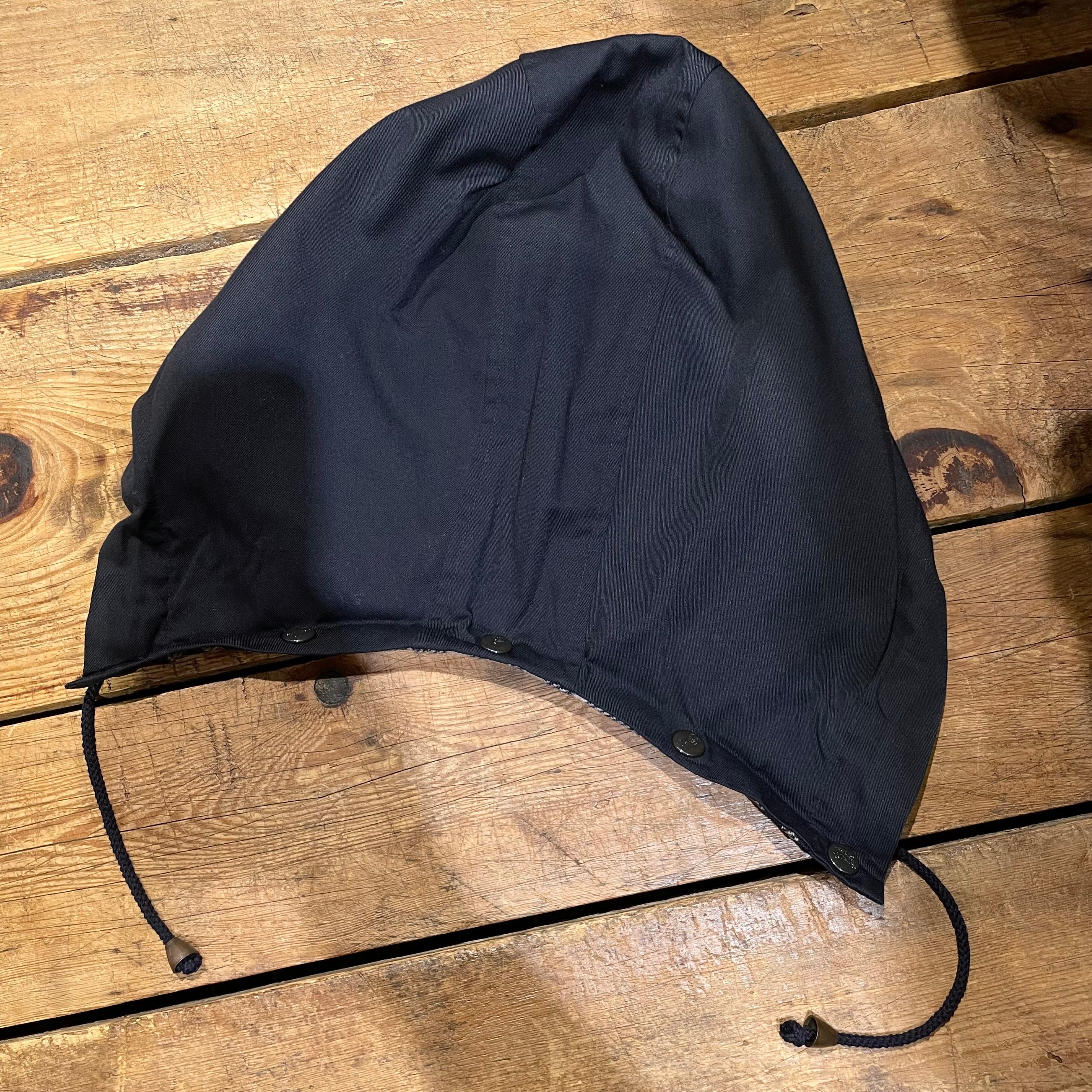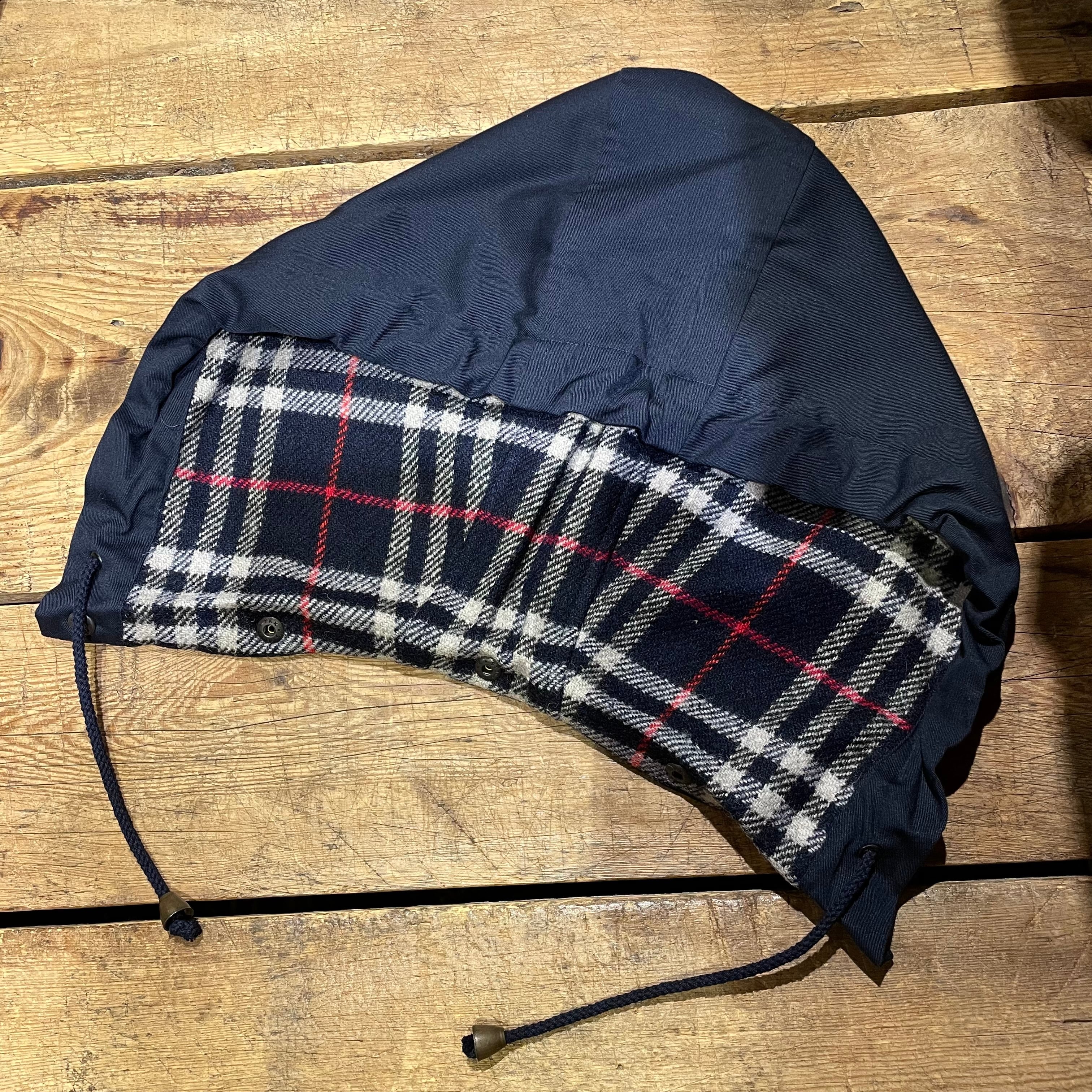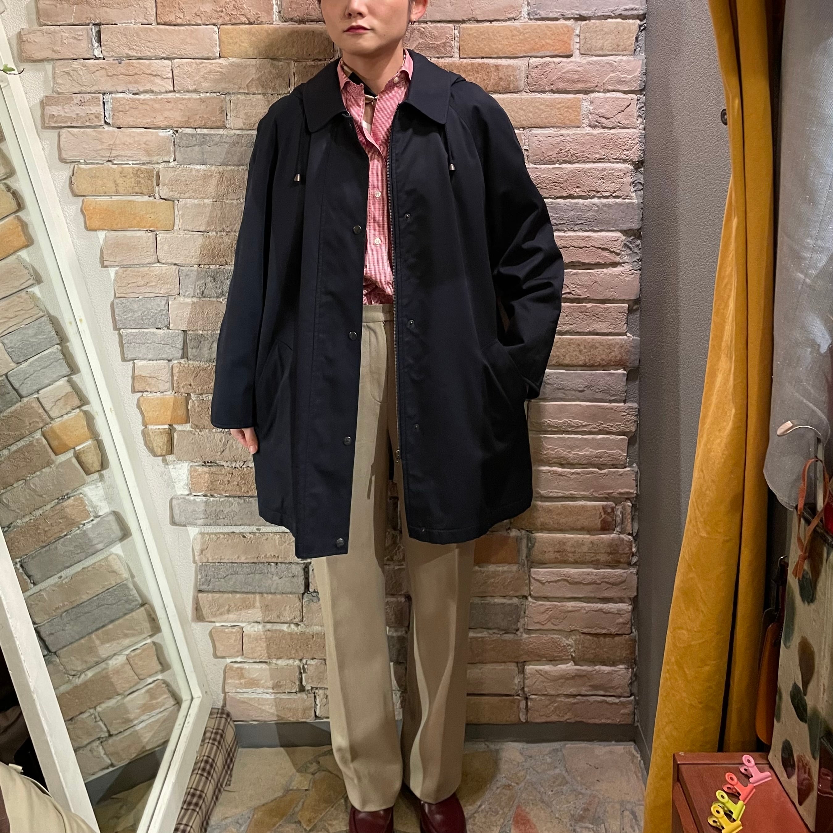 フードが取り外し可能な、裏地ウールのネイビーイングランド製ハーフコート。