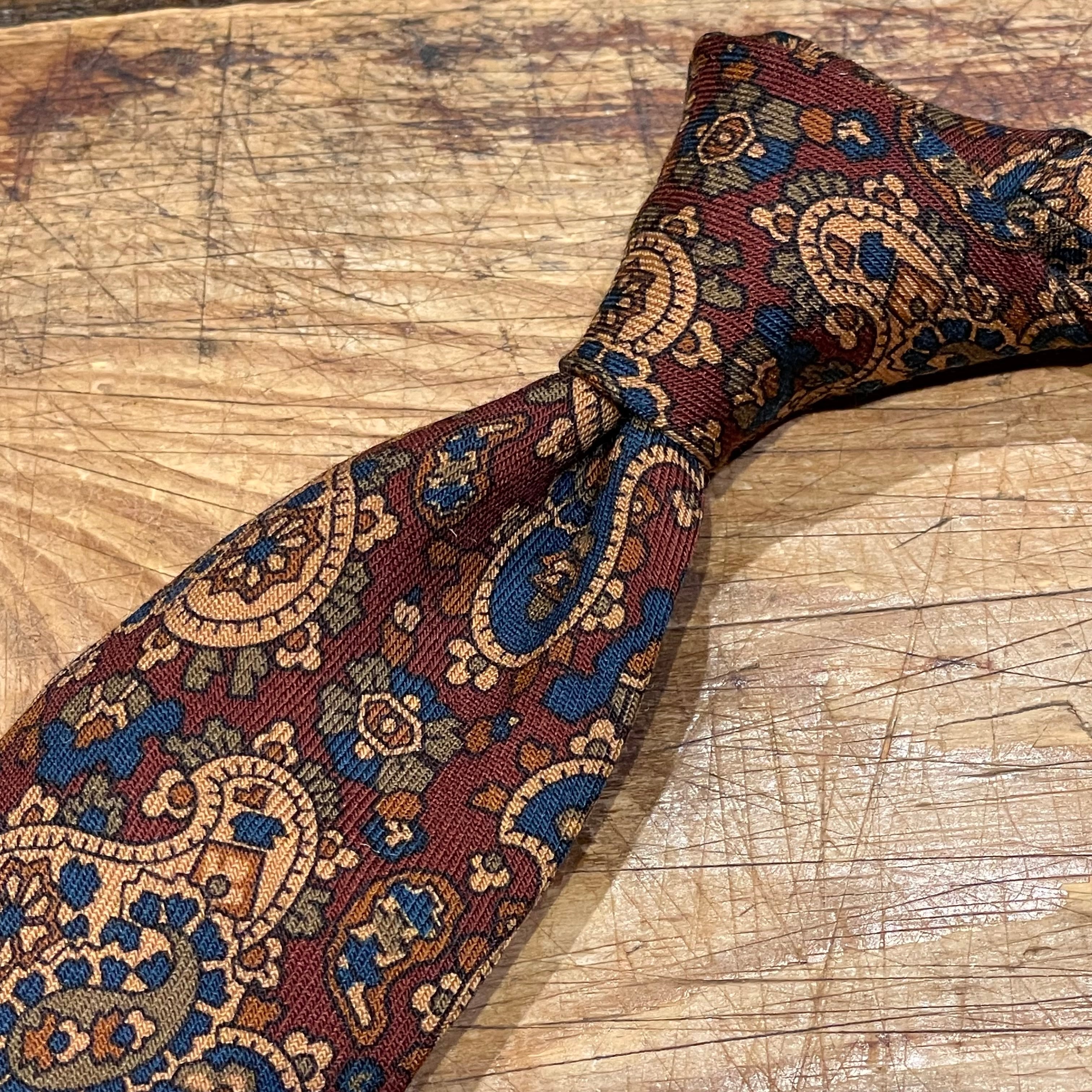 落ち着いたボルドーにネイビー、ブラウン、オリーブのペイズリー柄でカジュアルからジャケットスタイルまで幅広くお使いいただけます。