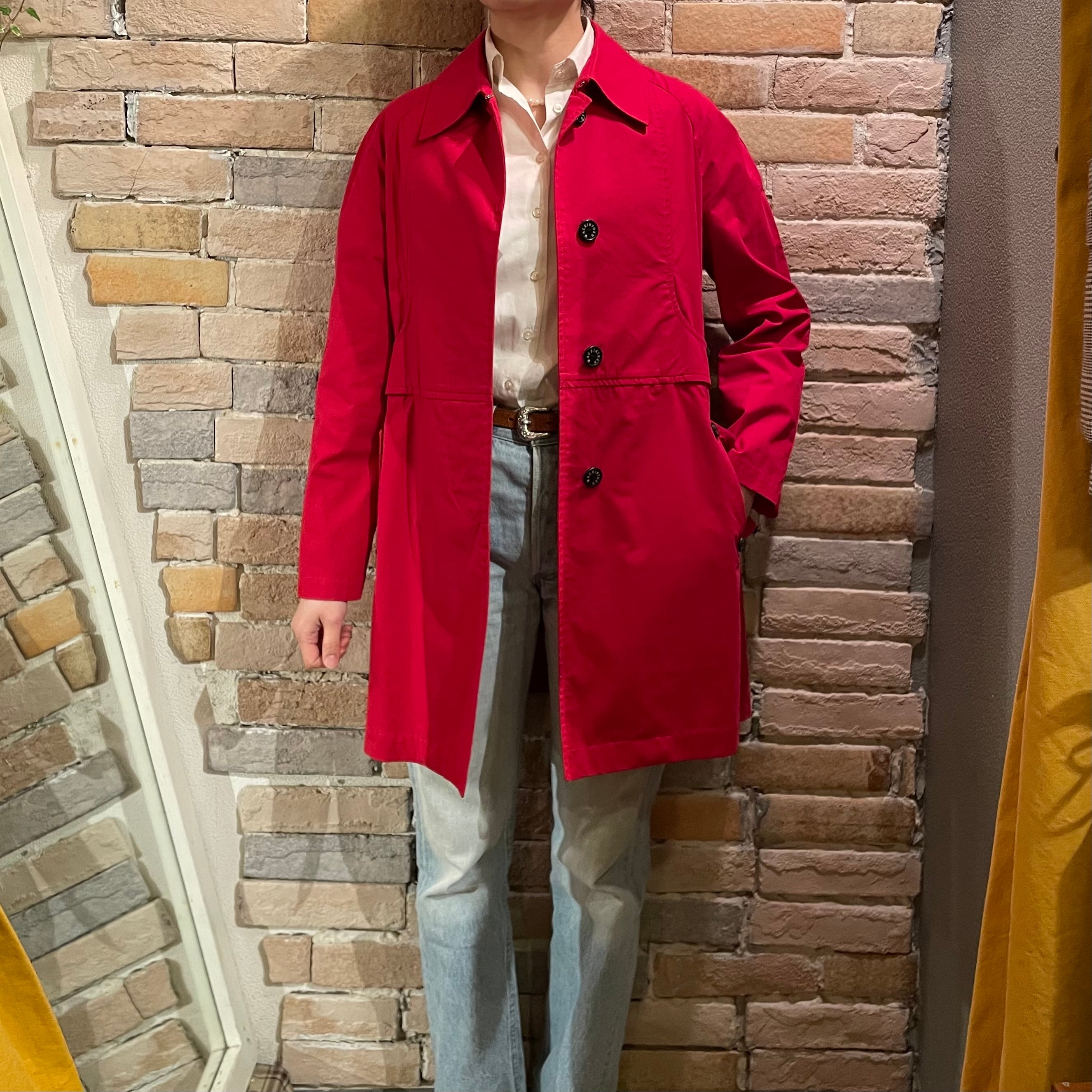 街並みに映える赤いカラーの軽やかなスプリングコートです。