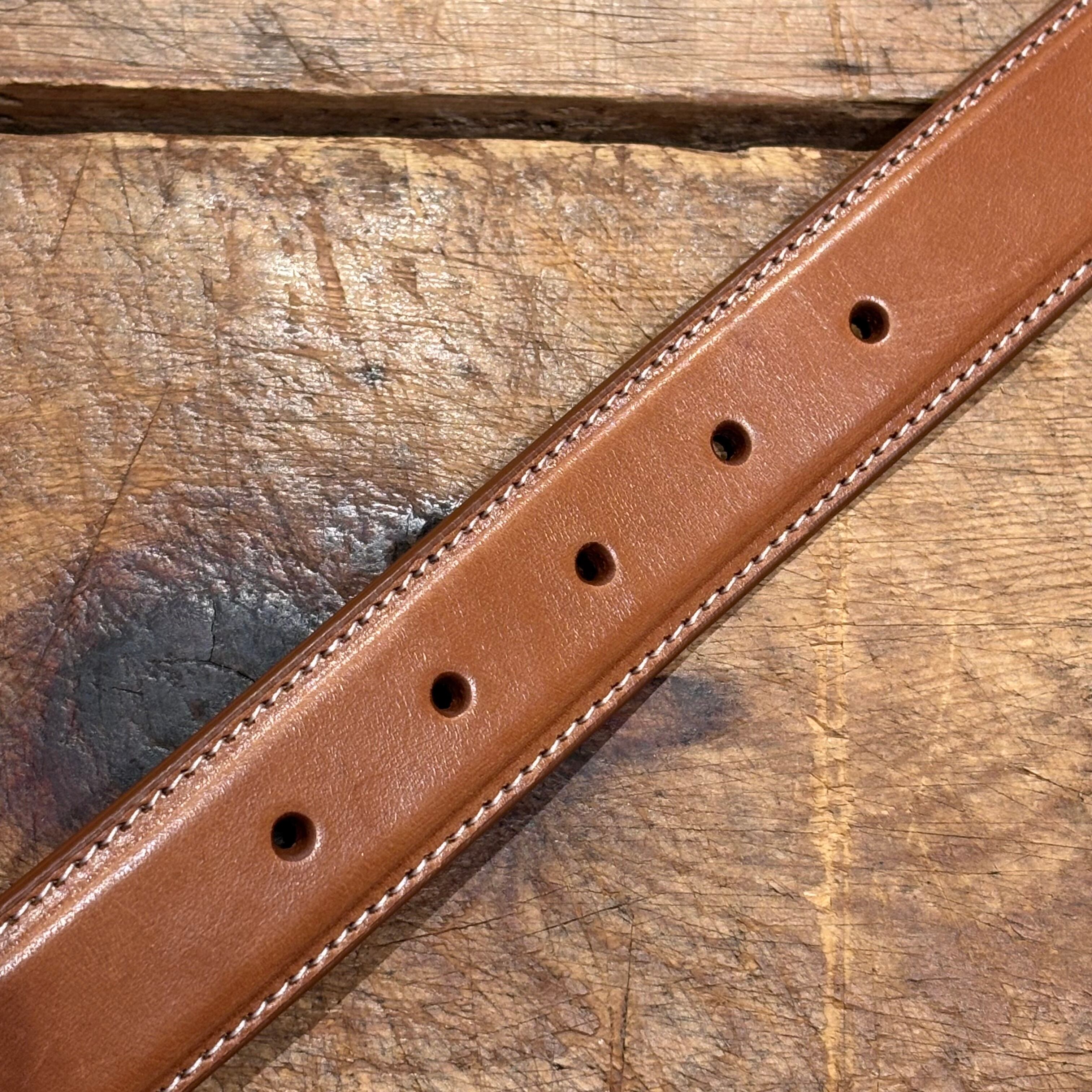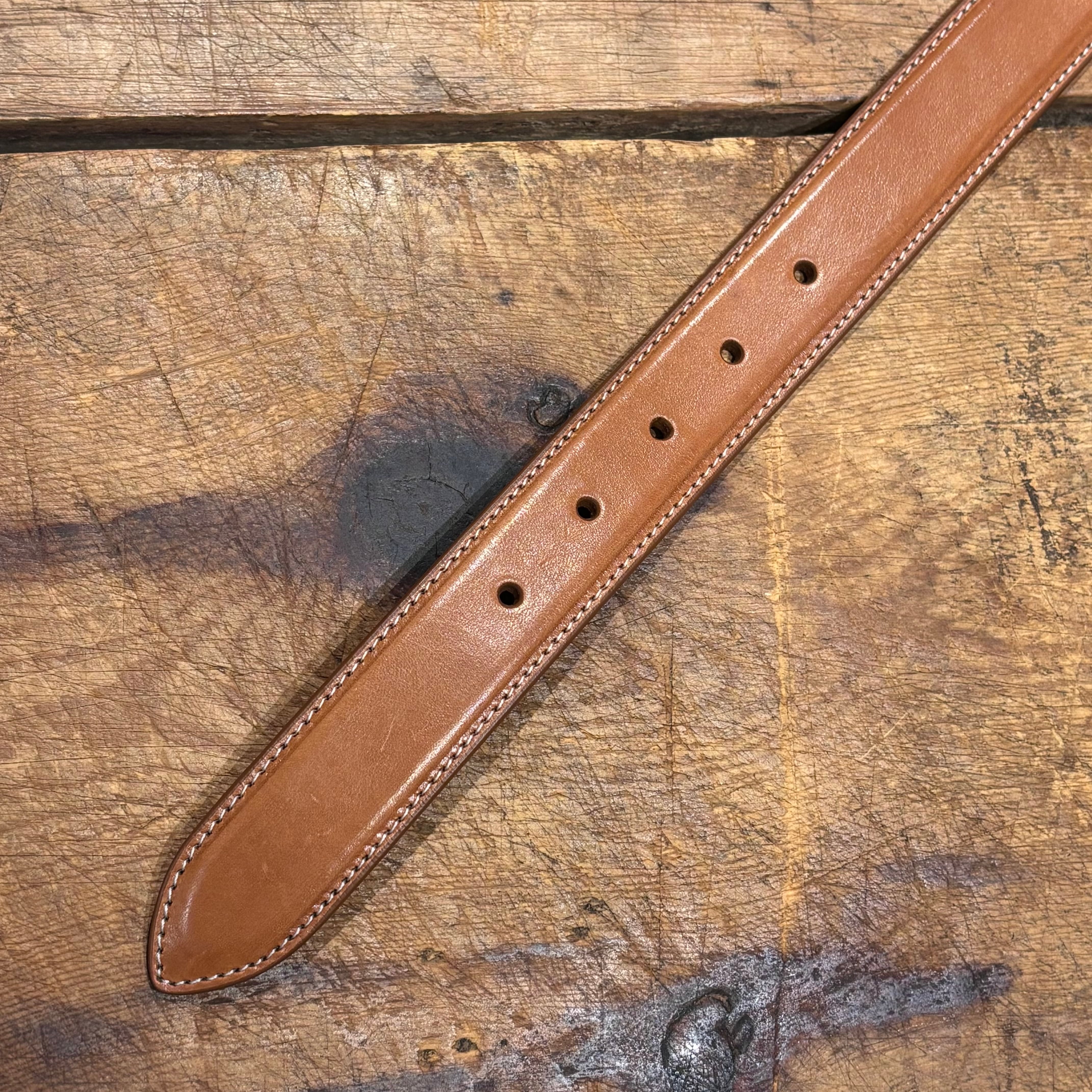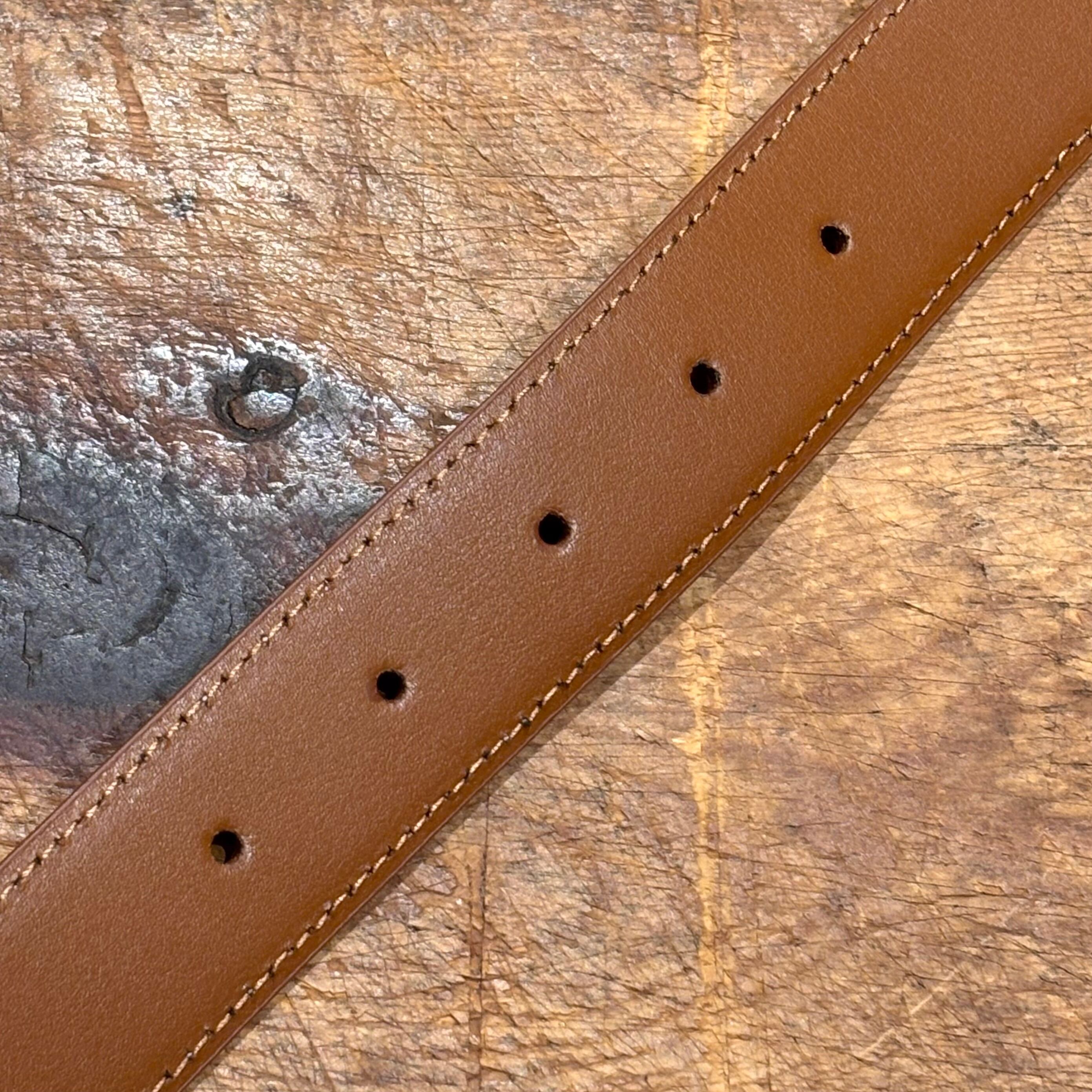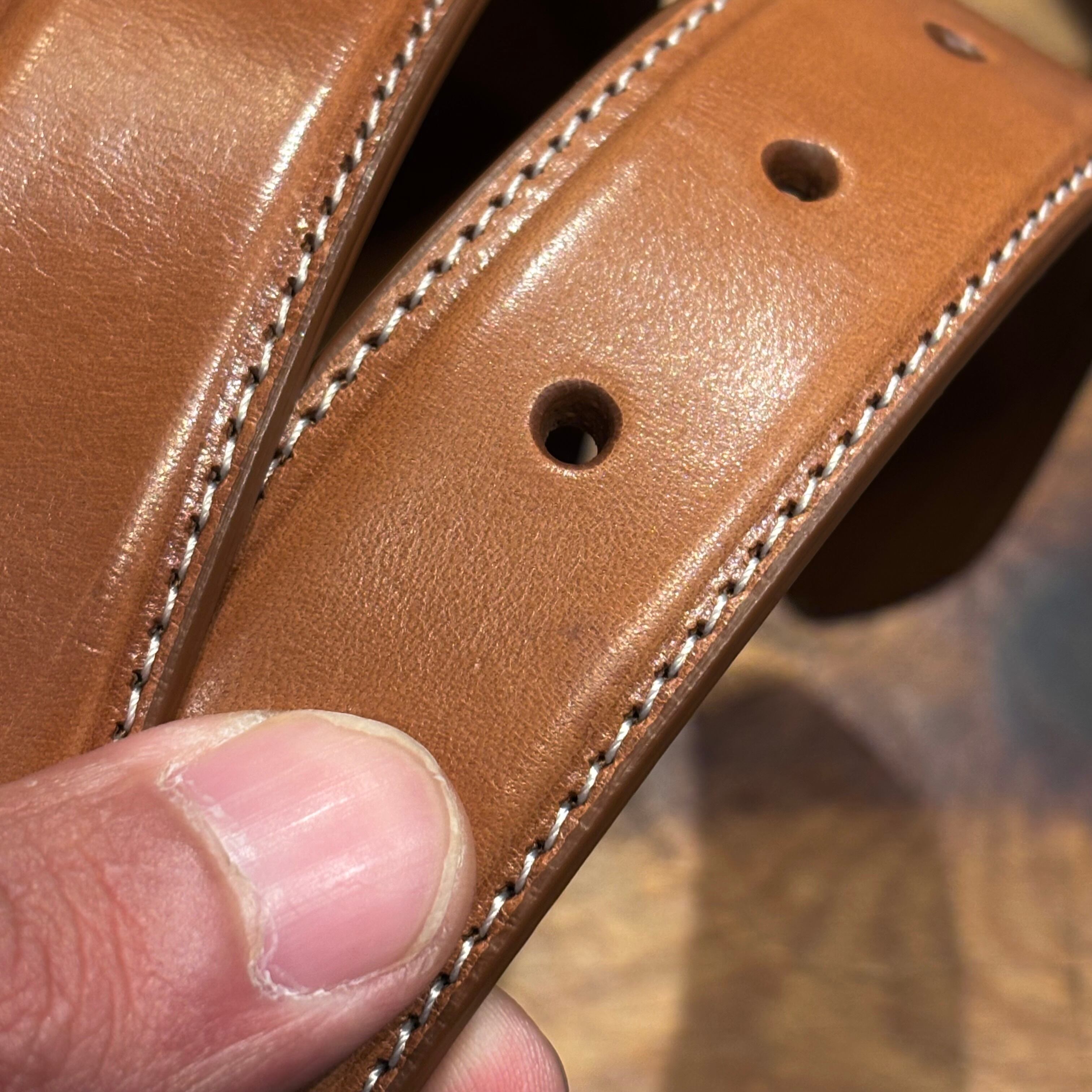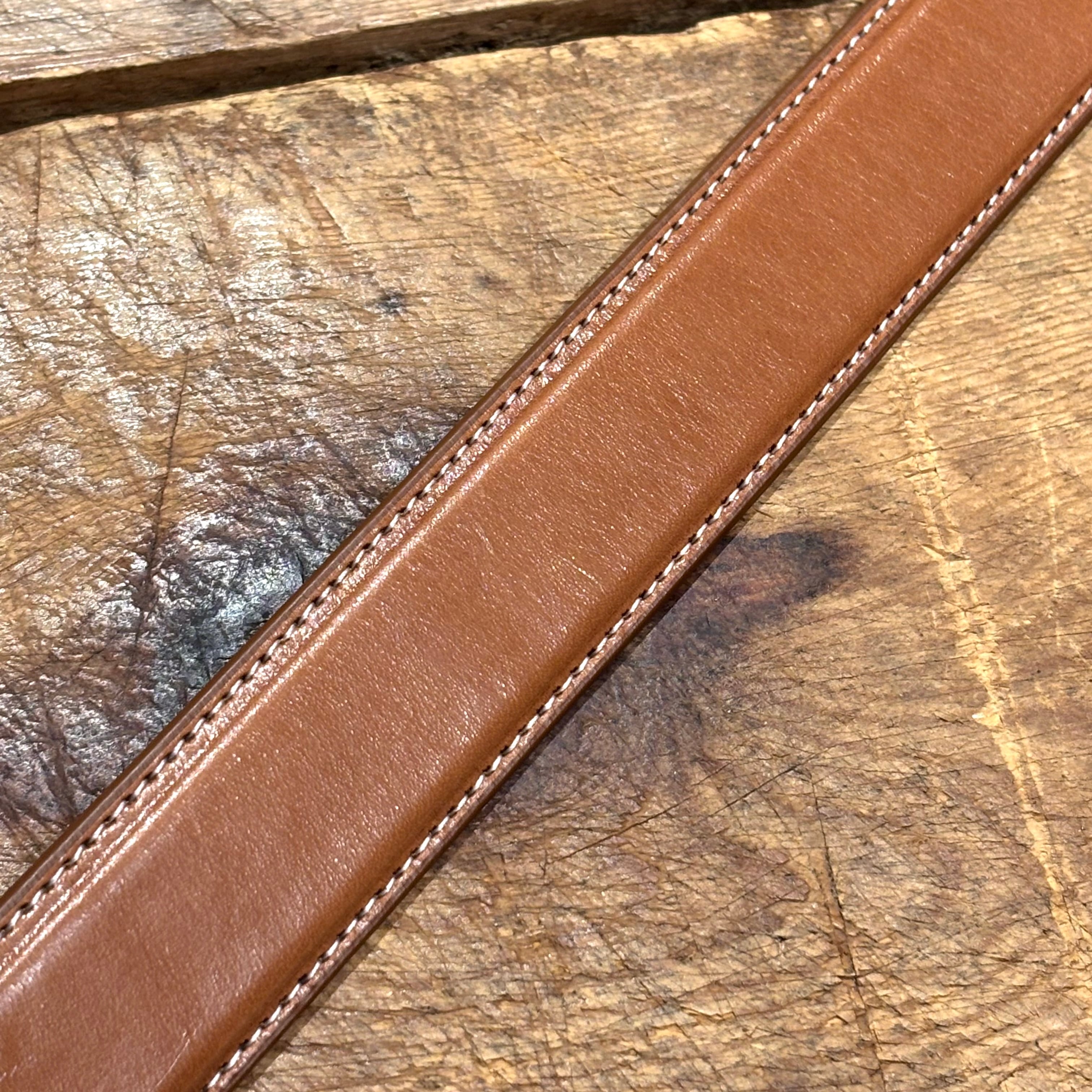 タンブラウン色にホワイトのステッチが程良くカジュアルな雰囲気の未使用品イタリア製レザーベルト。