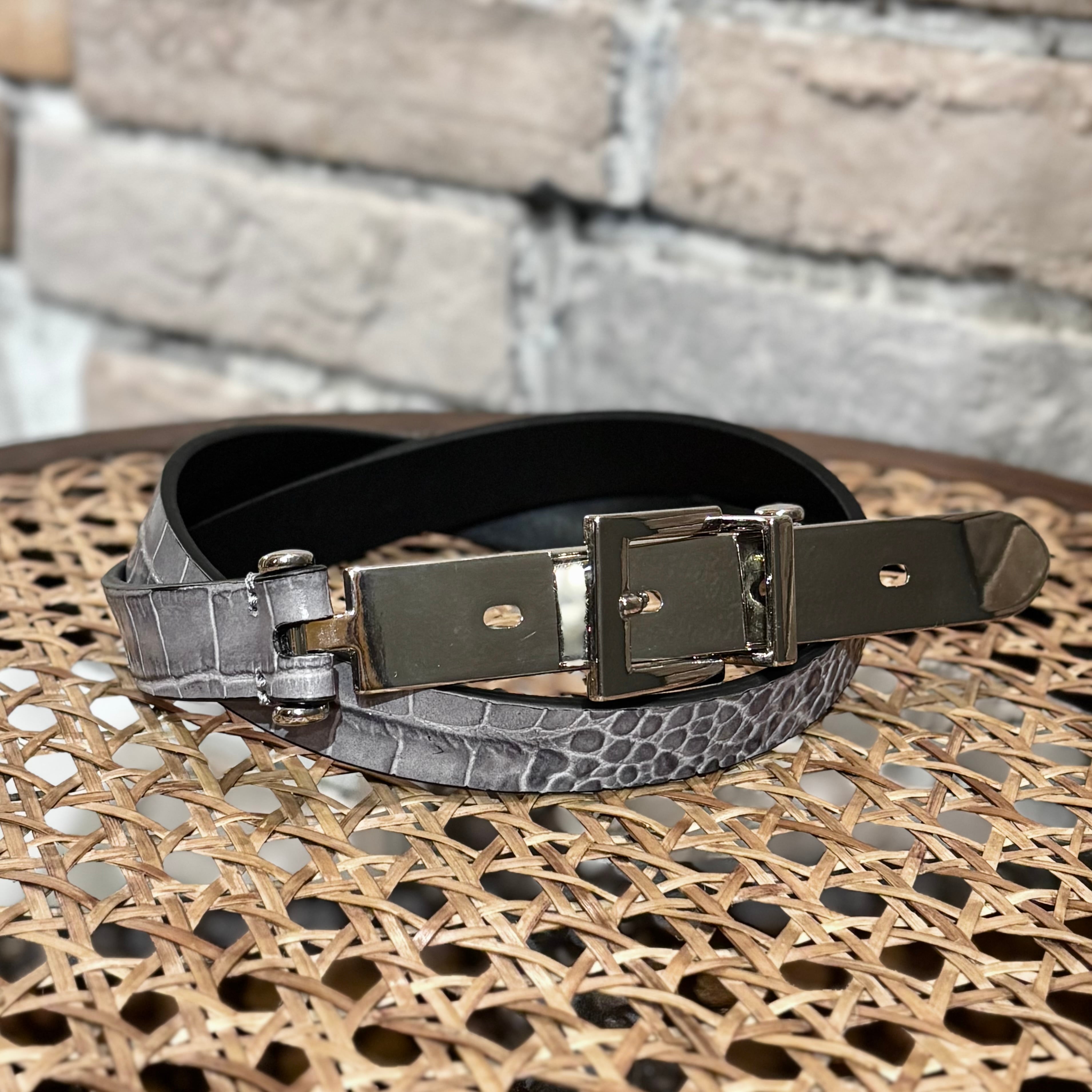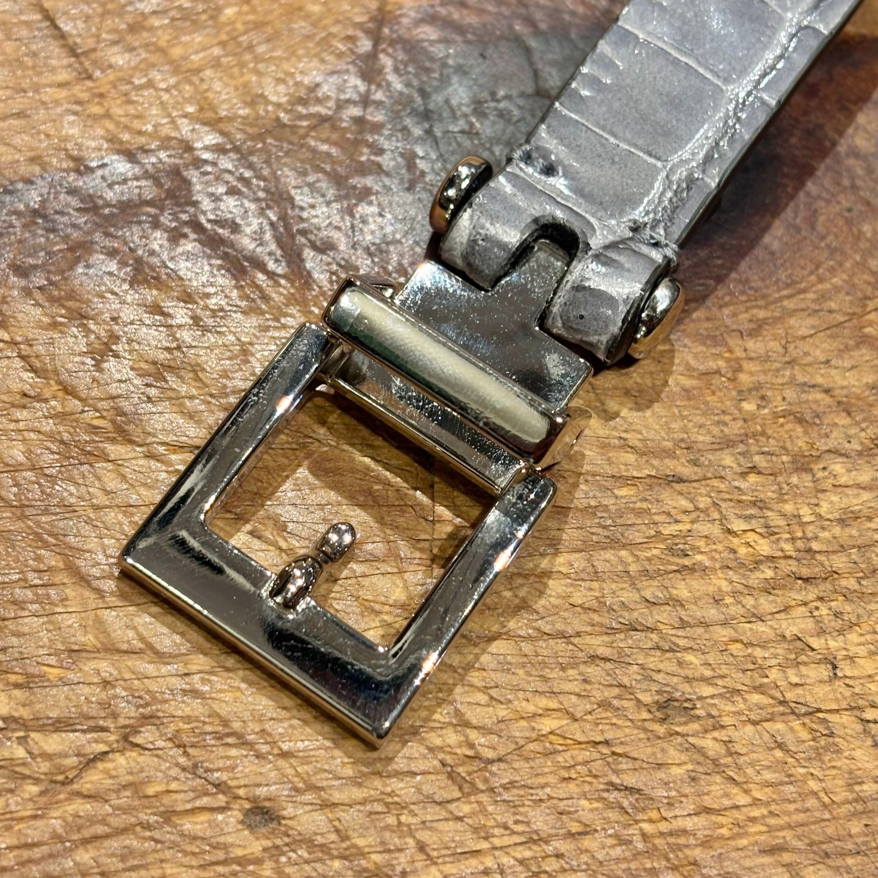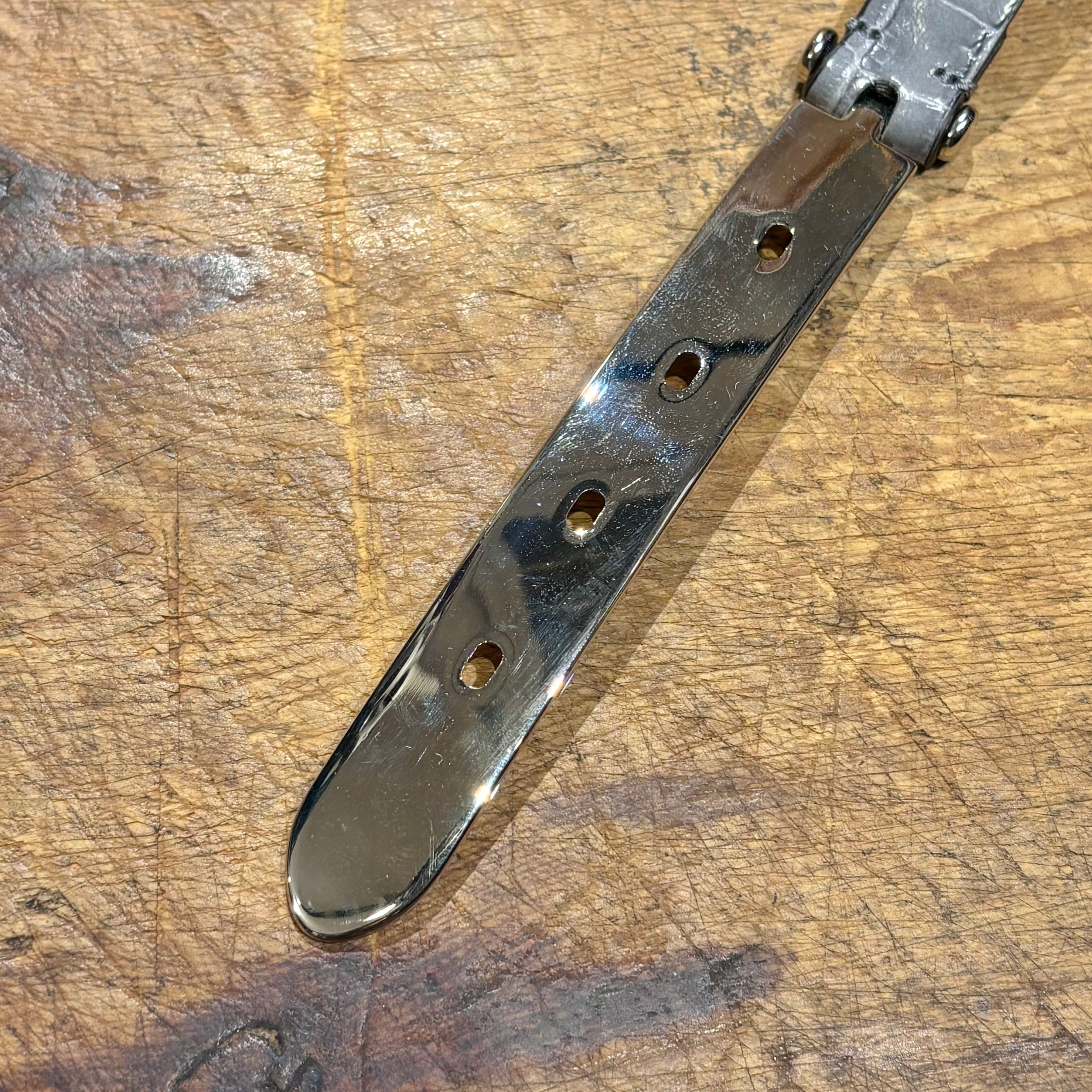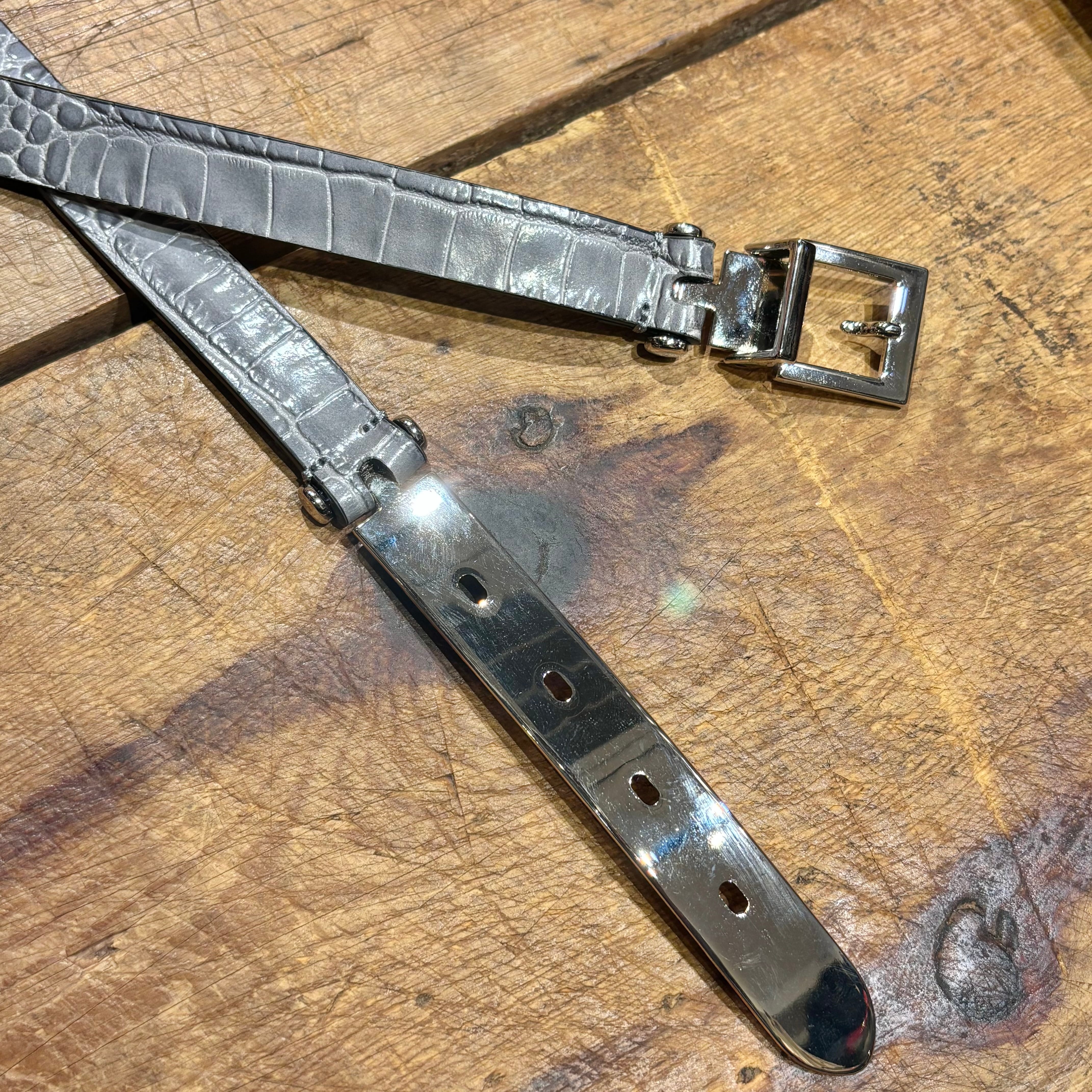 両端の特徴的な金具使いとグレーの型押しレザーがコーディネートのポイントになる、未使用品イタリア製レザーベルト。
