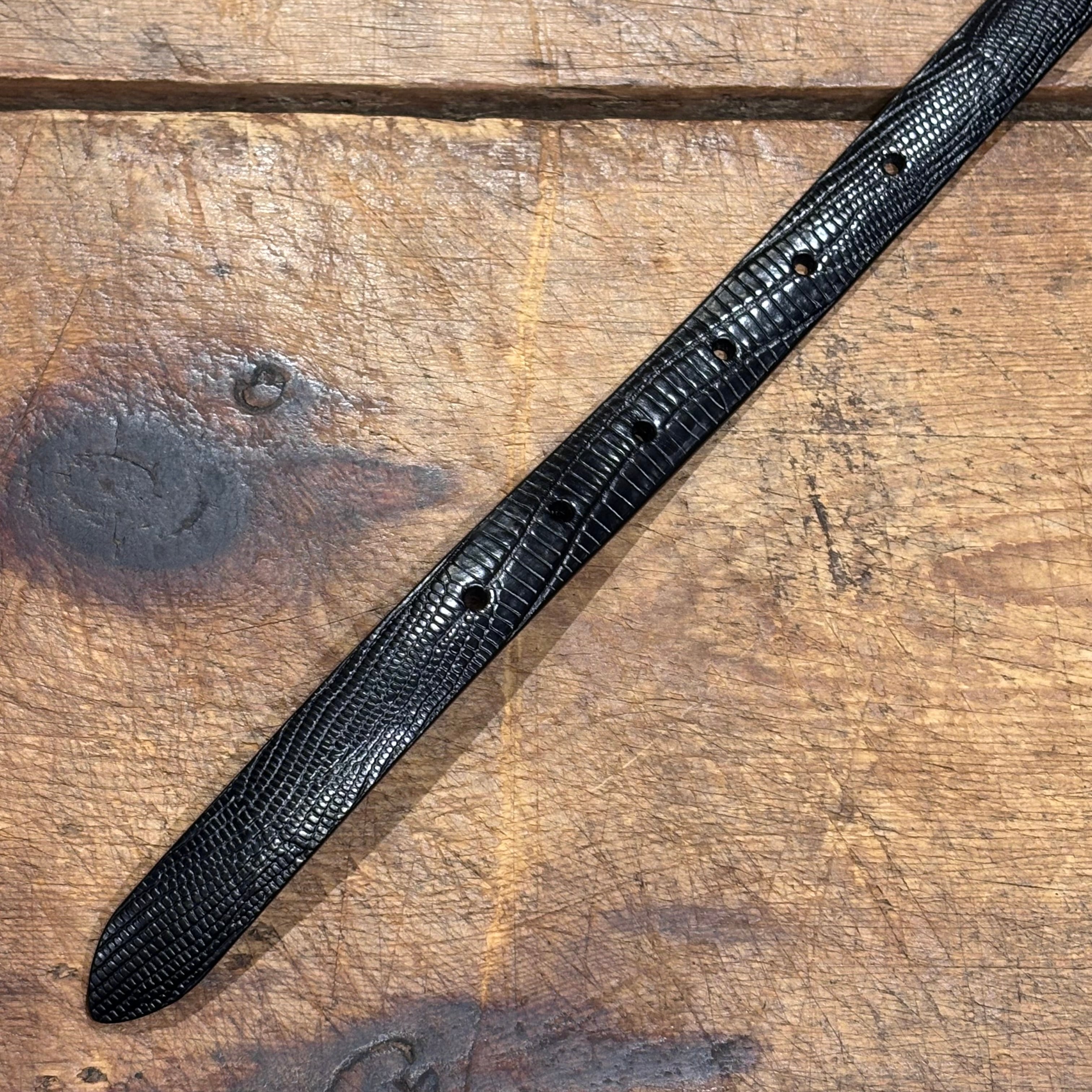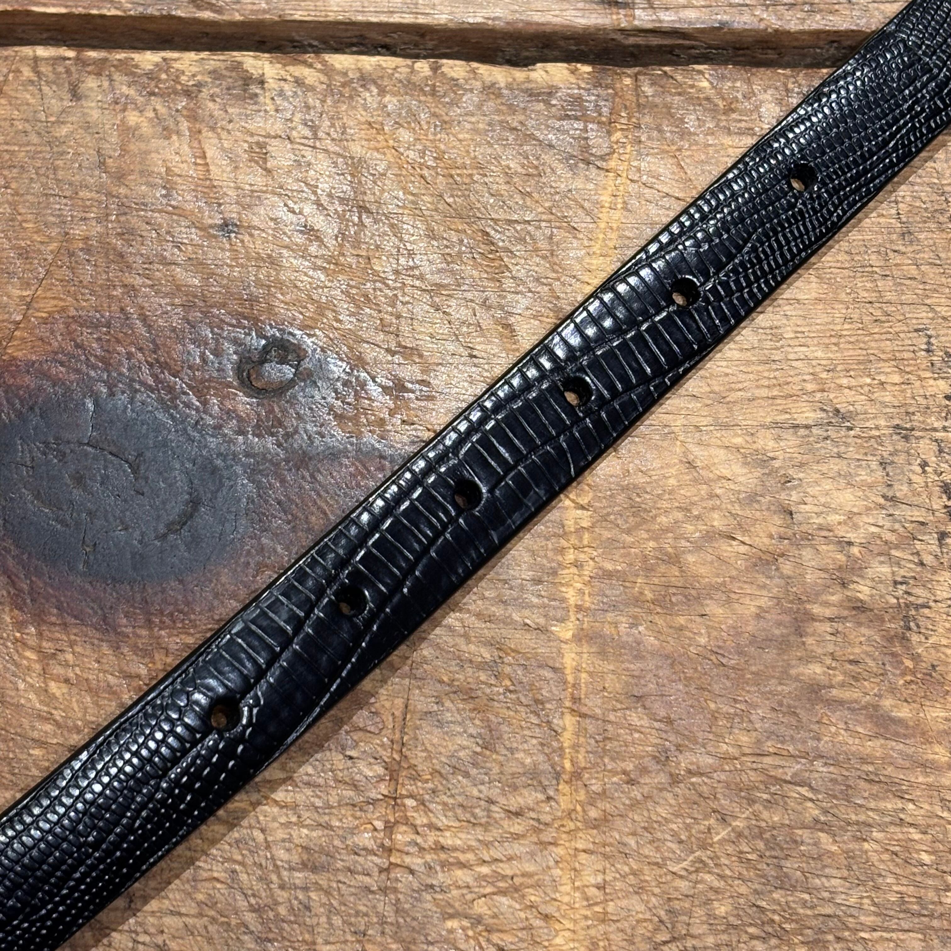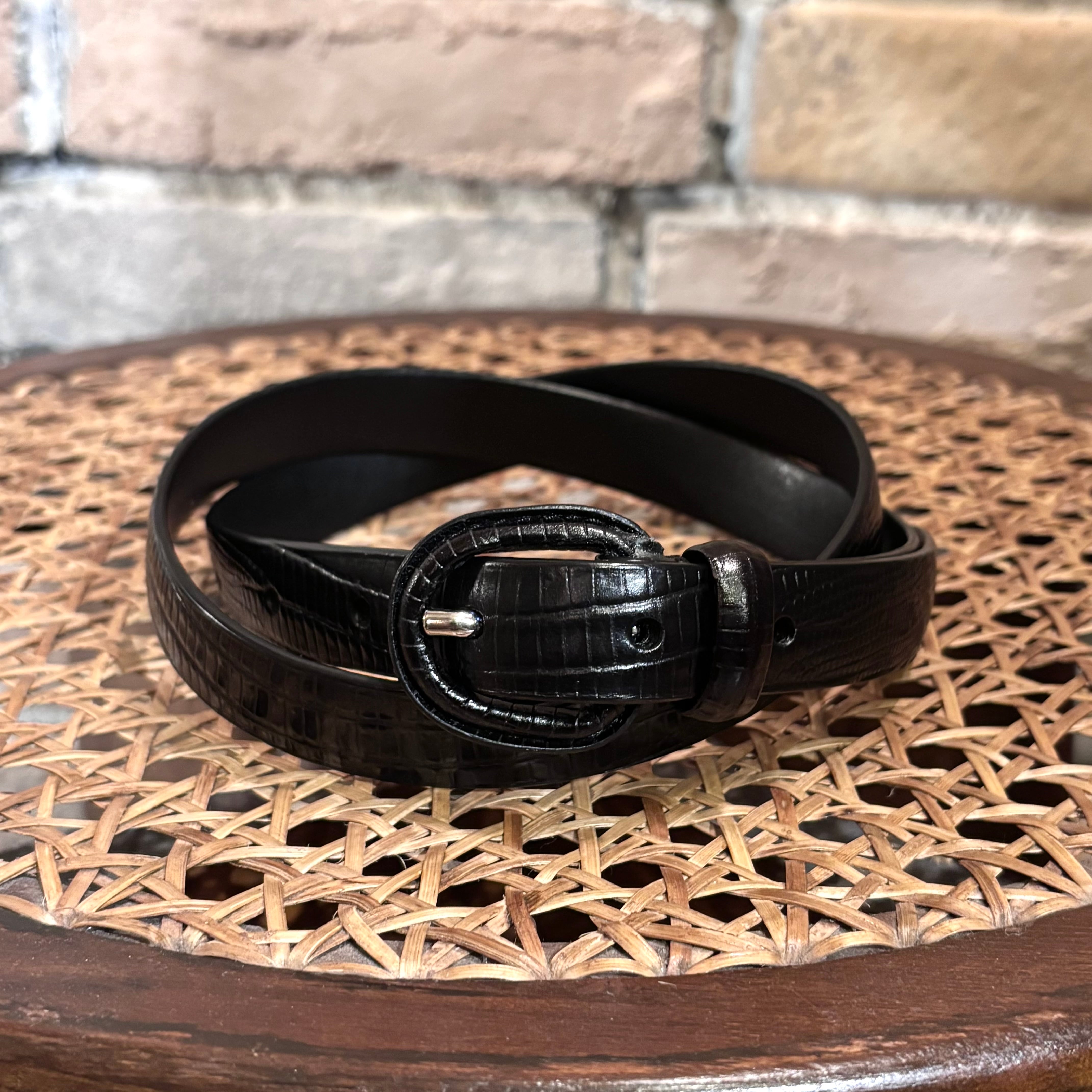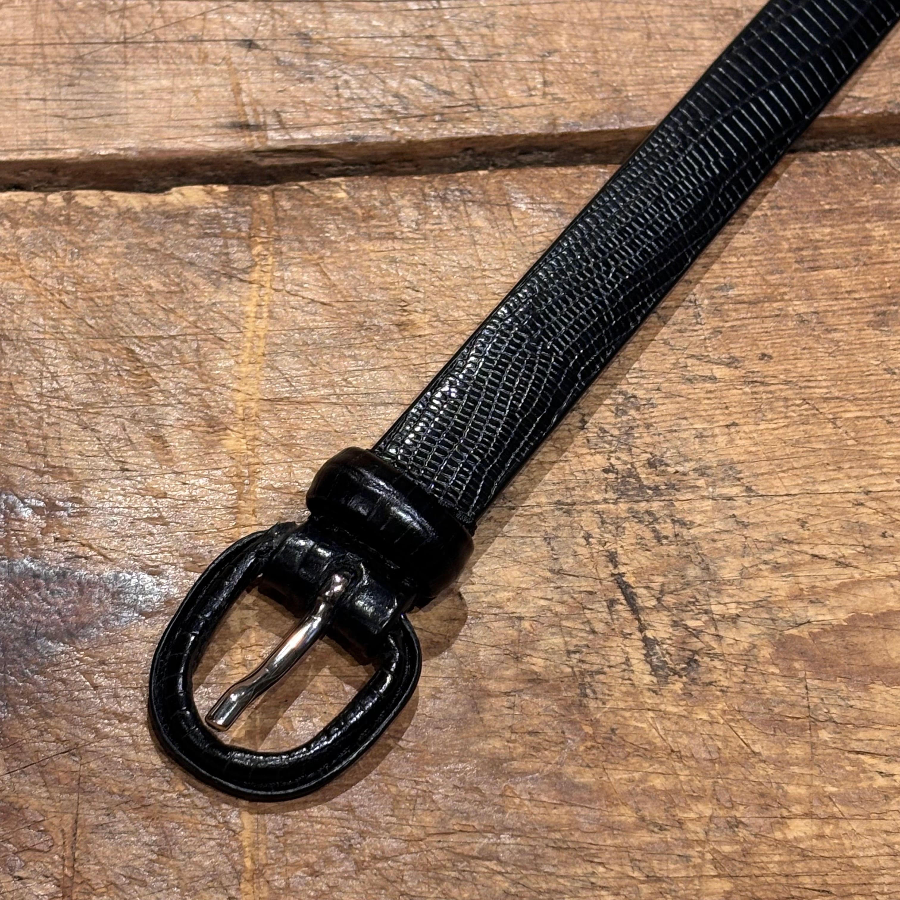 細めのベルト幅にブラックの型押しレザーが上品な雰囲気を感じる、未使用品のイタリア製レザーベルト。