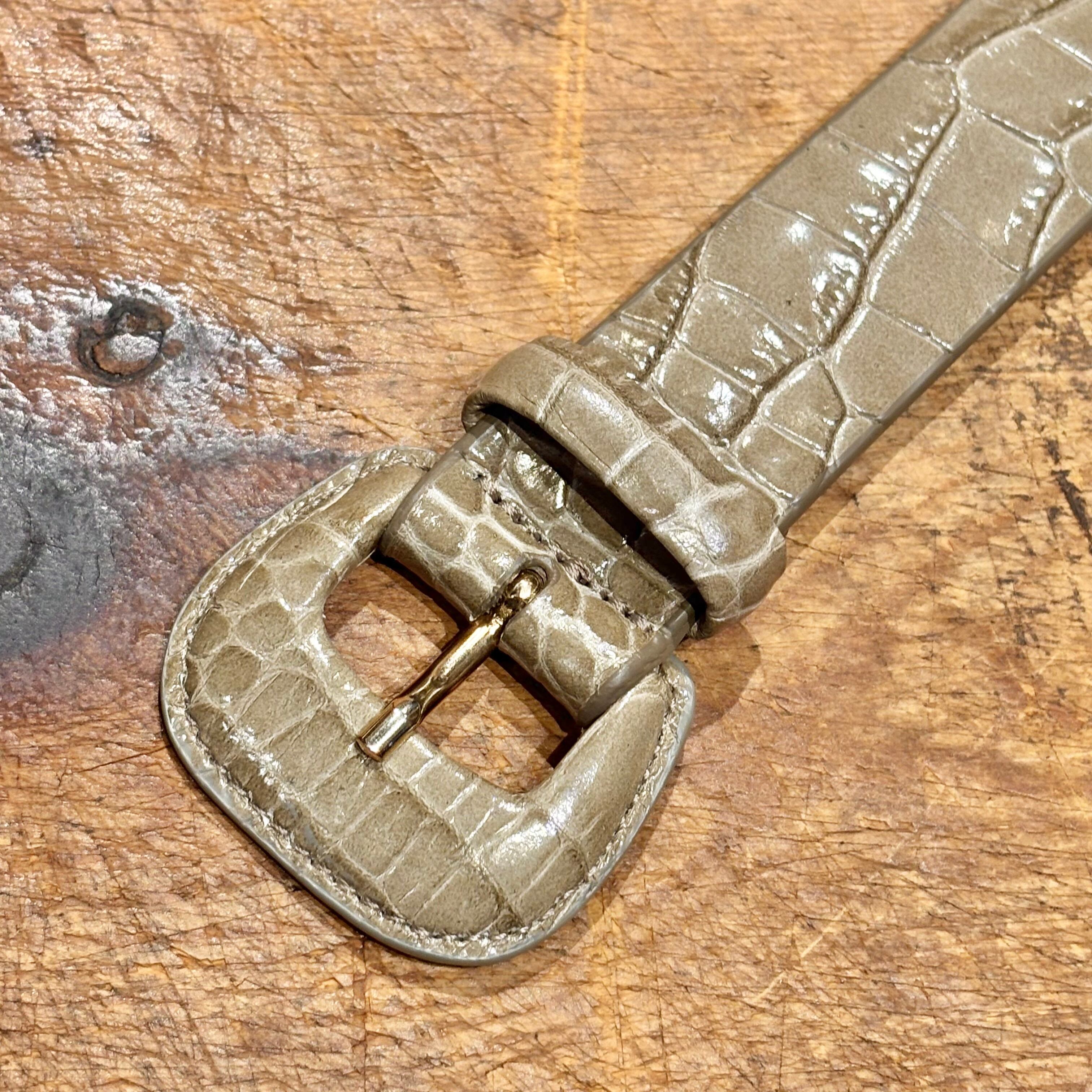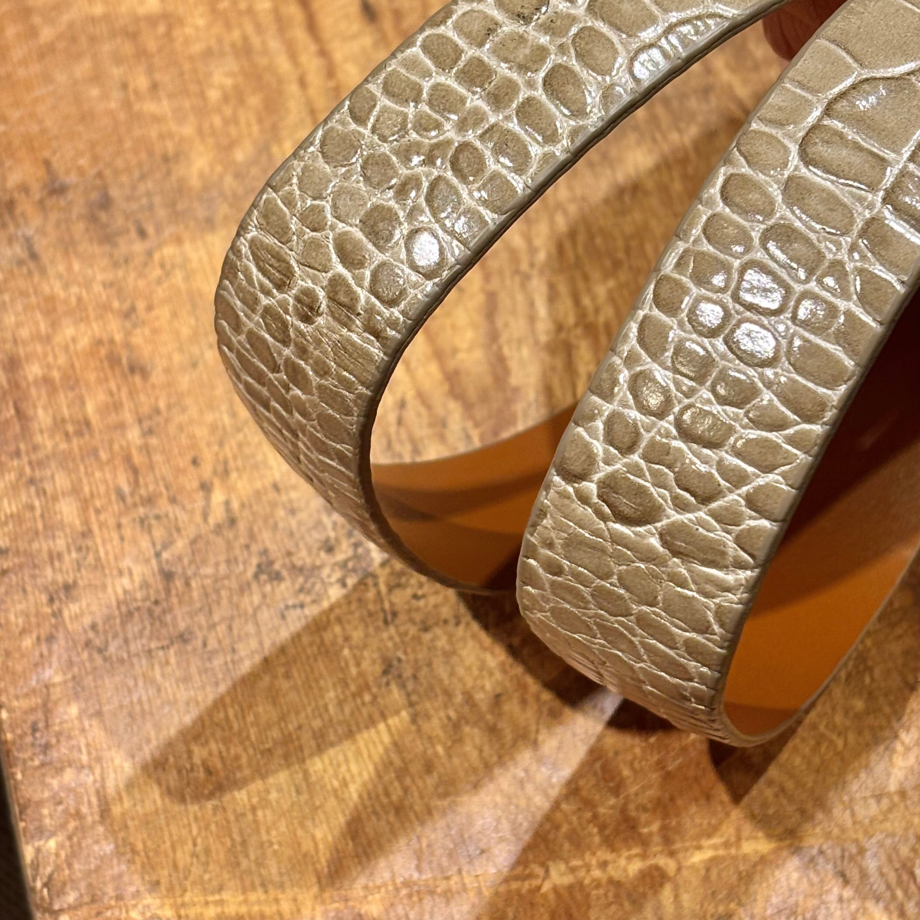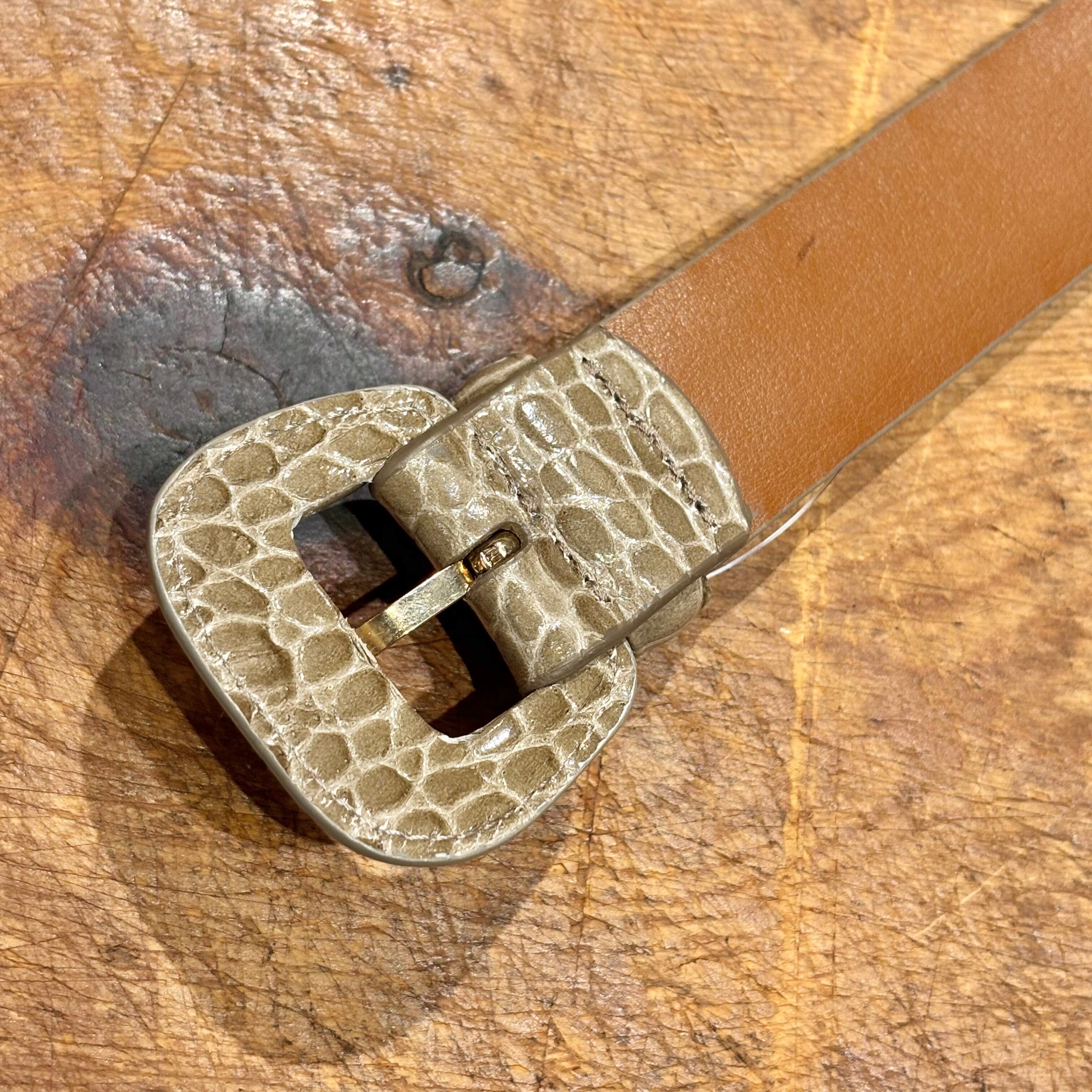 中間的なグレージュ色の型押しレザーがコーディネートのポイントになる、未使用品のイタリア製レザーベルト。