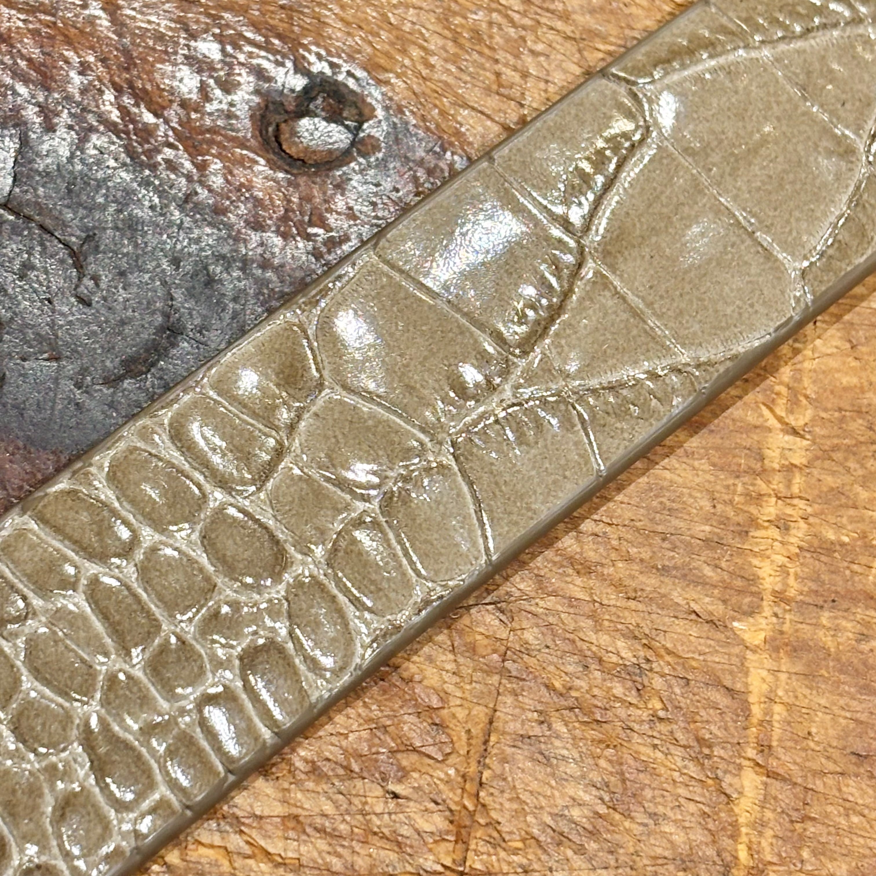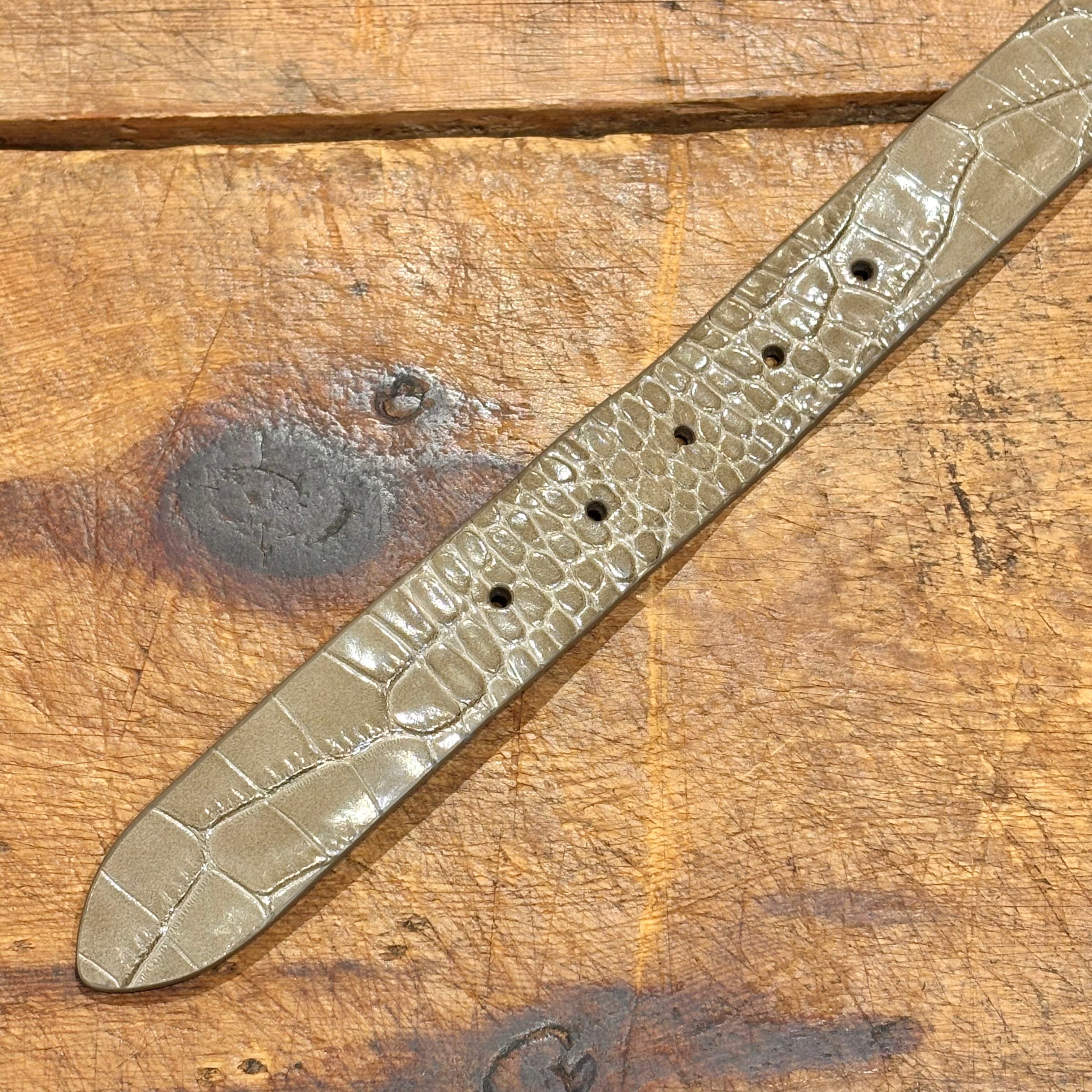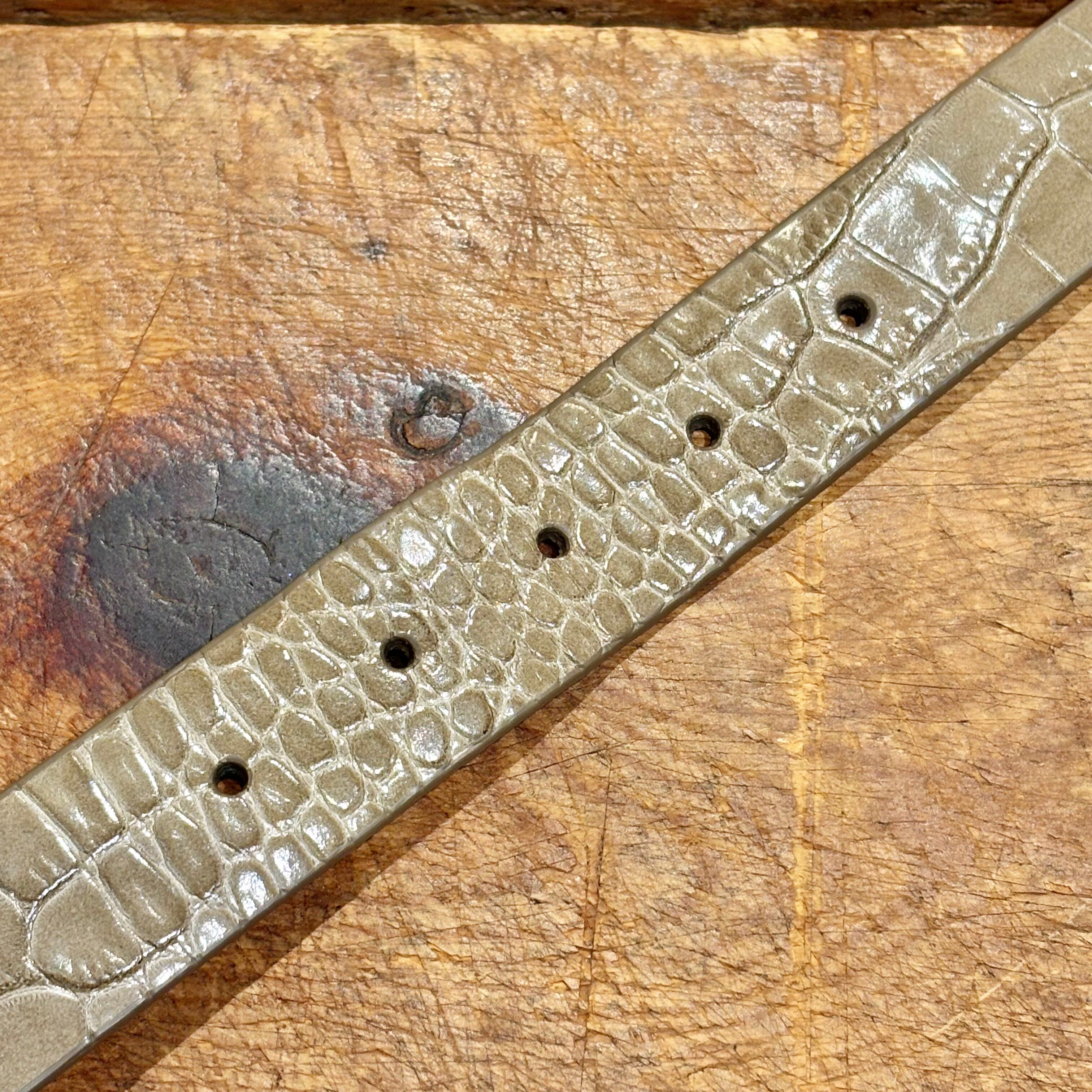 中間的なグレージュ色の型押しレザーがコーディネートのポイントになる、未使用品のイタリア製レザーベルト。