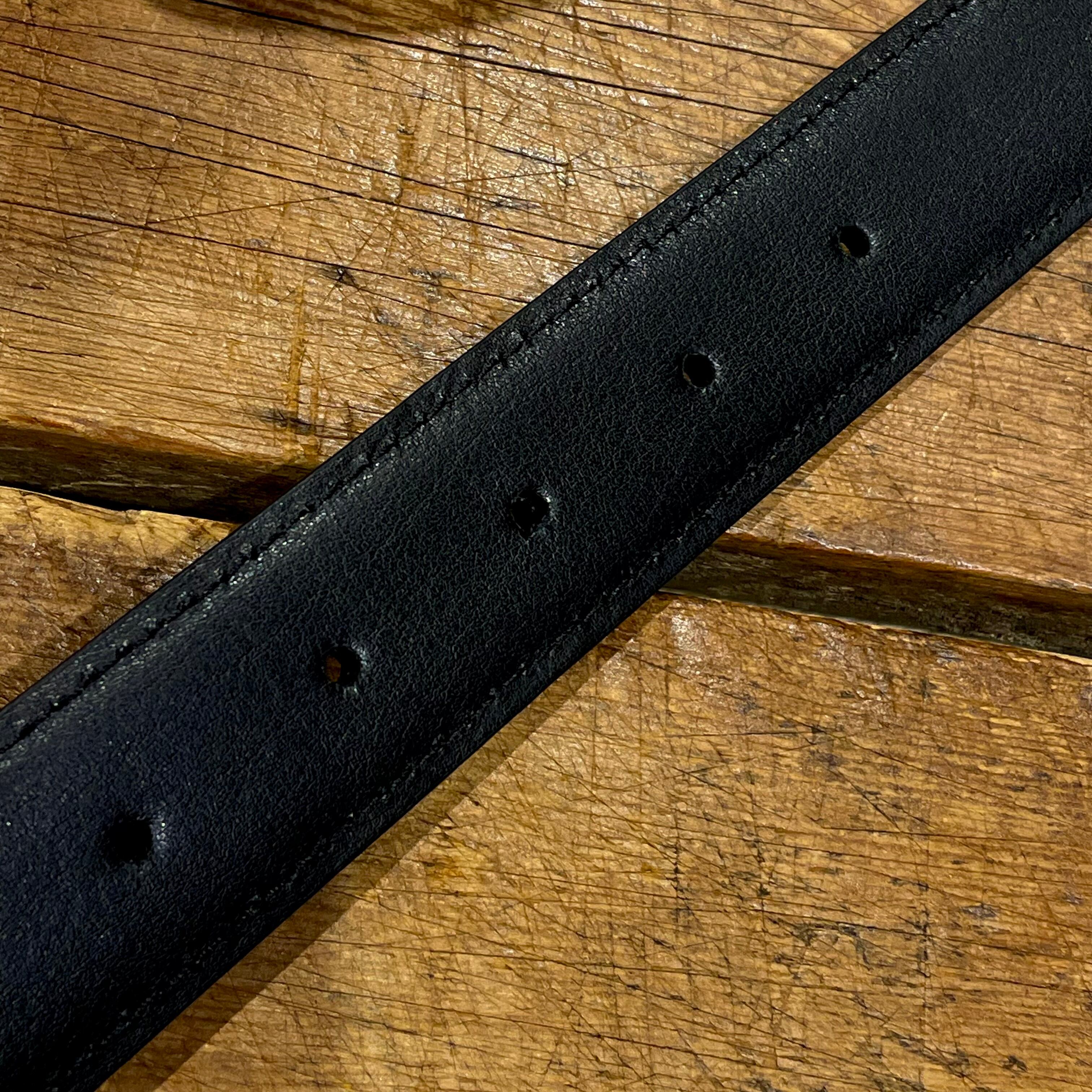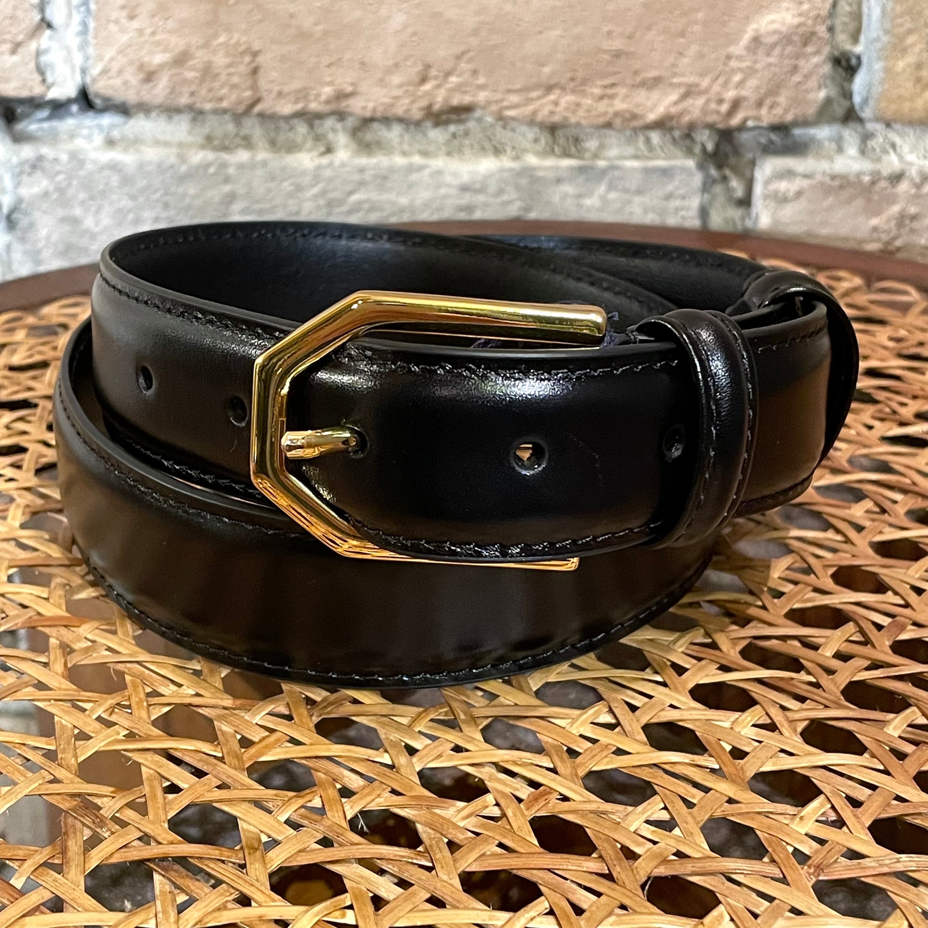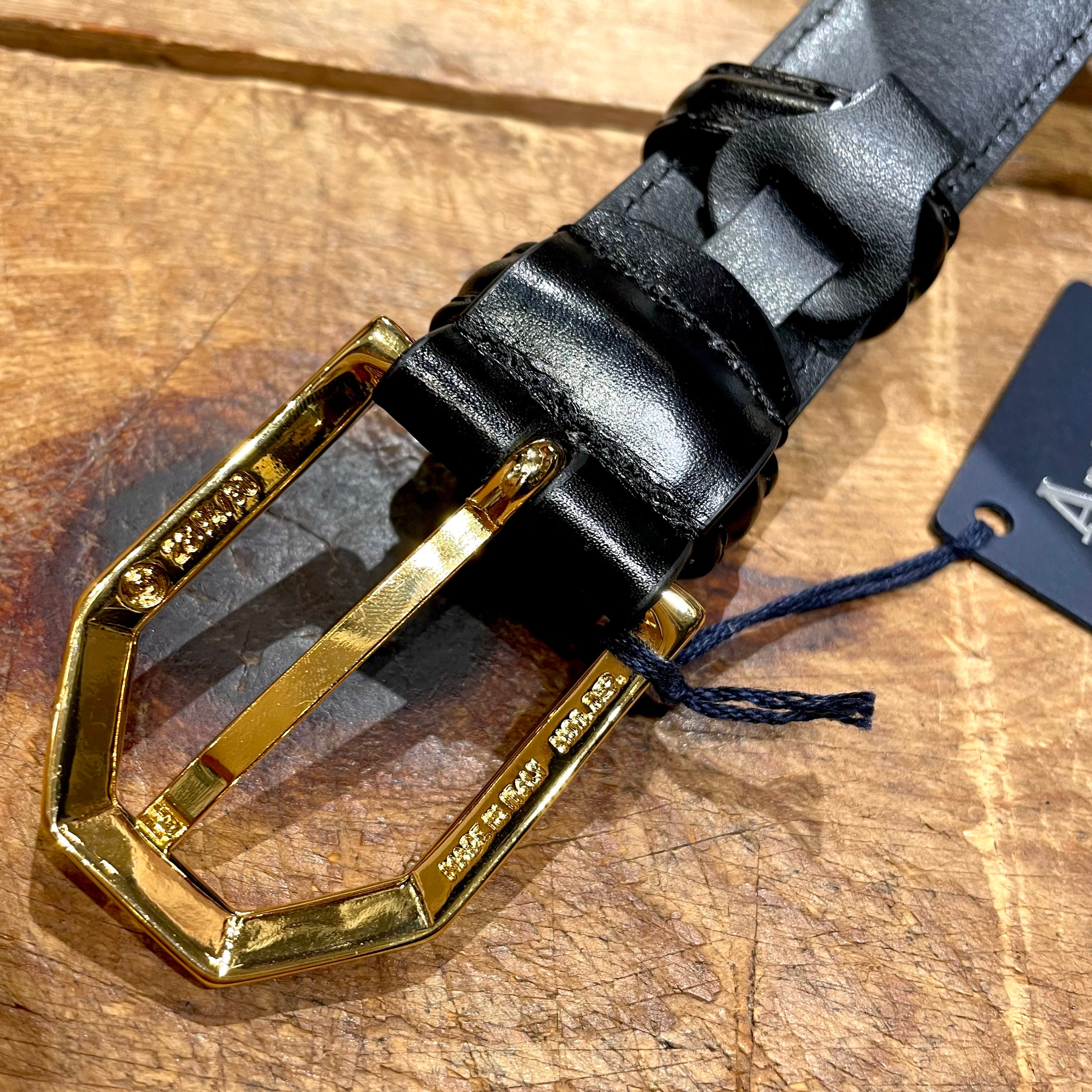 ブラックレザーにゴールドのバックルがアクセントの、未使用品のイタリア製レザーベルト。