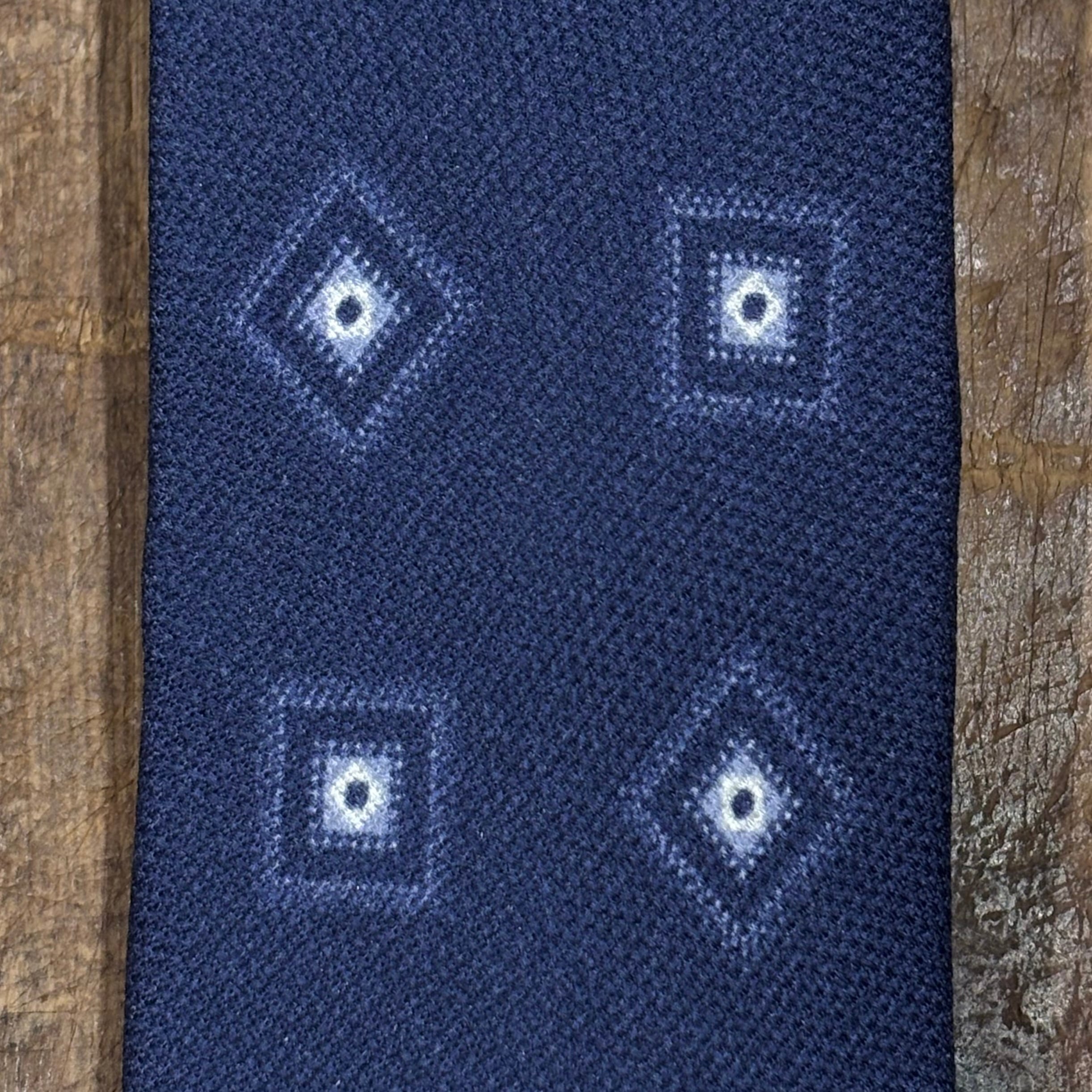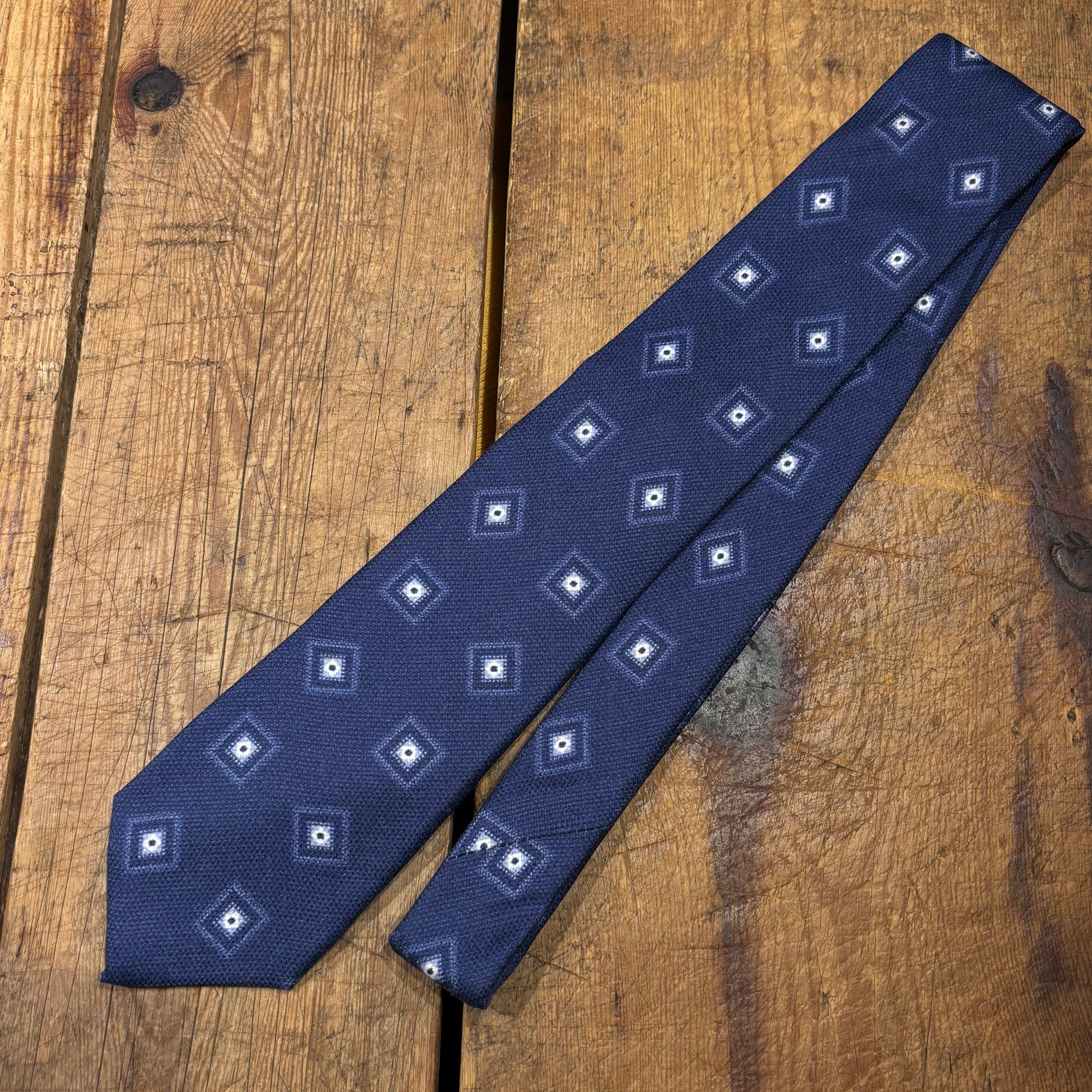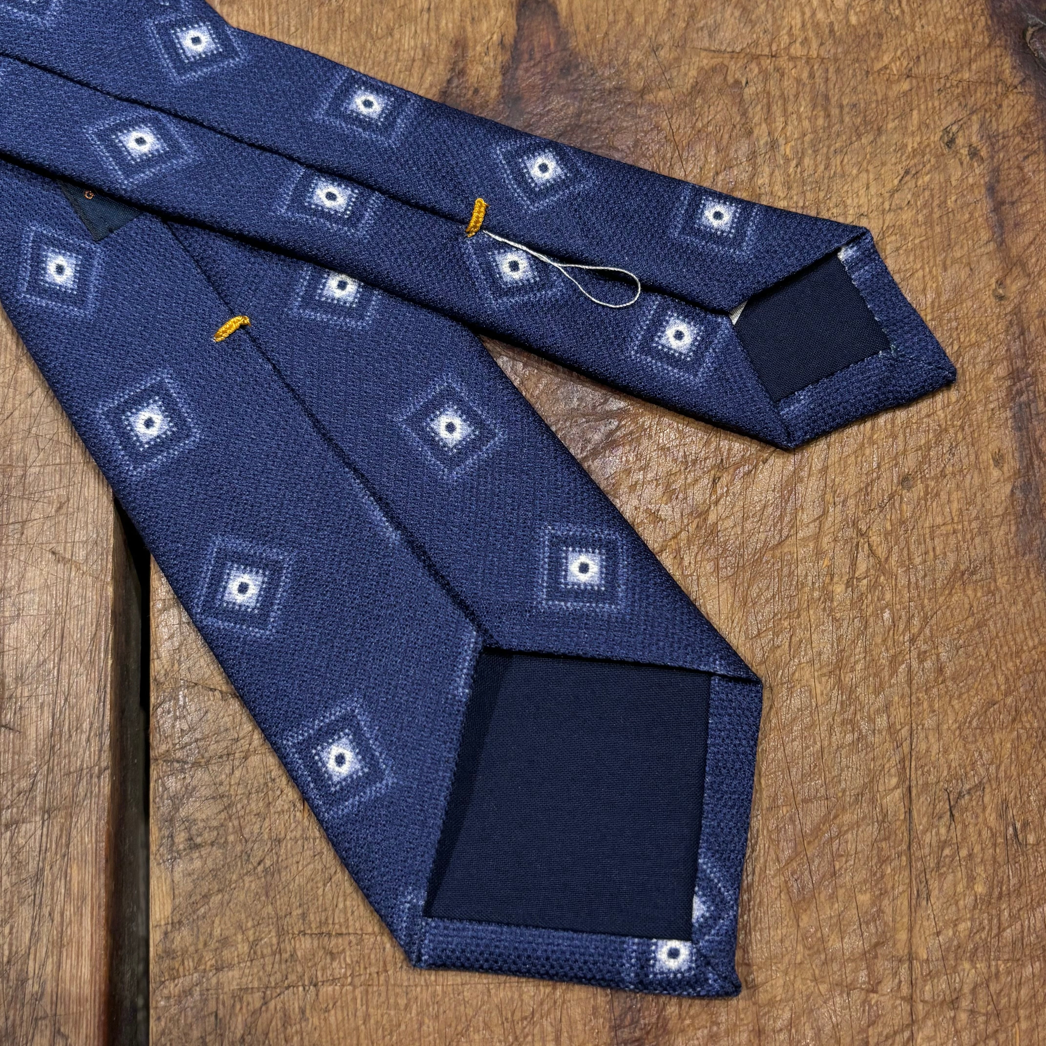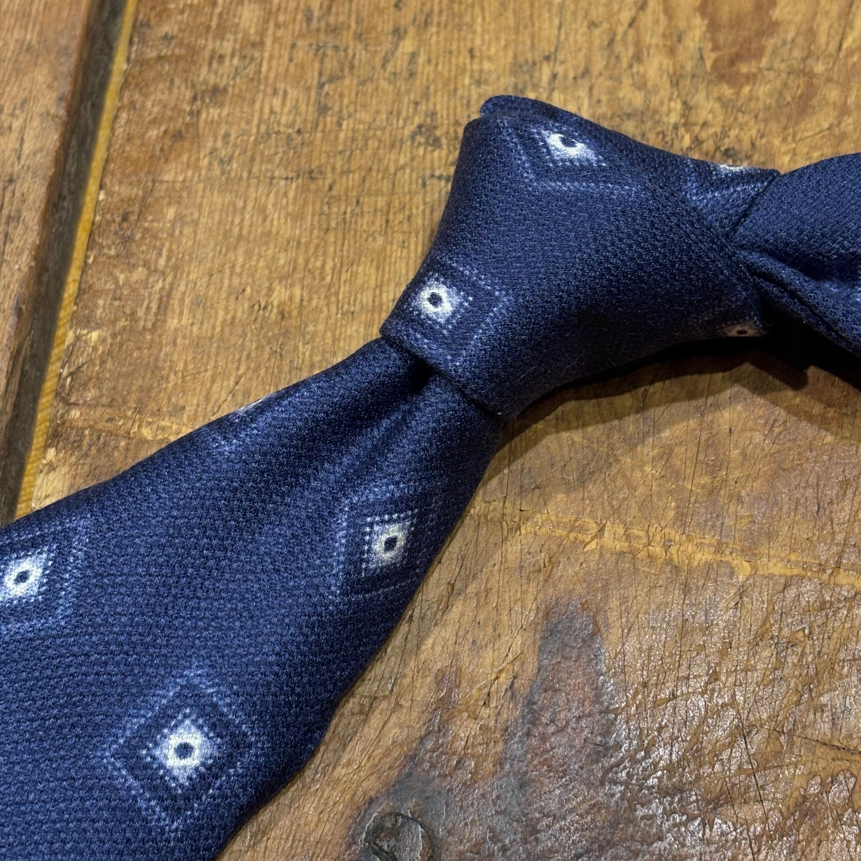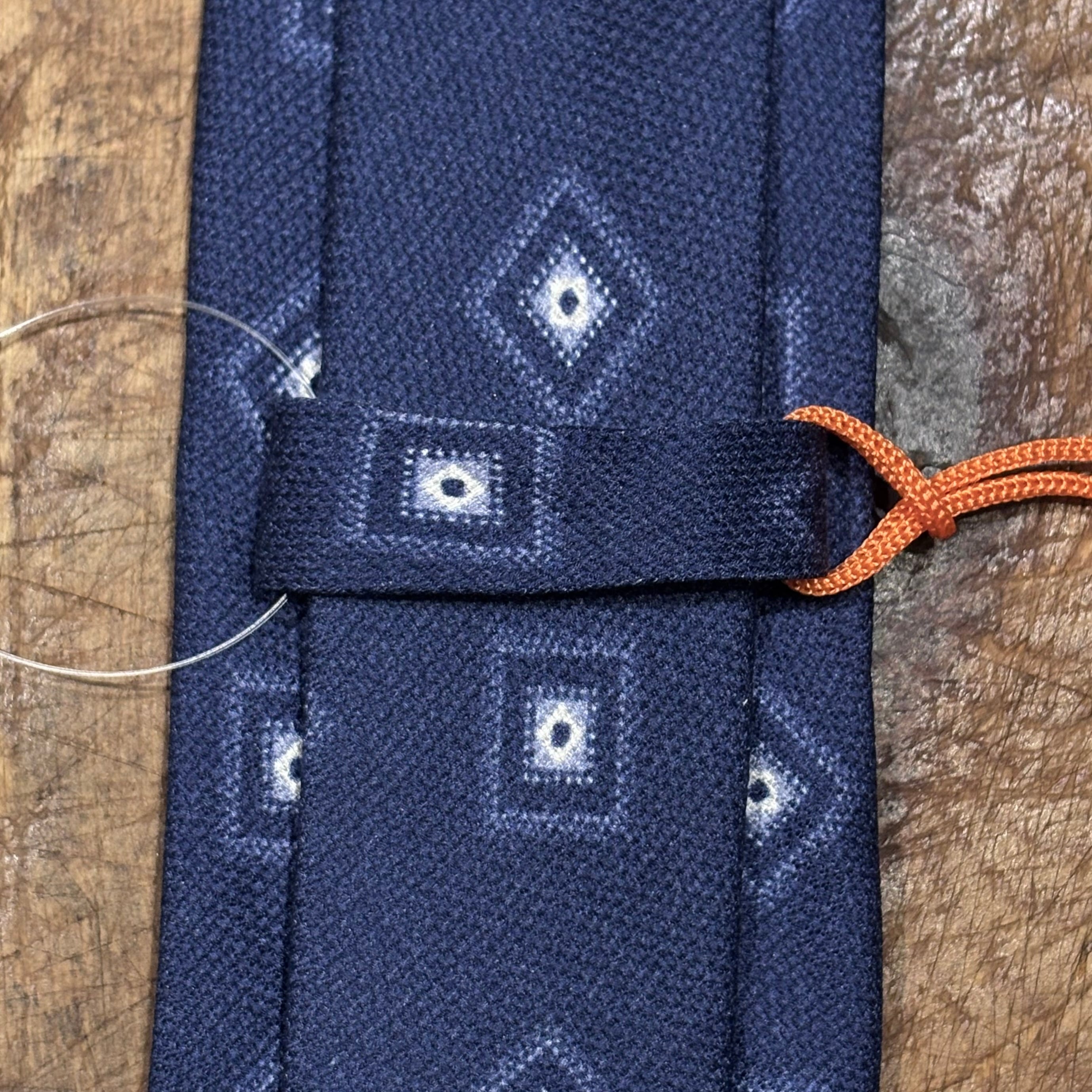落ち着いたネイビーベースの幾何学柄にドライタッチなシルクの生地感が春夏にも使用しやすい1本。