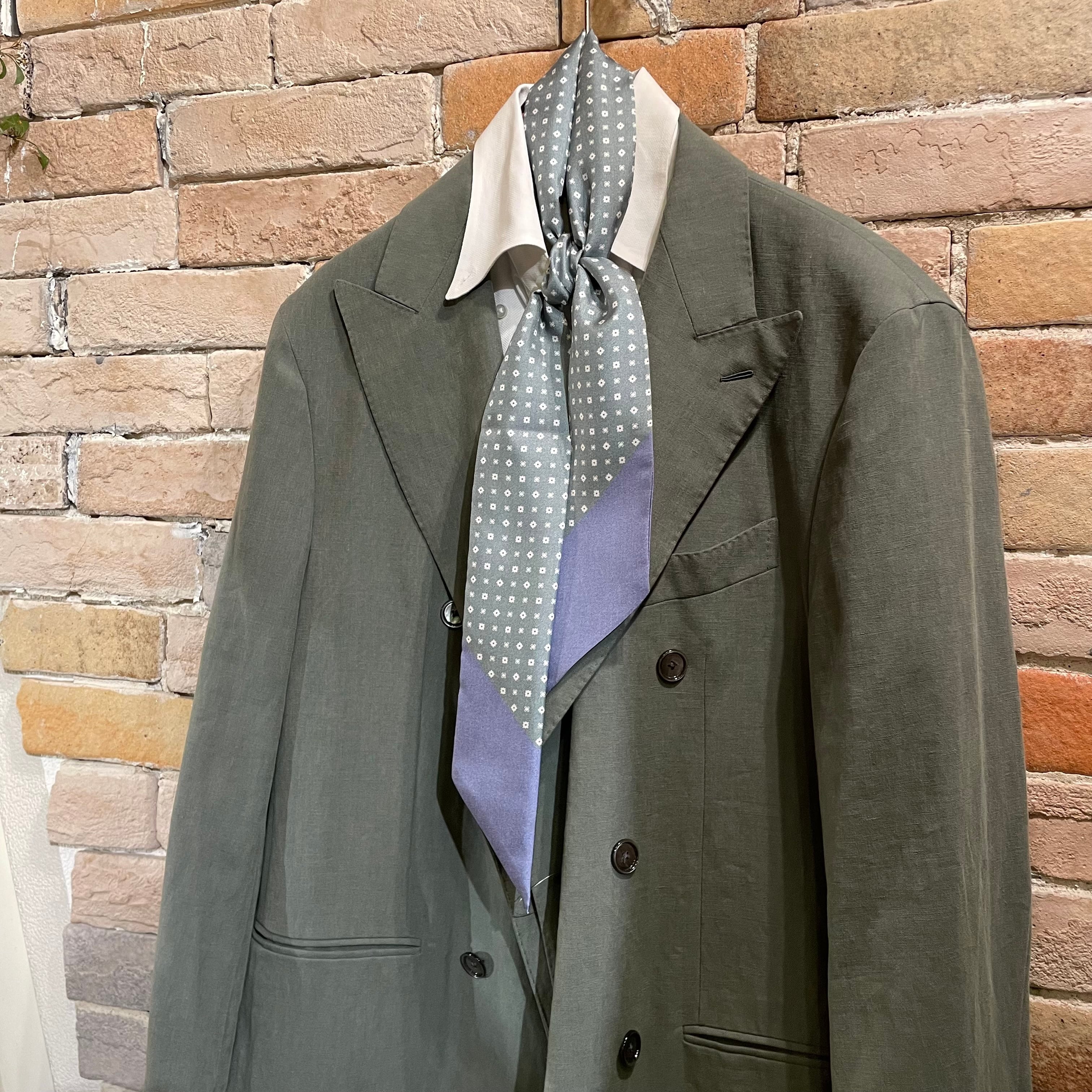 グリーンとホワイトの小紋柄。シャンブレーブルーが剣先にあしらわれております。