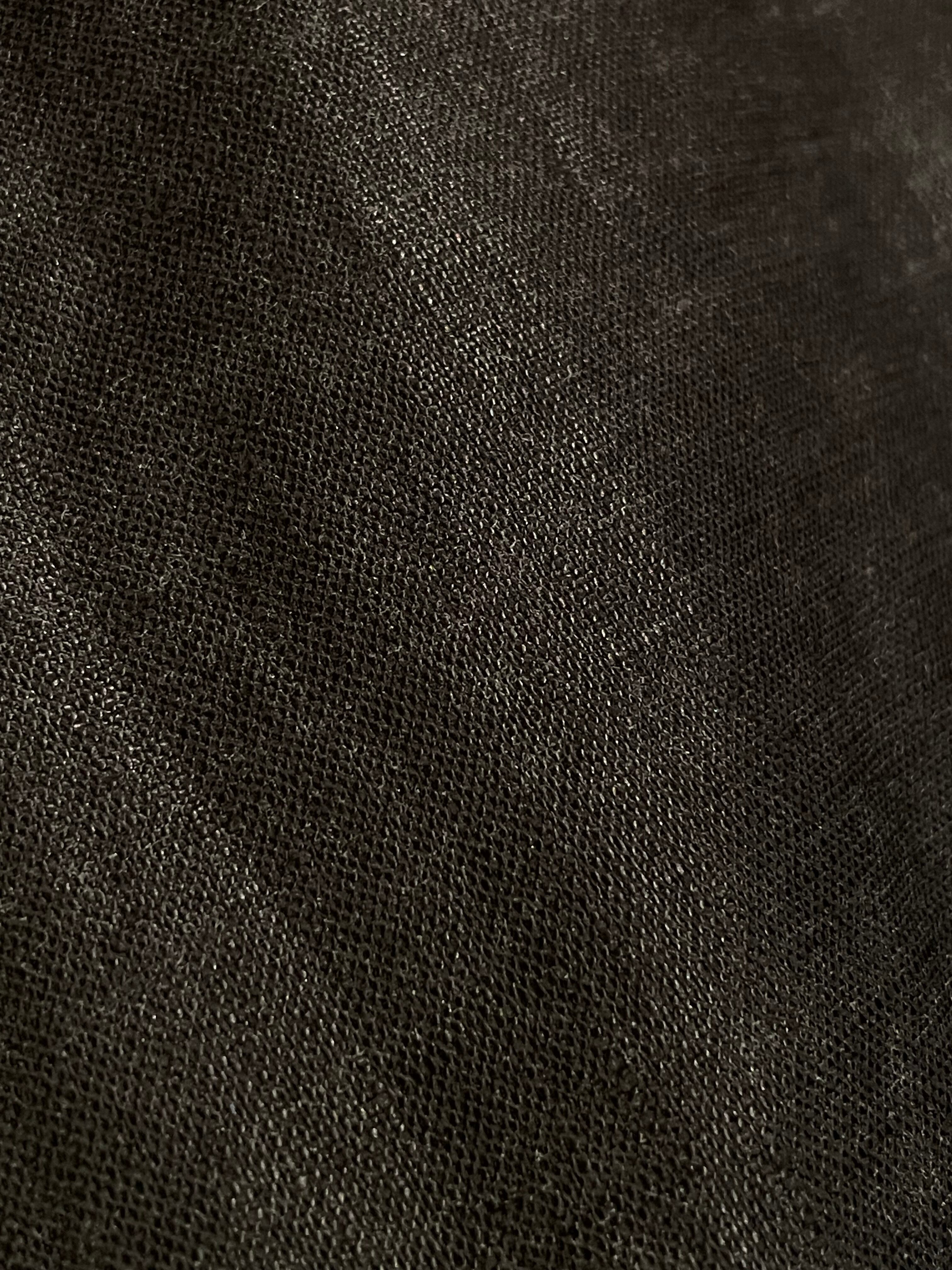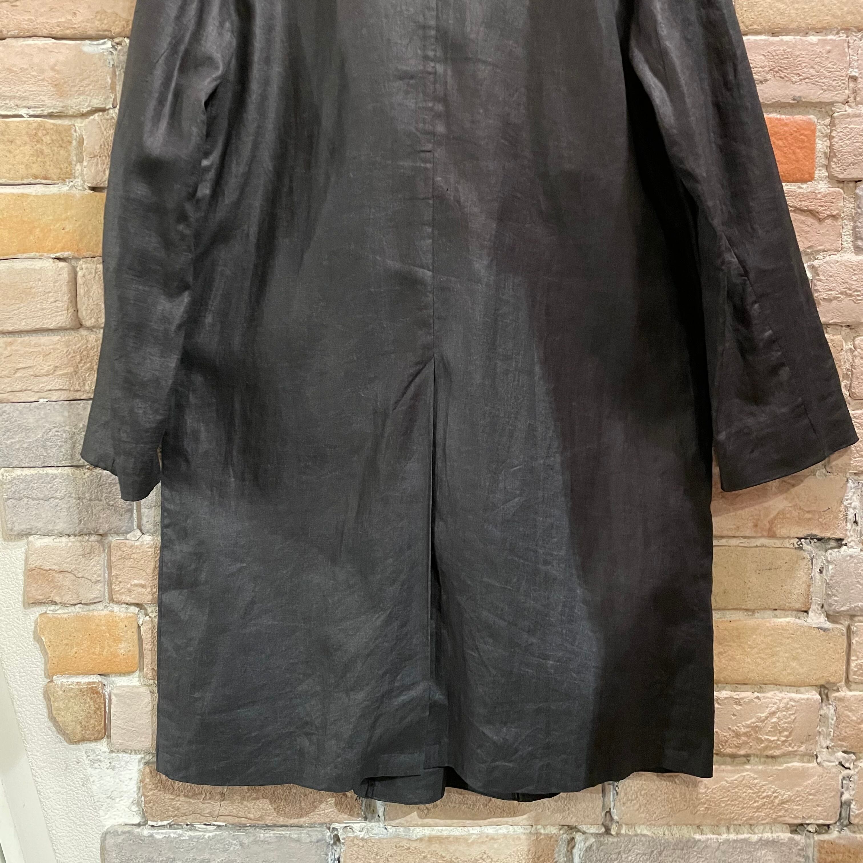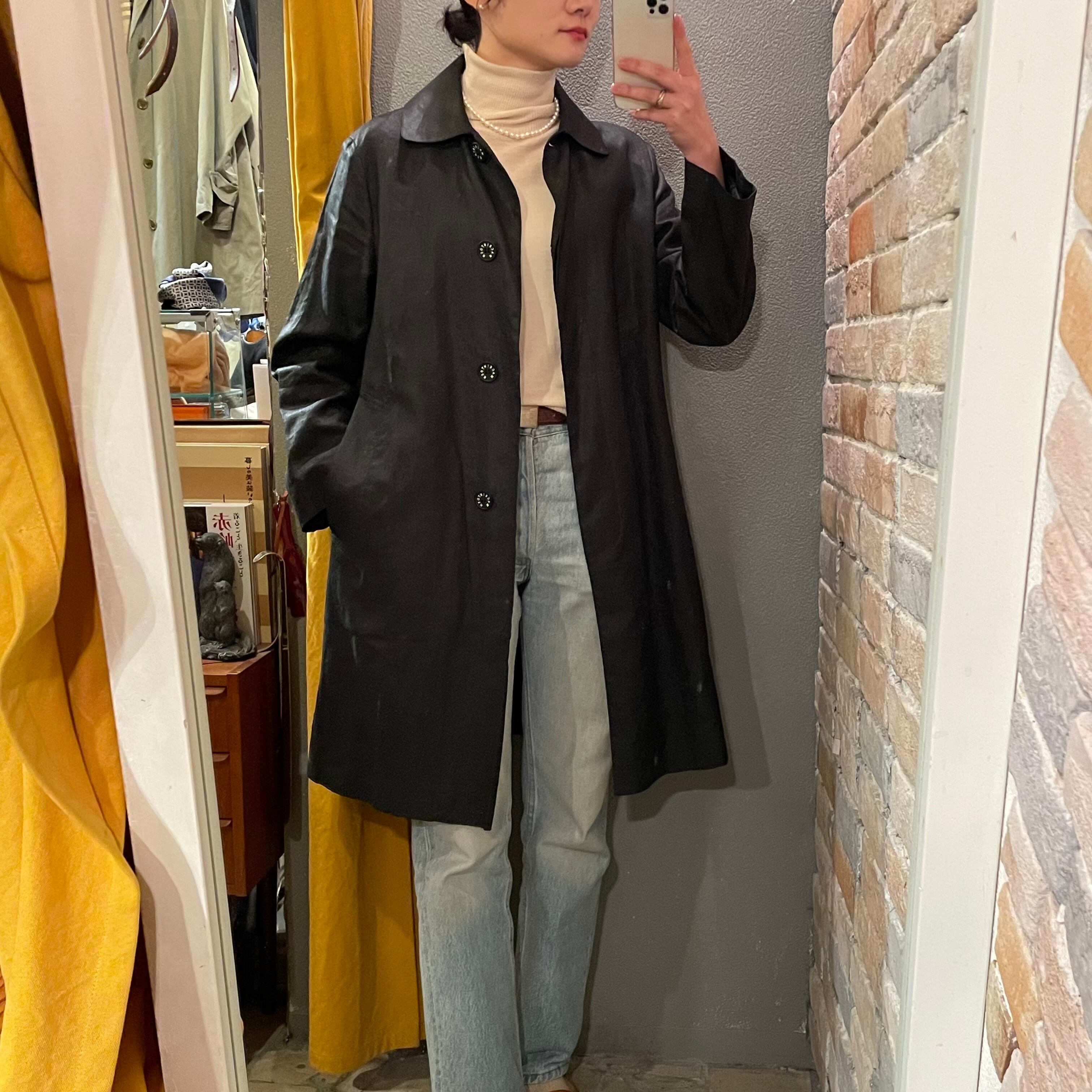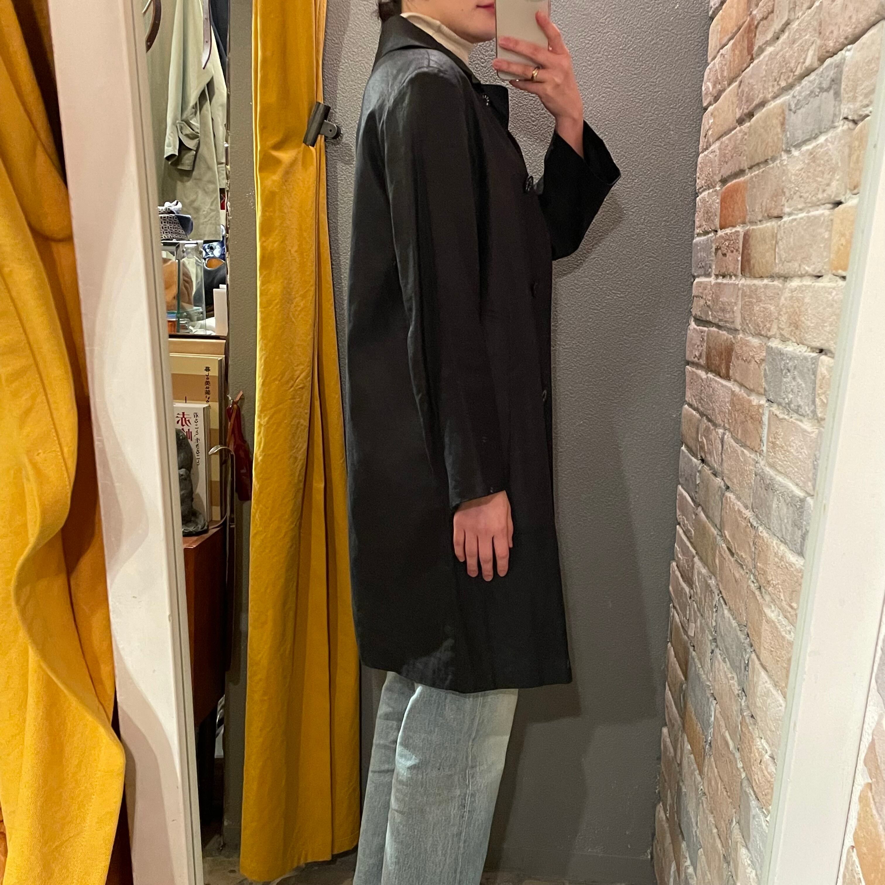 ツヤのあるブラックのリネンコートでスッキリとしたシルエット。