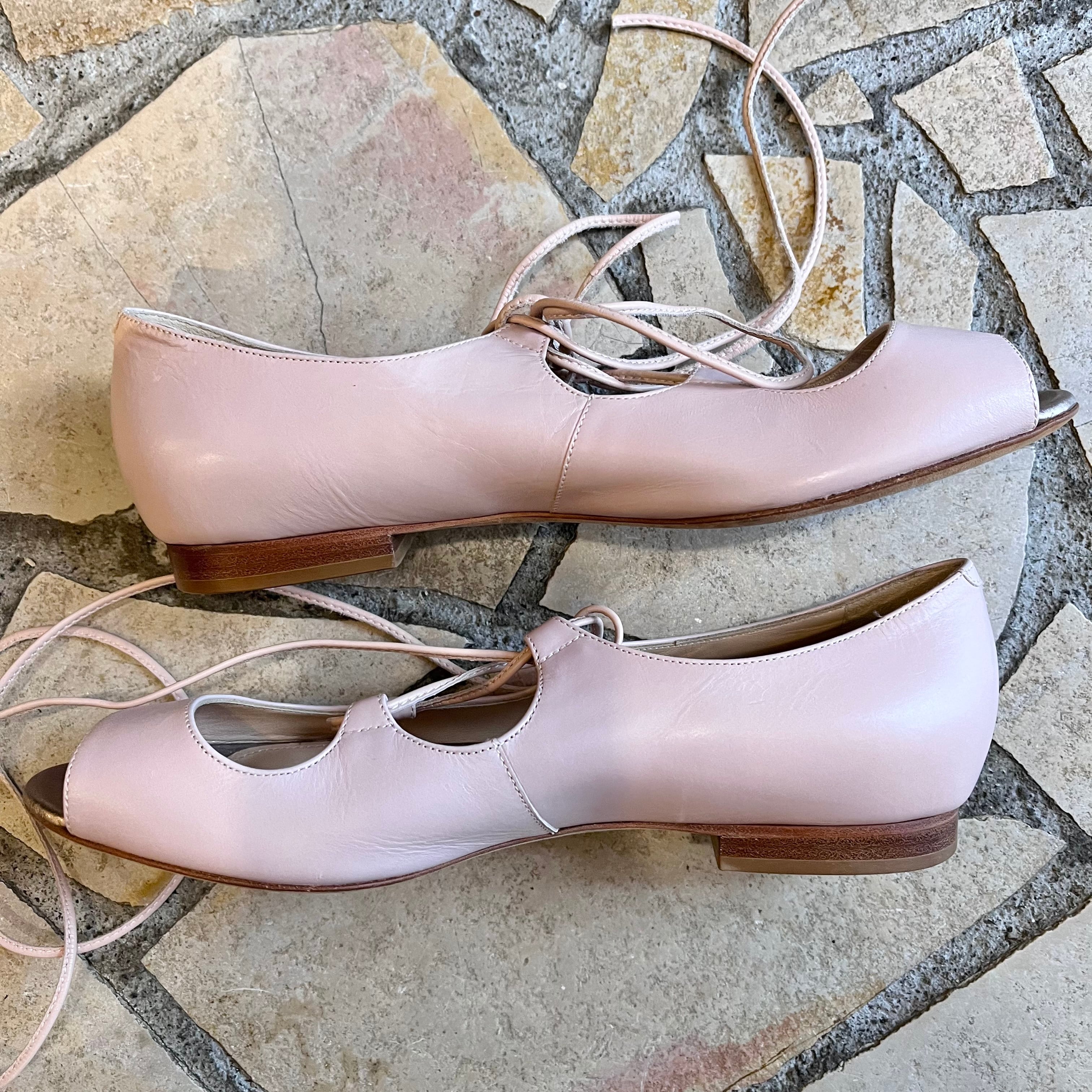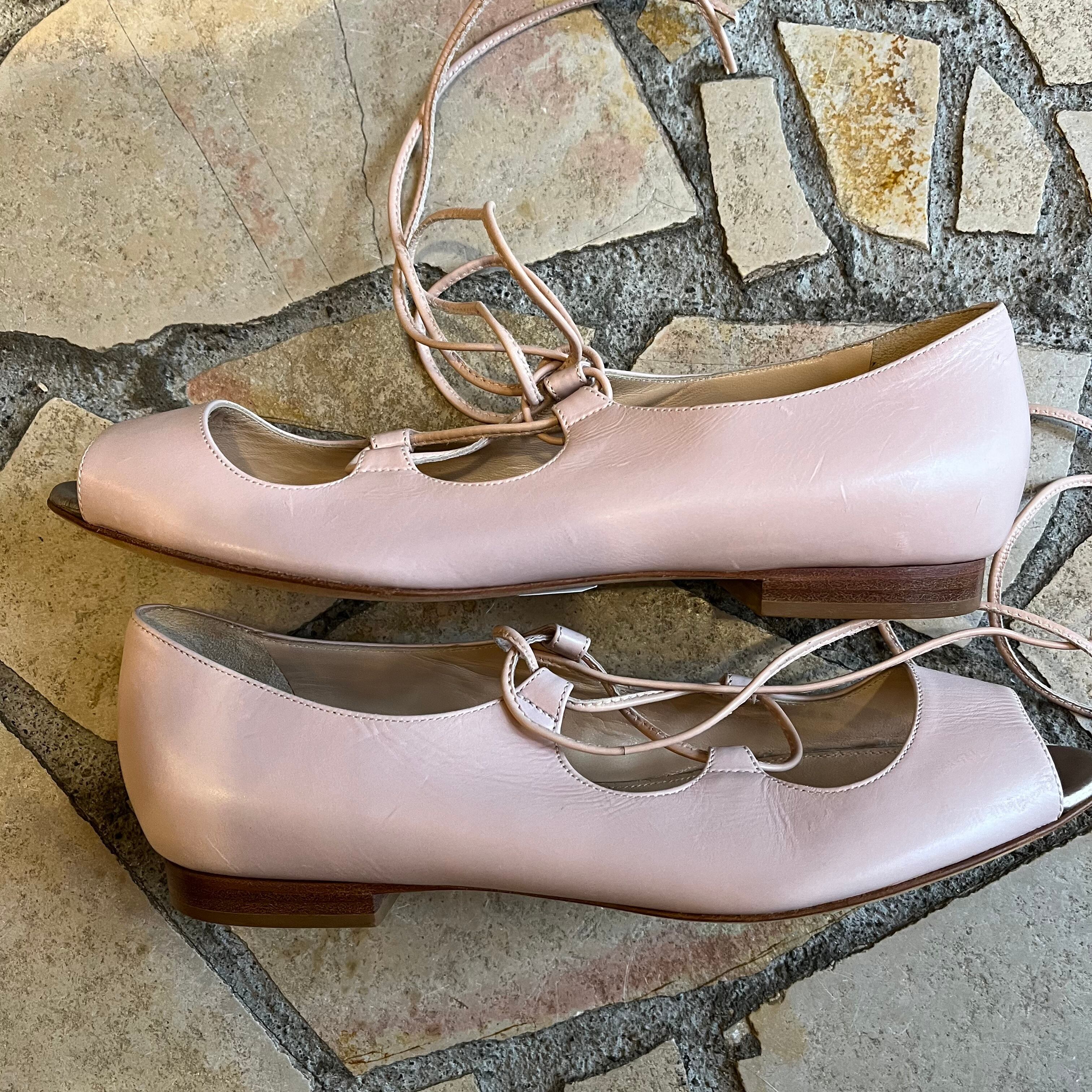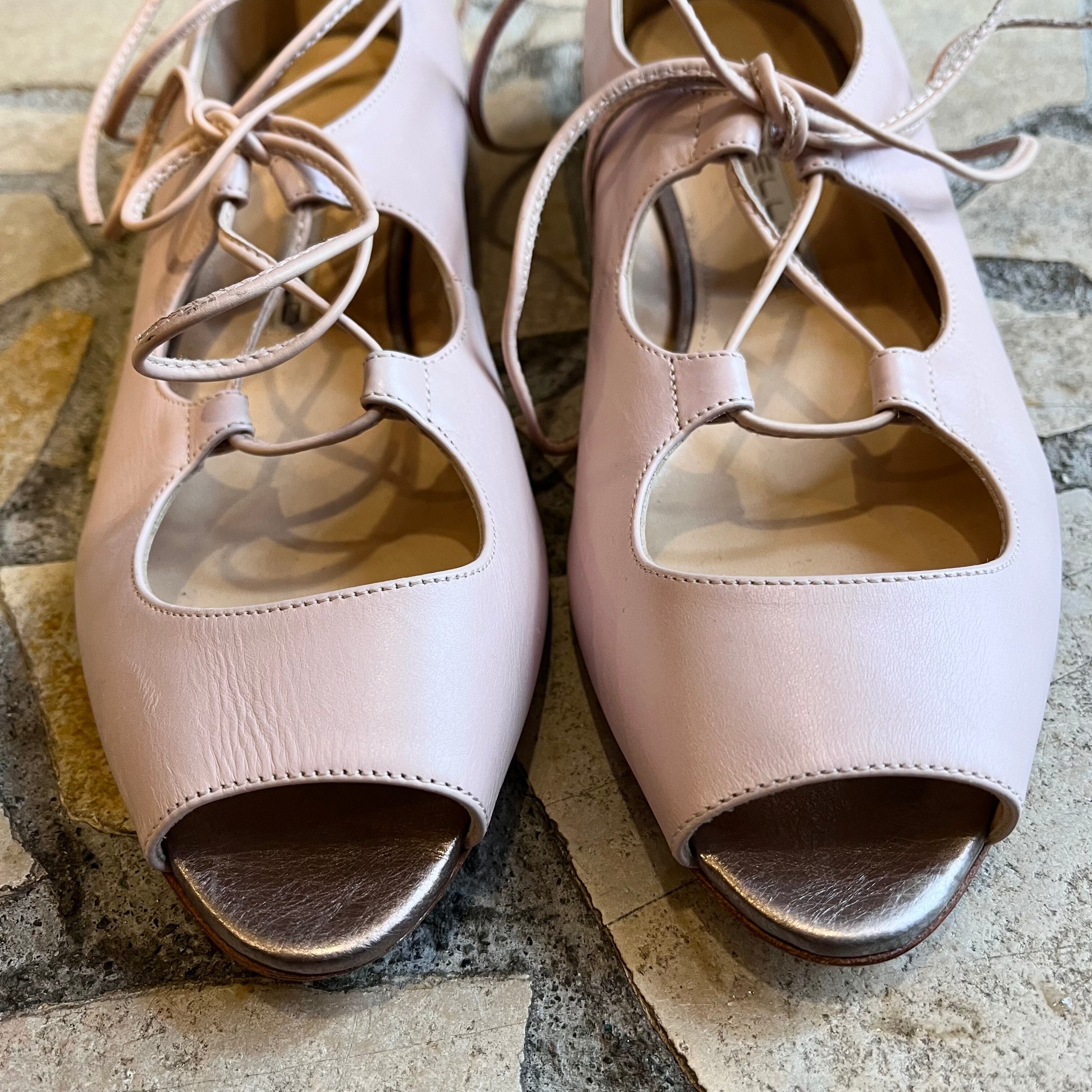 甲の部分が編み上げになったガーリーなオープントゥパンプスです。