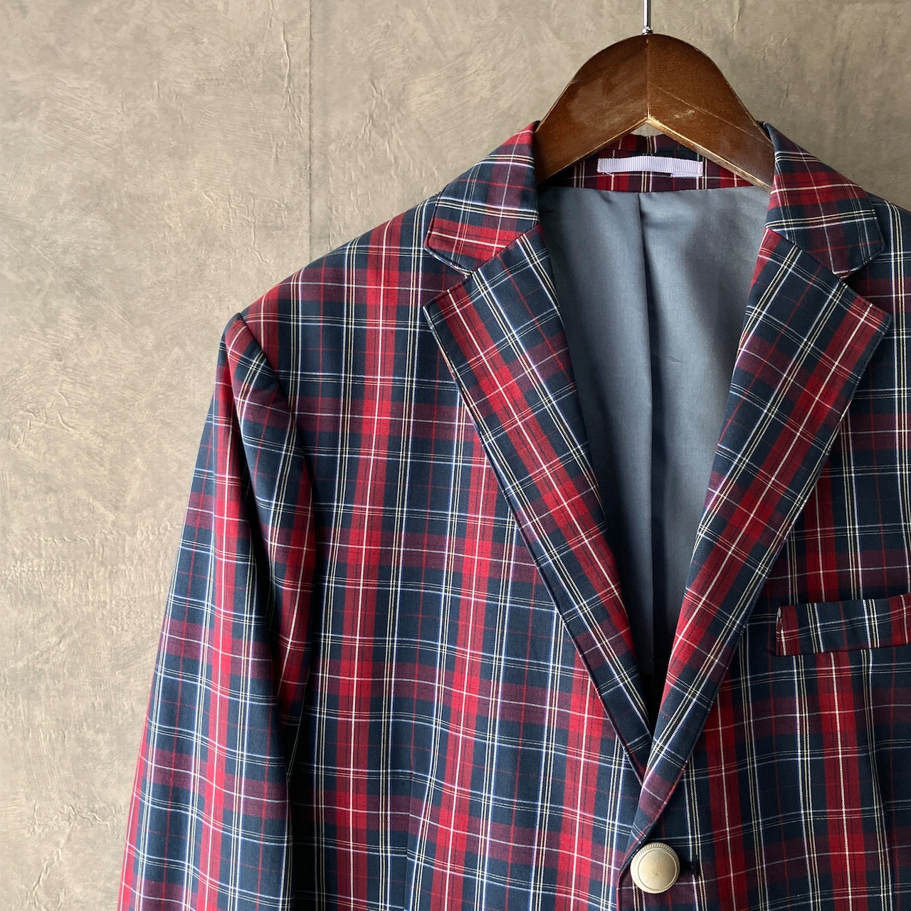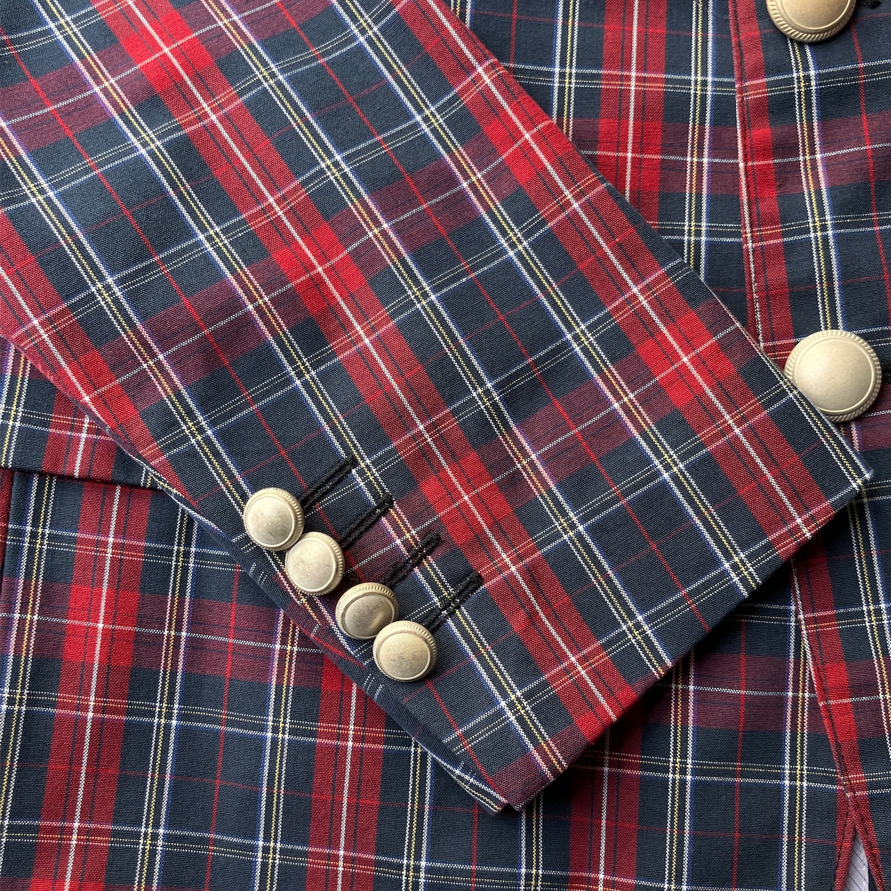 紙タグ、取り替え用の黒ボタンが残る未使用品。背抜き、袖4つボタン開き見せ仕様でスッキリとしたシルエットのコットン3つボタンジャケット