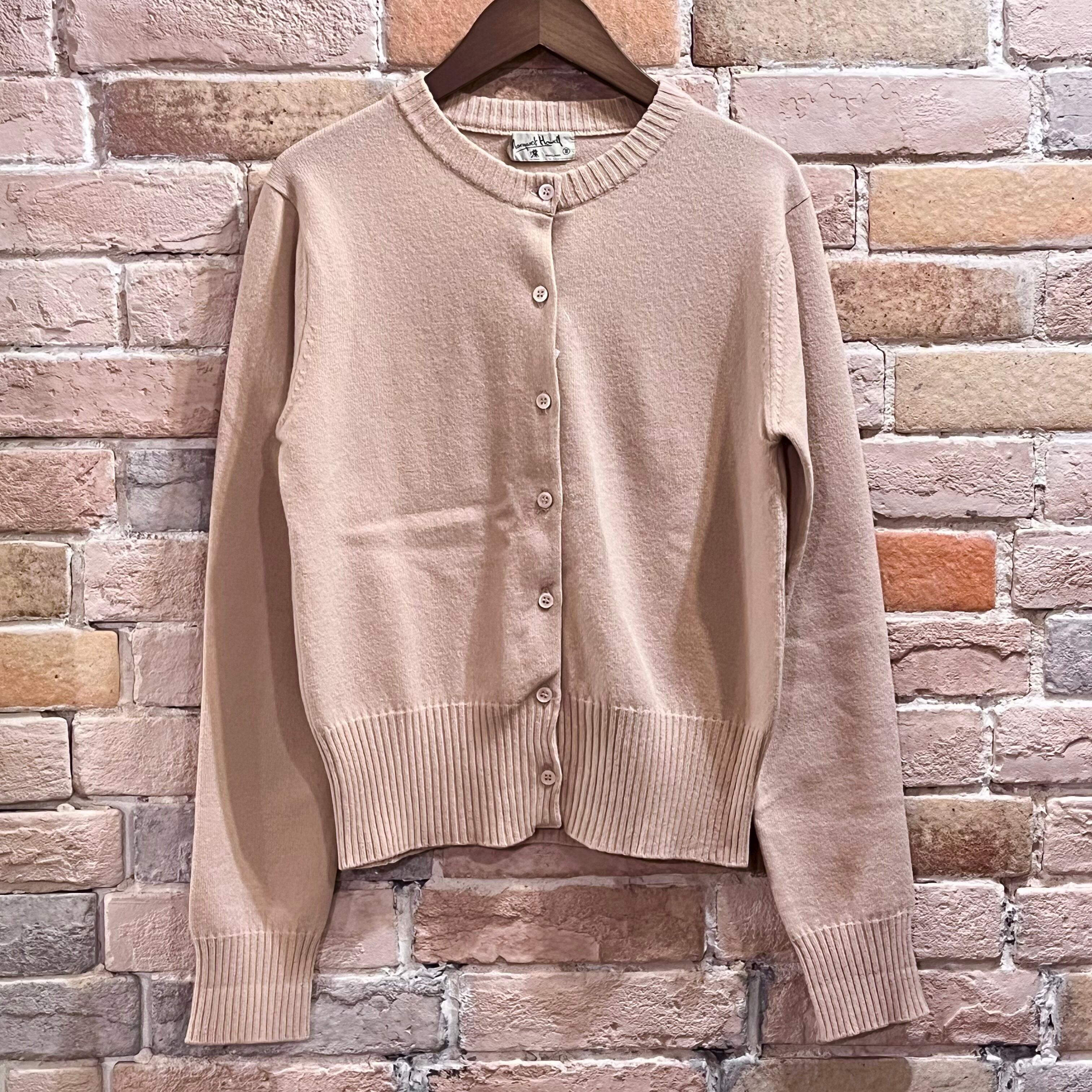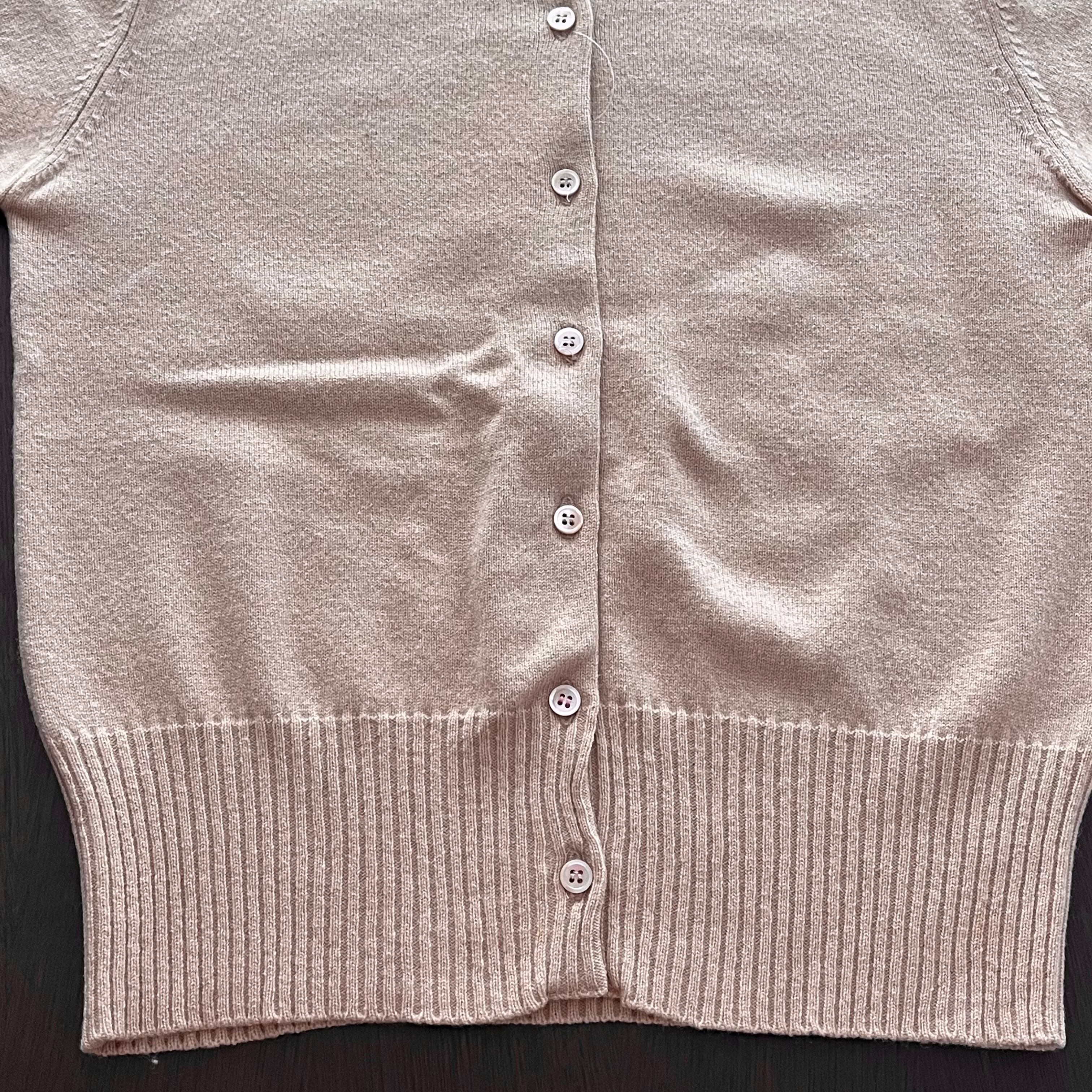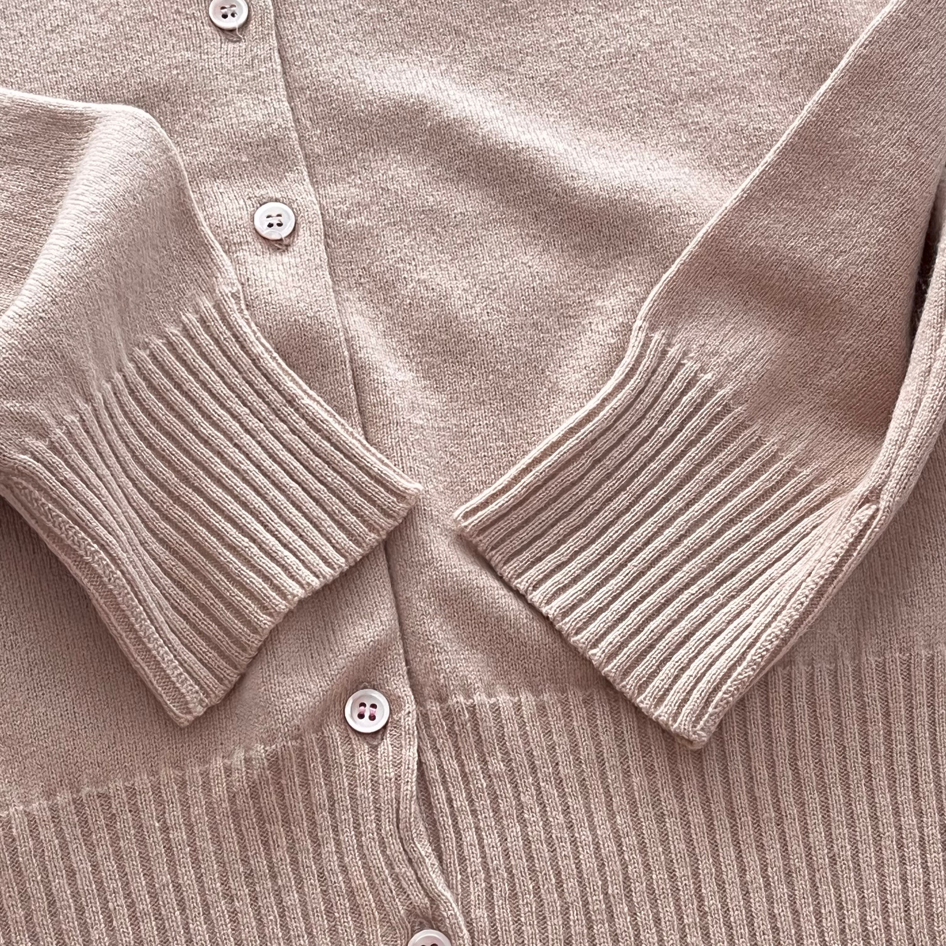柔らかなピンクベージュのやや肉厚なミドルゲージニットカーディガン。