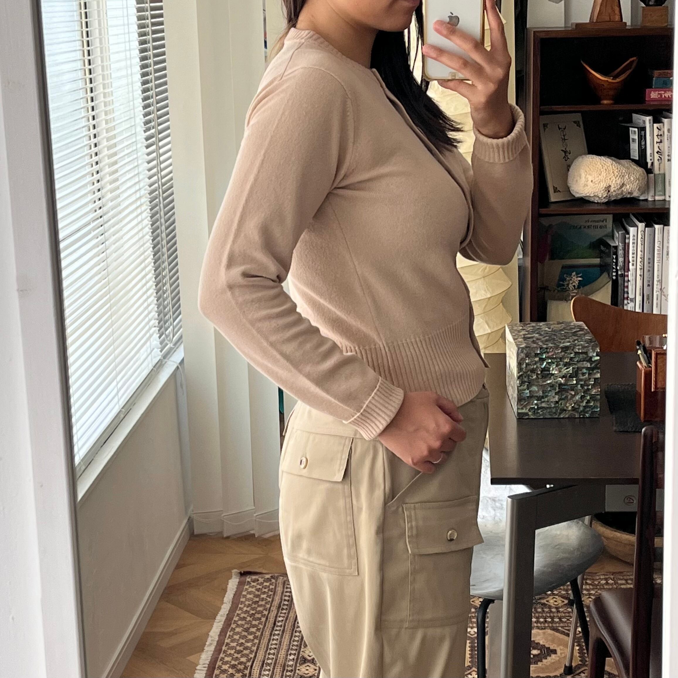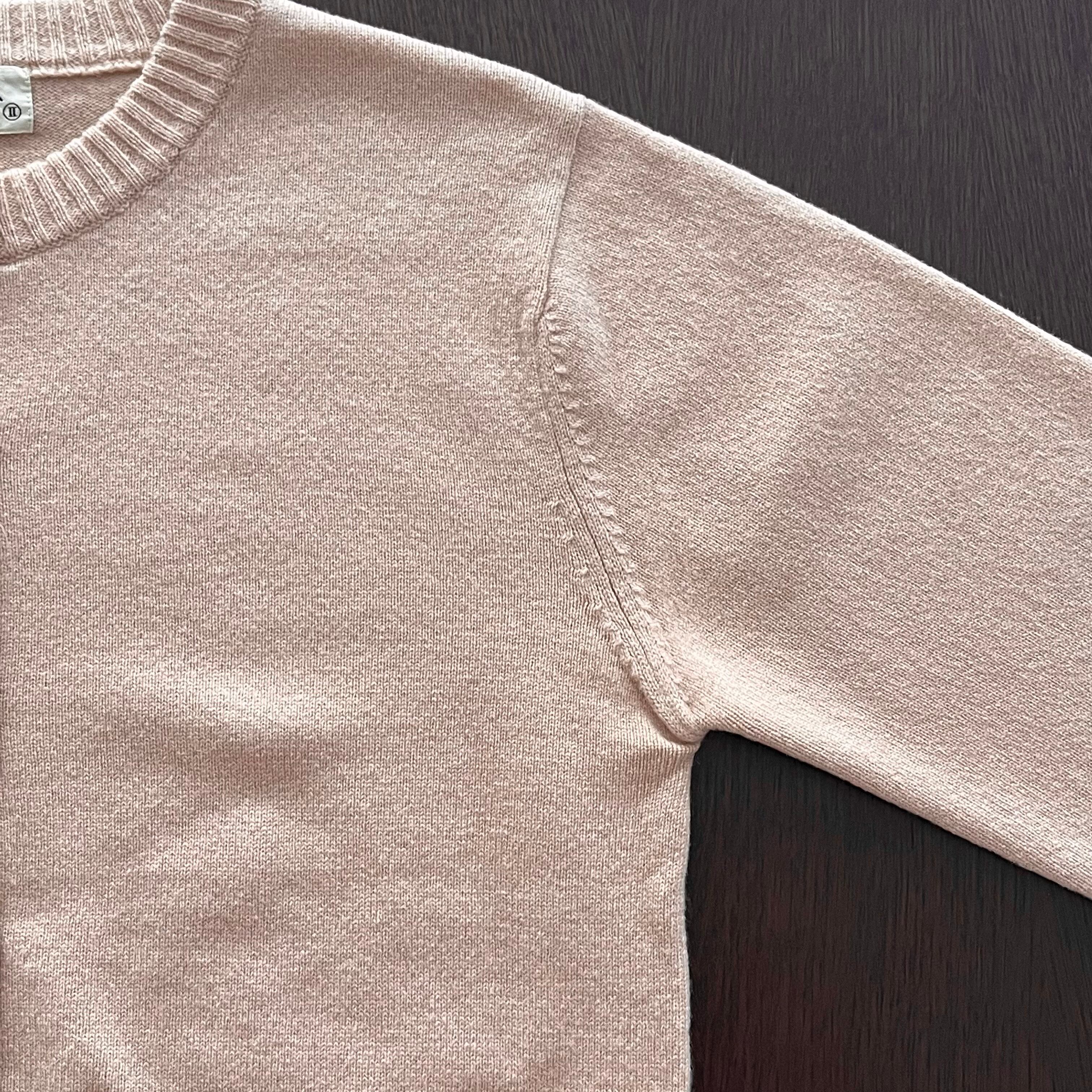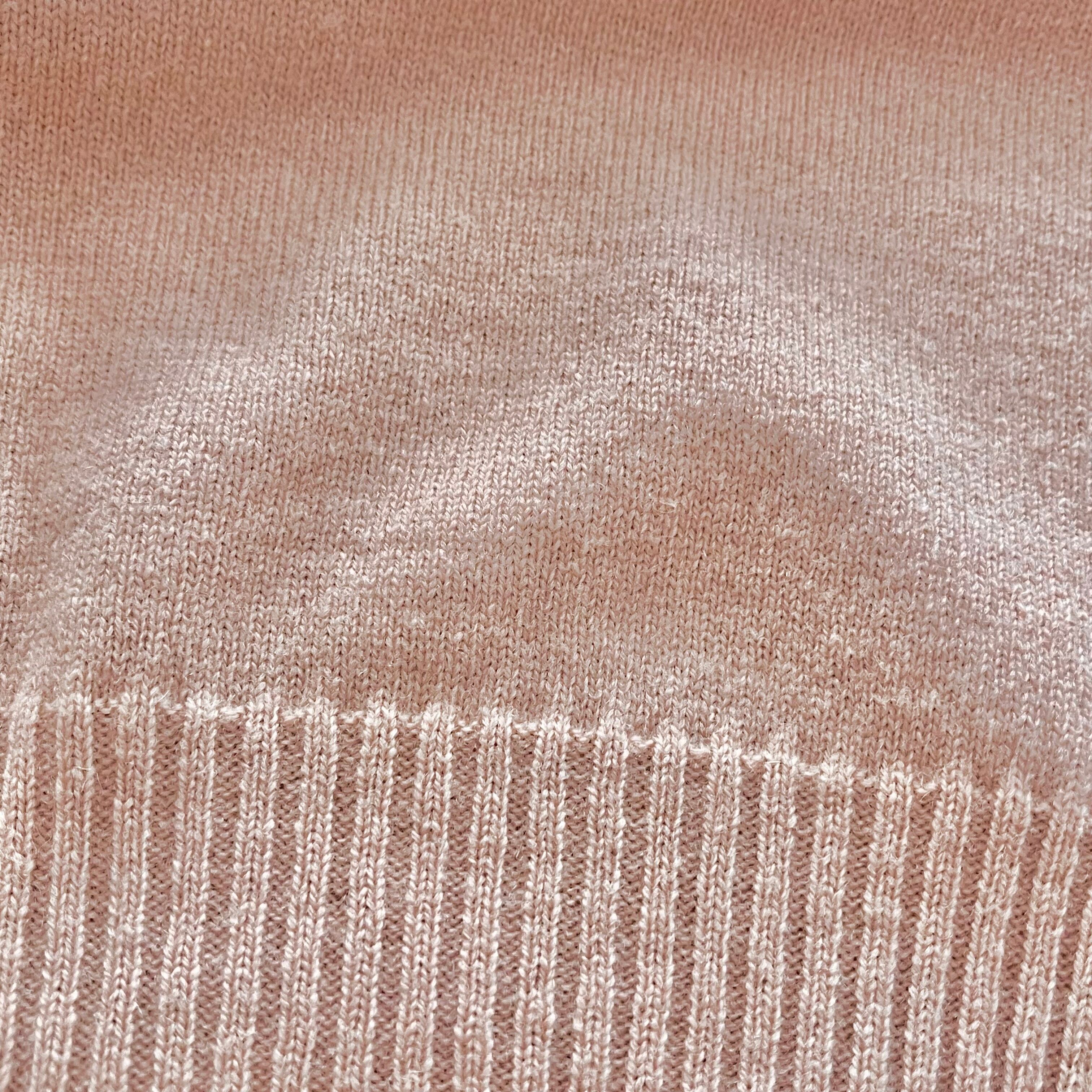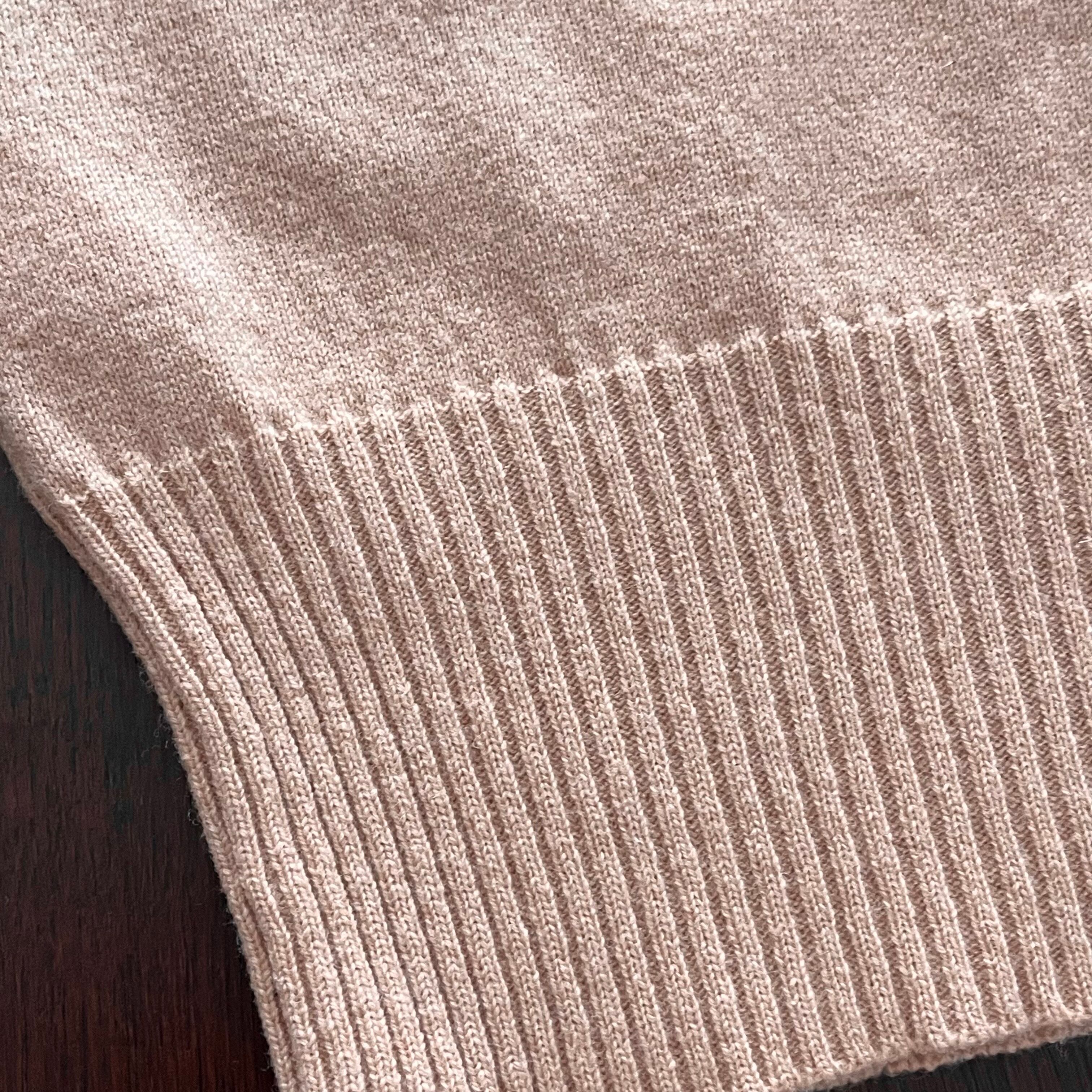 柔らかなピンクベージュのやや肉厚なミドルゲージニットカーディガン。